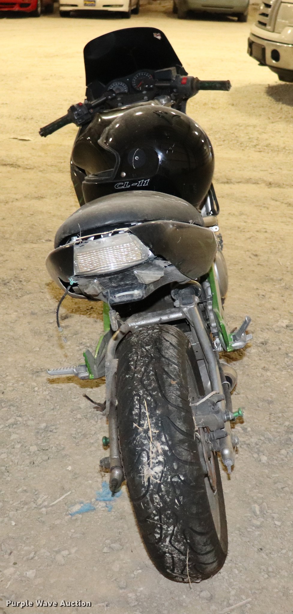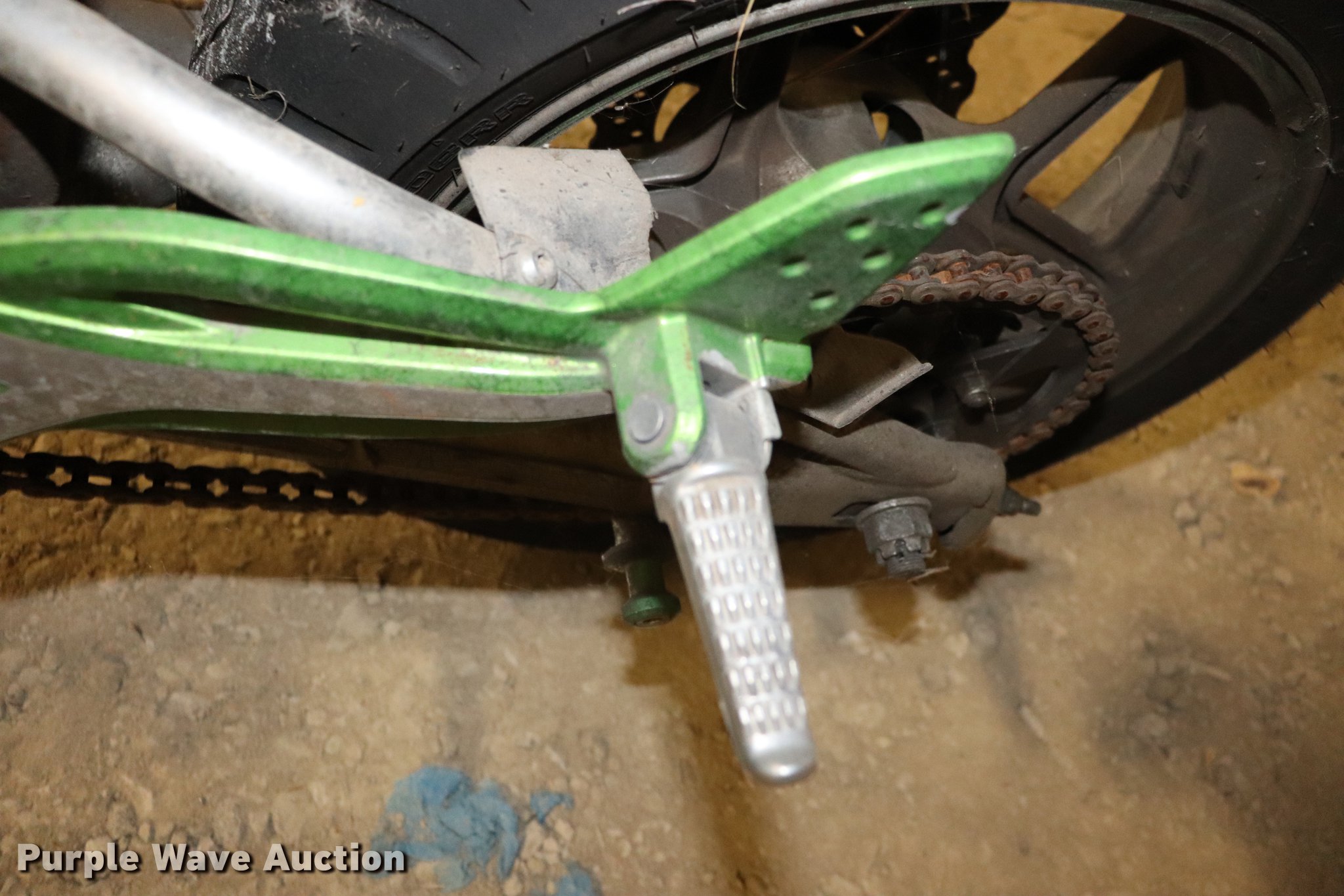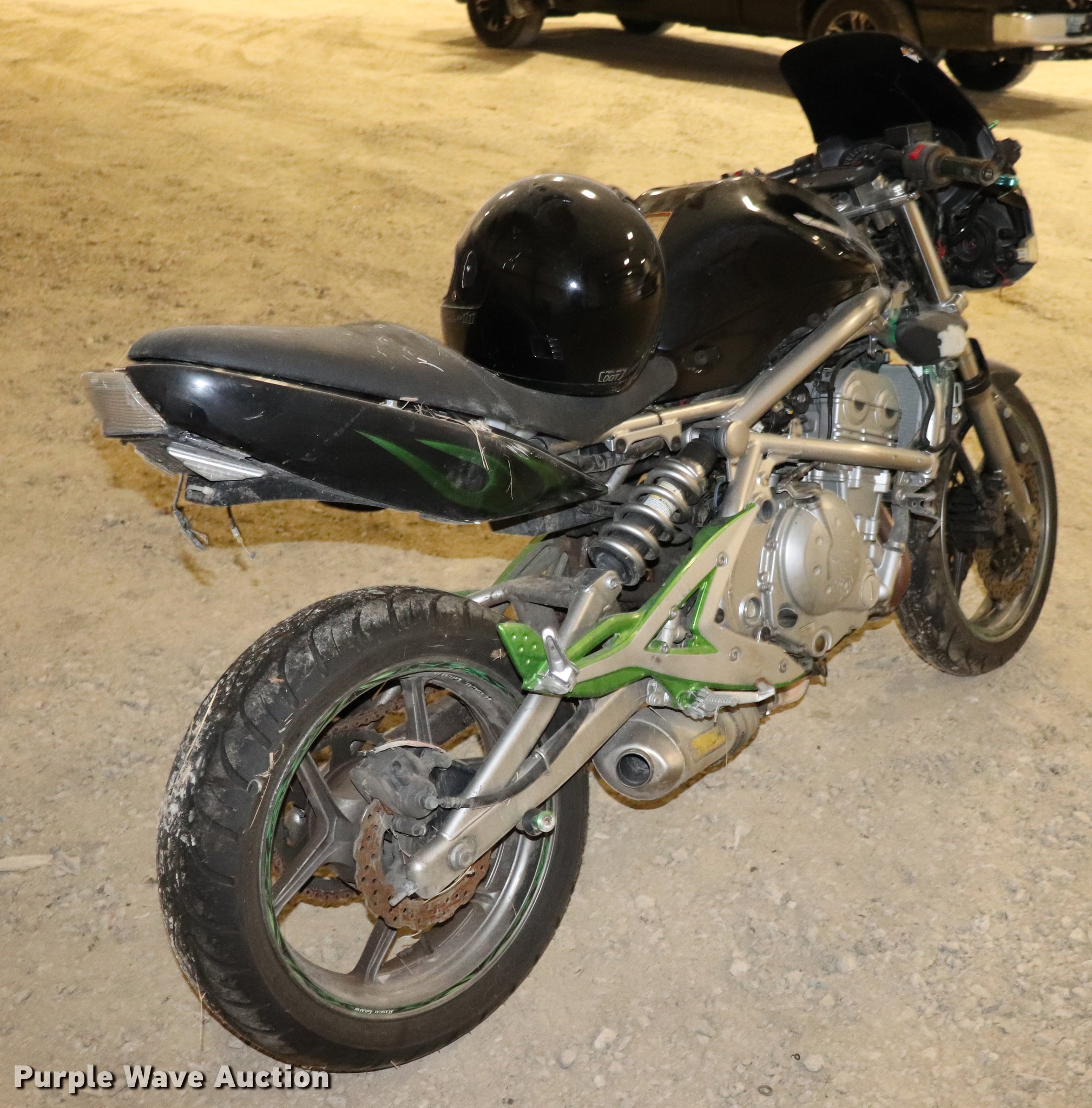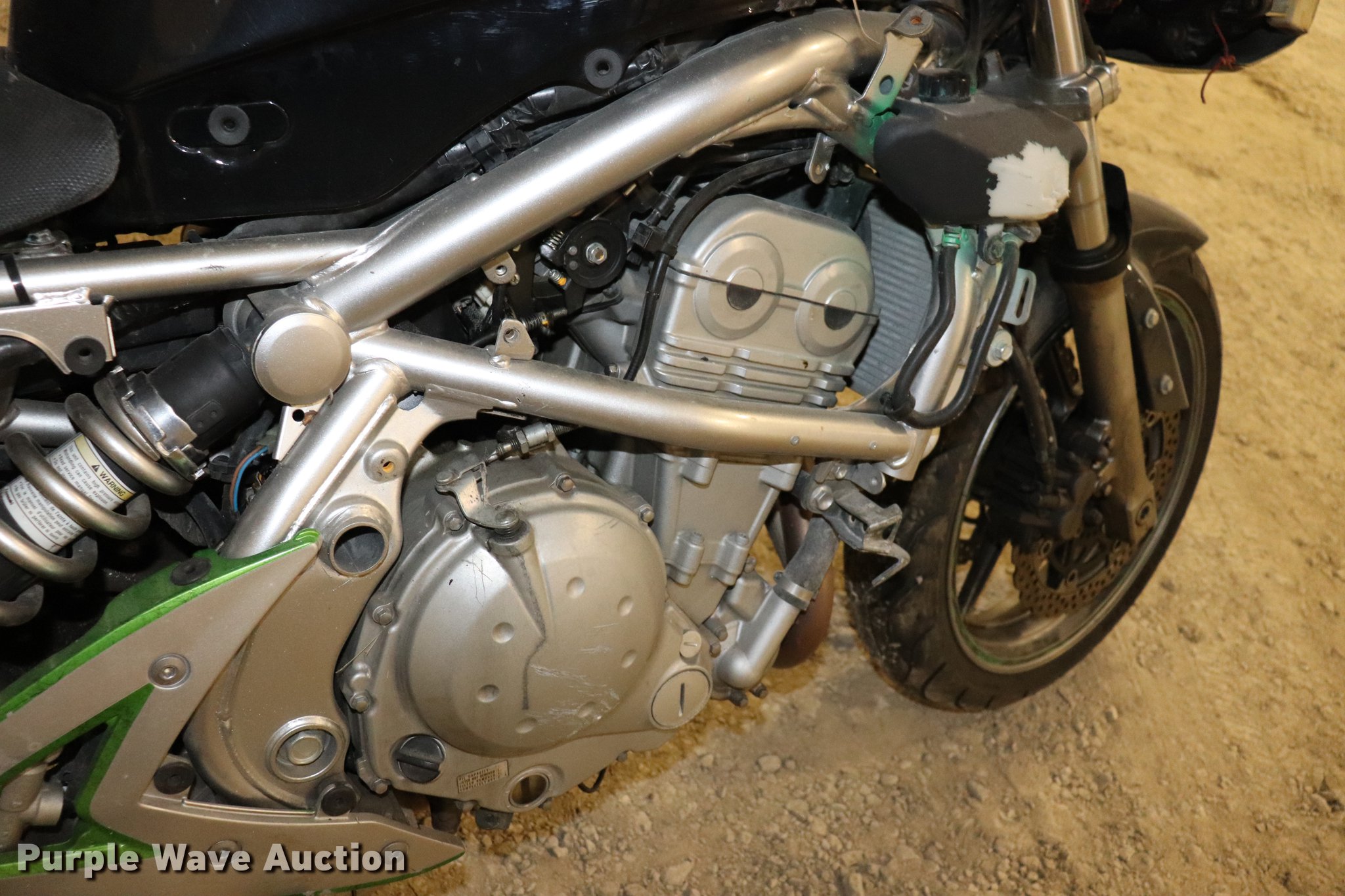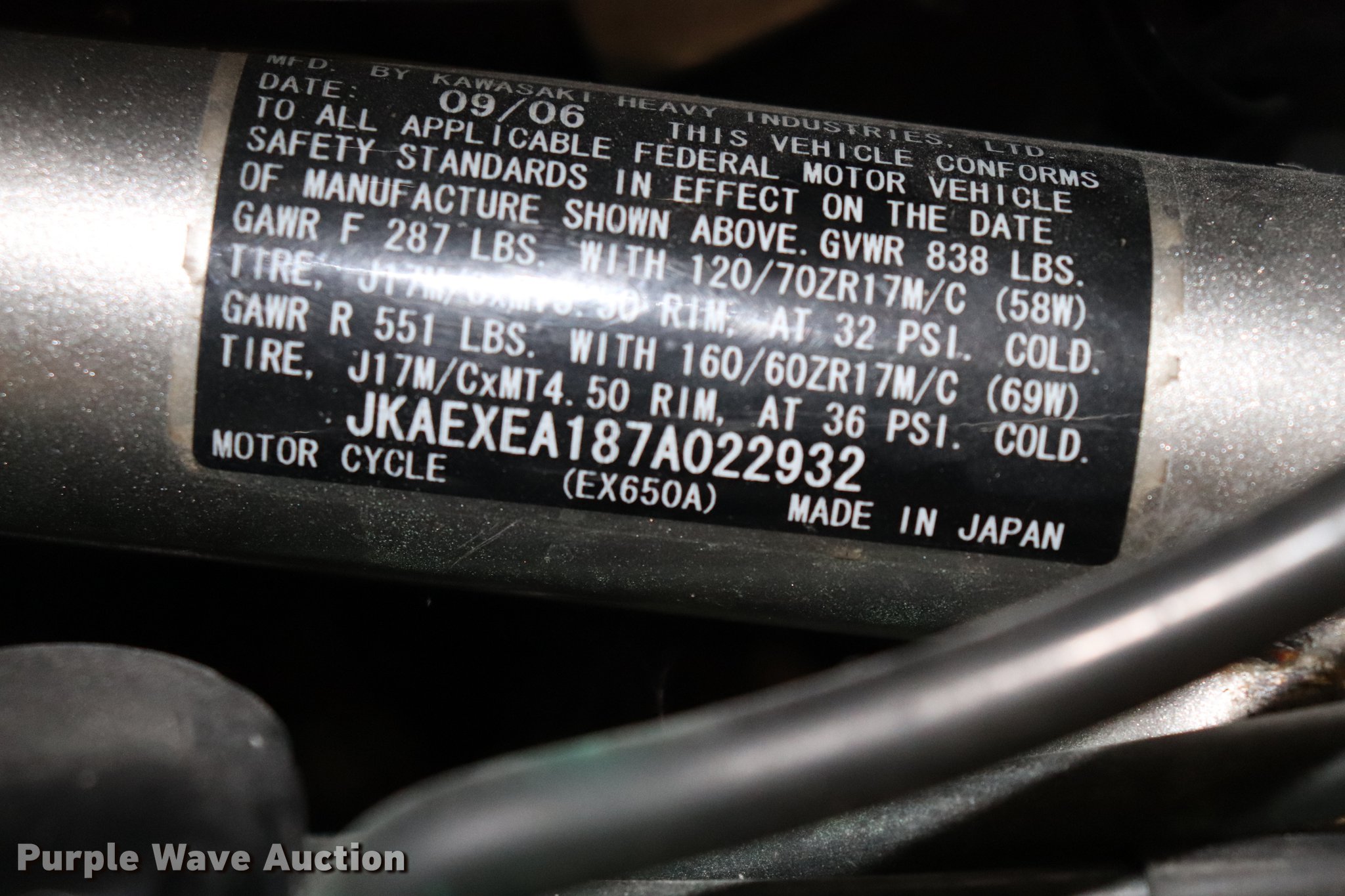 Purple Wave is selling a used Motorcycle in Kansas. This item is a 2007 Kawasaki EX650-A motorcycle with the following: Unknown miles on odometer, 650 cc gas engine, Manual transmission, 120/70ZR17 front tire, 160/60ZR17 rear tire, Unknown operating condition
