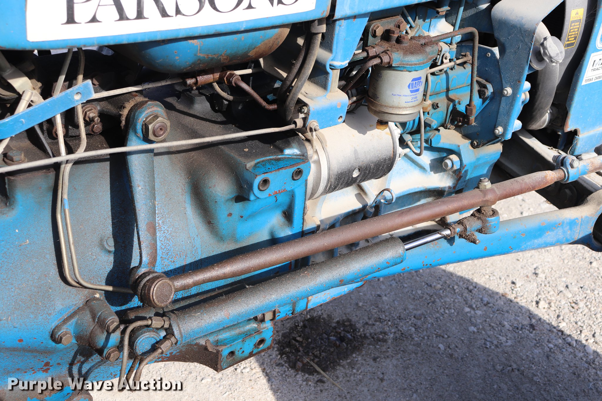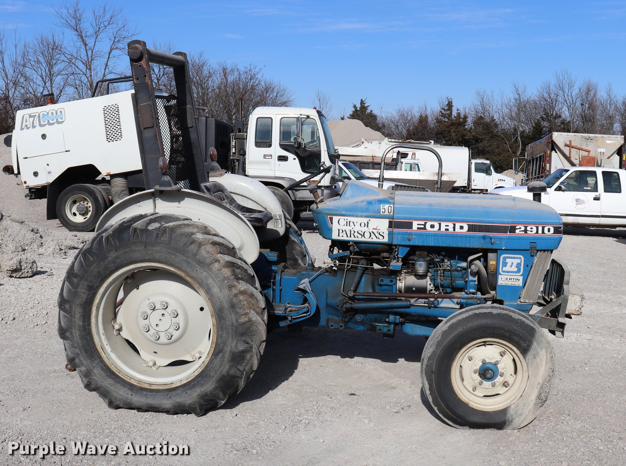 Ford 2910 tractor. 3,724 hours on meter, Three cylinder diesel engine Serial 40, Manual transmission 8F-2R, Suspension seat, Three point, 540 PTO, One rear hydraulic remote set, 7.50-16 front tires, 13.6-28 rear tires, Serial C766265. City of Parsons. 967 Ottawa Rd. Parsons, KS 67357