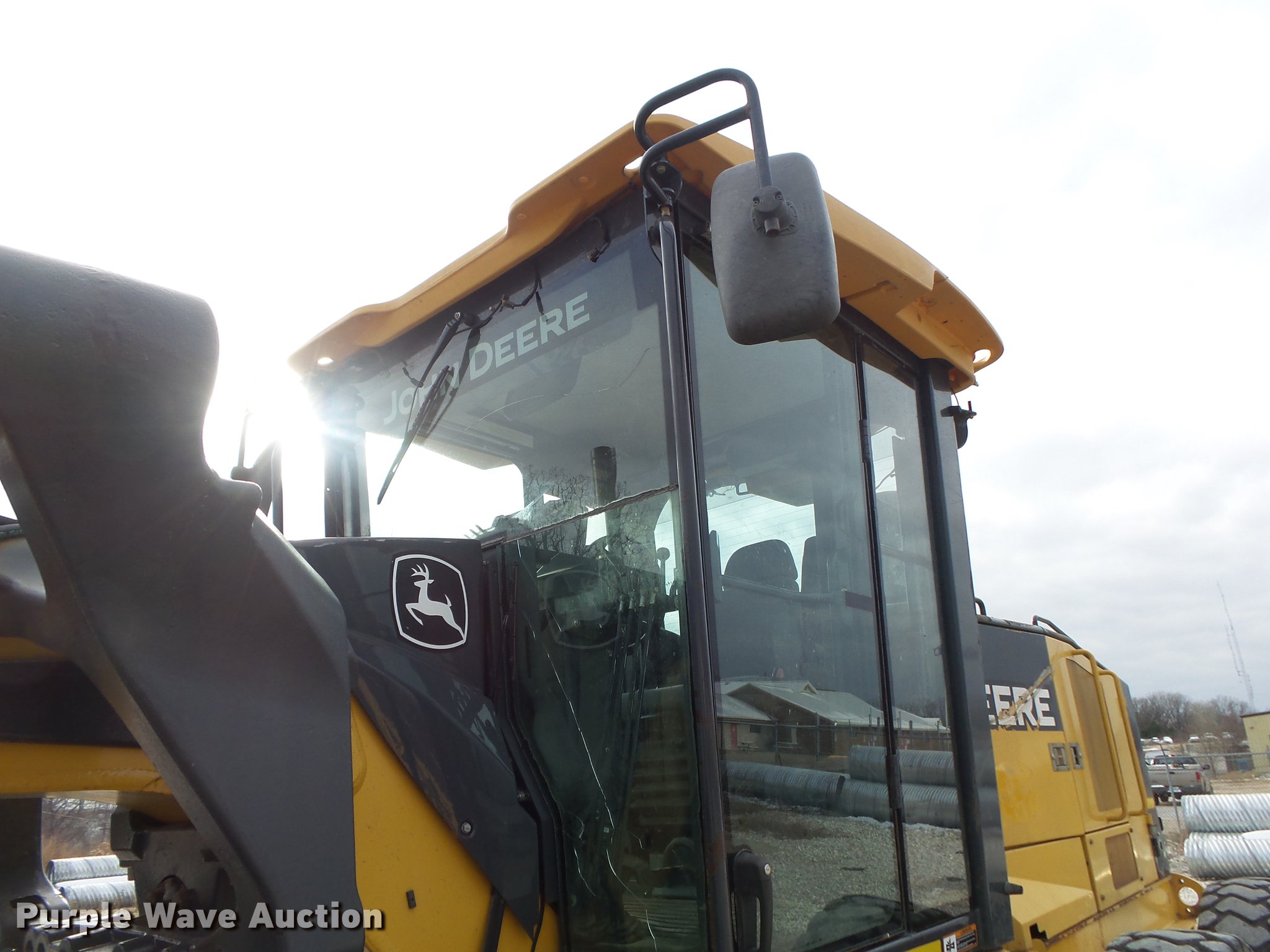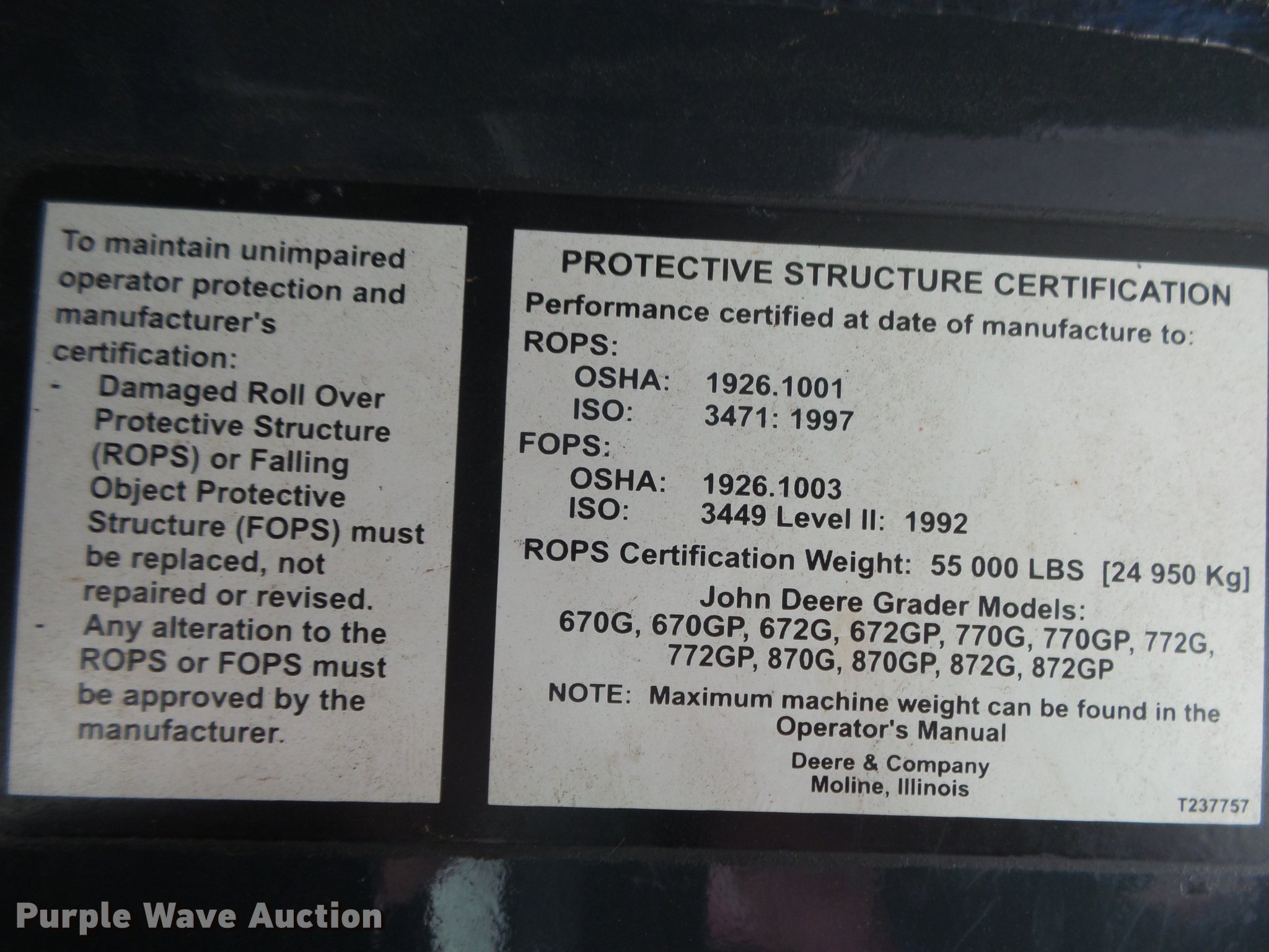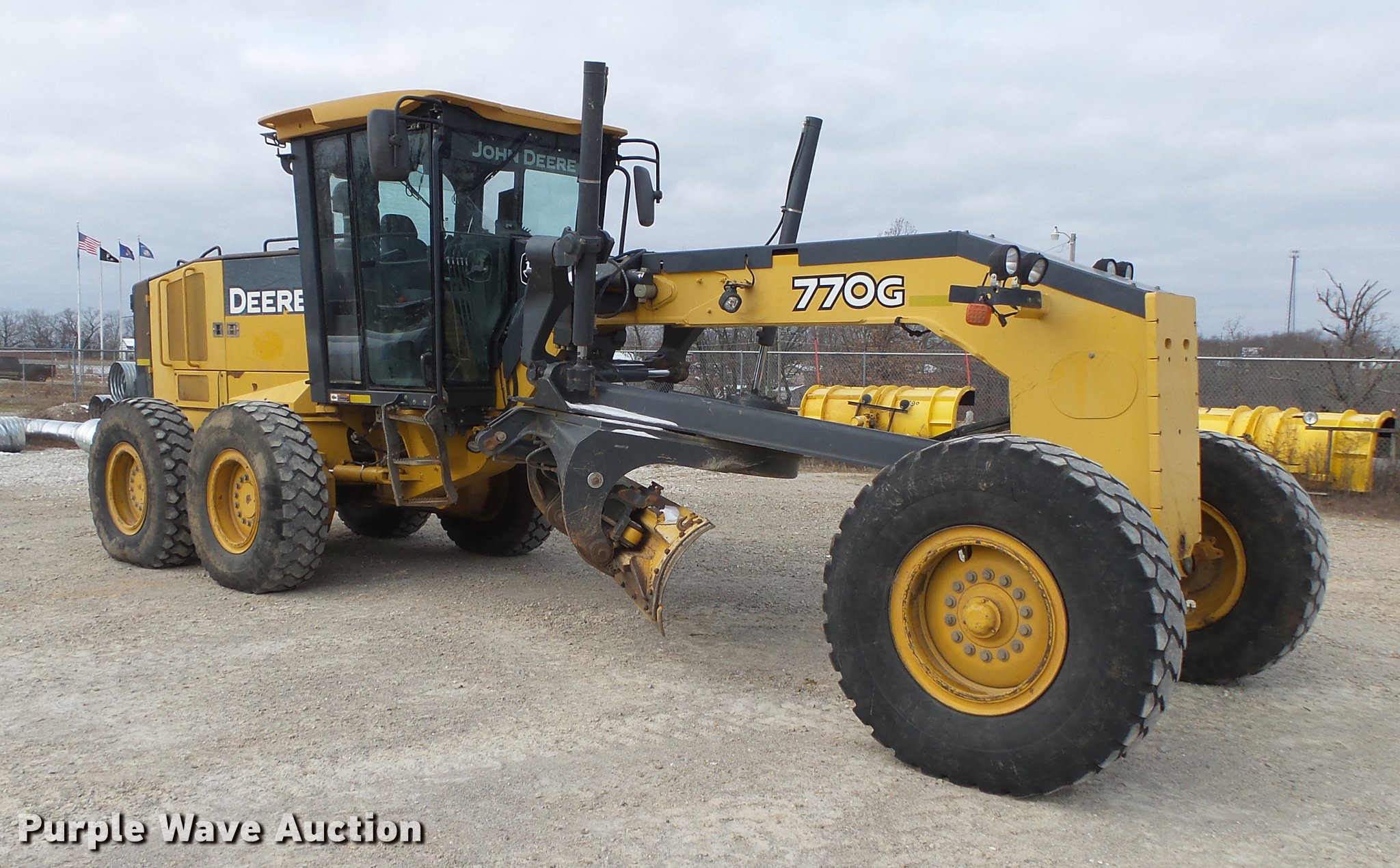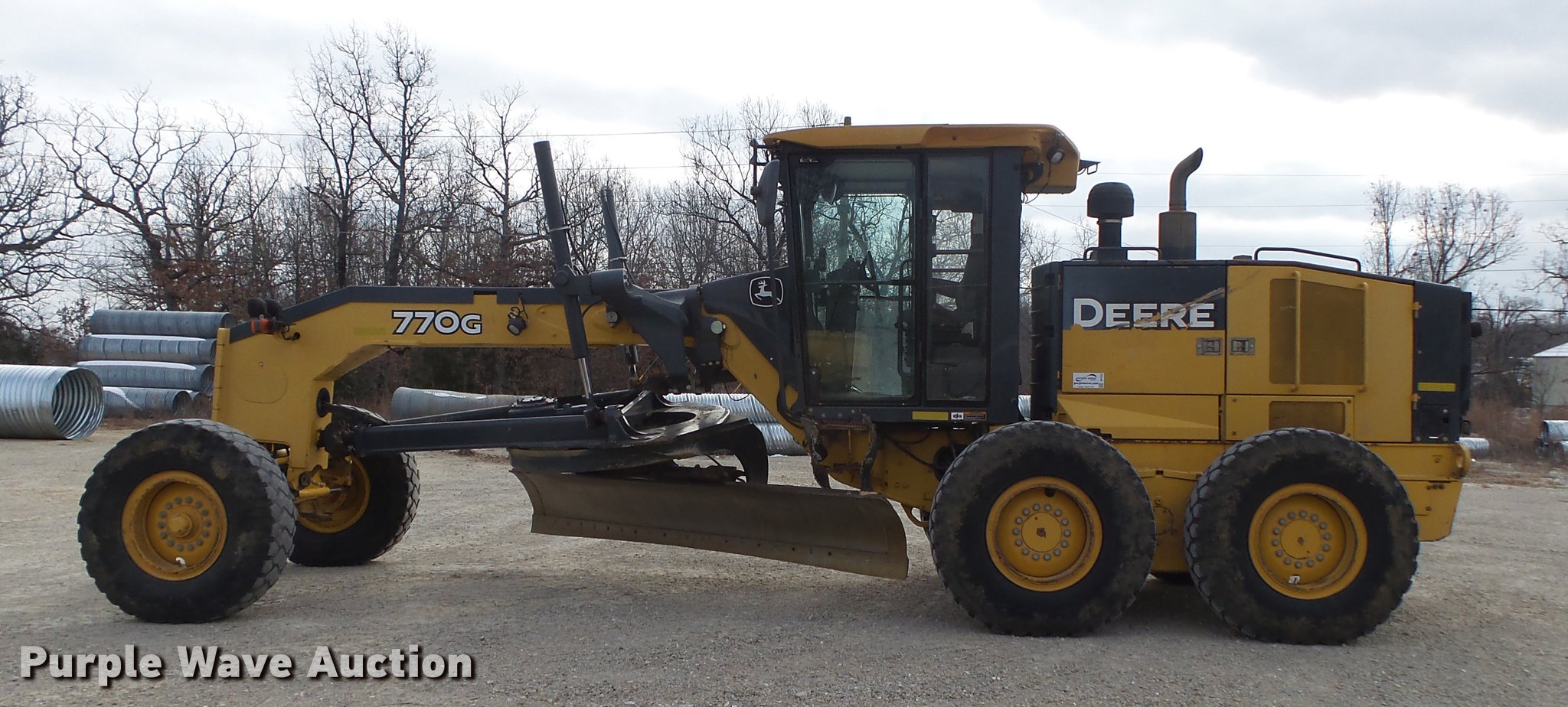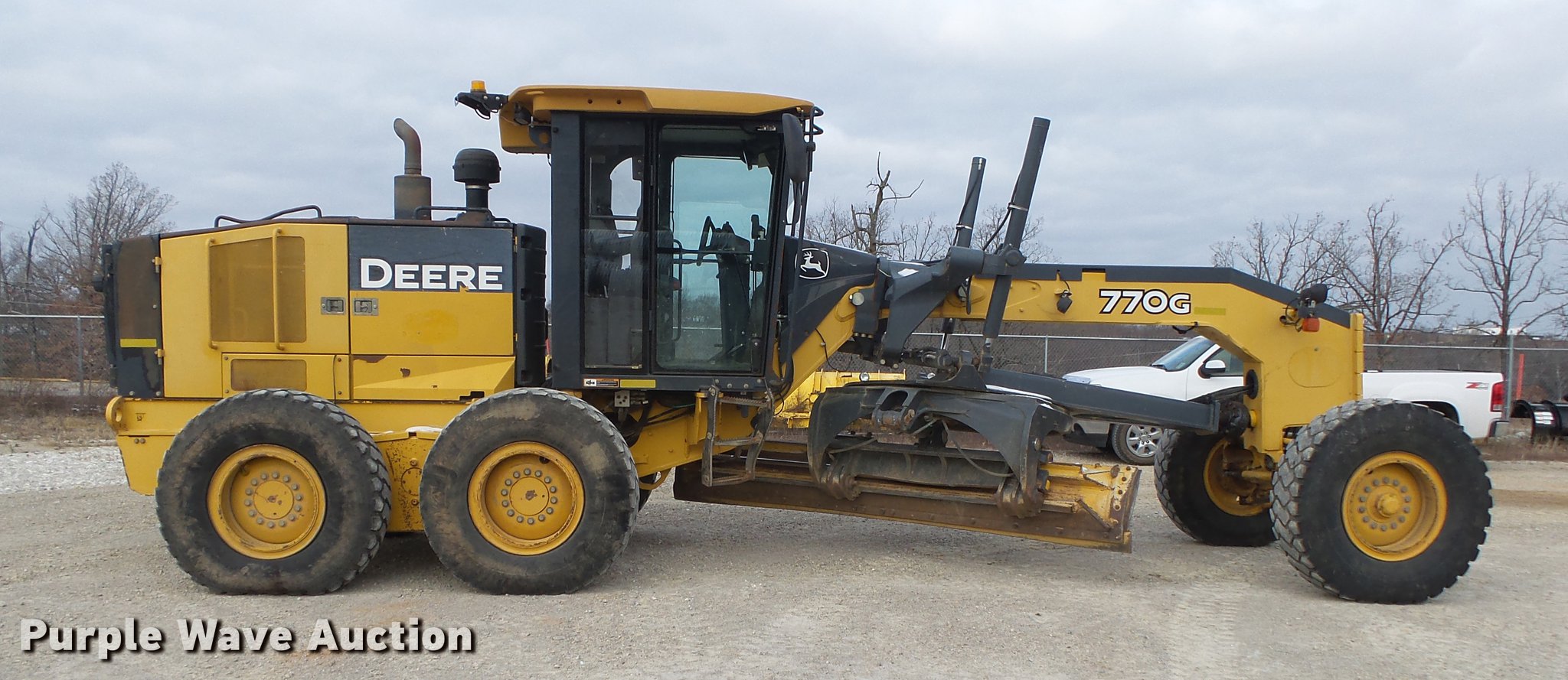 Purple Wave is selling a used Motor Grader in Missouri. This item is a 2009 John Deere 770G motor grader with the following: 10,740 hours on meter, John Deere 9.0L six cylinder turbo diesel engine, Model 6090HDW01, 165 to 230 Tier 3 HP, Variable horsepower, Powershift transmission, 8F-8R gears, Differential lock, EROPS, AC and heat, AM/FM, Air suspension seat, Backup alarm, Beacon light, Nine control valves, Front and rear work lights, Block heater, Ether start aid, Battery disconnect switch, 12'W moldboard, Tip control, Side shift, Circle slip clutch, Rear pin hitch, 14.00R24 tires, Windshield cracked, Serial DW770GX624969, Unit# 005710