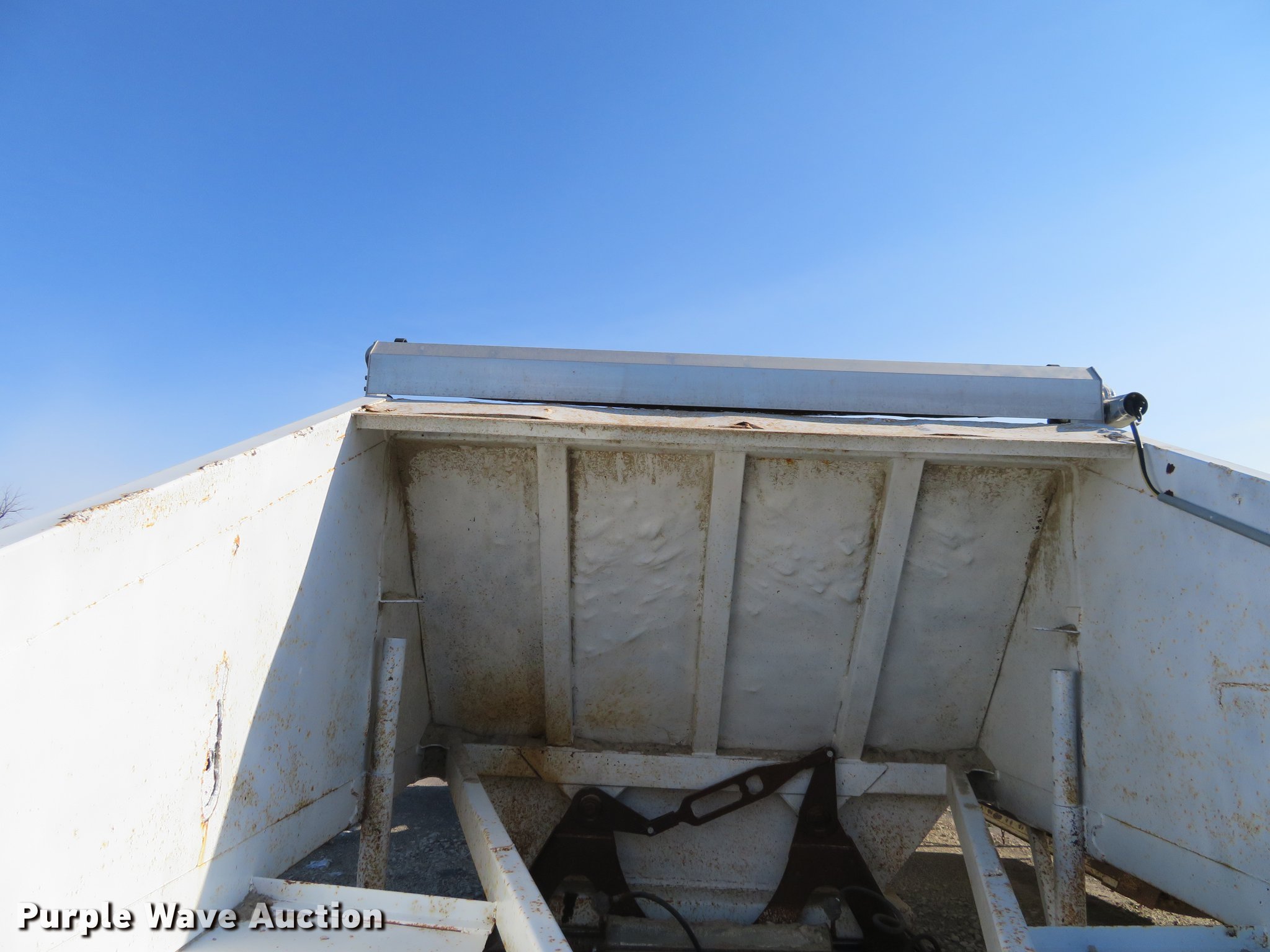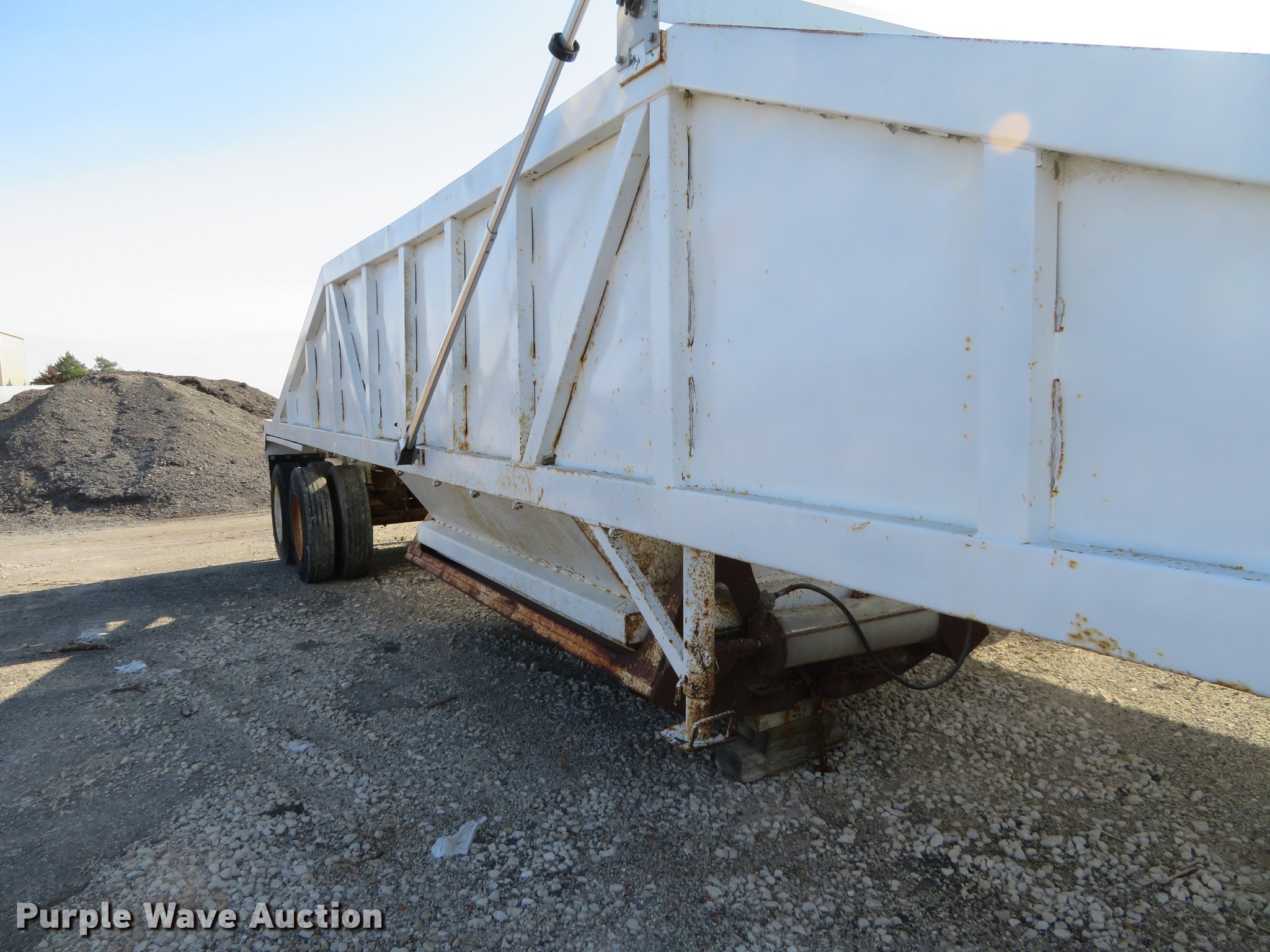 1987 Ranch bottom dump trailer. 40'L, Steel construction, Air operated gate, Electric tarp, Fifth wheel plate, Tandem axle, Spring suspension, Air brakes, 11R22.5 tires, GVWR 70,000 lbs. Kansas title. 1R9BSE506HL008506. Morris County. Council Grove, KS 66846