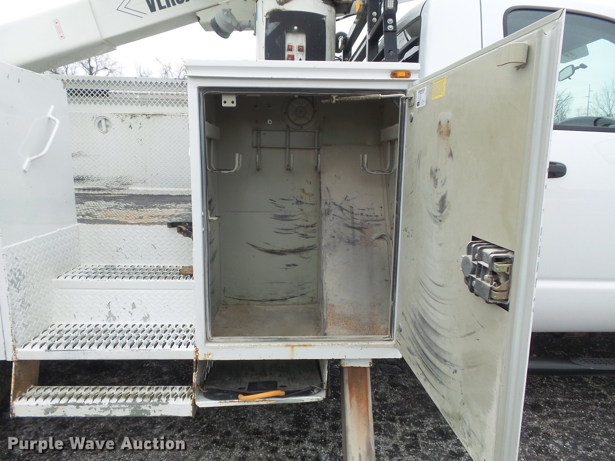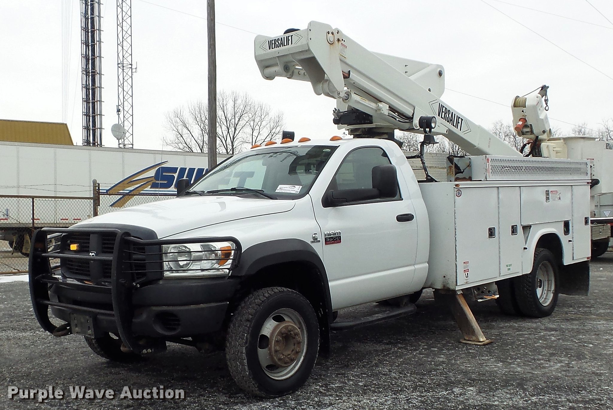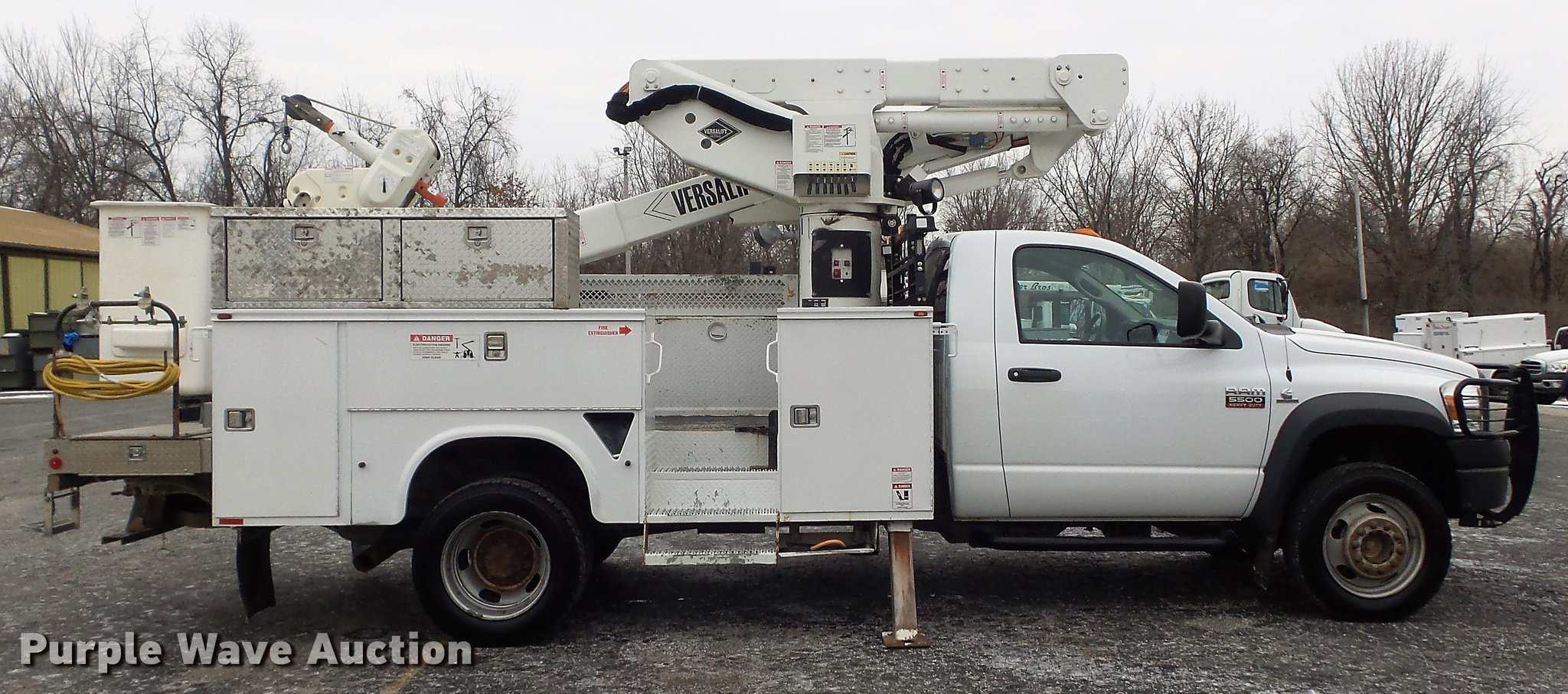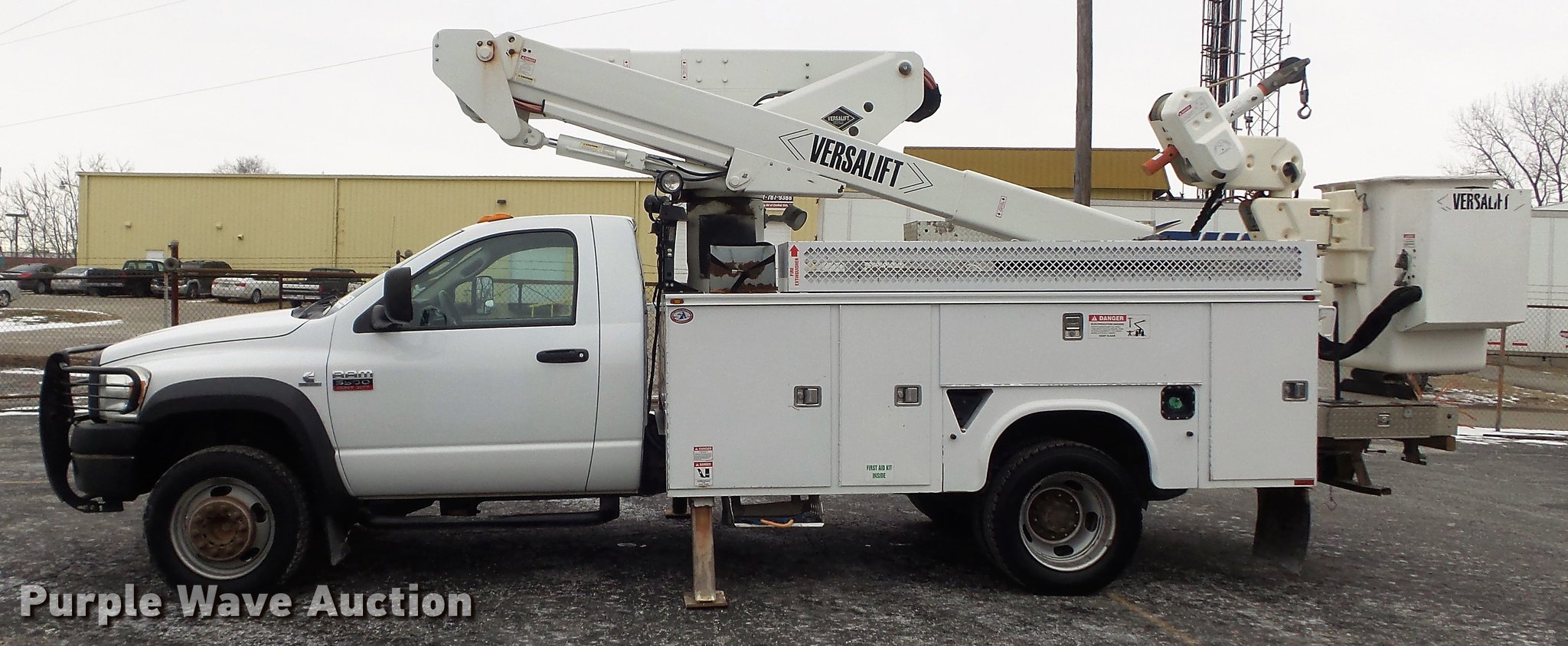 Purple Wave is selling a used Bucket Truck in Illinois. This item is a 2010 Dodge Ram 5500 bucket truck with the following: 186,023 miles on odometer, 6.7L L6 OHV 24V turbo diesel engine, Automatic transmission, Four wheel drive, Single axle, AC and heat, AM/FM, Power windows and locks, Strobe lights, Backup alarm, Block heater, Power inverter, Front tow hooks, PTO, Knapheide 6132D54J utility bed, Shelving, Compartment lights, Electrical outlet, Serial 20100729-0178471, Jib crane, 1,000 lbs max lift capacity, 2010 Versalift VST-40I boom, 400 lbs max lift capacity, 40' max lift height, Man basket, 100 degree bucket rotation, Ground and platform controls, Articulating, insulated, and telescopic boom, Rope material handler, (2) outriggers, Serial KW100047, Single fuel tank, Pintle hitch, 169" wheelbase, Spring suspension, Hydraulic brakes, 225/70R19.5 tires, GVWR 19,500 lbs, Check engine light on, Air bag light on, Dealer will perform annual PM and dielectric test on boom prior to auction
