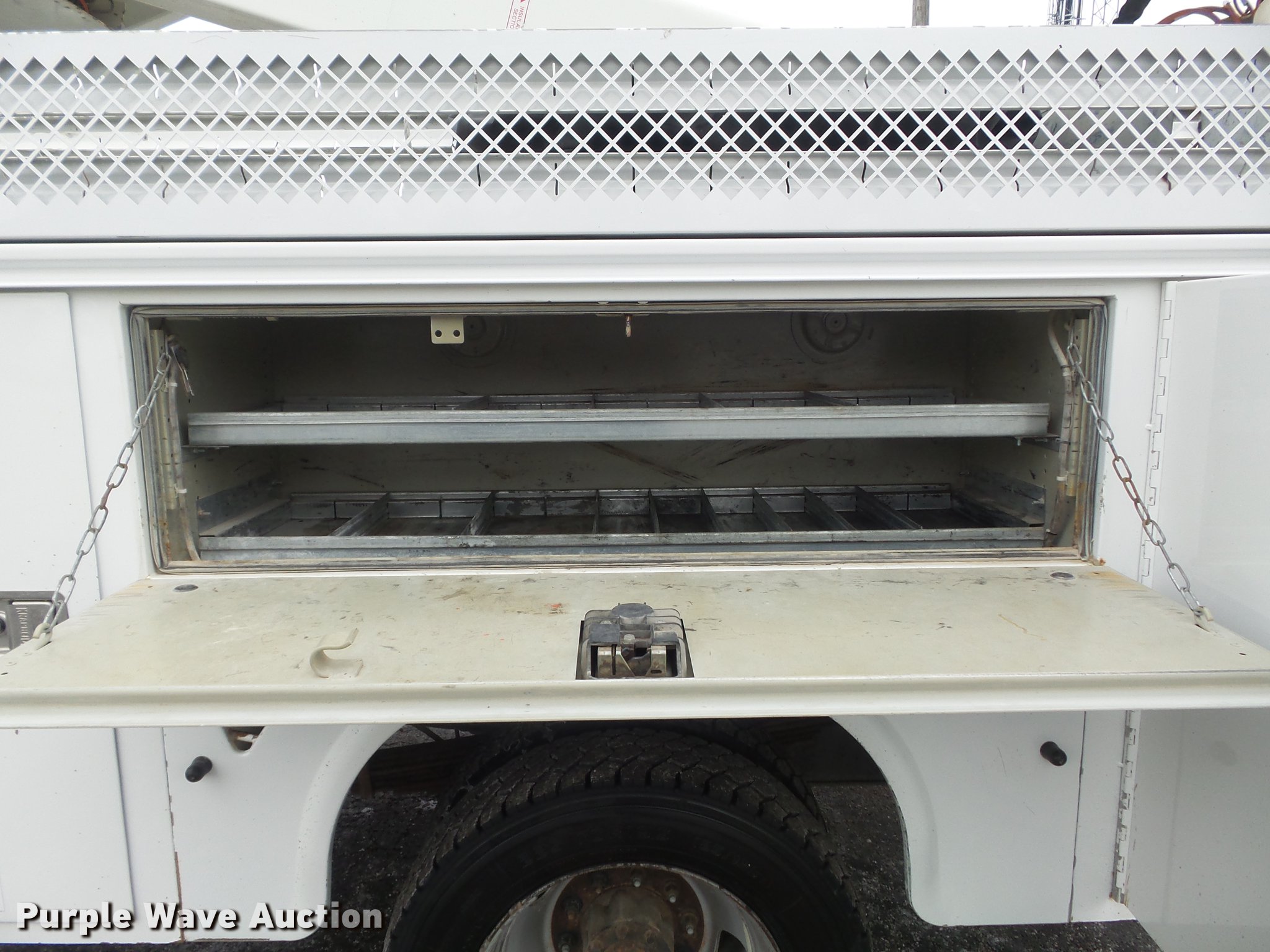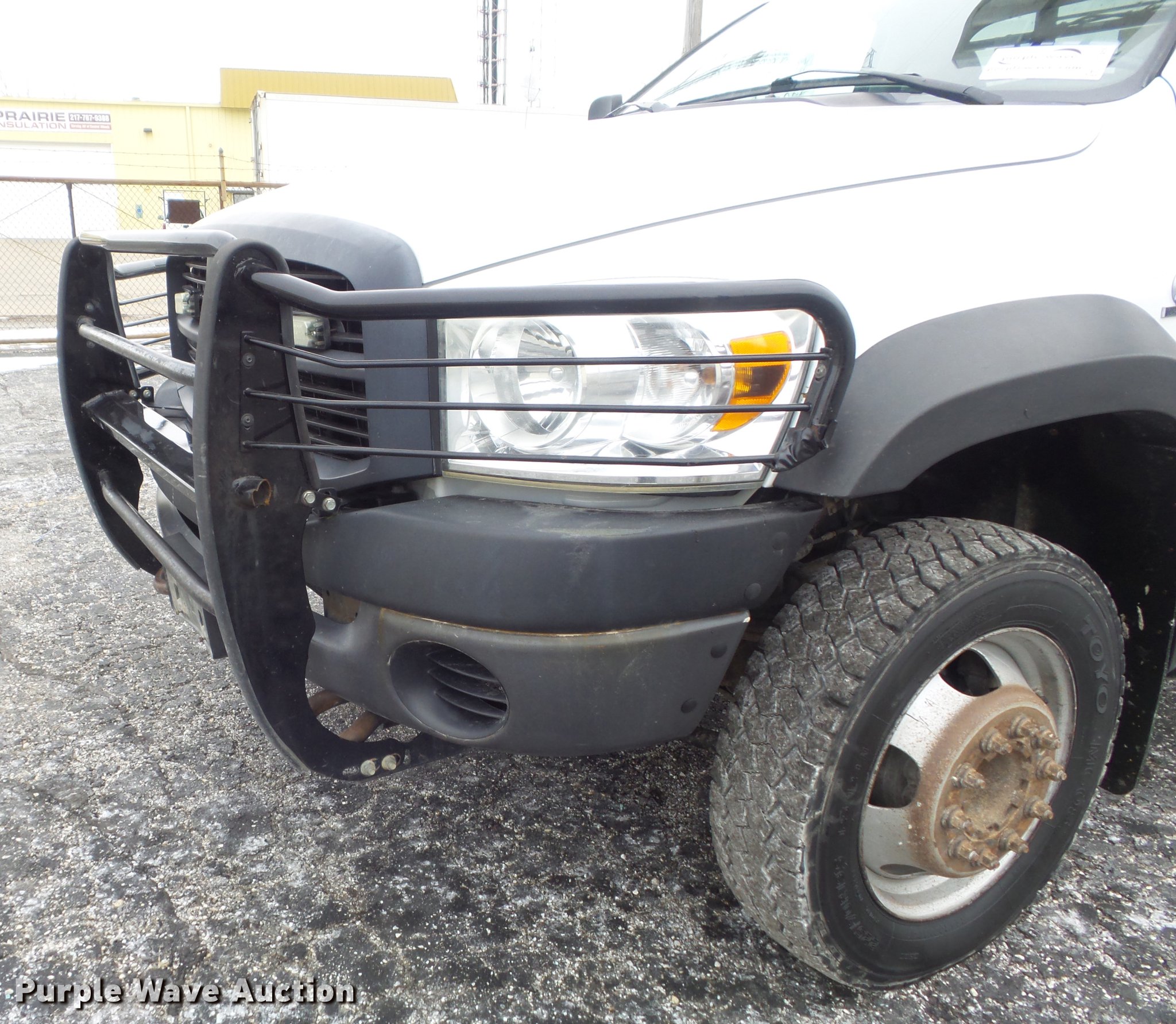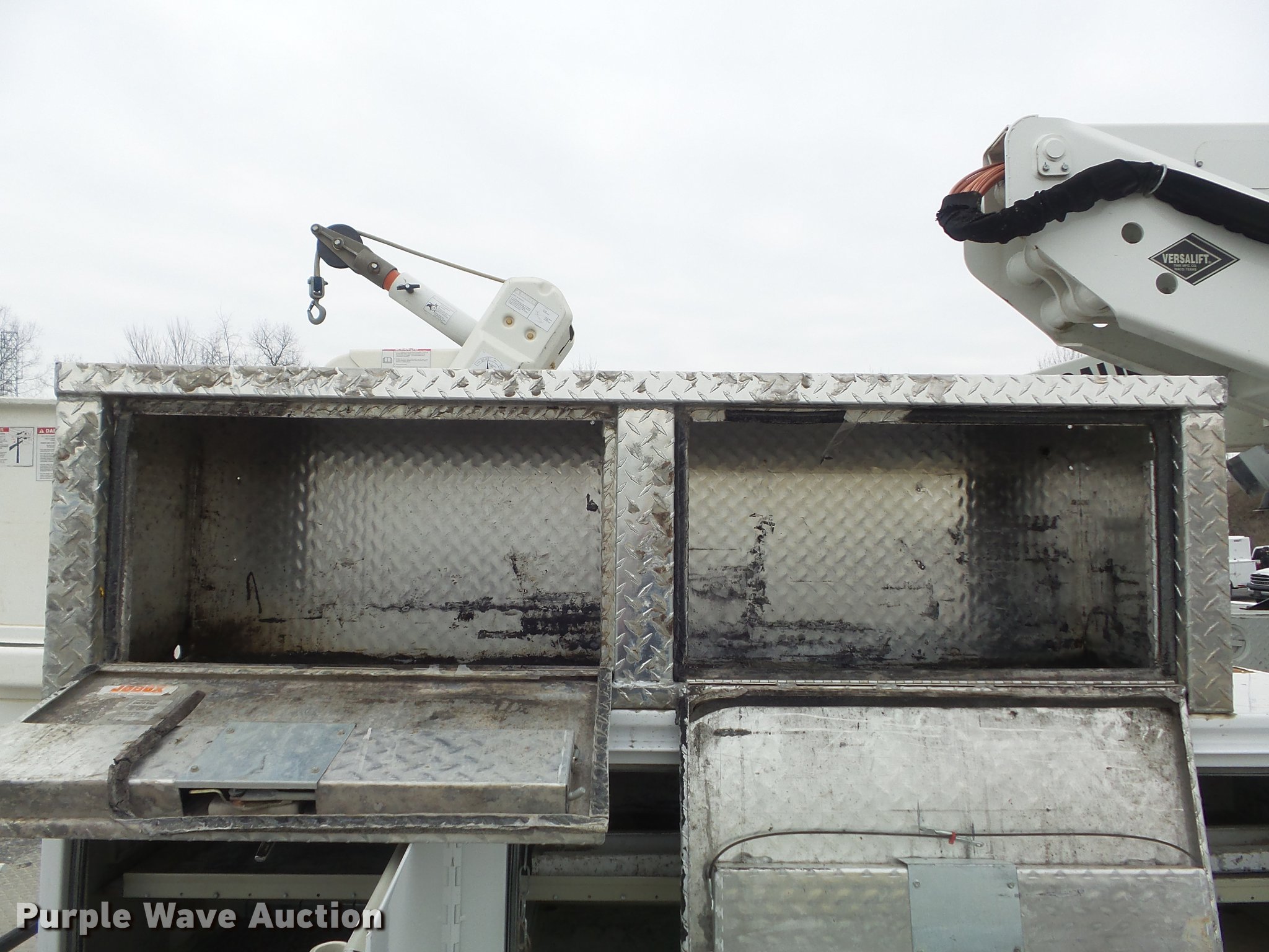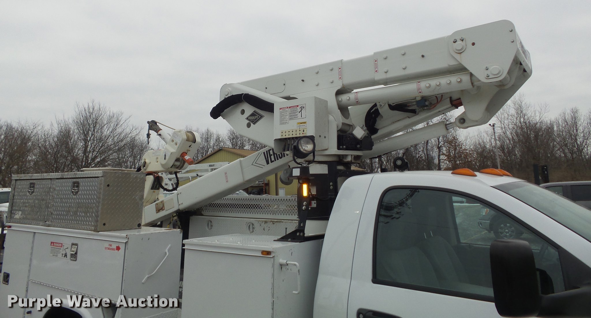 Purple Wave is selling a used Bucket Truck in Illinois. This item is a 2010 Dodge Ram 5500 bucket truck with the following: 186,023 miles on odometer, 6.7L L6 OHV 24V turbo diesel engine, Automatic transmission, Four wheel drive, Single axle, AC and heat, AM/FM, Power windows and locks, Strobe lights, Backup alarm, Block heater, Power inverter, Front tow hooks, PTO, Knapheide 6132D54J utility bed, Shelving, Compartment lights, Electrical outlet, Serial 20100729-0178471, Jib crane, 1,000 lbs max lift capacity, 2010 Versalift VST-40I boom, 400 lbs max lift capacity, 40' max lift height, Man basket, 100 degree bucket rotation, Ground and platform controls, Articulating, insulated, and telescopic boom, Rope material handler, (2) outriggers, Serial KW100047, Single fuel tank, Pintle hitch, 169" wheelbase, Spring suspension, Hydraulic brakes, 225/70R19.5 tires, GVWR 19,500 lbs, Check engine light on, Air bag light on, Dealer will perform annual PM and dielectric test on boom prior to auction