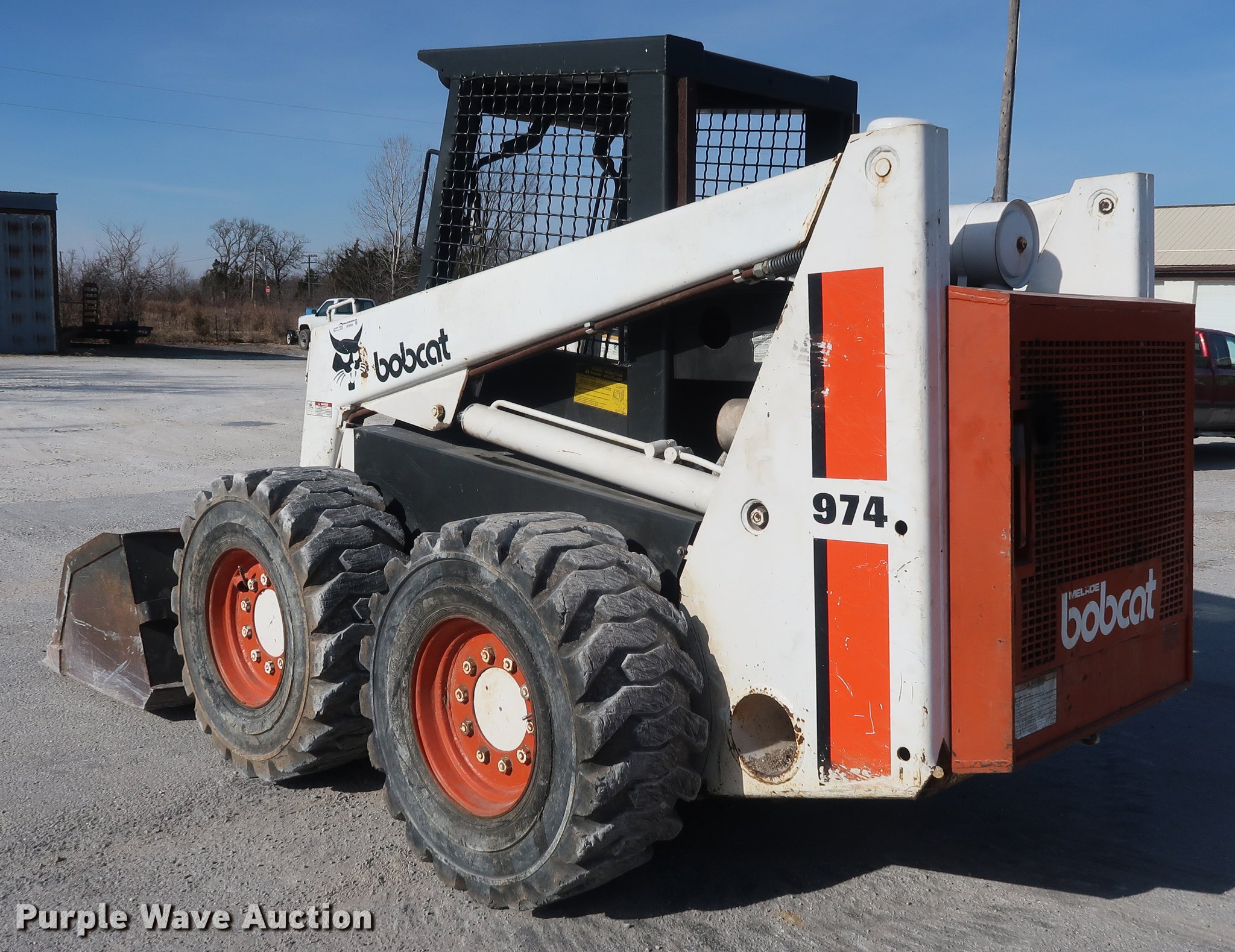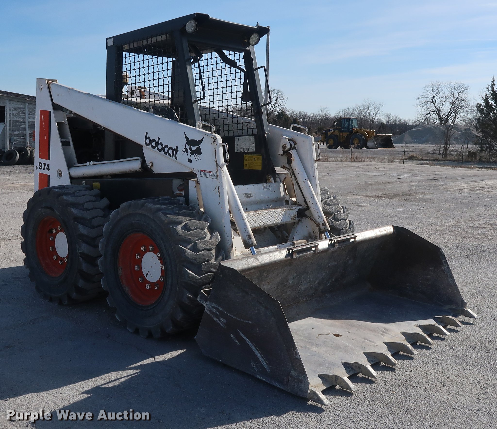 Purple Wave is selling a used Skid Steer Loader in Missouri. This item is a 1977 Bobcat 974 skid steer with the following: 759 hours on meter, Kubota four cylinder diesel engine, Hydrostatic transmission, Open station/canopy, Hand and foot controls, Front and rear work lights, 86"W bucket, Bolt-on teeth, Auxiliary hydraulics, 15-19.5 tires, Serial 4969-M-11021