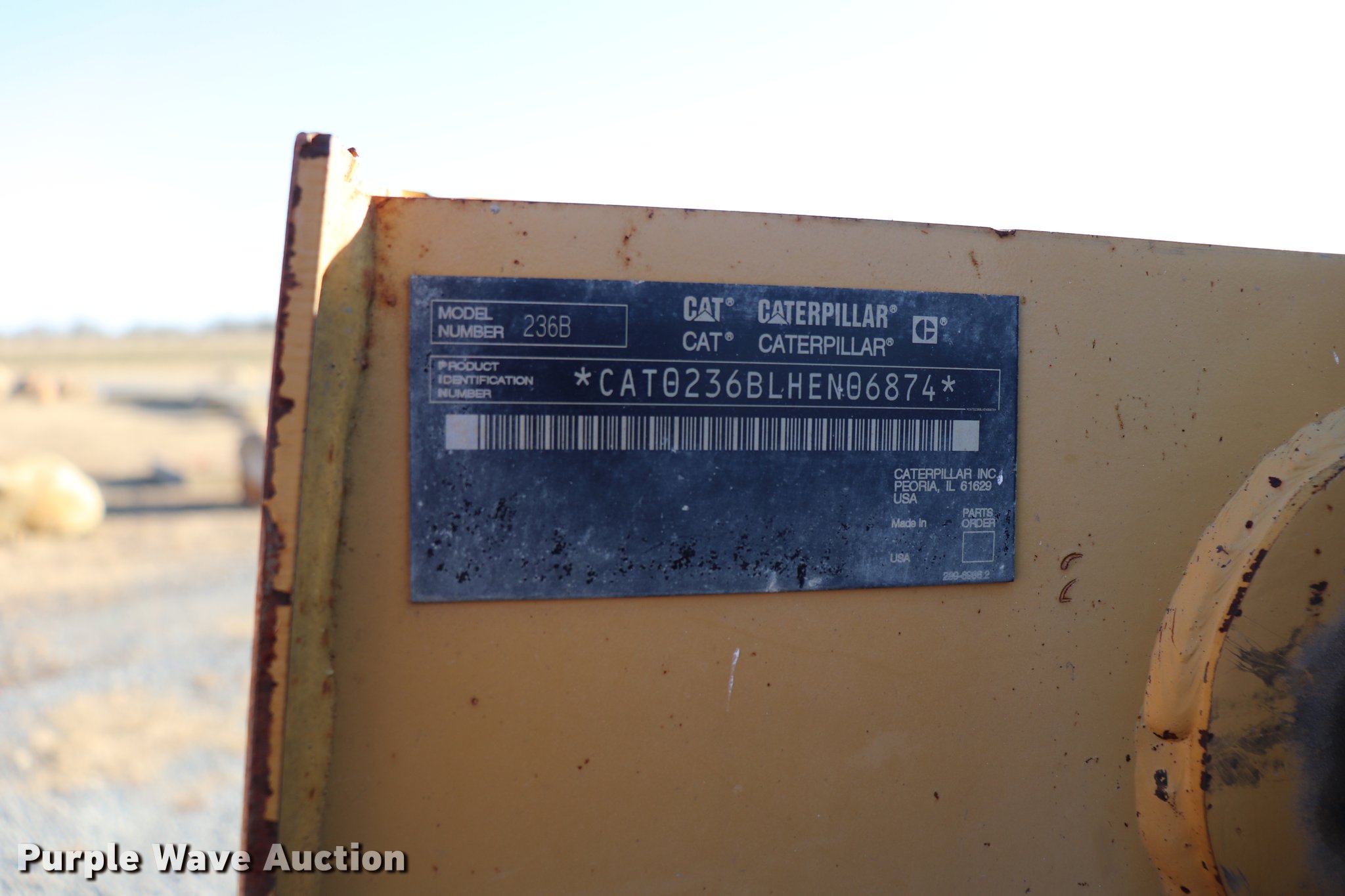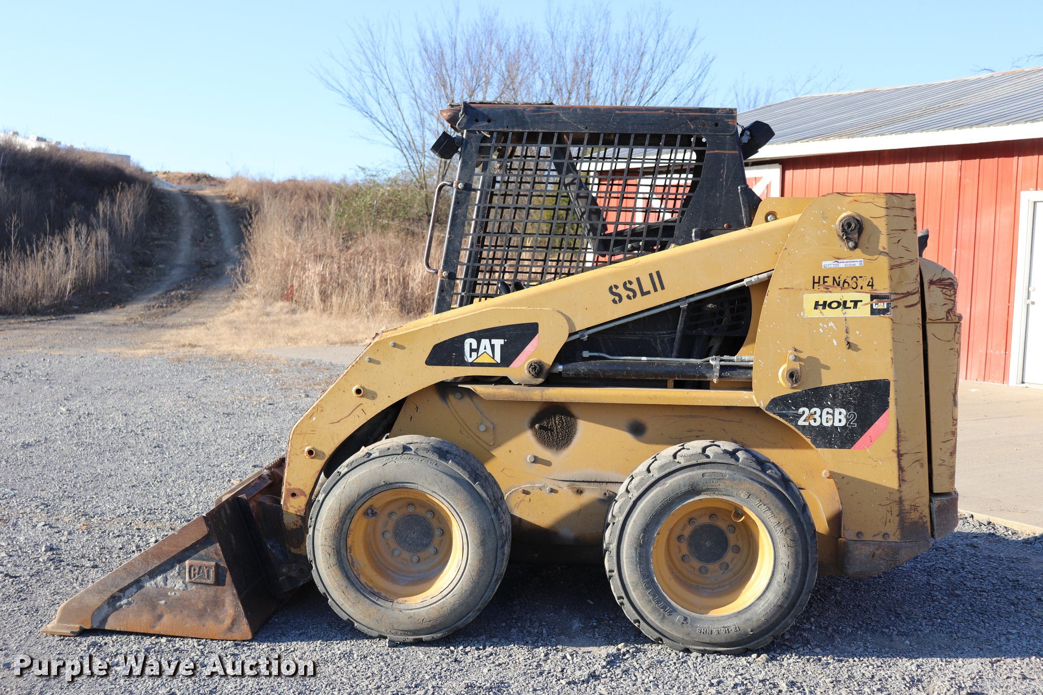 Purple Wave is selling a used Skid Steer Loader in Oklahoma. This item is a Caterpillar 236B Series 2 skid steer with the following: 6,673 hours on meter, Hours may vary, unit is still in use, Caterpillar four cylinder turbo diesel engine, Hydrostatic transmission, Enclosed cab, Serial SAEJ1040, Joystick controls, Spring suspension seat, Front and rear work lights, Backup alarm, 73"W bucket, Bolt-on cutting edge, Auxiliary hydraulics, 12-16.5 tires, Serial CAT0236BLHEN06874