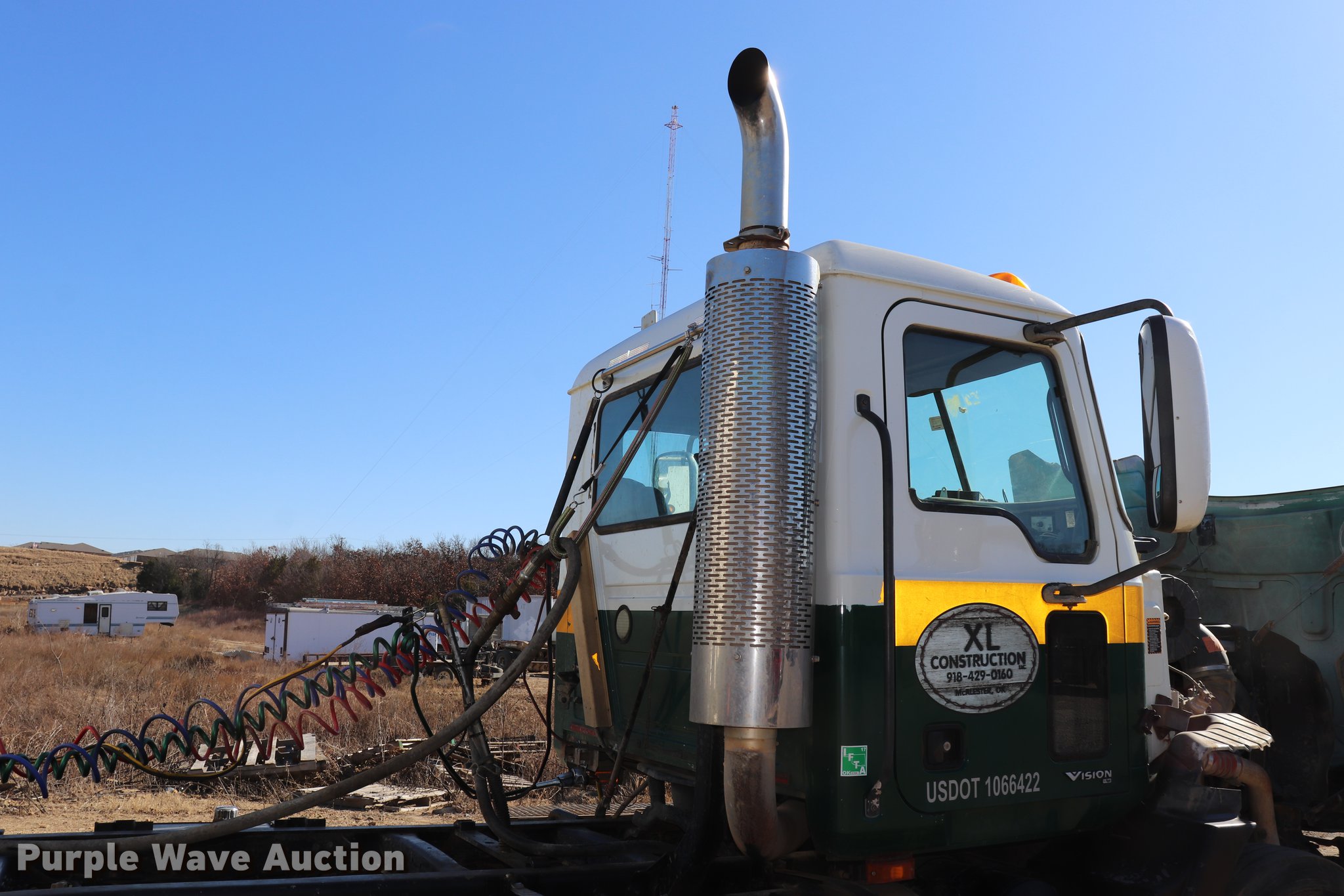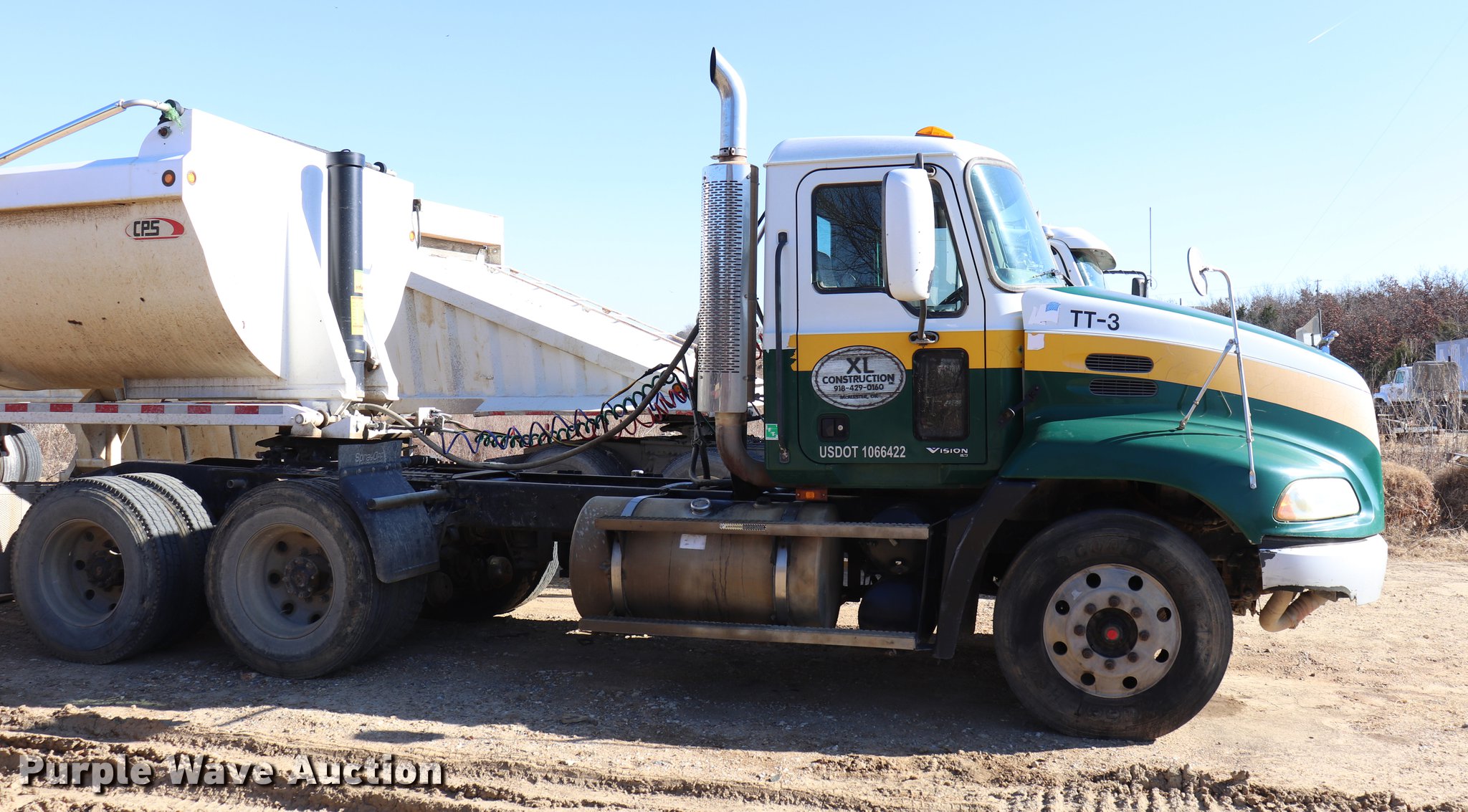 2005 Mack CX613 semi truck. 524,227 miles on odometer, 14,084 hours on meter, Miles and hours may vary, unit still in use, Mack E7 12.0L L6 turbo diesel engine, Eaton Fuller 10 speed manual transmission Two speed rear end, AC And heat, Cruise, AM/FM/cassette, Power windows, locks, and mirrors, Leather air suspension seat, Air ride cab, PTO, Wet kit, Front tow hooks, Single fuel tank, Mud flaps, Air operated fifth wheel plate, Single rear exhaust stack, 186" wheelbase, Spring suspension, Air brakes, 11R22.5 tires, Windshield chipped, Contents not included, Unit# TT-3. Oklahoma title. Title has a lien that will be released following the close of the auction. Title distribution may be delayed up to 30 days from verification of funds. 1M1AE05Y75N021121. XL Construction. 1700 West Side Rd. McAlester, OK 74501