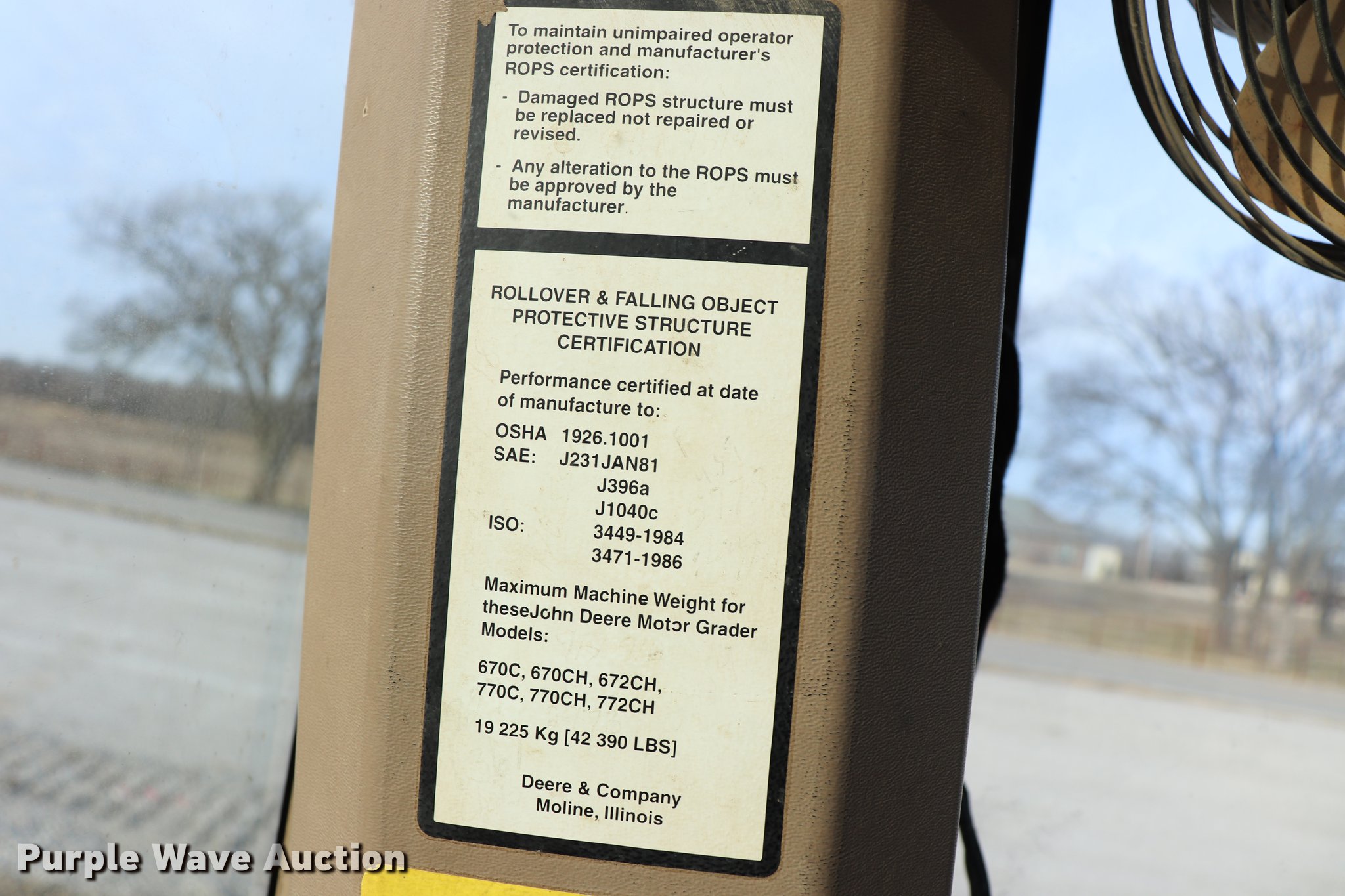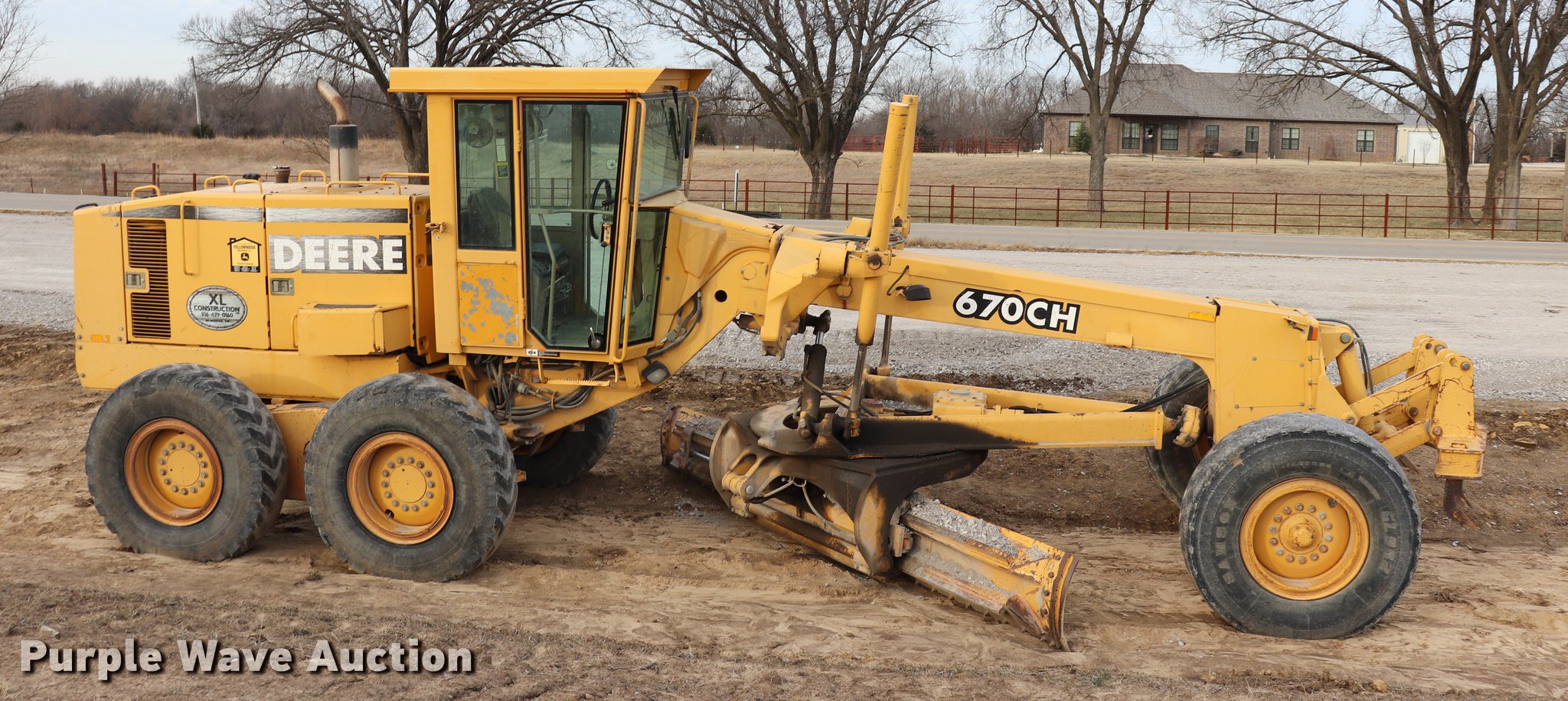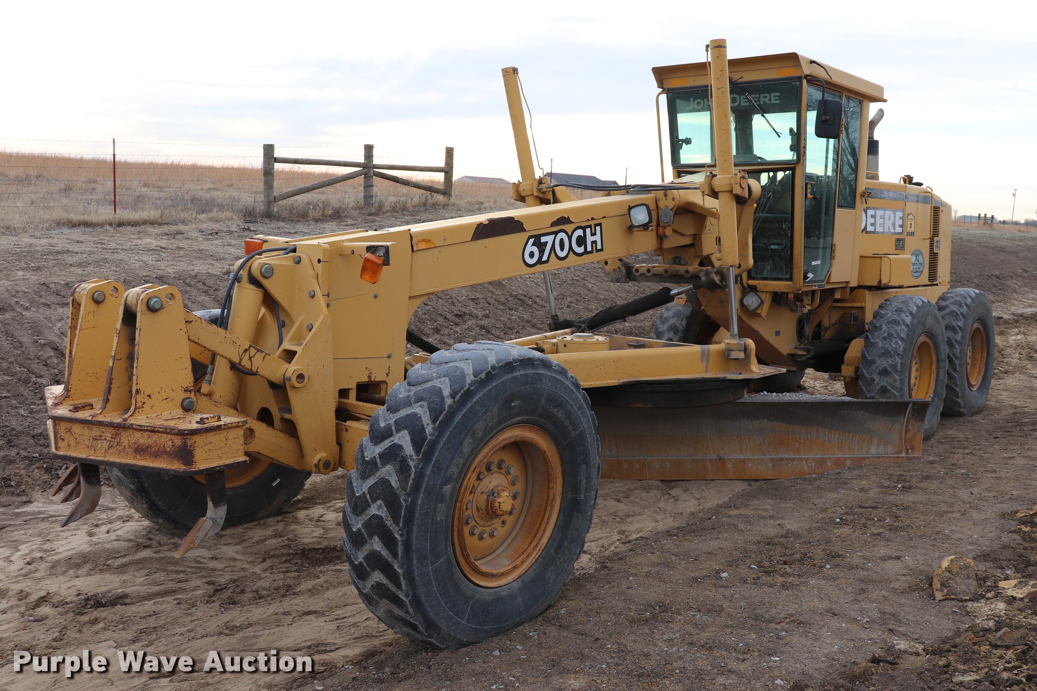 Purple Wave is selling a used Motor Grader in Oklahoma. This item is a 1997 John Deere 670CH motor grader with the following: 14,024 hours on meter, Six cylinder turbo diesel engine, Powershift transmission, 8F-8R gears, Differential lock, EROPS, AC and heat, AM/FM, Suspension seat, Nine control valves, Front and rear work lights, 165"W moldboard, Tip control, Side shift, Front mounted scarifier, (4) teeth, 14.00-24 tires, Unit is still in use, Left door handle inoperable, Intermittent hydraulic leak, Serial DW670CH563842