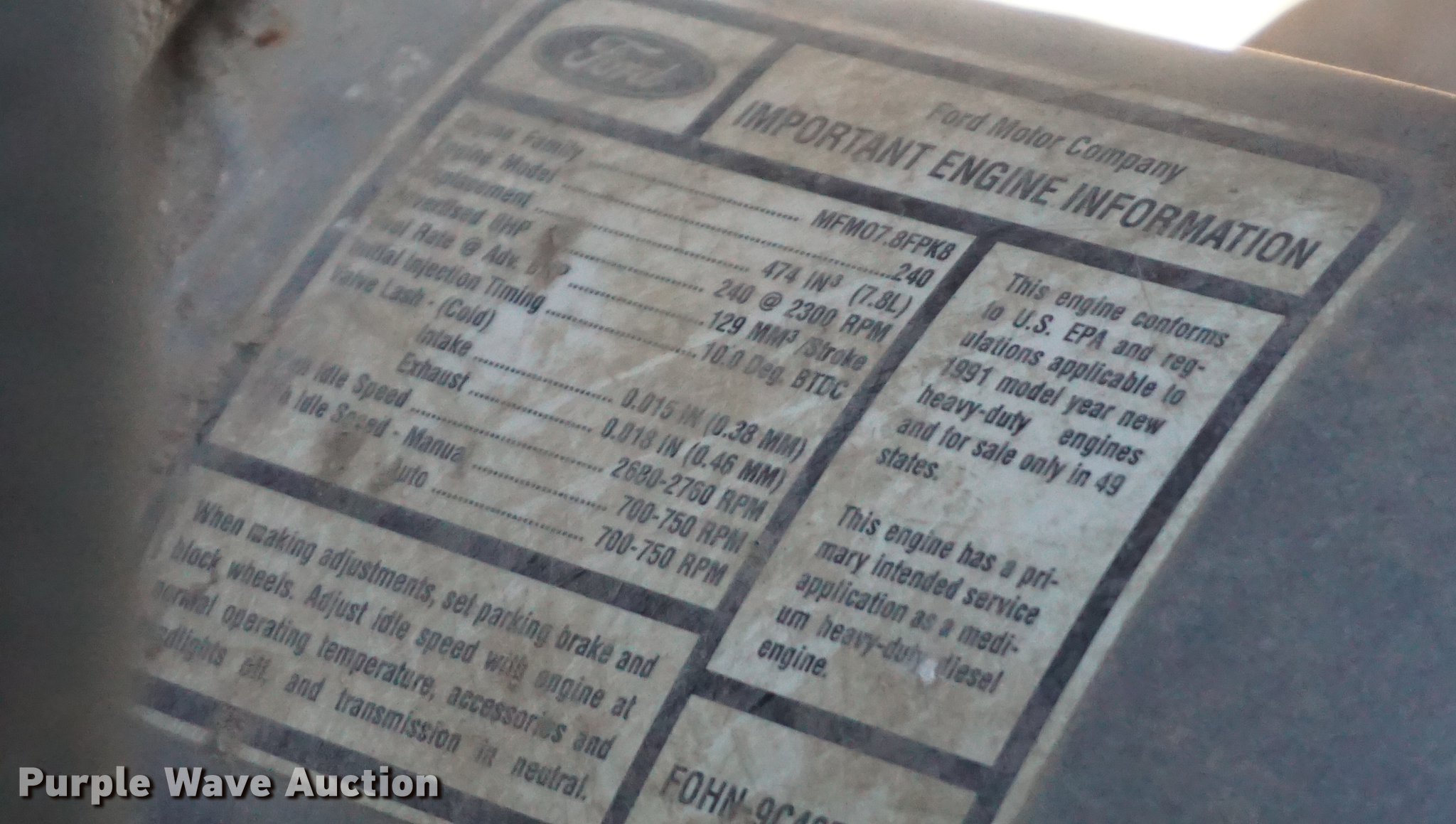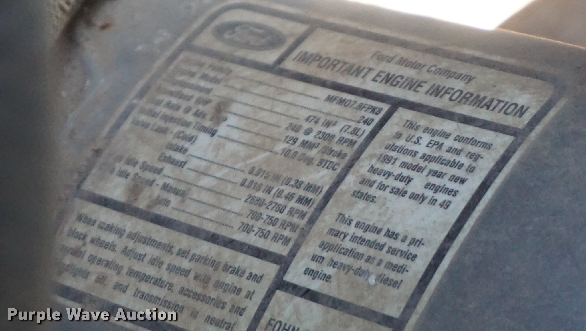 Purple Wave is selling a used Applicator Truck in Kansas. This item is a 1992 Ford L8000 applicator truck with the following: 51,187 miles on odometer, Ford 240 7.8L L6 turbo diesel engine, 240 HP, Automatic transmission, New Leader L-2020-12 dry fertilizer spreader, 22"W conveyor belt, Dual spinners, Rollover tarp, Serial 100703, 48x25.00-20 front tires, 66x43.00-25 rear tires, Non-operational unit