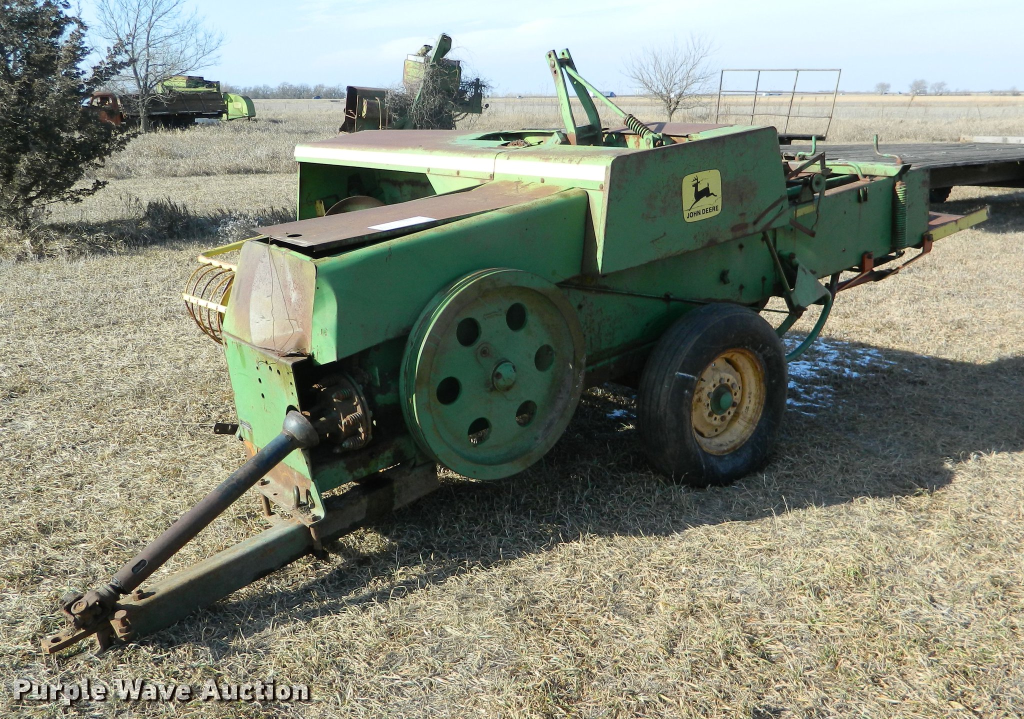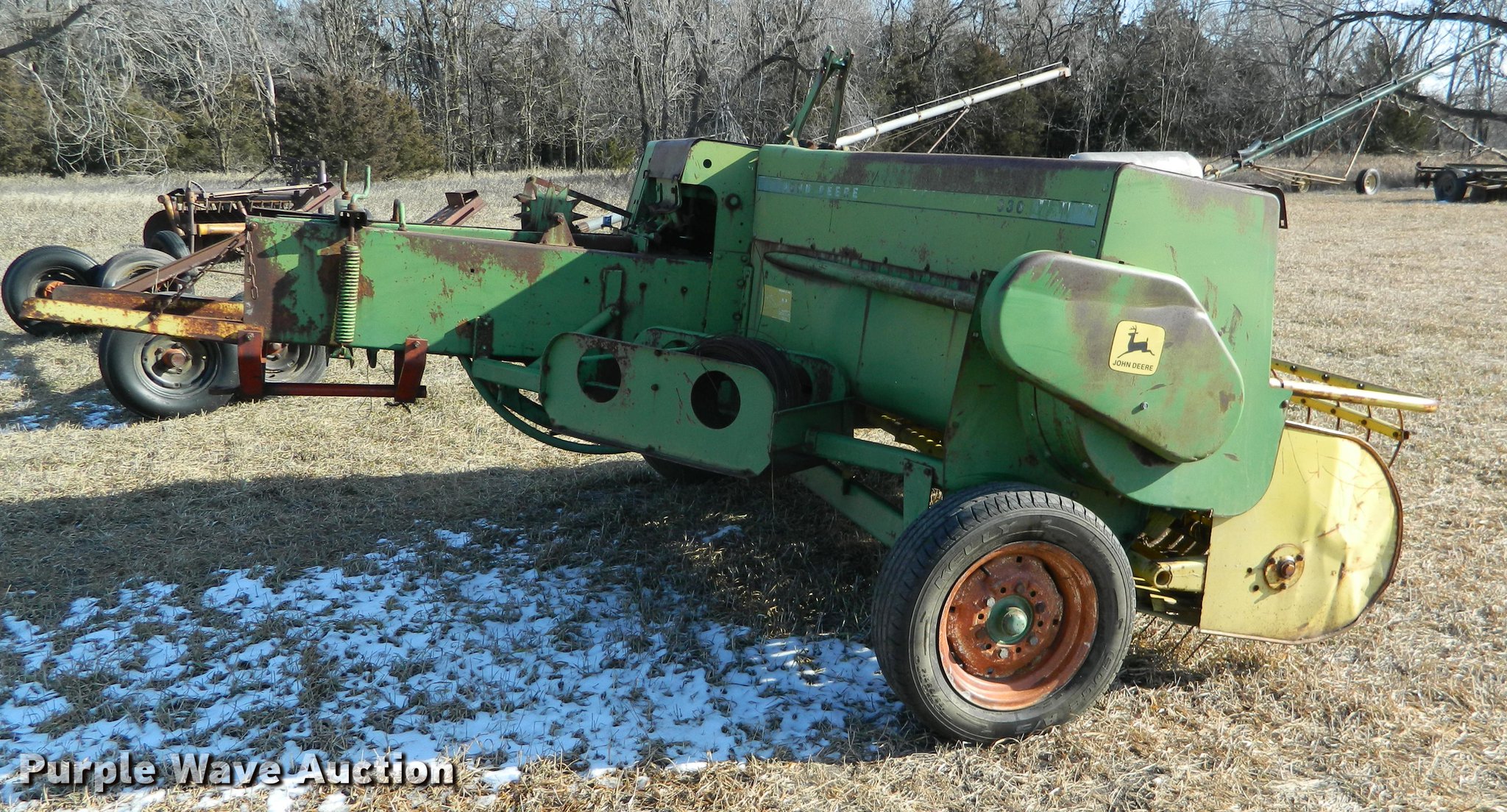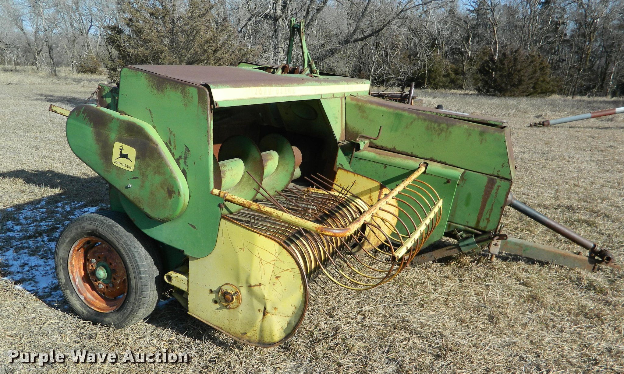 Purple Wave is selling a used Square Baler in Kansas. This item is a John Deere 336 small square baler with the following: 18" x 60" chamber, 54"W pickup, Wire tie, 540 PTO, 14" tires, Serial 014454E