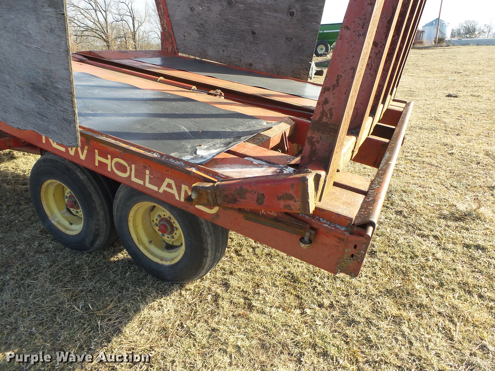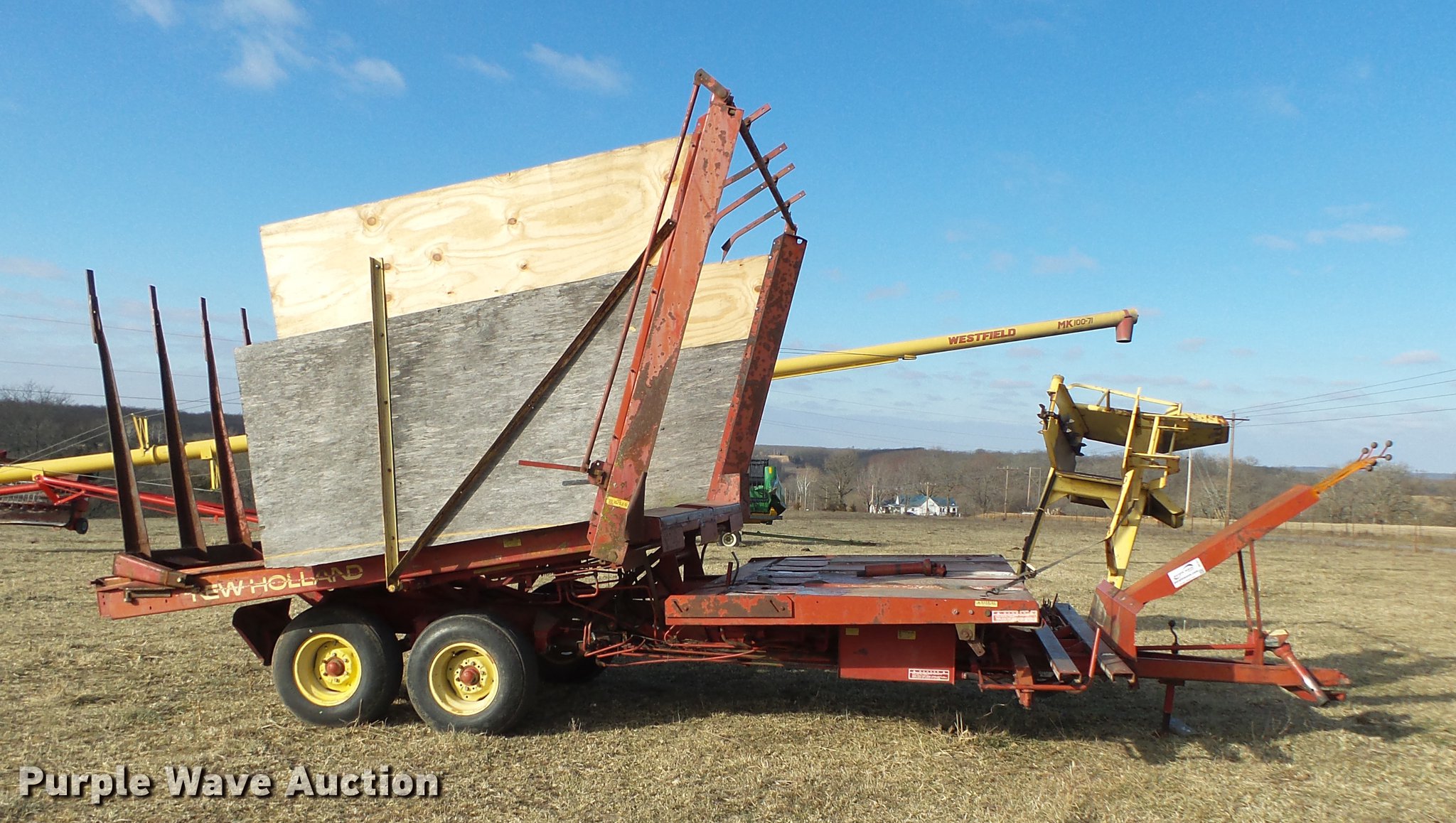 Purple Wave is selling a used Hay Handling in Missouri. This item is a New Holland Stackliner 1034 bale stacker with the following: Approx. 23'10"L x 11'2"W x 12'7"H, Approx. 103 bale capacity, 540 PTO, Pin hitch, Tandem axle, 11L-15 tires, Serial 2987