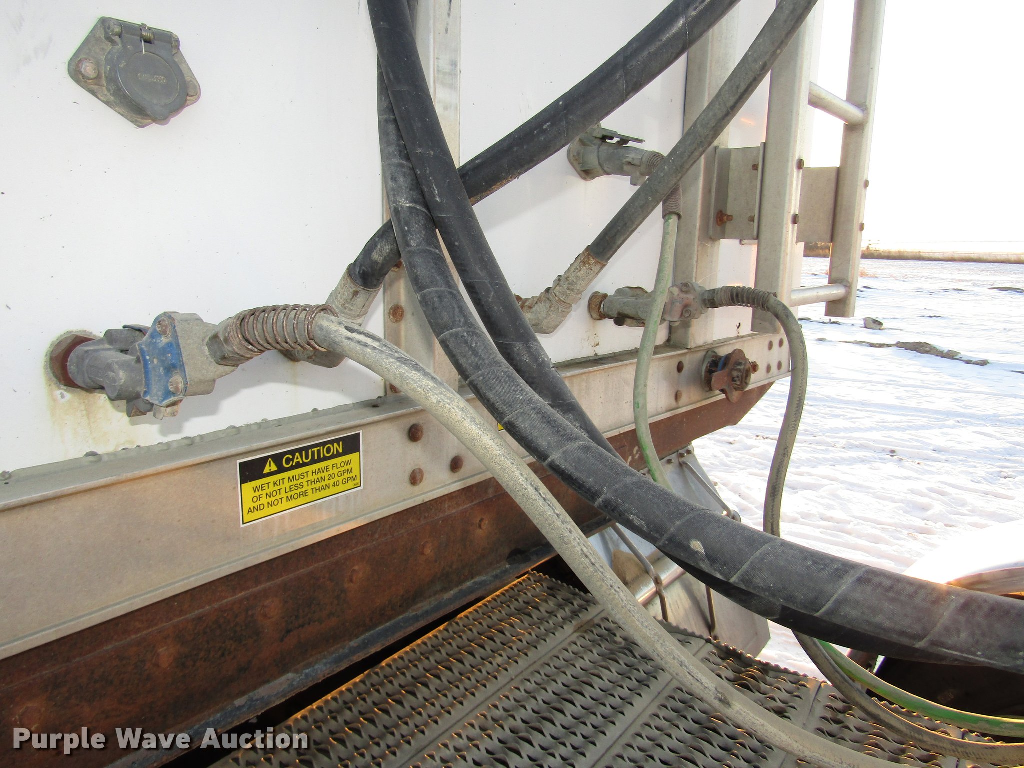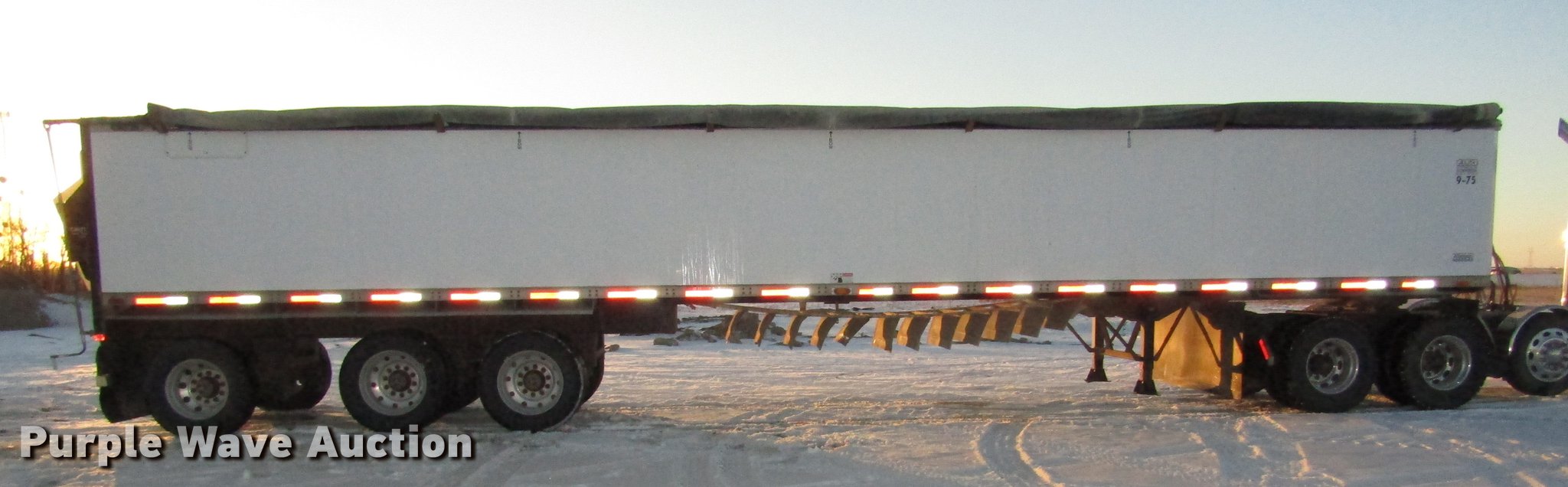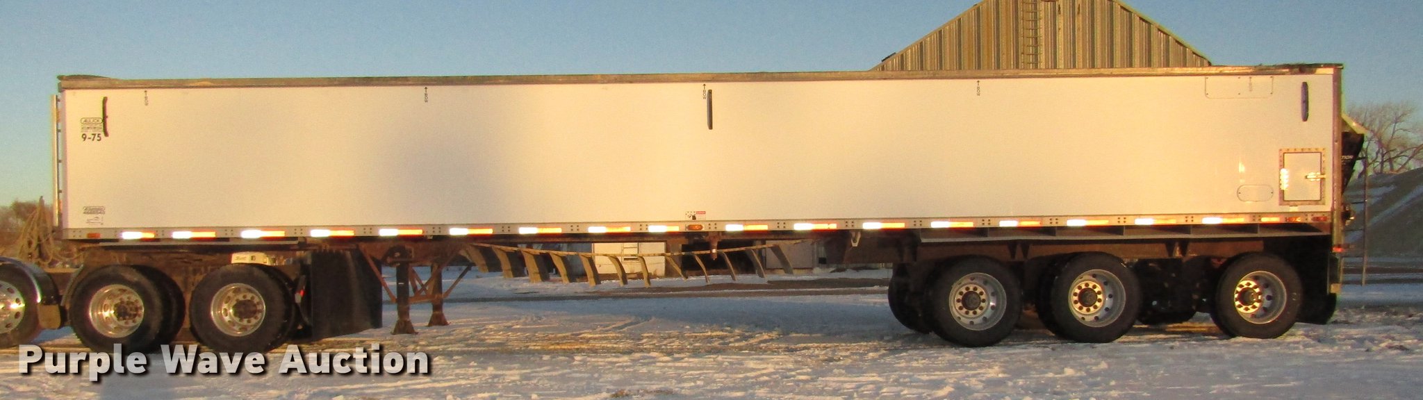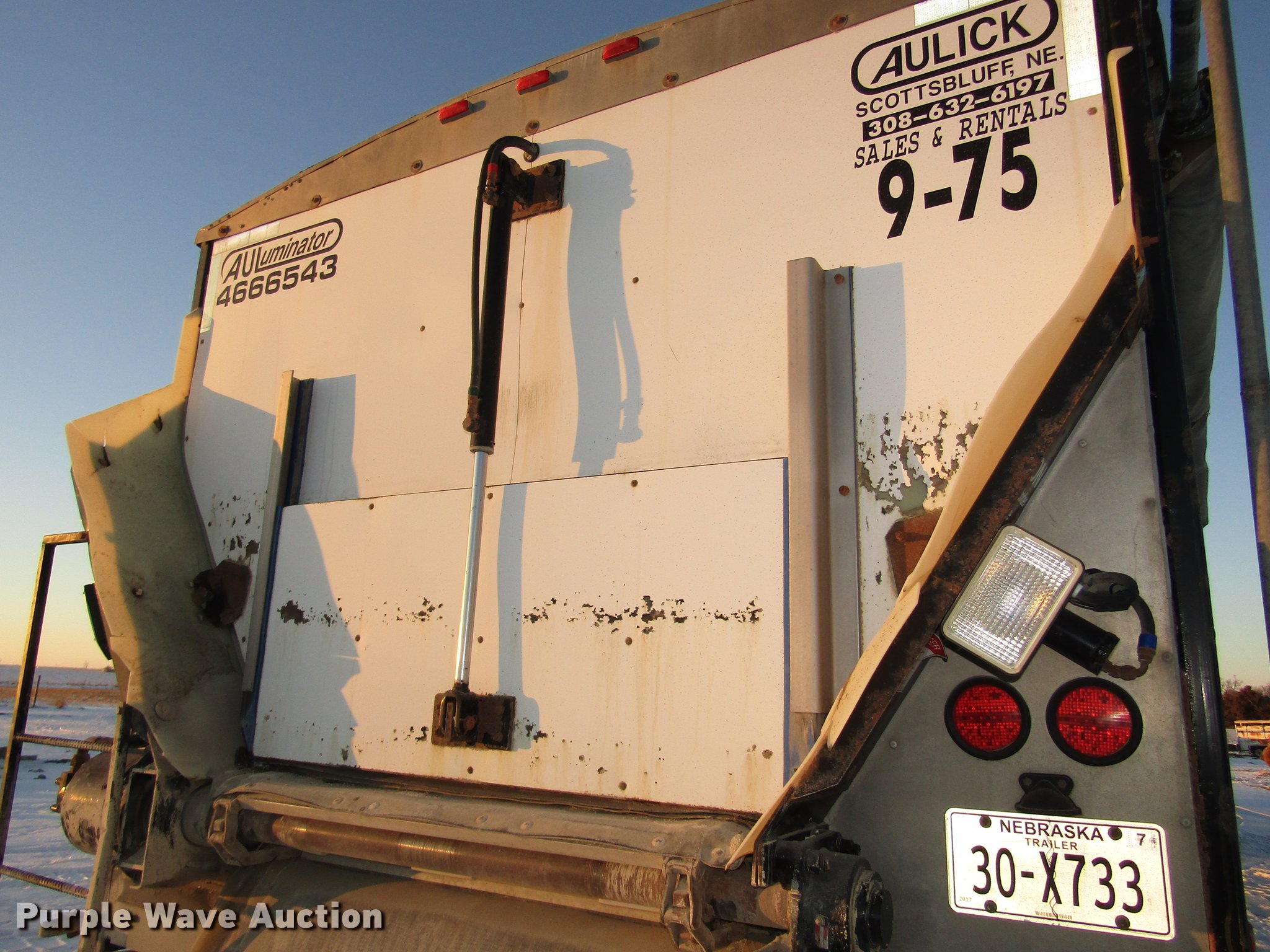 Purple Wave is selling a used Grain or Commodity Trailer in Nebraska. This item is a 2009 Aulick Aluminator 9-75 live bottom trailer with the following: Model 4666543, 46'L x 102"W, 45 1/4"W apron, Front and rear ladders, 53"W belted bottom, Variable floor speed, Roll tarp, Rear work lights, Top hinge hydraulic main gate, 56.5"W center knife gate, Extended rear discharge with wings, Lined sides, Aluminum construction, Fifth wheel plate, Dual leg two speed landing gear, Air suspension, Air brakes, Triple axle, Aluminum and steel wheels, 285/75R24.5 tires, 11R22.5 tag axle tires, GVWR 75,000 lbs