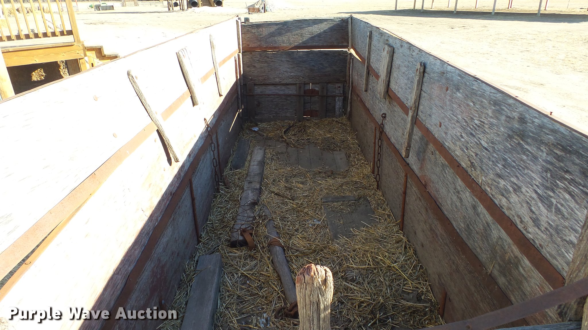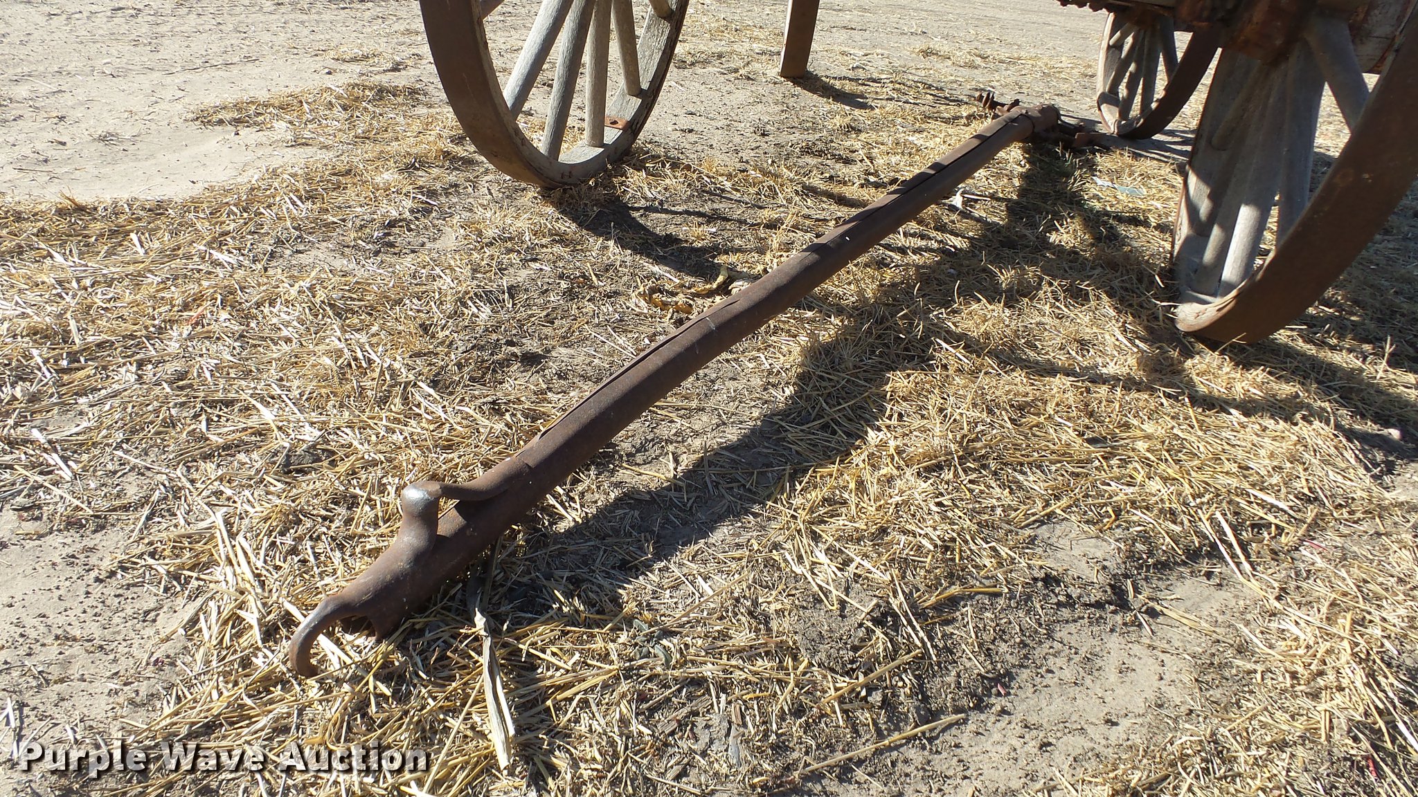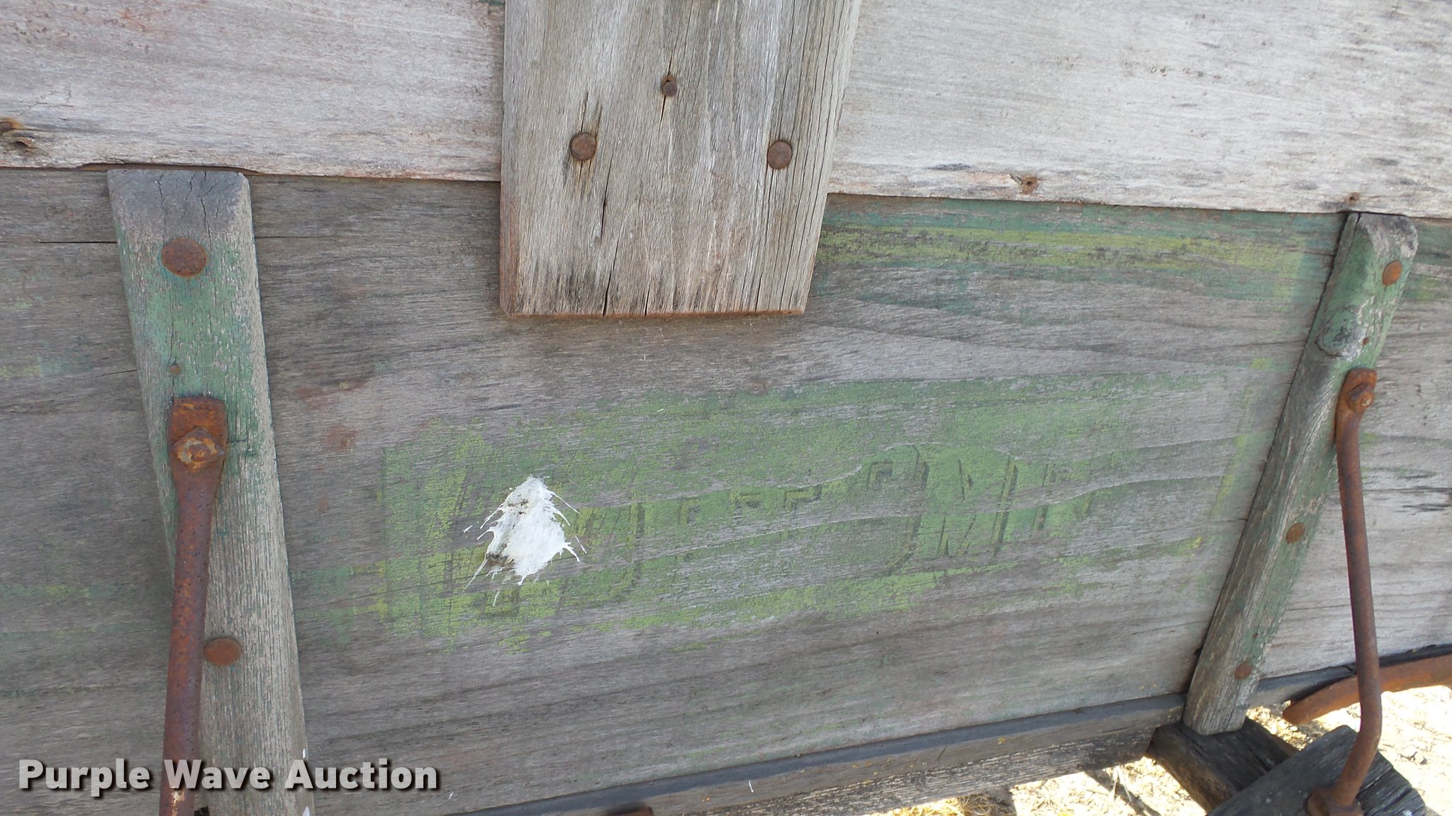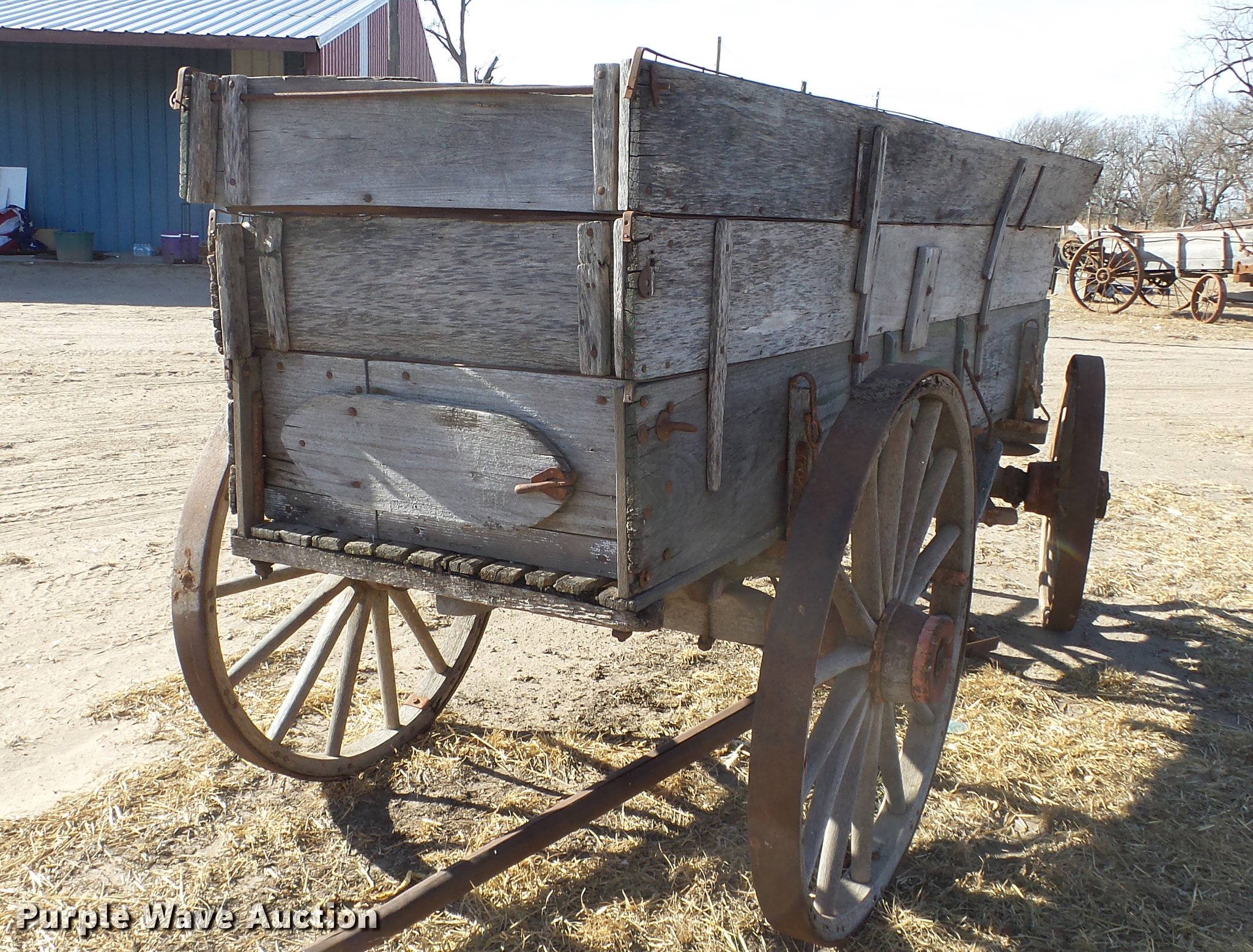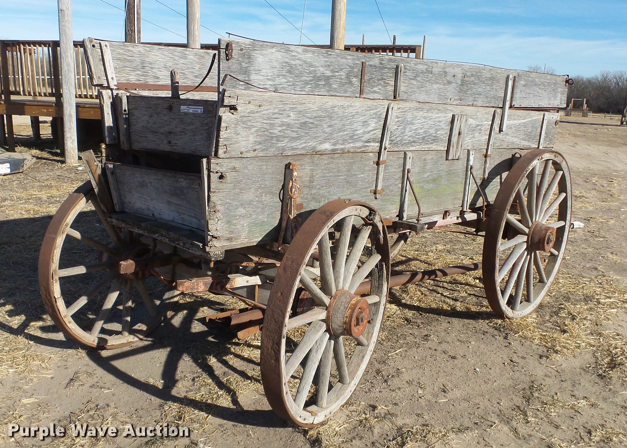 Purple Wave is selling a used Hay Handling in Kansas. This item is a Hay wagon with the following: 126"L x 38"W, Wood floor and sides, Clevis hitch, Wood and steel wheels