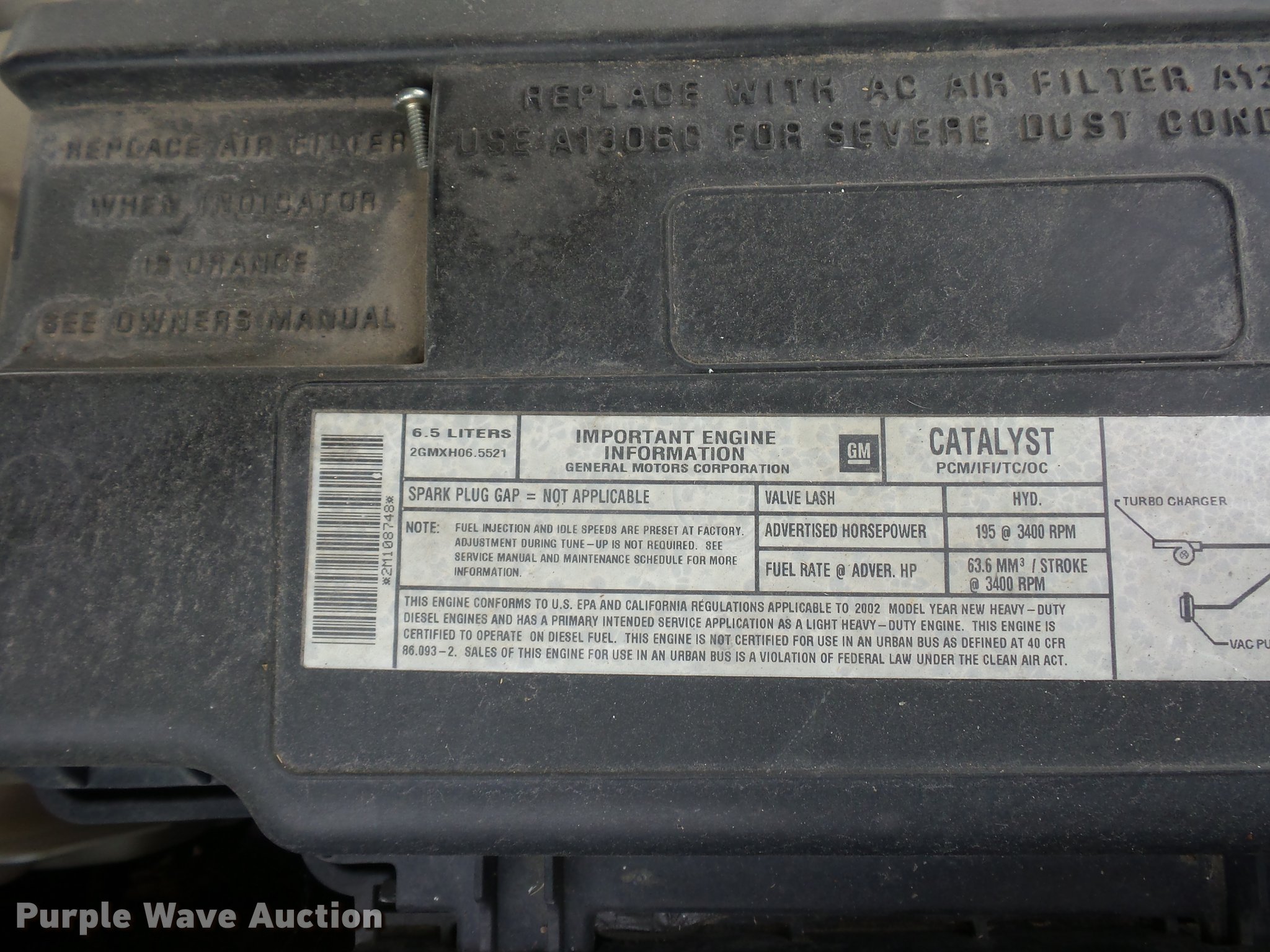 Purple Wave is selling a used 3/4 or 1 Ton Pickup or Van in Missouri. This item is a 2002 Chevrolet 3500 flatbed pickup truck with the following: 99,283 miles on odometer, 6.5L V8 OHV 16V turbo diesel engine, Automatic transmission, AM/FM, Manual windows and locks, 11'L x 96'W flatbed, Receiver hitch, Trailer wiring, Gooseneck ball, 225/70R19.3 tires, Unknown operating condition, Engine issues