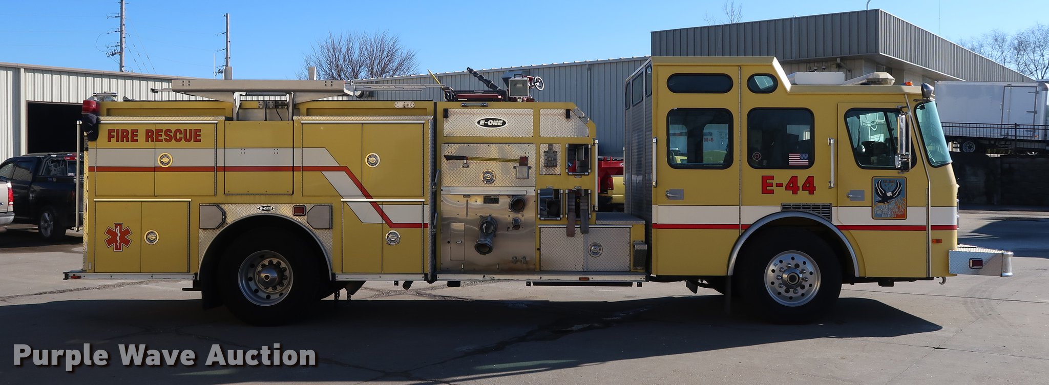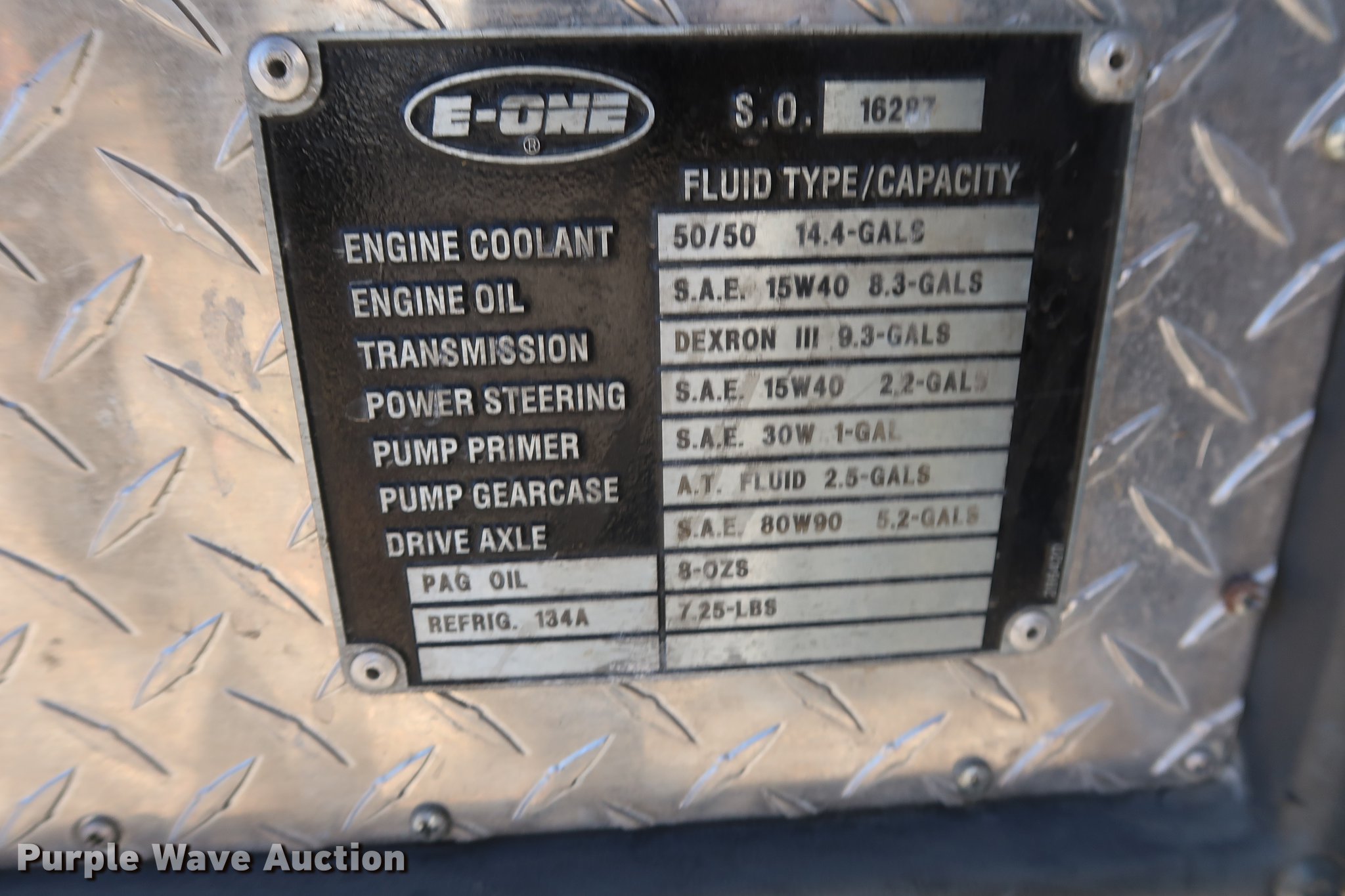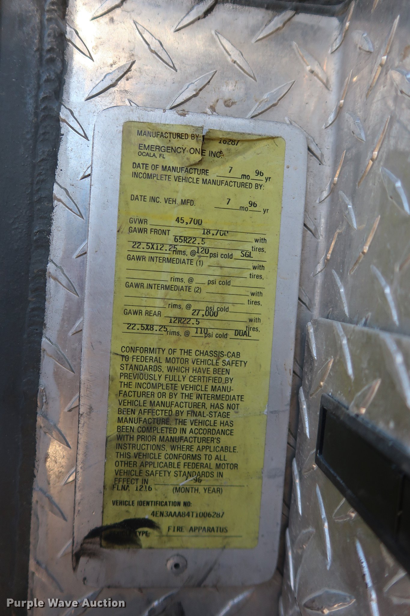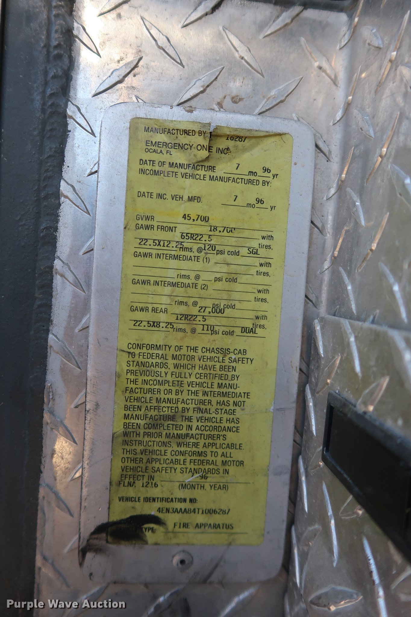 Purple Wave is selling a used Fire Truck or Emergency Vehicle in Missouri. This item is a 1996 Emergency One E-One fire truck with the following: 55,584 miles on odometer, 9,236 hours on meter, Cummins M11 10.8L L6 diesel engine, Automatic transmission, AC and heat, Air suspension seat, PTO, E-One platform, 1,500 gpm pump, E-One fire apparatus, Water gun, Hose, 750 gallon tank, Honda EM5000S generator, 120/240V, Air brakes, 385/65R22.5 front tires, 12R22.5 rear tires, Contents not included
