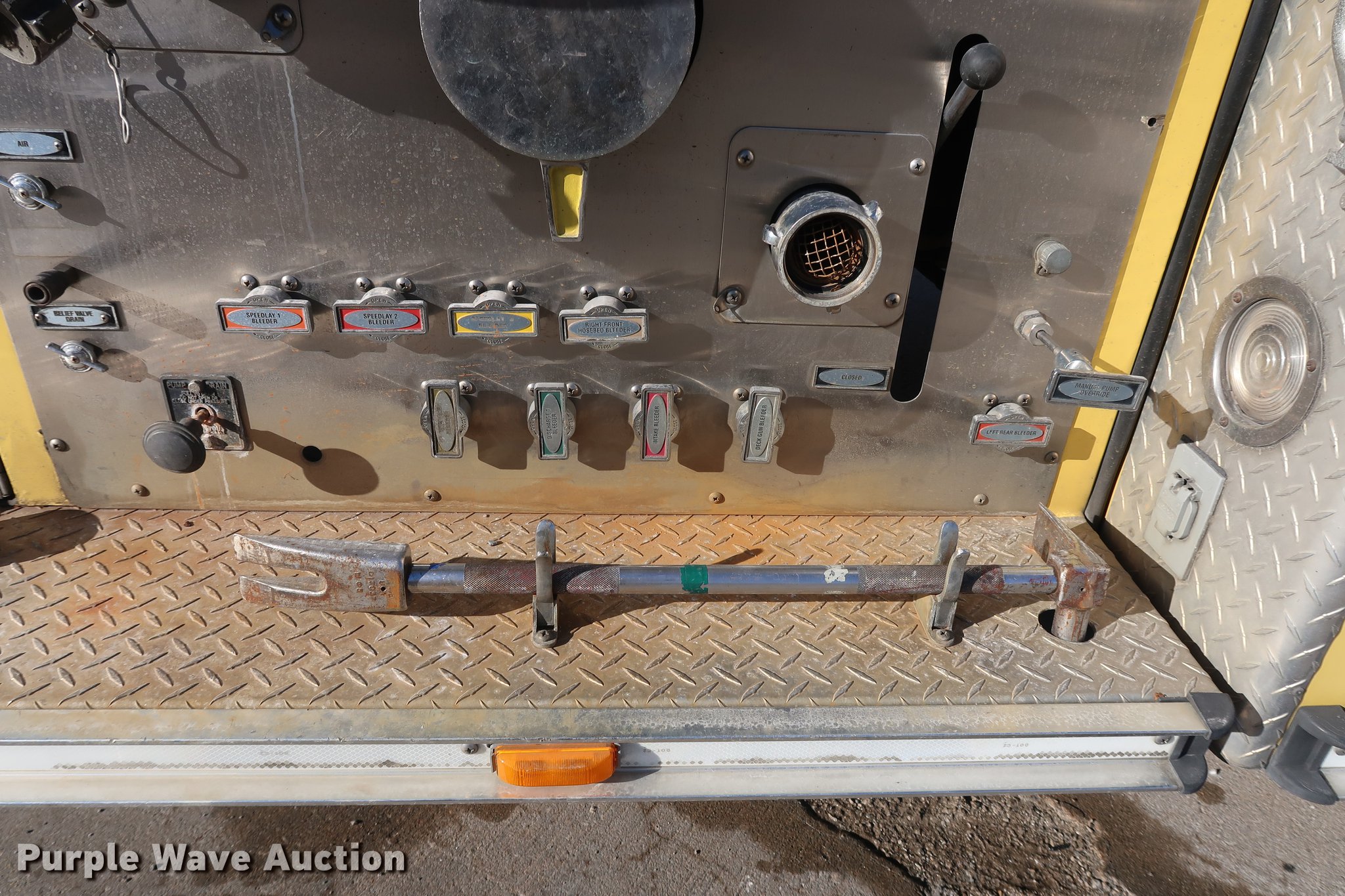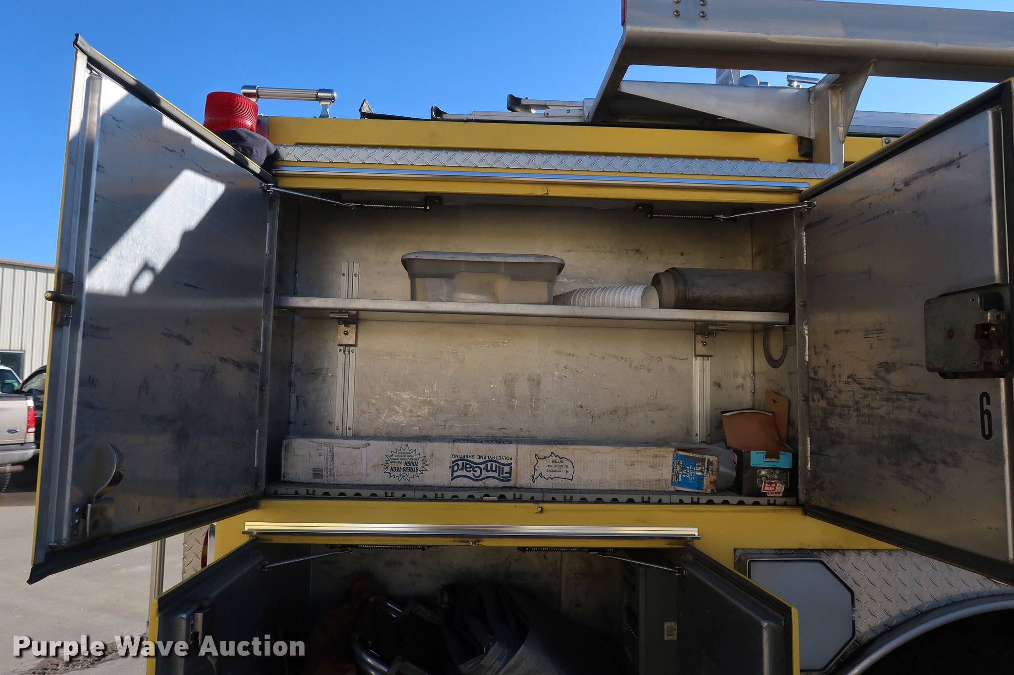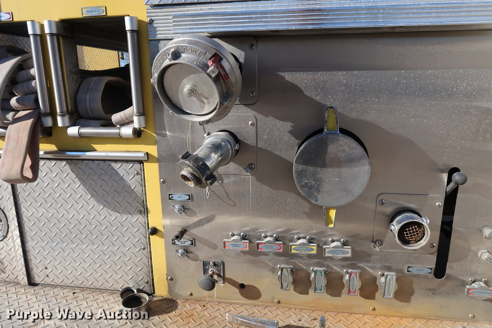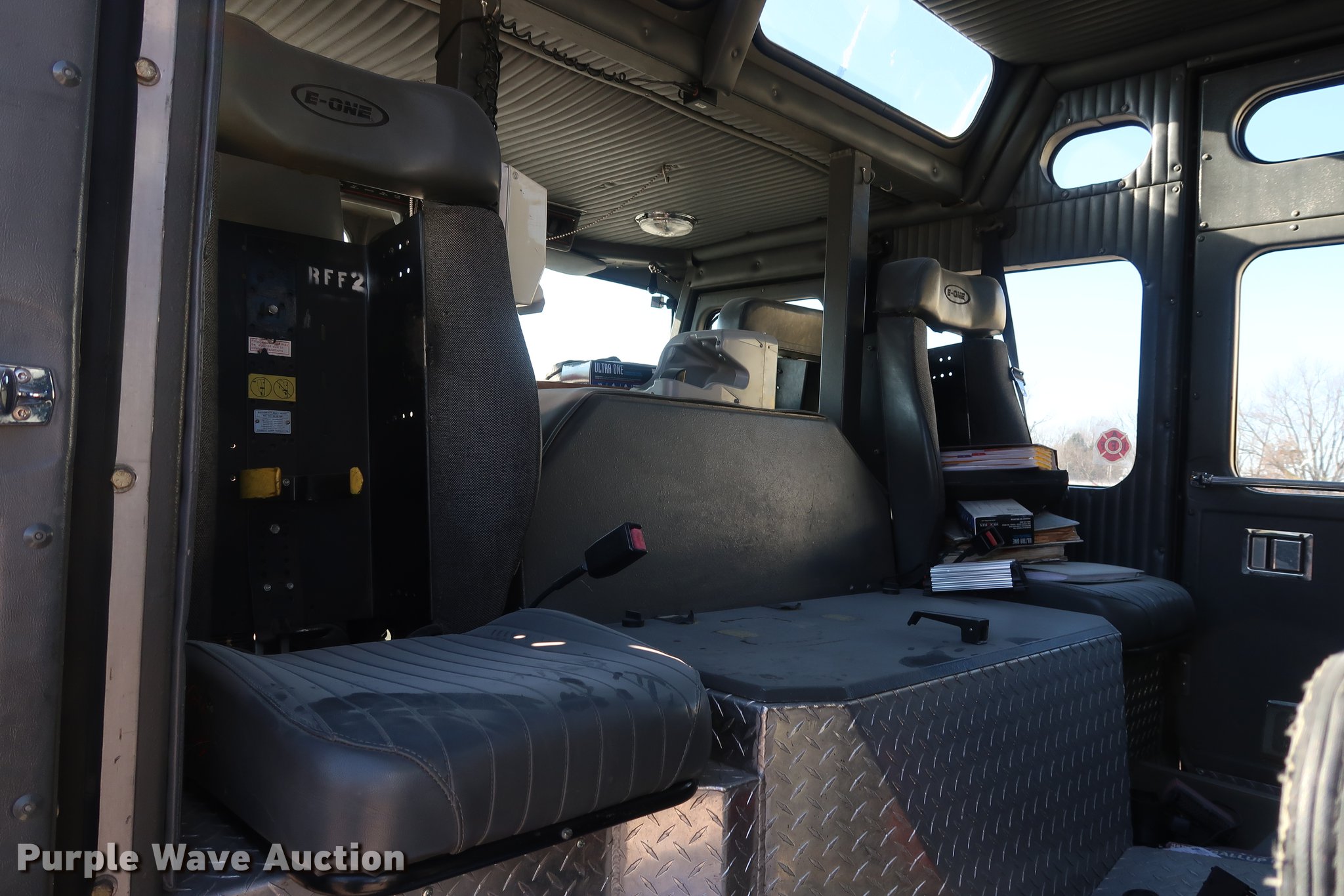 Purple Wave is selling a used Fire Truck or Emergency Vehicle in Missouri. This item is a 1996 Emergency One E-One fire truck with the following: 55,584 miles on odometer, 9,236 hours on meter, Cummins M11 10.8L L6 diesel engine, Automatic transmission, AC and heat, Air suspension seat, PTO, E-One platform, 1,500 gpm pump, E-One fire apparatus, Water gun, Hose, 750 gallon tank, Honda EM5000S generator, 120/240V, Air brakes, 385/65R22.5 front tires, 12R22.5 rear tires, Contents not included