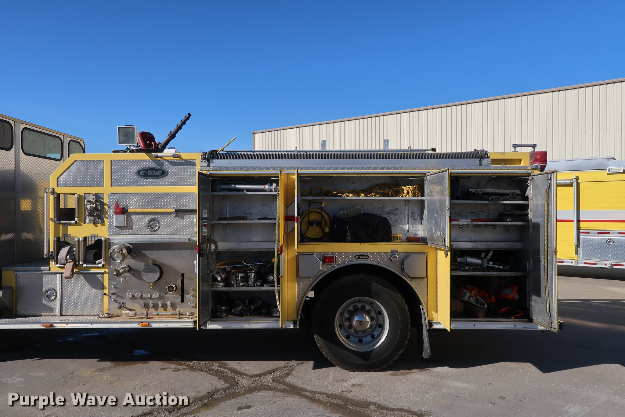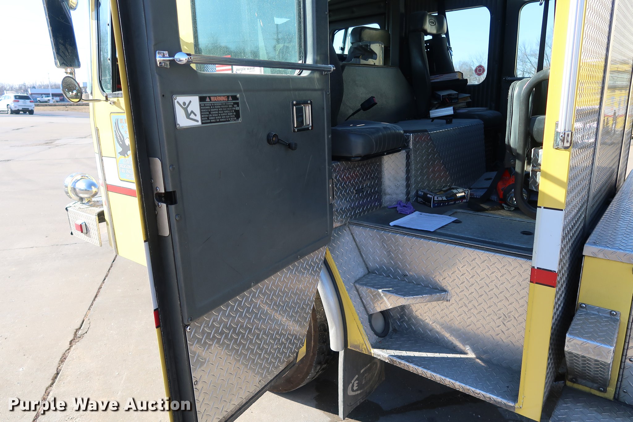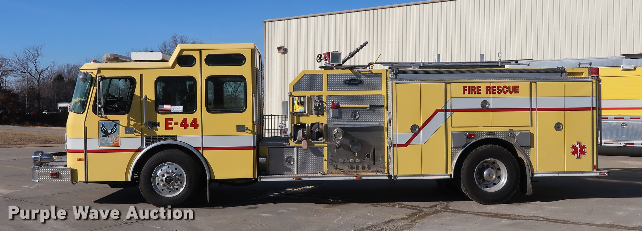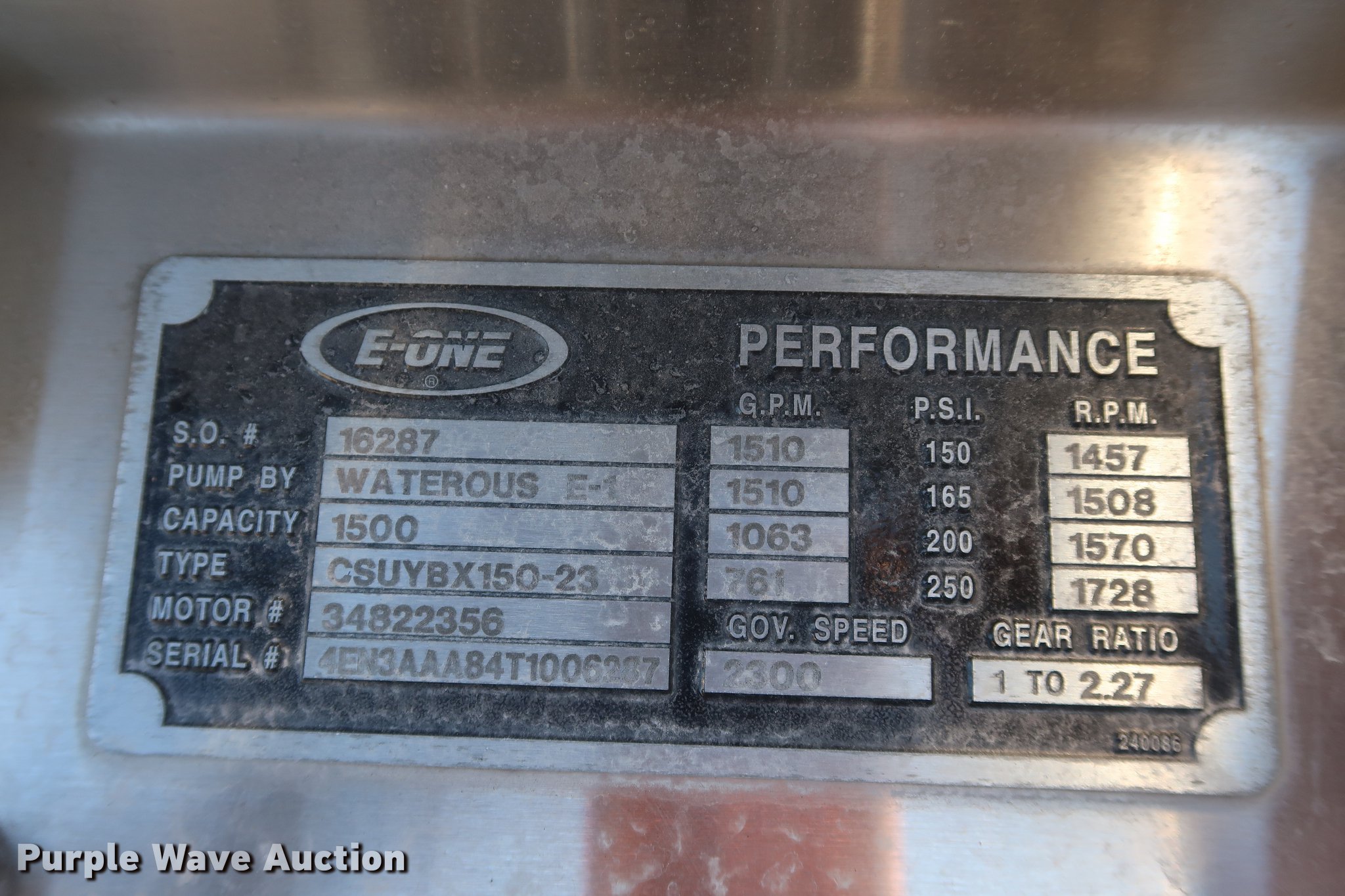 Purple Wave is selling a used Fire Truck or Emergency Vehicle in Missouri. This item is a 1996 Emergency One E-One fire truck with the following: 55,584 miles on odometer, 9,236 hours on meter, Cummins M11 10.8L L6 diesel engine, Automatic transmission, AC and heat, Air suspension seat, PTO, E-One platform, 1,500 gpm pump, E-One fire apparatus, Water gun, Hose, 750 gallon tank, Honda EM5000S generator, 120/240V, Air brakes, 385/65R22.5 front tires, 12R22.5 rear tires, Contents not included