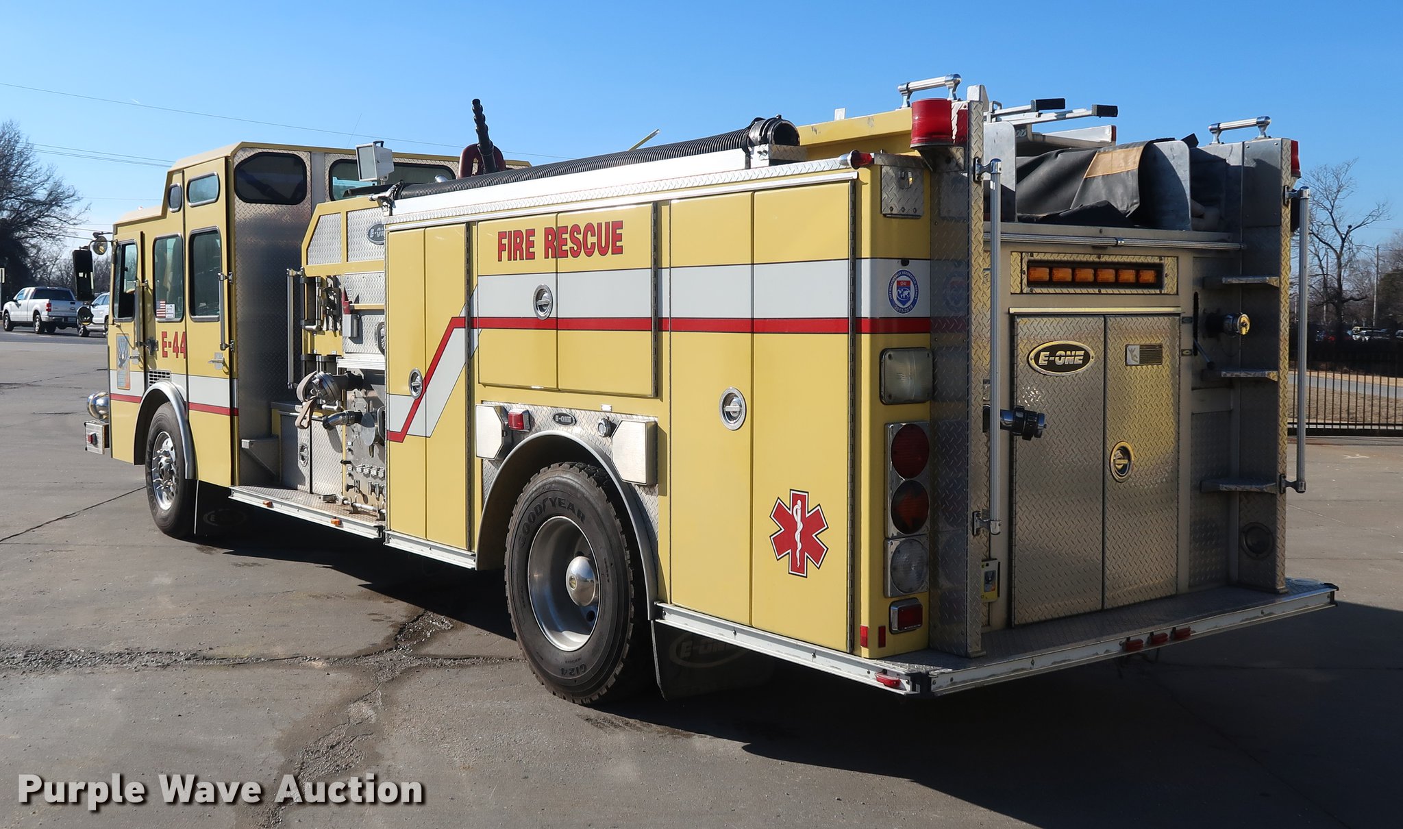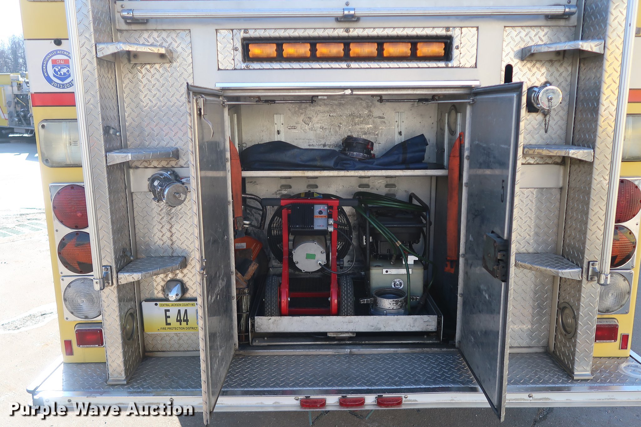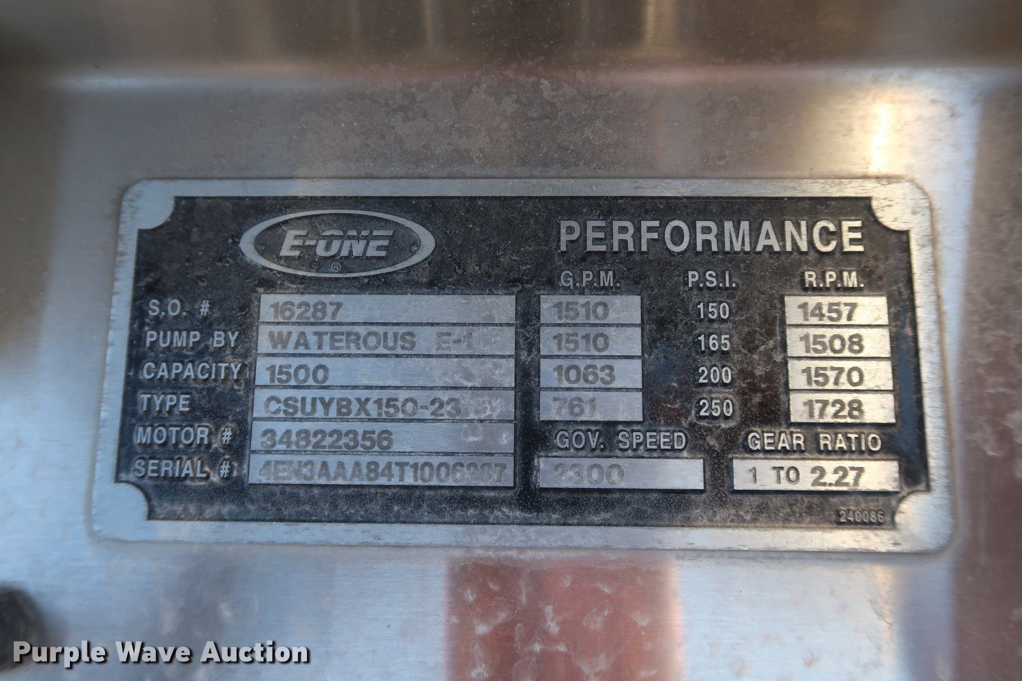 1996 Emergency One E-One fire truck. 55,584 miles on odometer, 9,236 hours on meter, Cummins M11 10.8L L6 diesel engine, Automatic transmission, AC and heat, Air suspension seat, PTO, E-One platform 1,500 gpm pump , E-One fire apparatus Water gun, Hose, 750 gallon tank, Honda EM5000S generator 120/240V, Air brakes, 385/65R22.5 front tires, 12R22.5 rear tires, Contents not included. Missouri title. 4EN3AAA84T1006287. Central Jackson County Fire Protection. 805 NE Jefferson St. Blue Springs, MO 64014