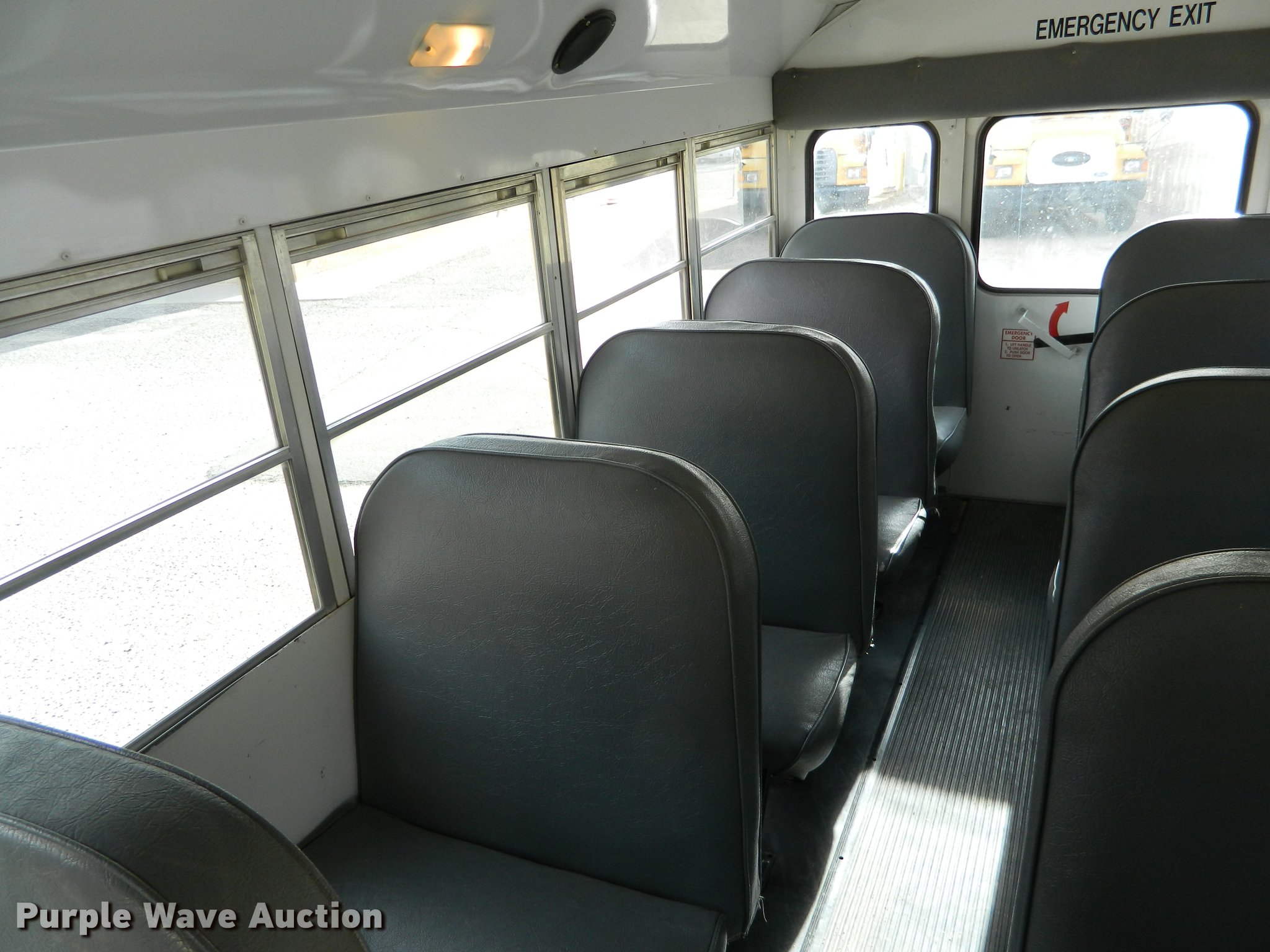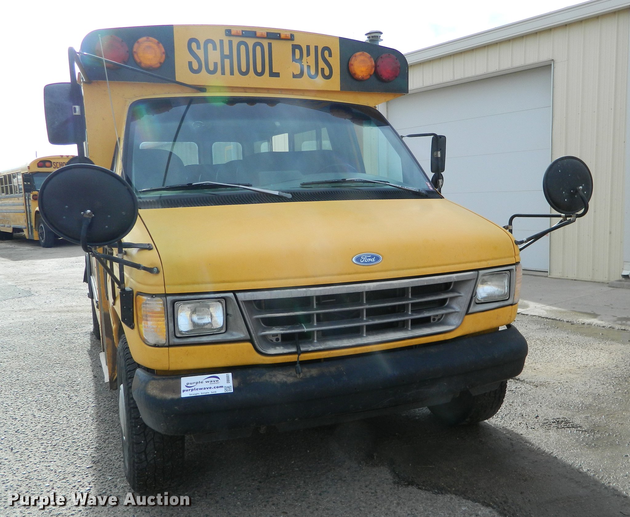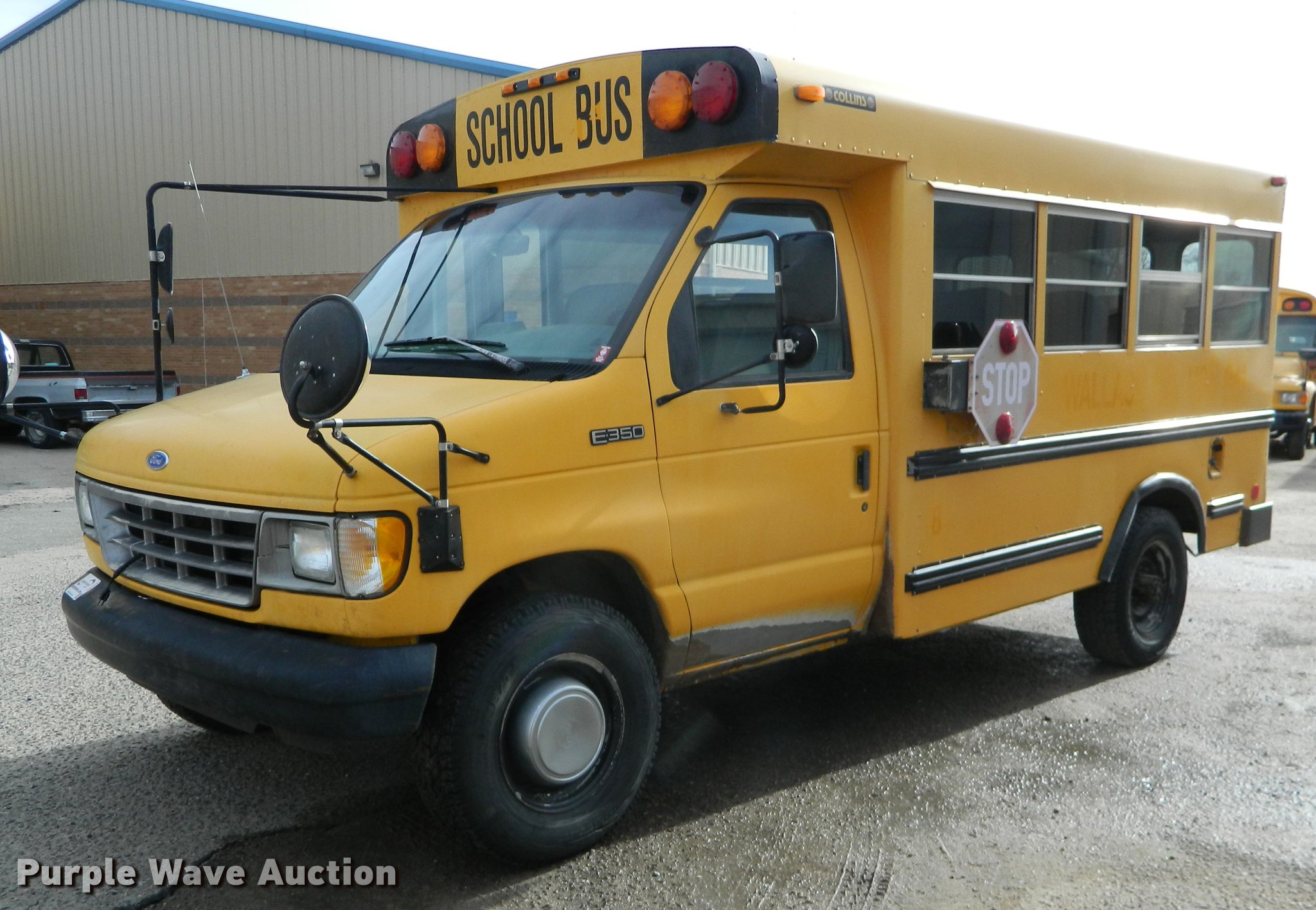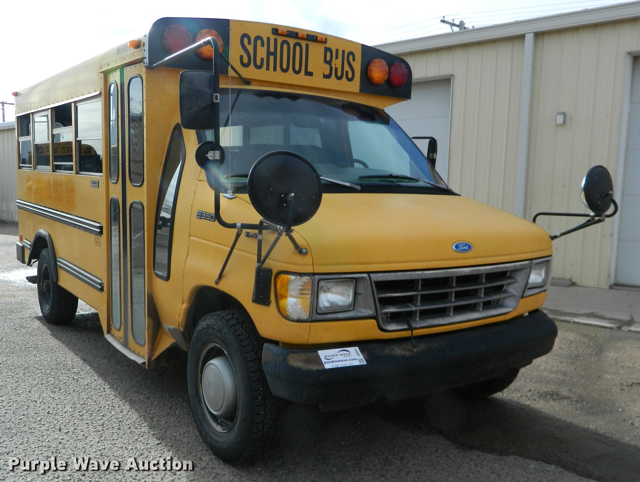 Purple Wave is selling a used Bus in Kansas. This item is a 1994 Ford E350 school bus with the following: 182,783 miles on odometer, 7.3L V8 OHV 16V turbo diesel engine, Automatic Transmission, Single axle, AC and heat, AM/FM/Cassette, Suspension seat, 20 passenger capacity, Ceiling and rear emergency exits, Lighted stop sign, Front tow hooks, Hydraulic suspension, Hydraulic brakes, 245/75R16 tires, GVWR 9,600 lbs, Unit# 8