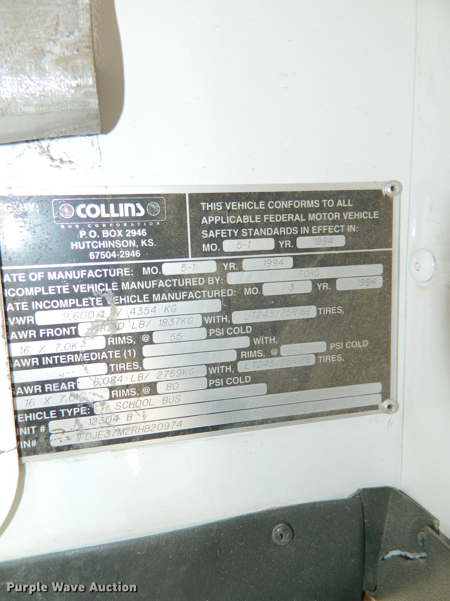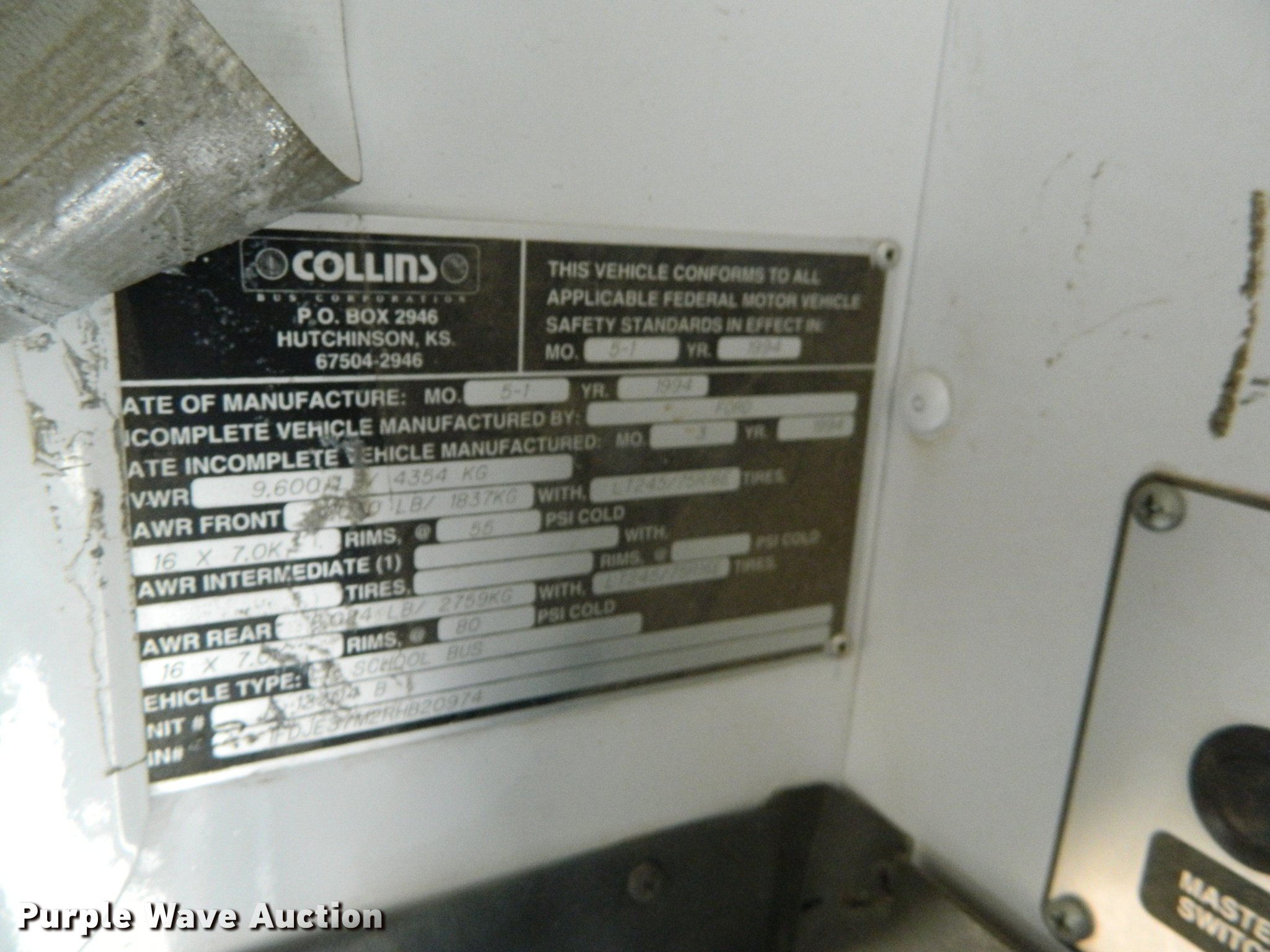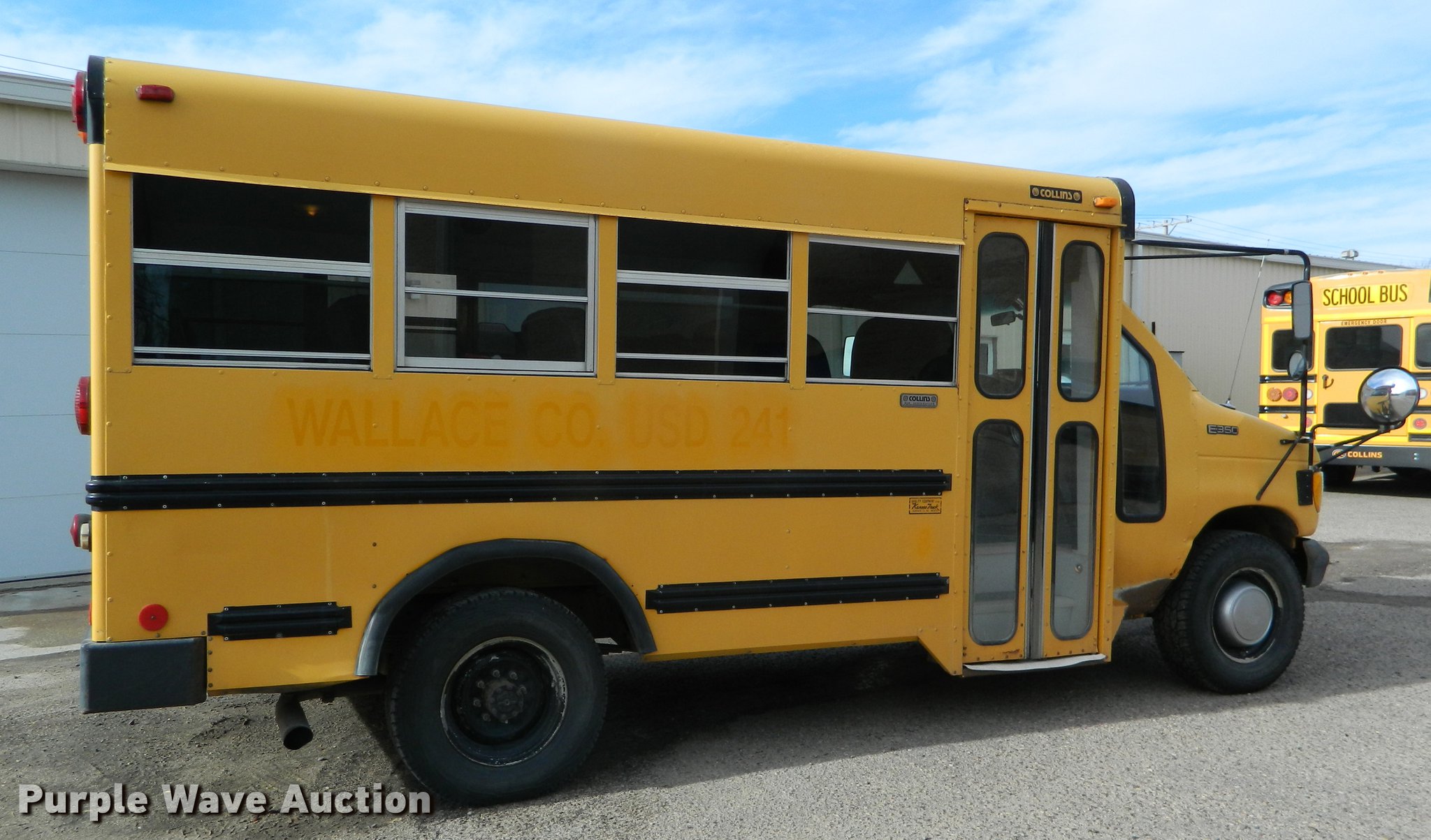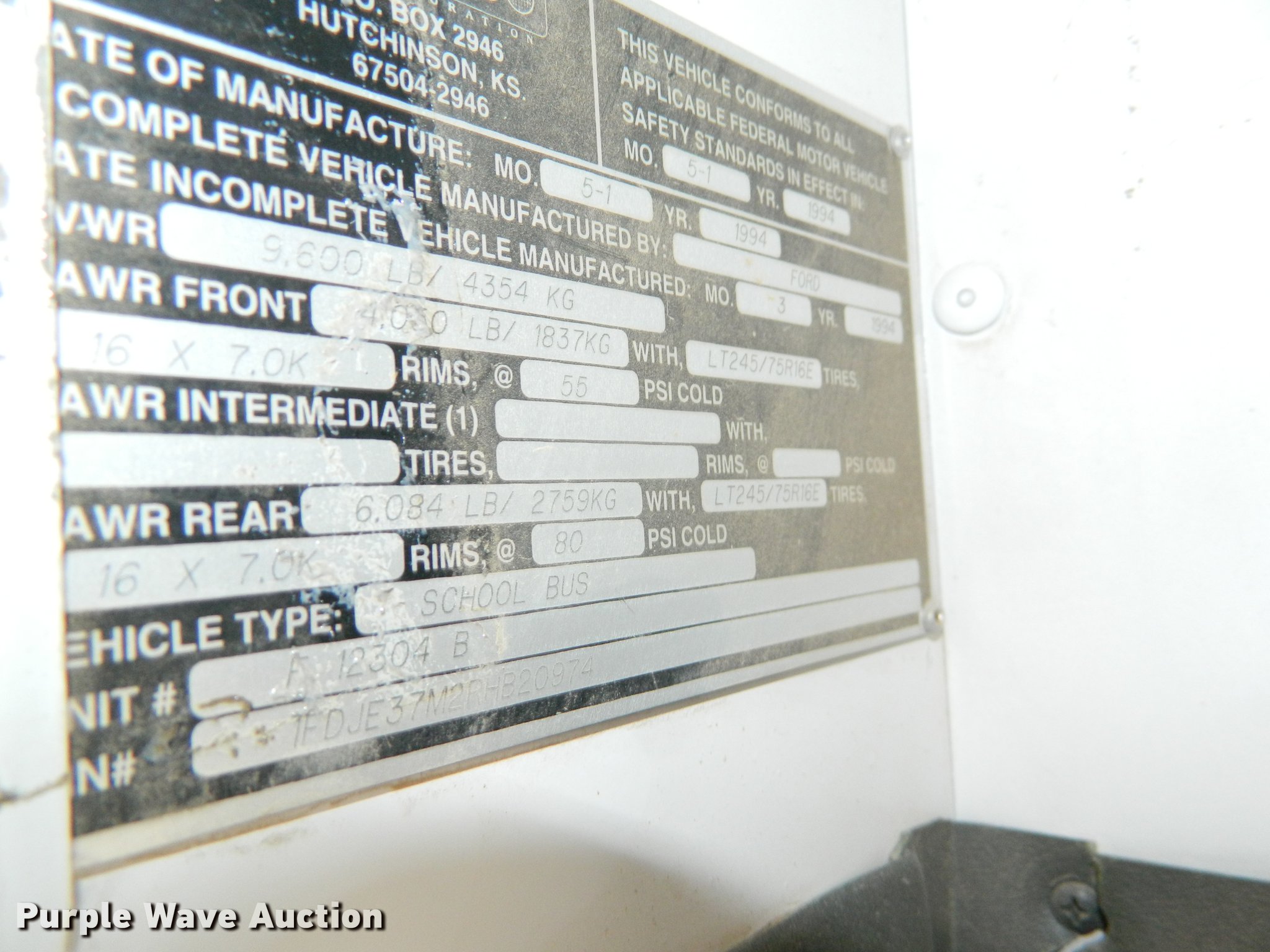 Purple Wave is selling a used Bus in Kansas. This item is a 1994 Ford E350 school bus with the following: 182,783 miles on odometer, 7.3L V8 OHV 16V turbo diesel engine, Automatic Transmission, Single axle, AC and heat, AM/FM/Cassette, Suspension seat, 20 passenger capacity, Ceiling and rear emergency exits, Lighted stop sign, Front tow hooks, Hydraulic suspension, Hydraulic brakes, 245/75R16 tires, GVWR 9,600 lbs, Unit# 8