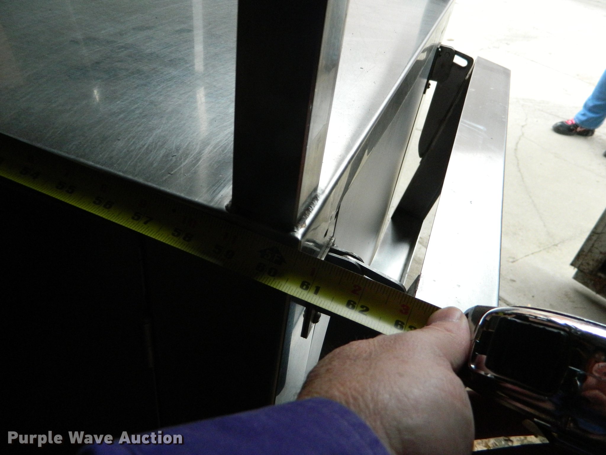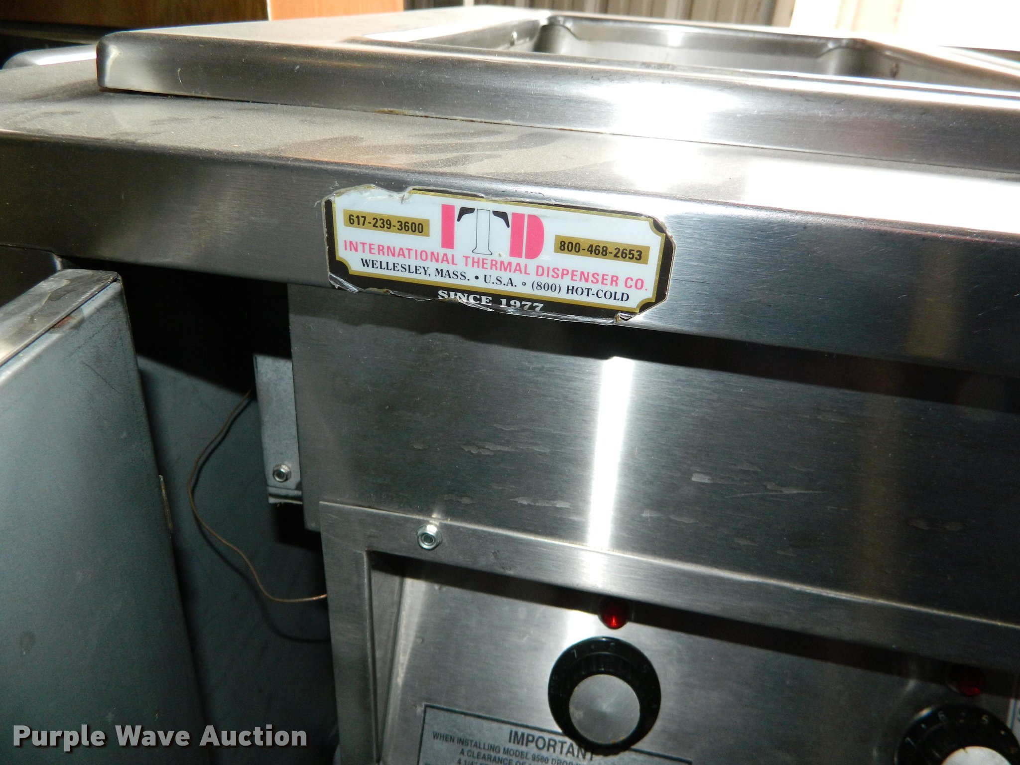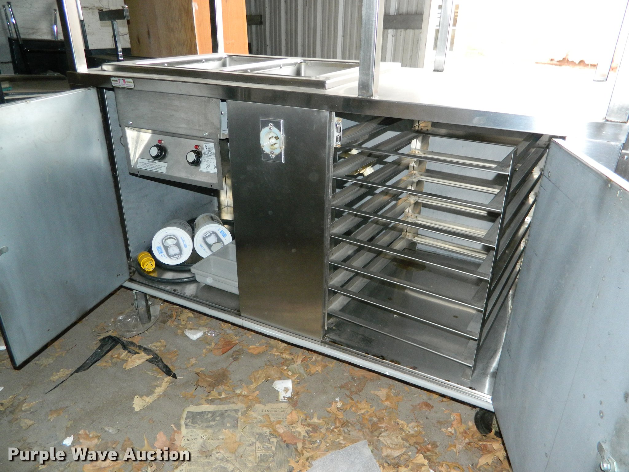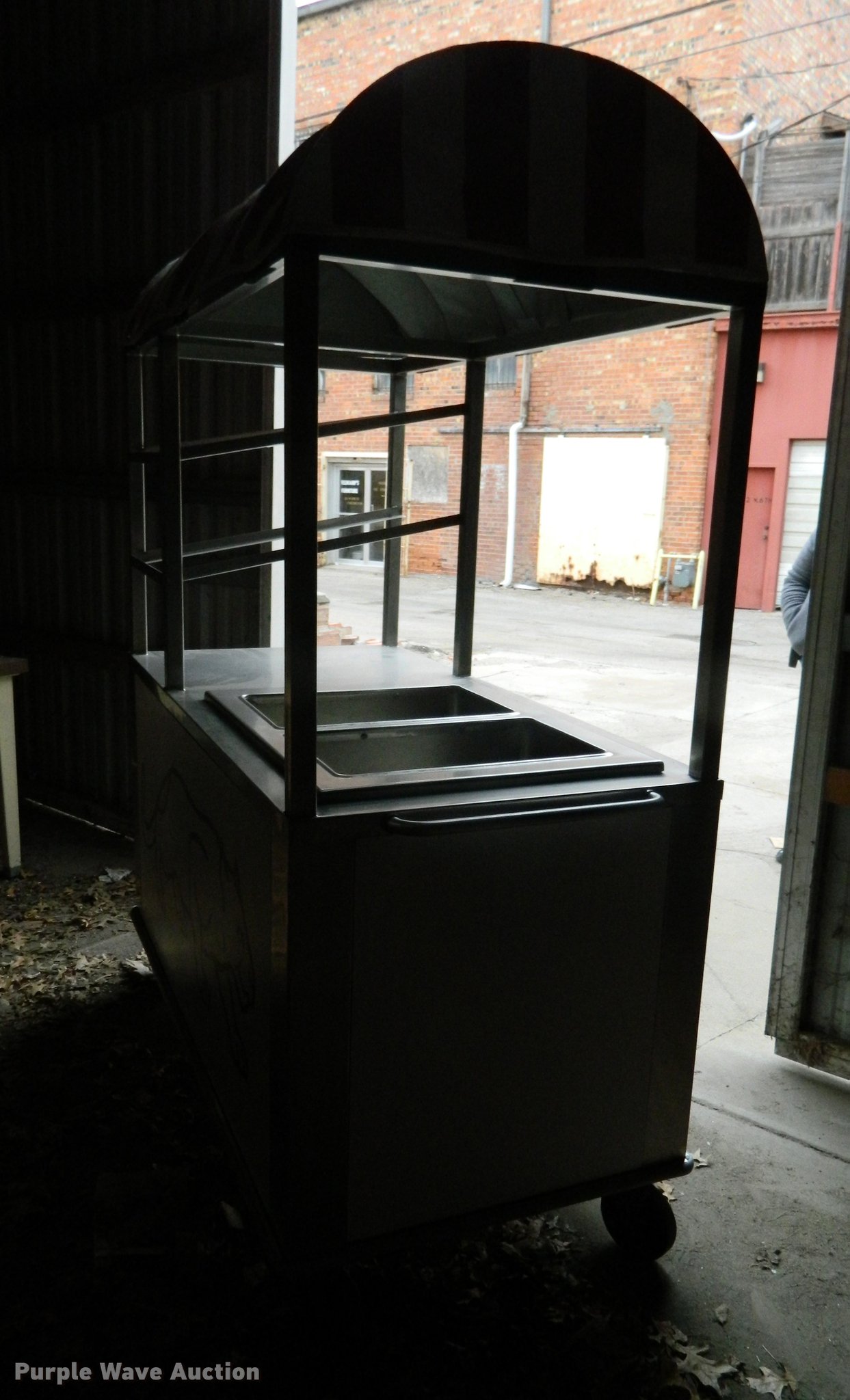 Purple Wave is selling a used Restaurant Equip. in Kansas. This item is a International Dispenser Co. stainless steel concession cart with the following: 30.5" x 60" x 69"H, 14" shelf, Randell 9560-3 warming unit, 220V