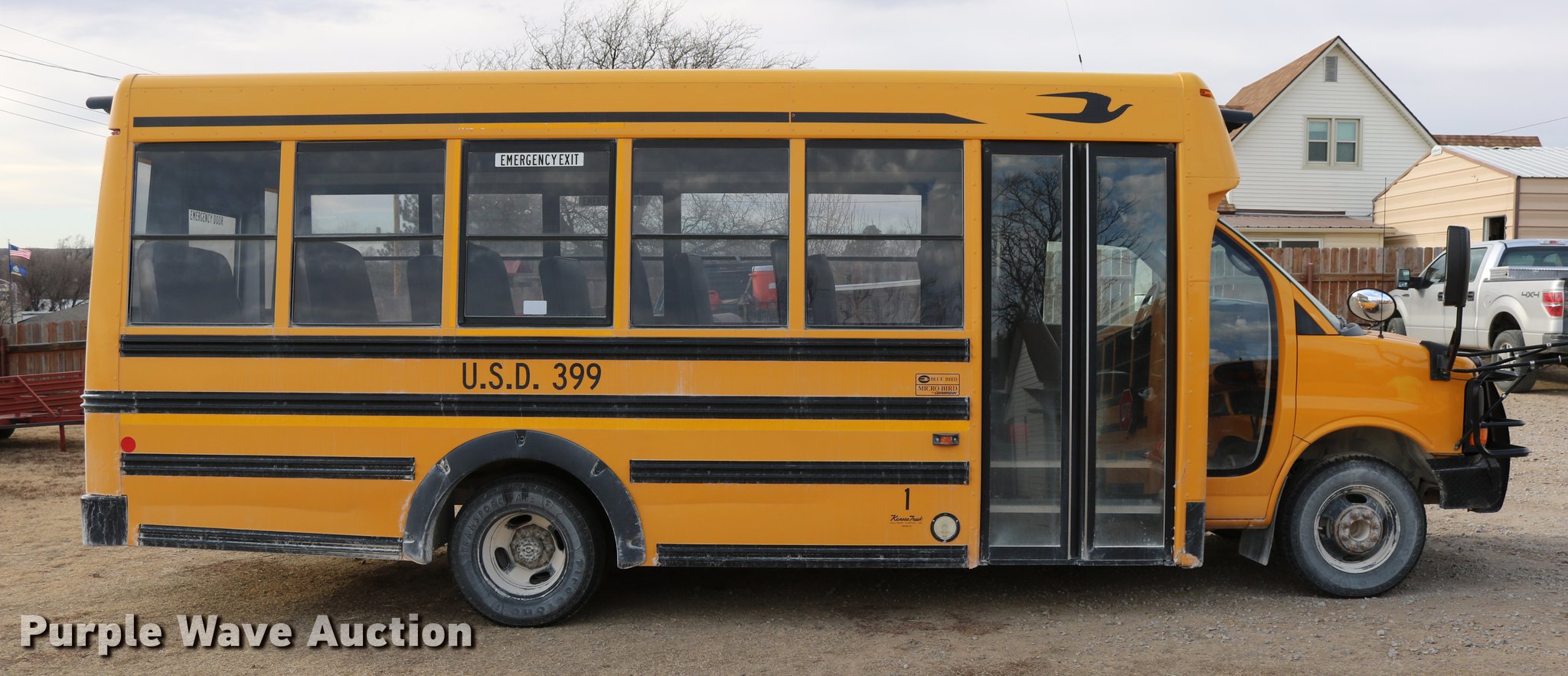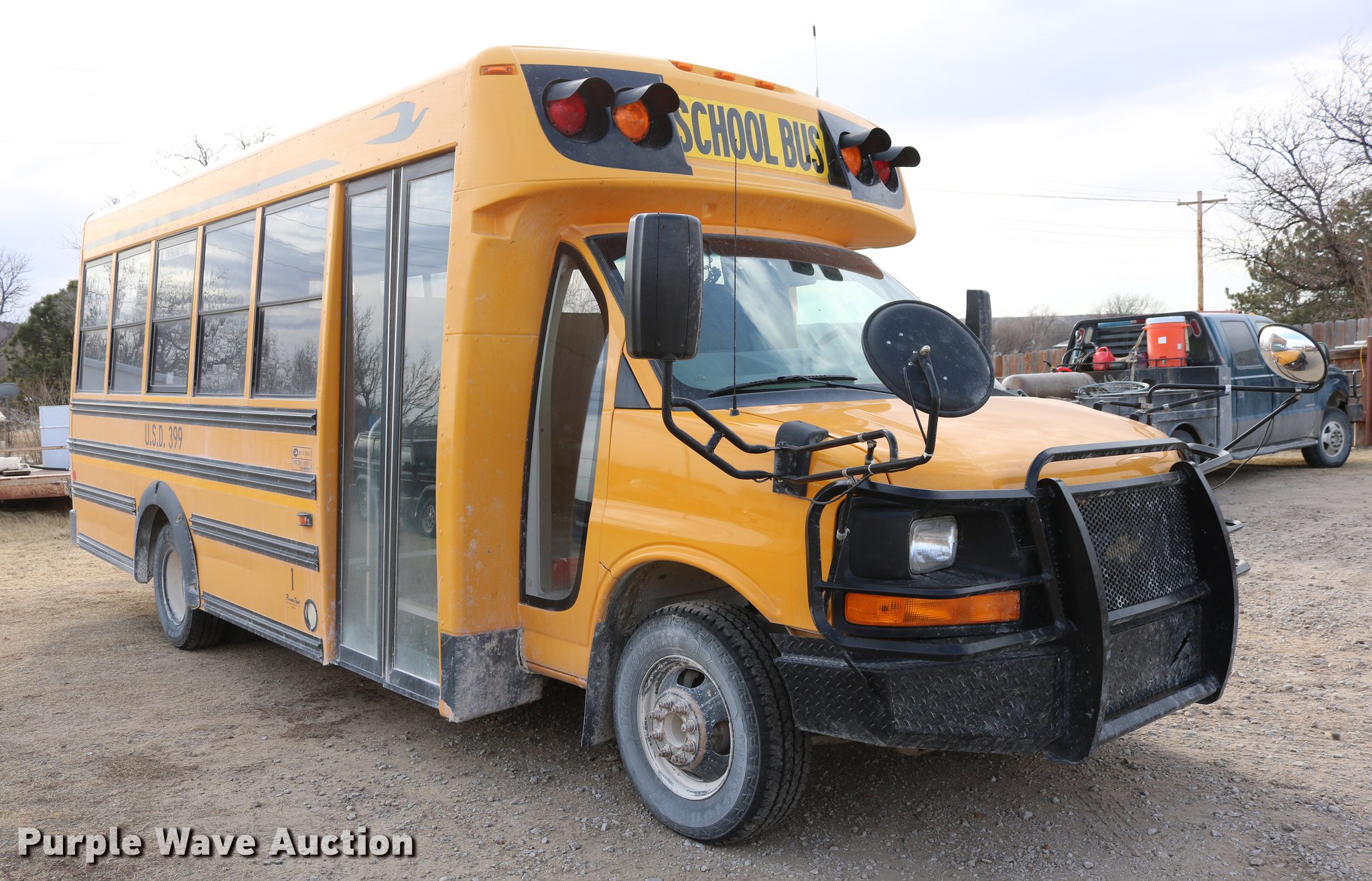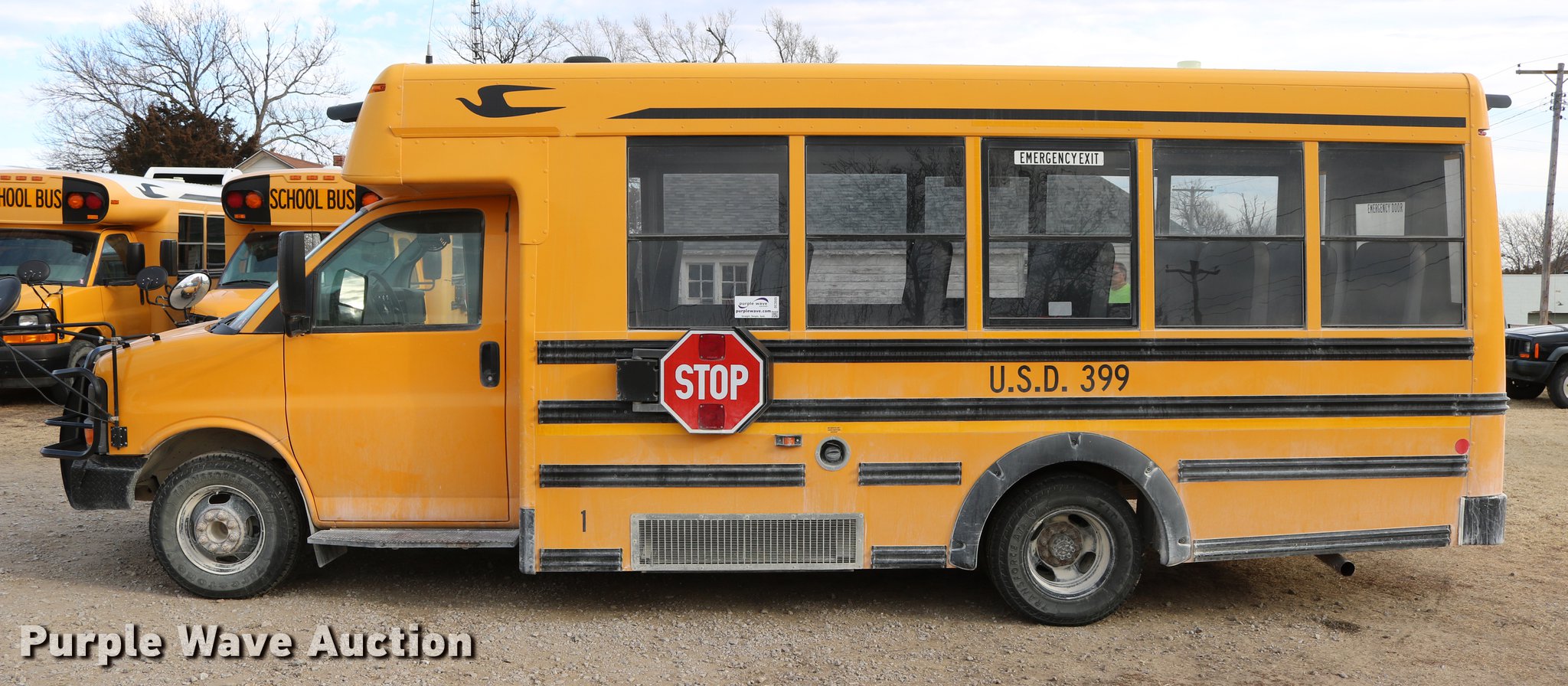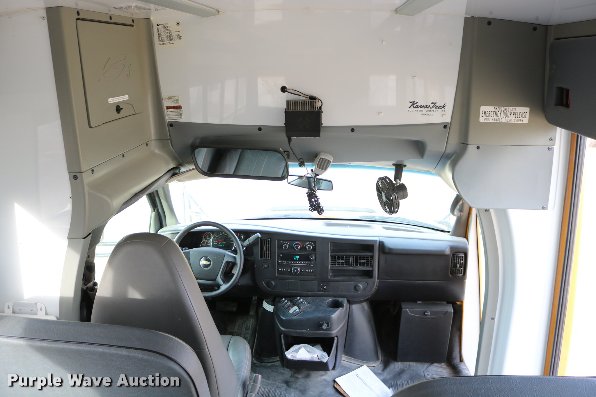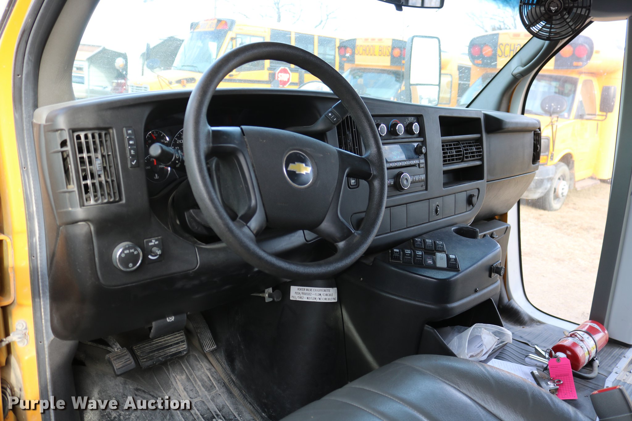 Purple Wave is selling a used Bus in Kansas. This item is a 2010 Chevrolet Express G3500 Micro Bird school bus with the following: 119,996 miles on odometer, 6.0L V8 OHV 16V FFV gas engine, Automatic transmission, Single axle, AC and heat, AM/FM/CD, Heated mirrors, Auxiliary controls, Electric entrance door, 29 passenger capacity, Ceiling, rear, and side emergency exits, Emergency door alarms, Beacon light, Lighted stop sign, Acc Cumate Control 23046B013A roof AC unit, Non-operational, Backup alarm, Rear tow hooks, Spring suspension, Hydraulic brakes, 150" wheelbase, Firestone 225/75R16 tires, GVWR 12,300 lbs, Two-way radio not included, Grill guard not included, will be replaced with factory bumper