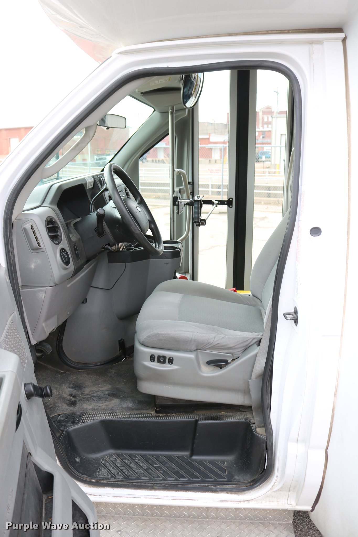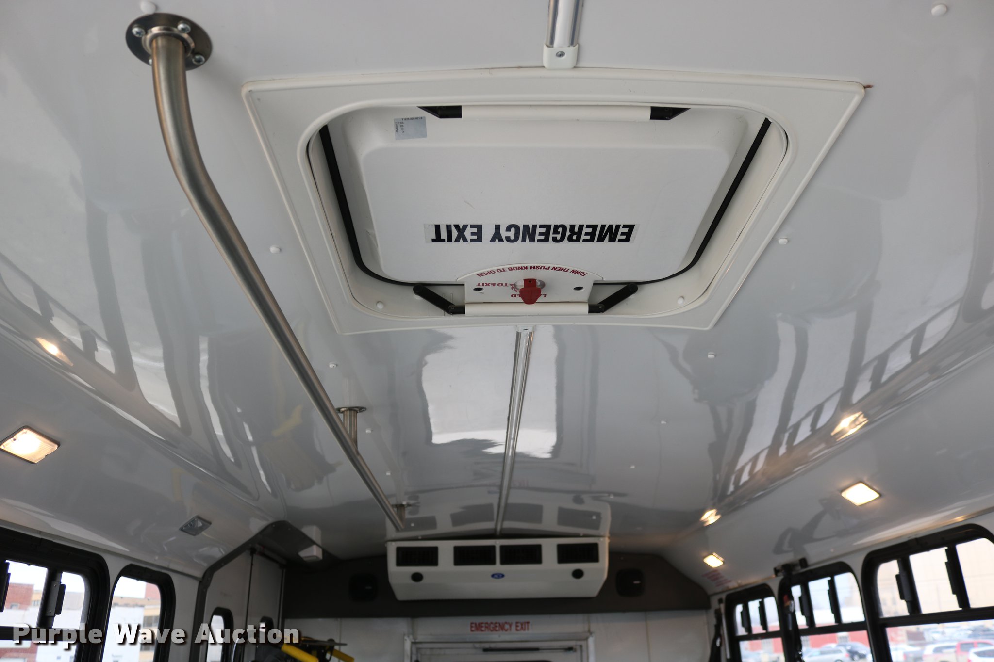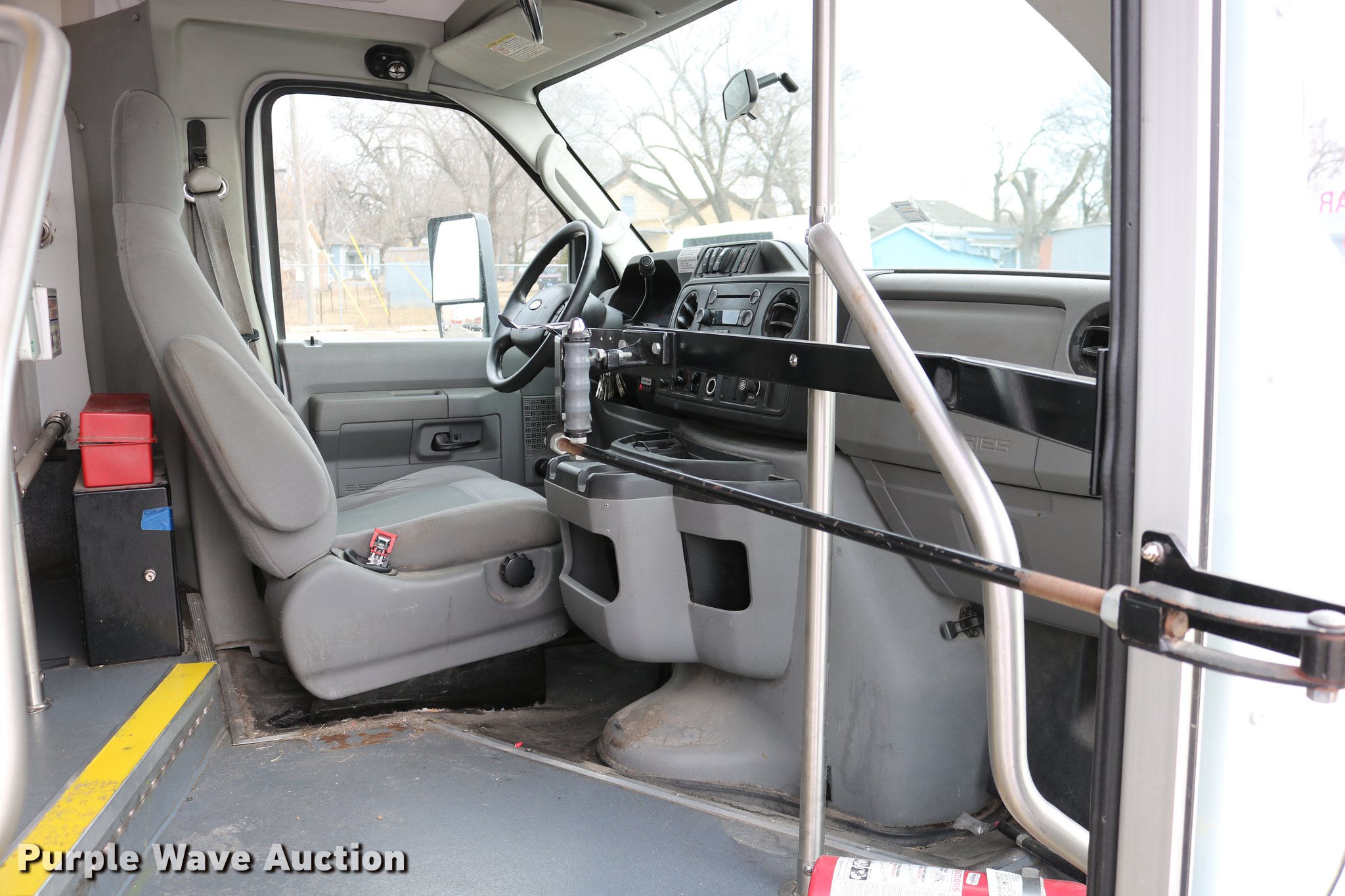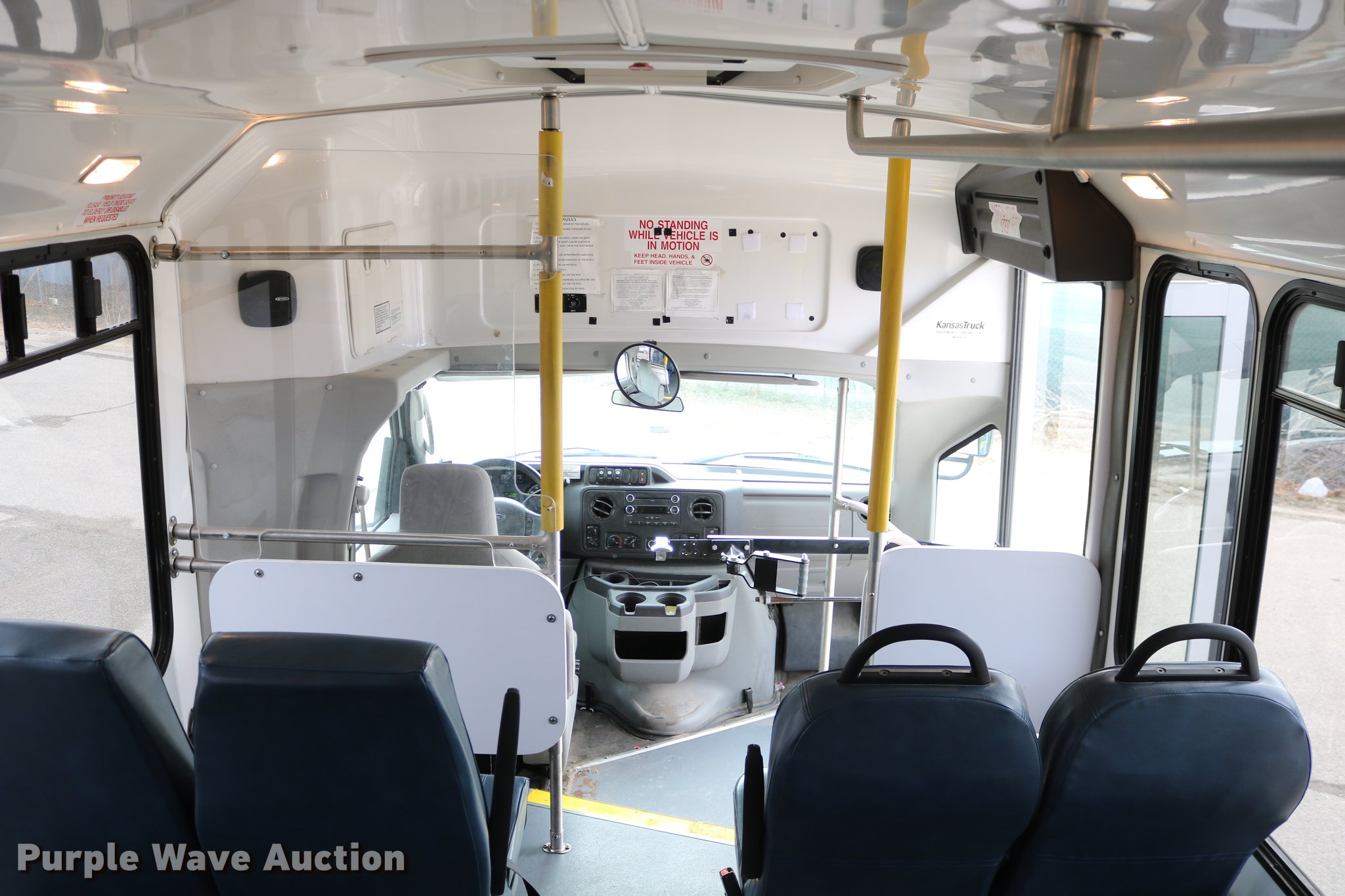 Purple Wave is selling a used Bus in Kansas. This item is a 2012 Ford E450 shuttle bus with the following: 146,428 miles on odometer, 6.8L V10 SOHC 20V gas engine, Automatic transmission, Single axle, AC and heat, AM/FM/CD, 15 passenger capacity, Braun Corp. NL919F1B-2 wheel chair lift, Serial DA-07921, (2) wheel chair tie down areas, Ceiling handrail, Ceiling, rear, and side emergency exits, Emergency door alarms, ACT E2-5 AC roof unit, Backup alarm, 158" wheelbase, Spring suspension, Hydraulic brakes, 225/75R16 tires, GVWR 14,500 lbs