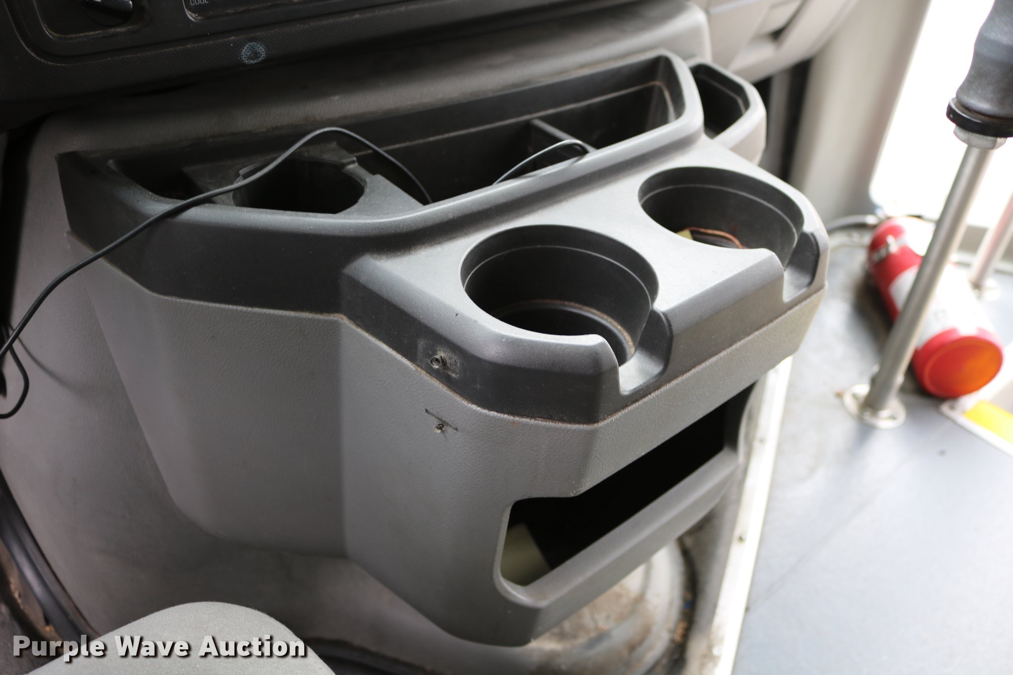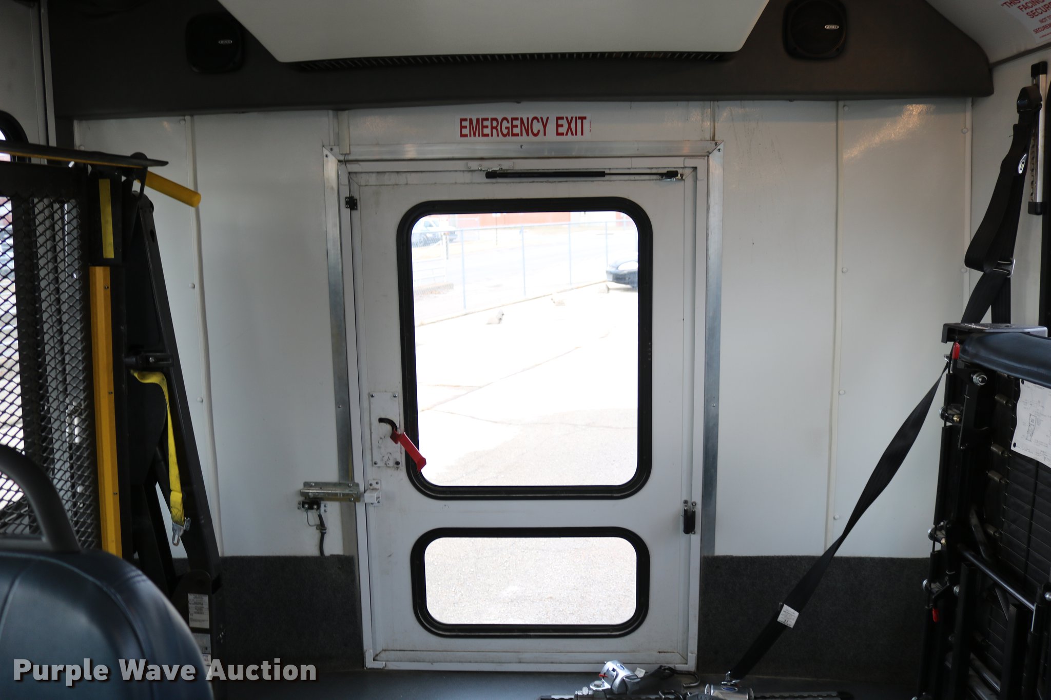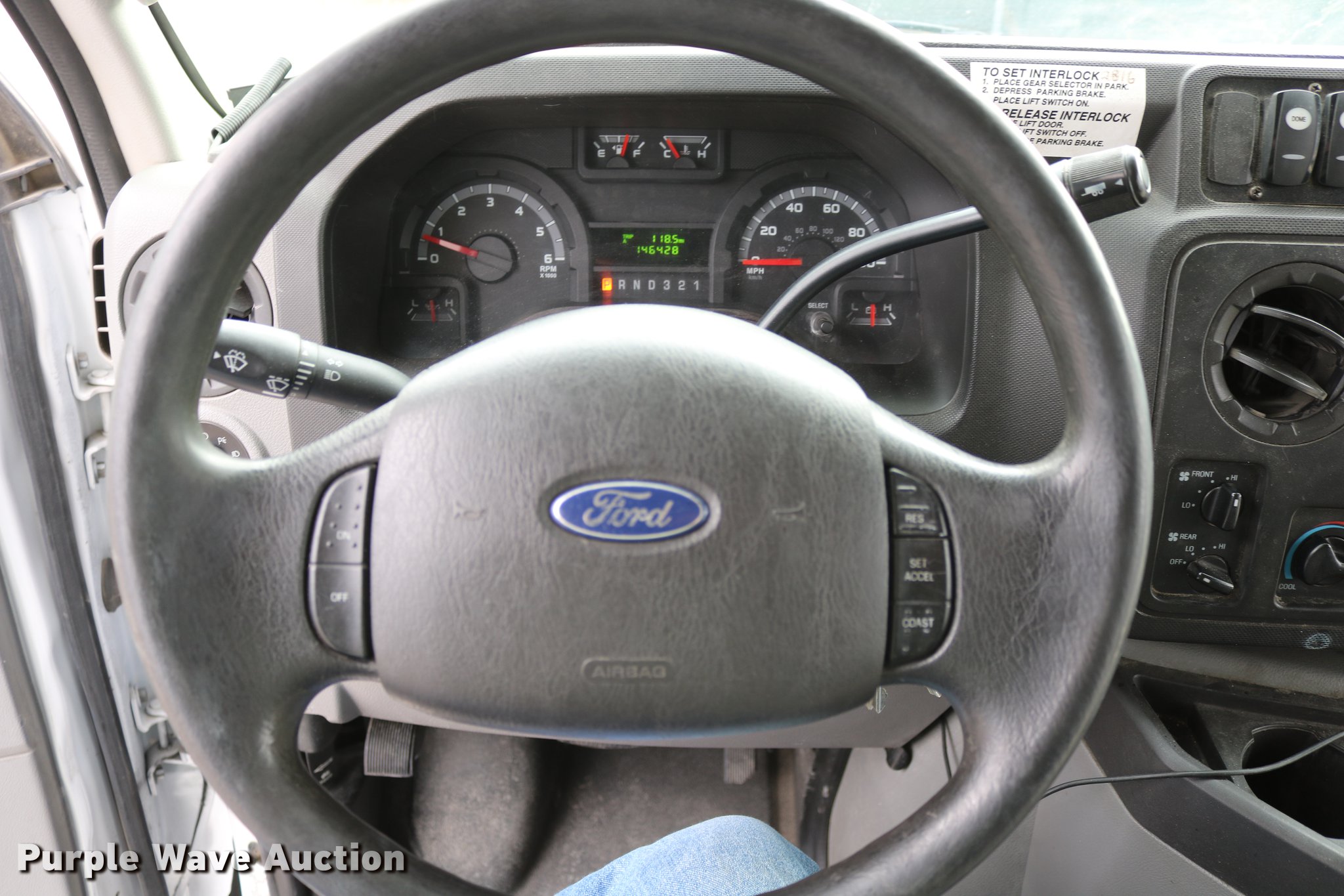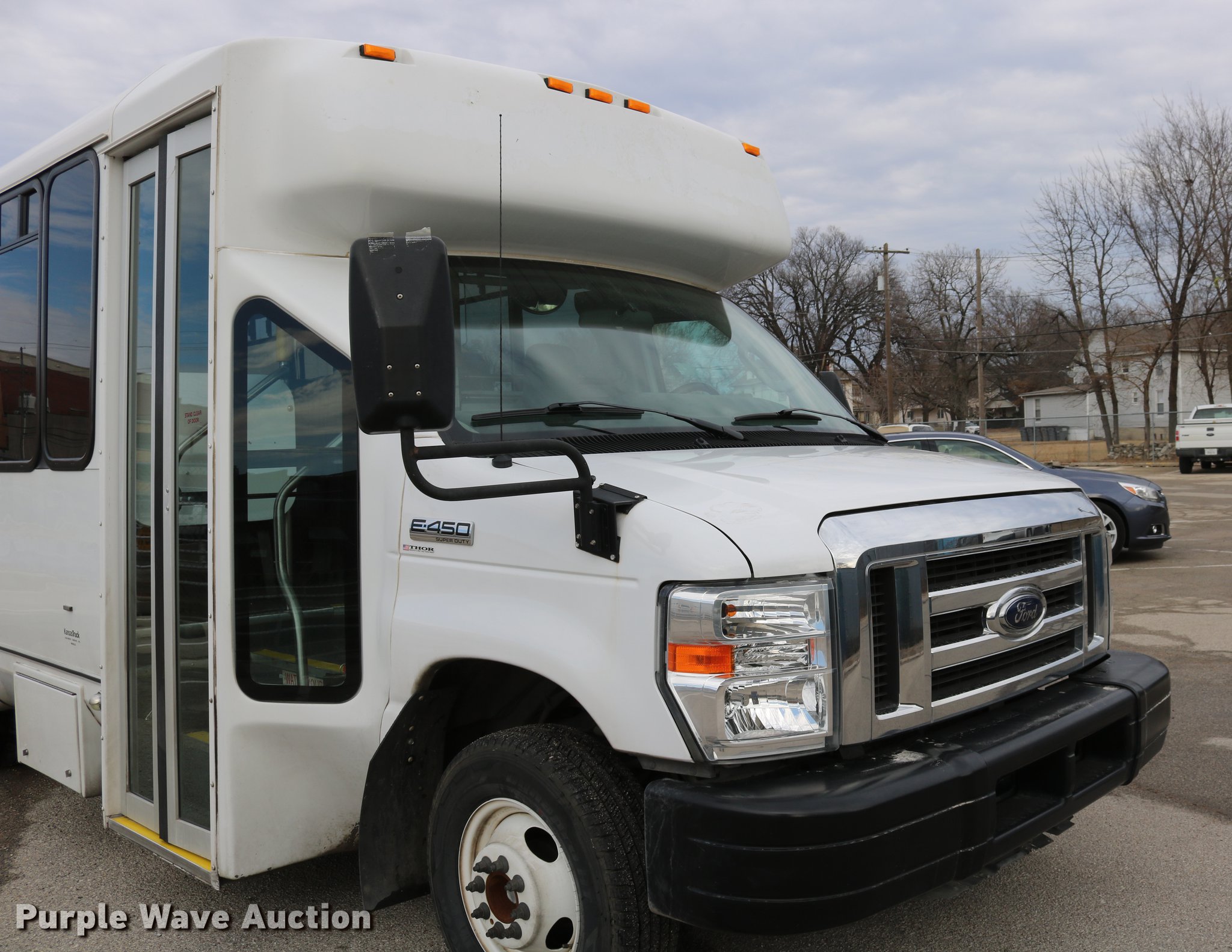 Purple Wave is selling a used Bus in Kansas. This item is a 2012 Ford E450 shuttle bus with the following: 146,428 miles on odometer, 6.8L V10 SOHC 20V gas engine, Automatic transmission, Single axle, AC and heat, AM/FM/CD, 15 passenger capacity, Braun Corp. NL919F1B-2 wheel chair lift, Serial DA-07921, (2) wheel chair tie down areas, Ceiling handrail, Ceiling, rear, and side emergency exits, Emergency door alarms, ACT E2-5 AC roof unit, Backup alarm, 158" wheelbase, Spring suspension, Hydraulic brakes, 225/75R16 tires, GVWR 14,500 lbs