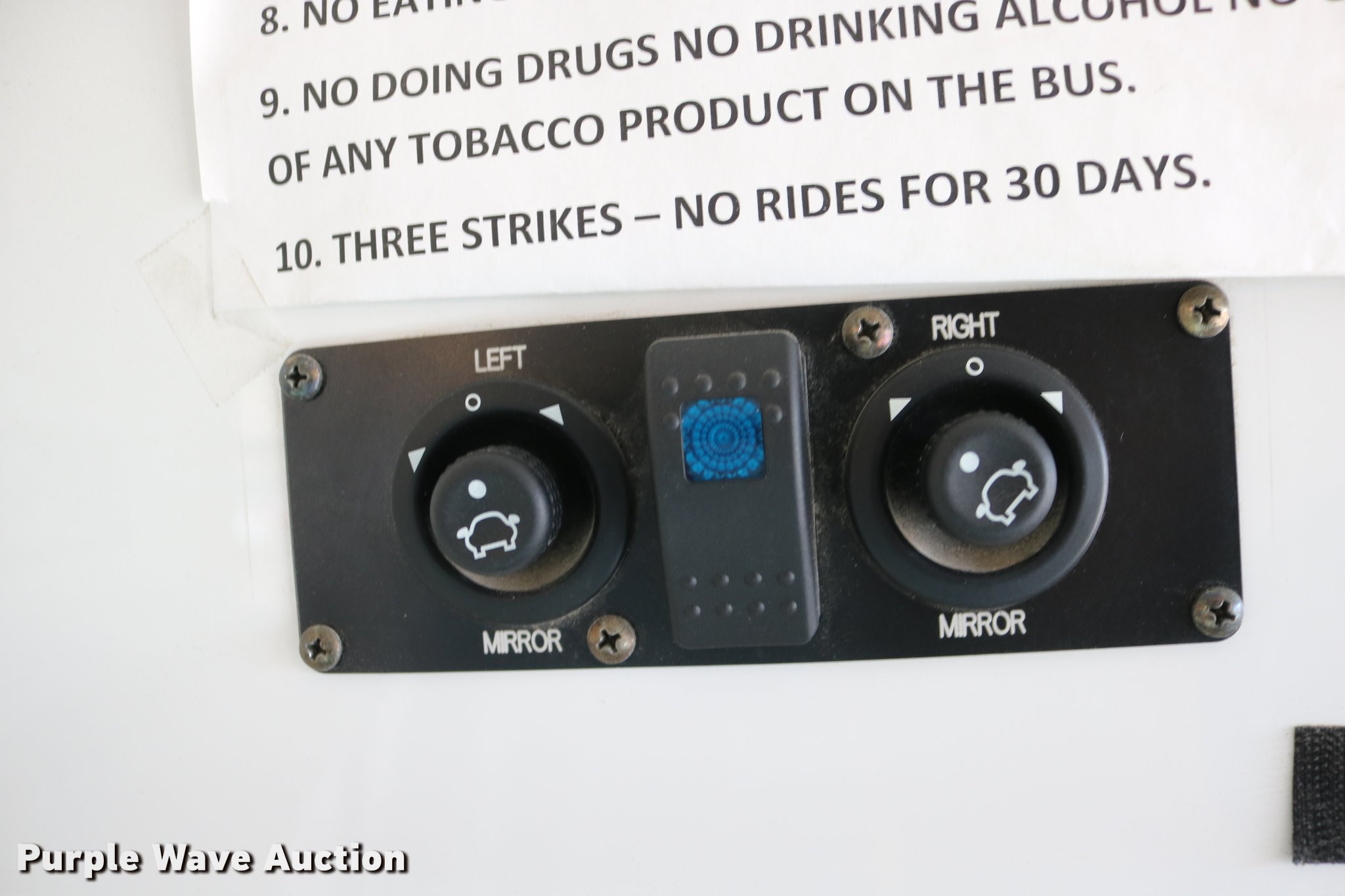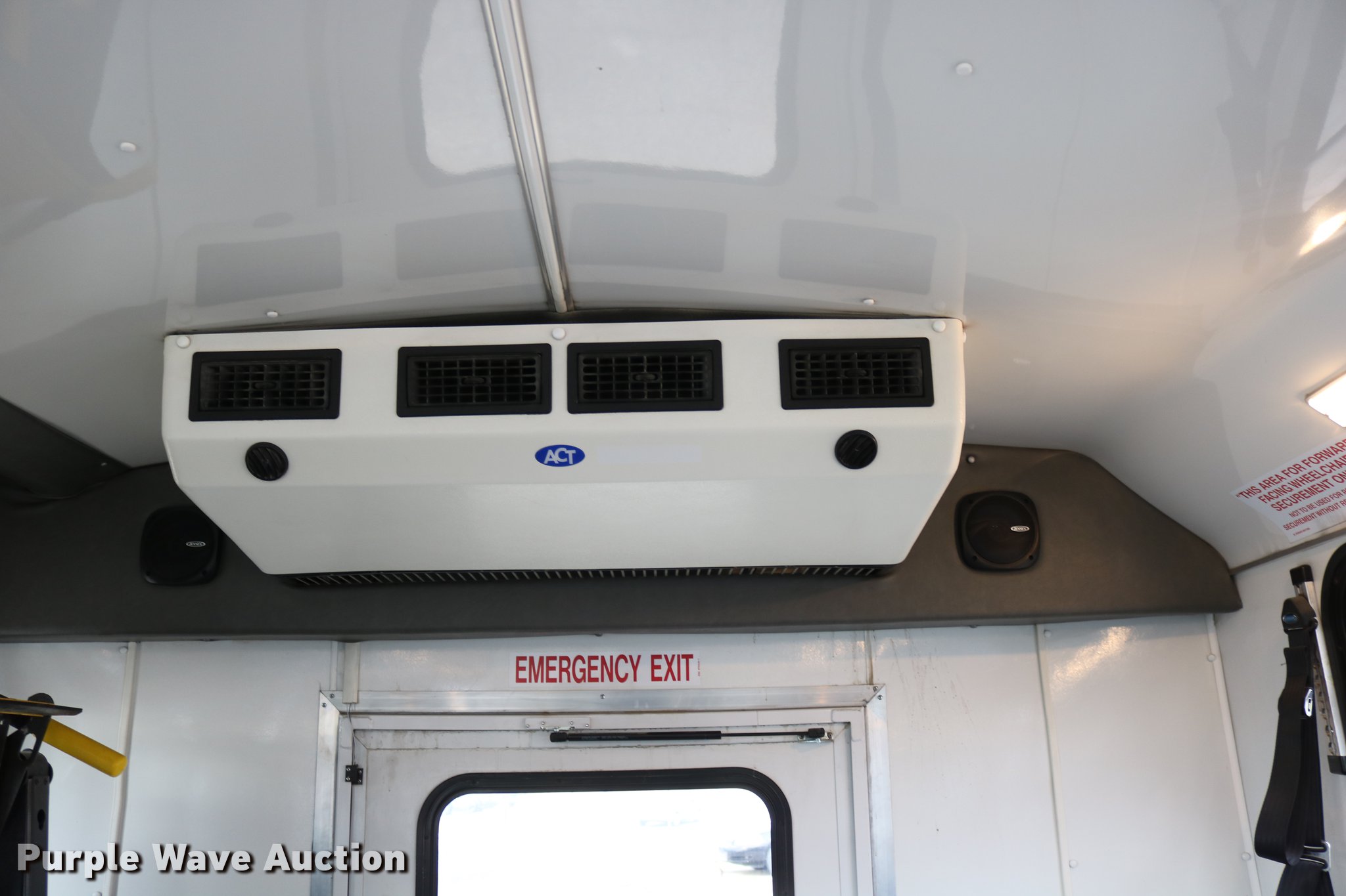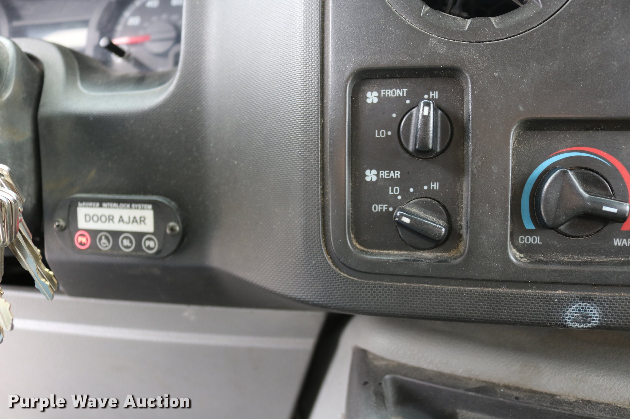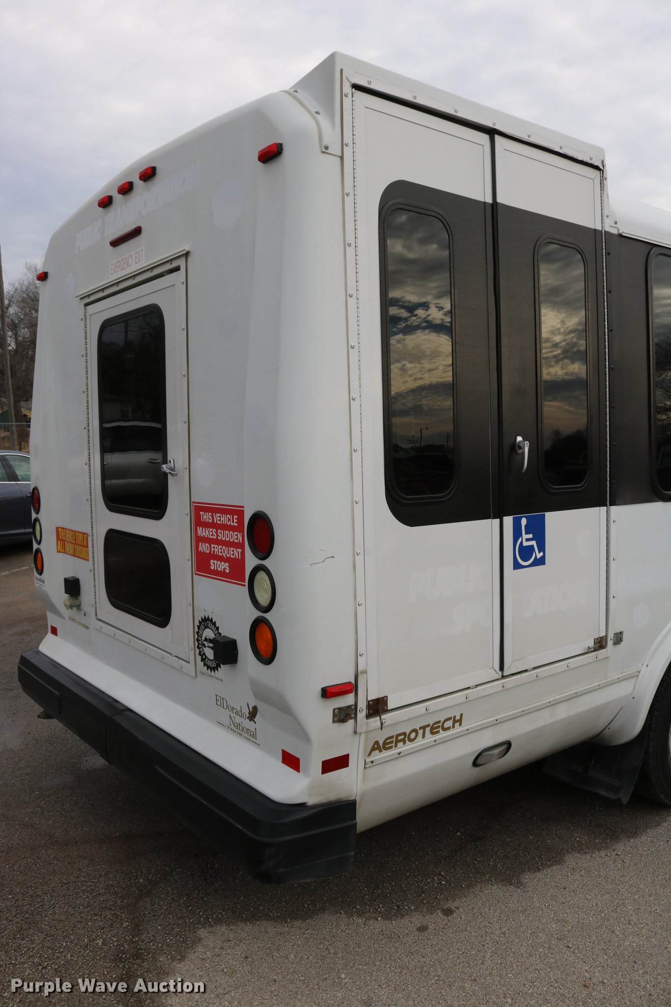 Purple Wave is selling a used Bus in Kansas. This item is a 2012 Ford E450 shuttle bus with the following: 146,428 miles on odometer, 6.8L V10 SOHC 20V gas engine, Automatic transmission, Single axle, AC and heat, AM/FM/CD, 15 passenger capacity, Braun Corp. NL919F1B-2 wheel chair lift, Serial DA-07921, (2) wheel chair tie down areas, Ceiling handrail, Ceiling, rear, and side emergency exits, Emergency door alarms, ACT E2-5 AC roof unit, Backup alarm, 158" wheelbase, Spring suspension, Hydraulic brakes, 225/75R16 tires, GVWR 14,500 lbs