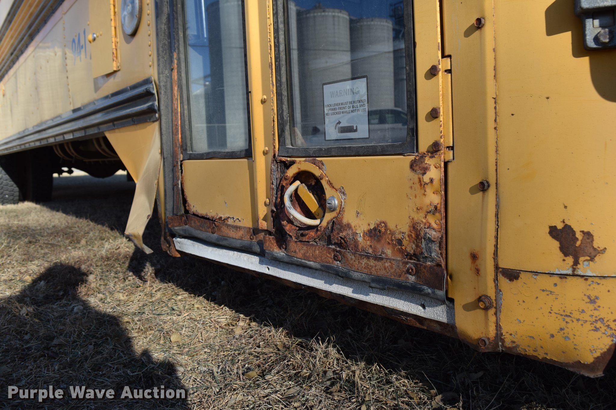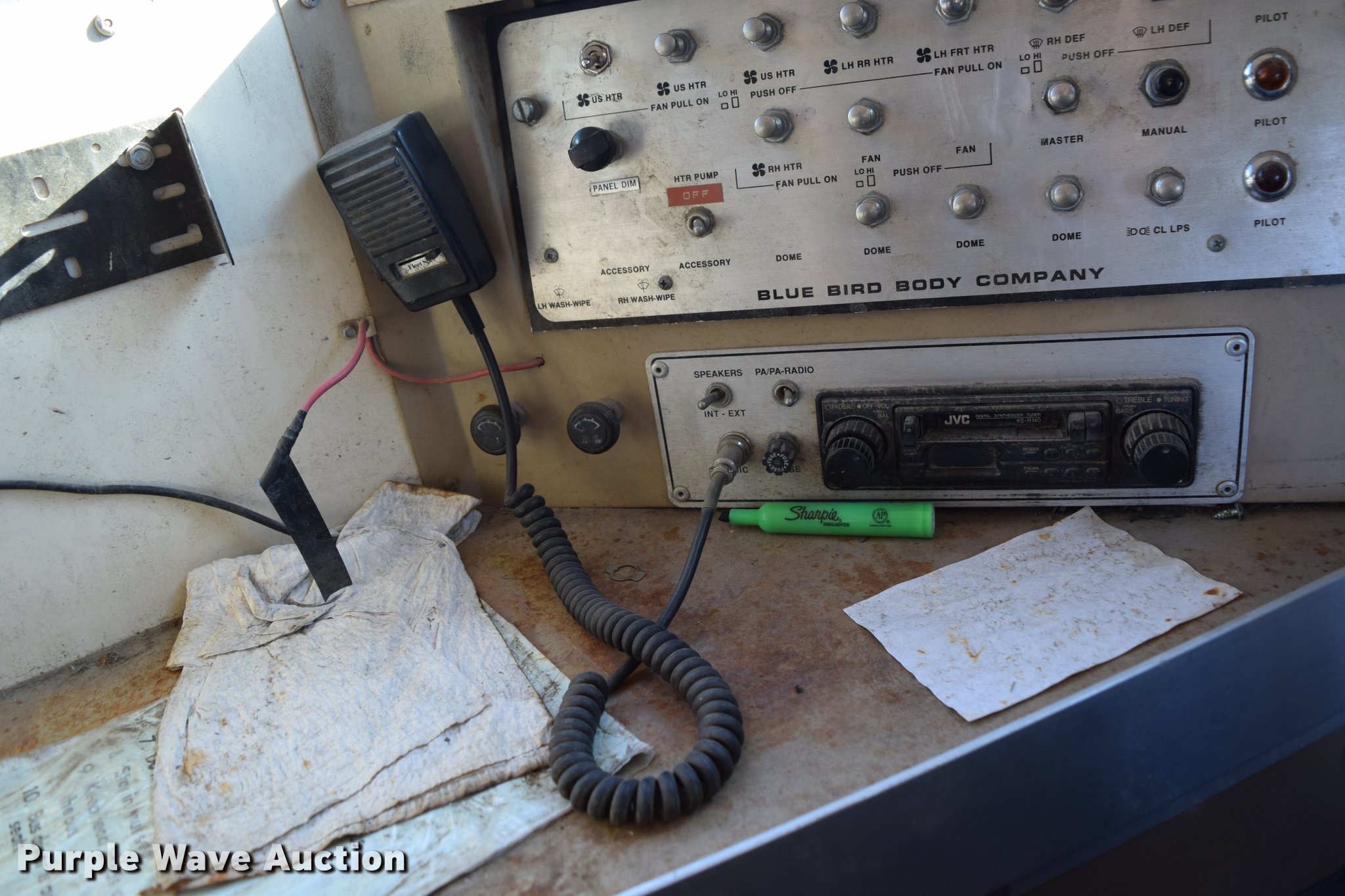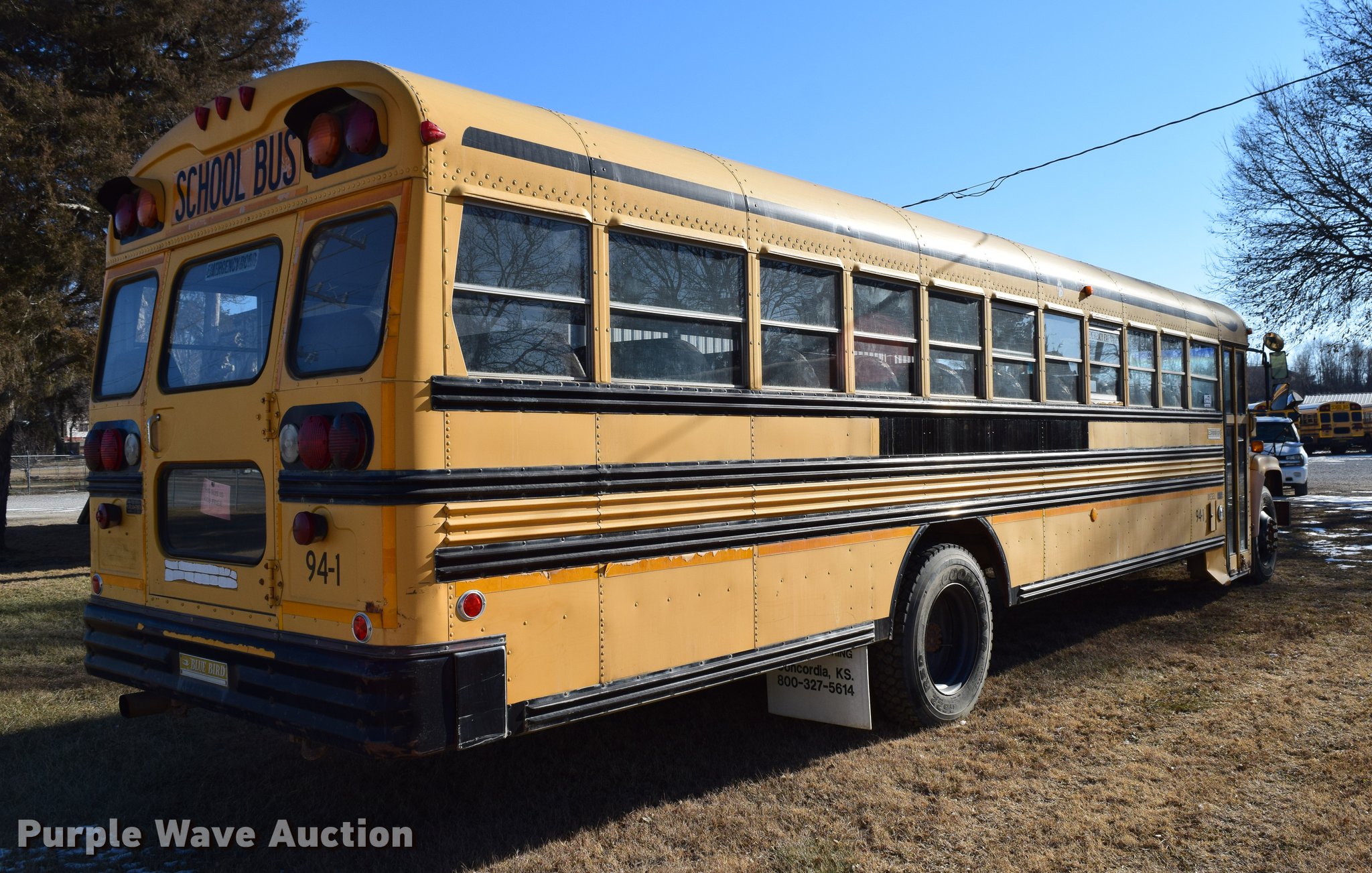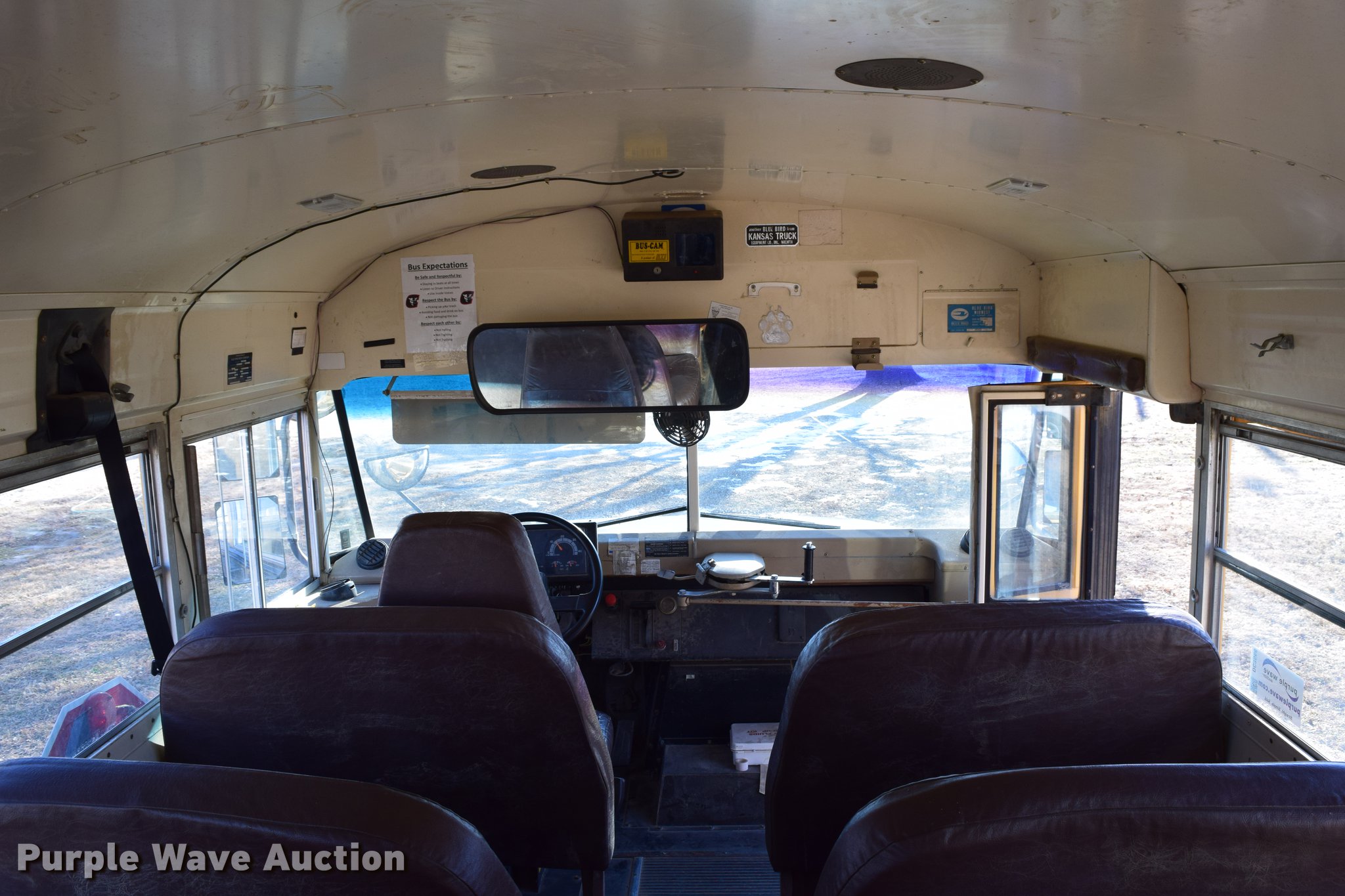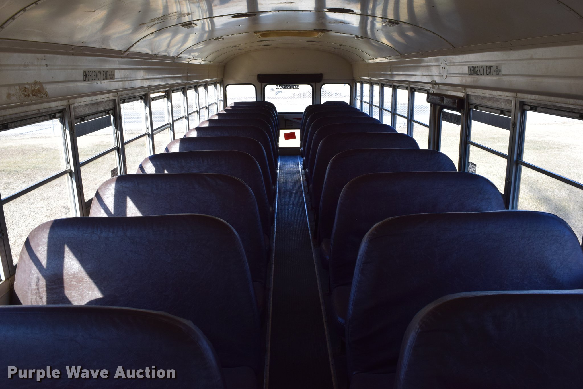 Purple Wave is selling a used Bus in Kansas. This item is a 1995 Chevrolet Blue Bird school bus with the following: 198,677 miles on odometer, Caterpillar 3116 6.6L L6 turbo diesel engine, Serial 9GK10640, Automatic transmission, Single axle, Heat, AM/FM/Cassette, 62 passenger capacity, Ceiling, rear, and side emergency exits, Emergency door alarms, Lighted stop sign, Rear tow hooks, Approx. 258" wheelbase, Spring suspension, Block heater, Hydraulic brakes, 10R22.5 tires, GVWR 27,960 lbs, Unit# 94-1