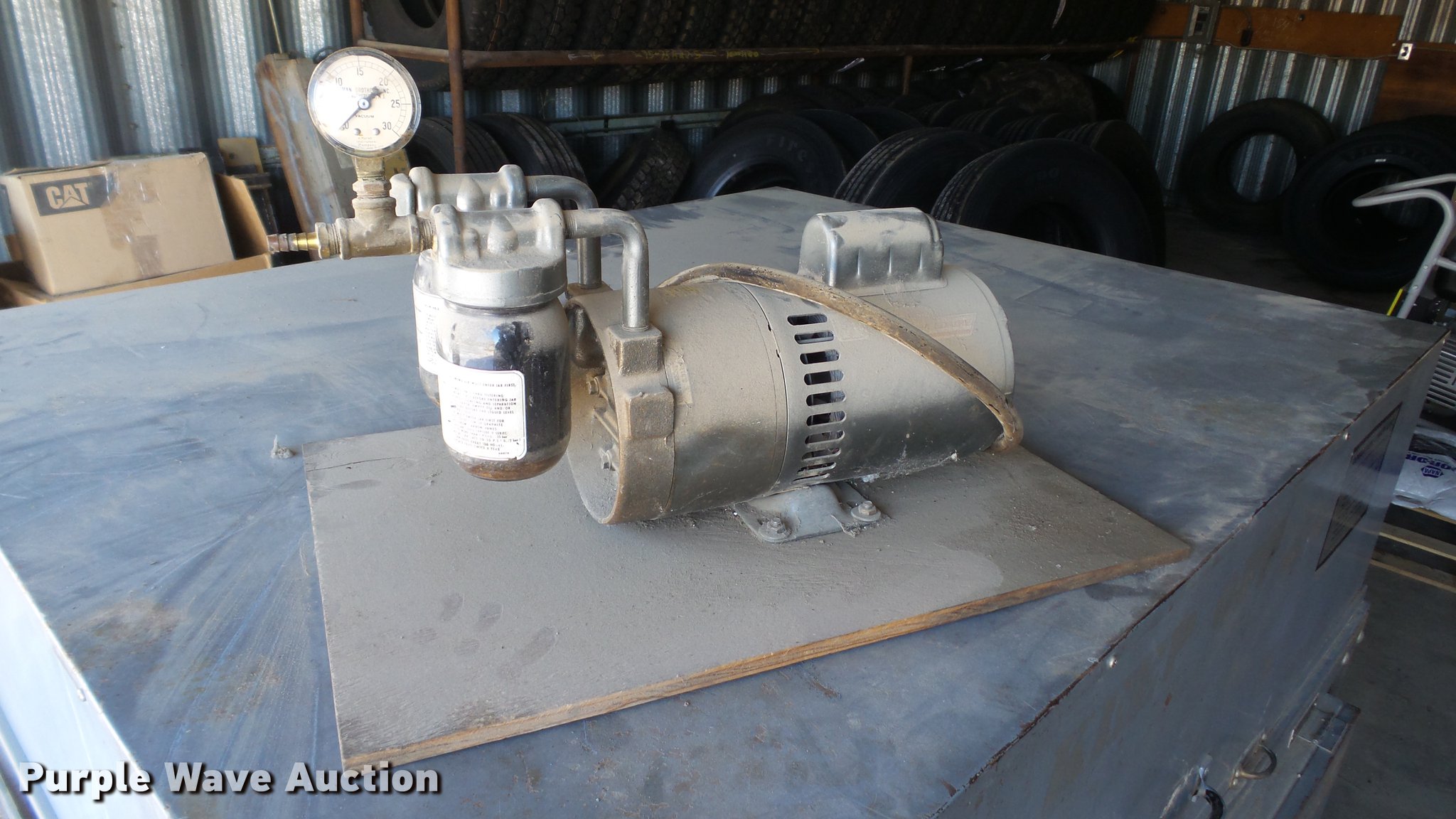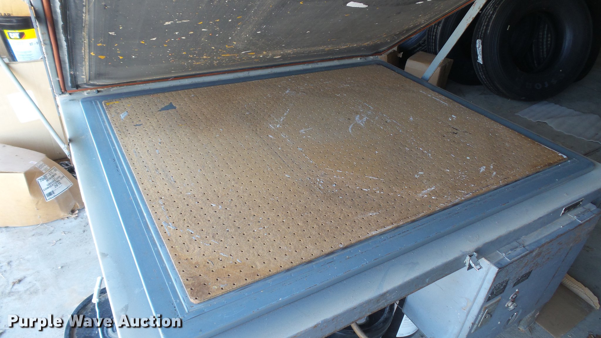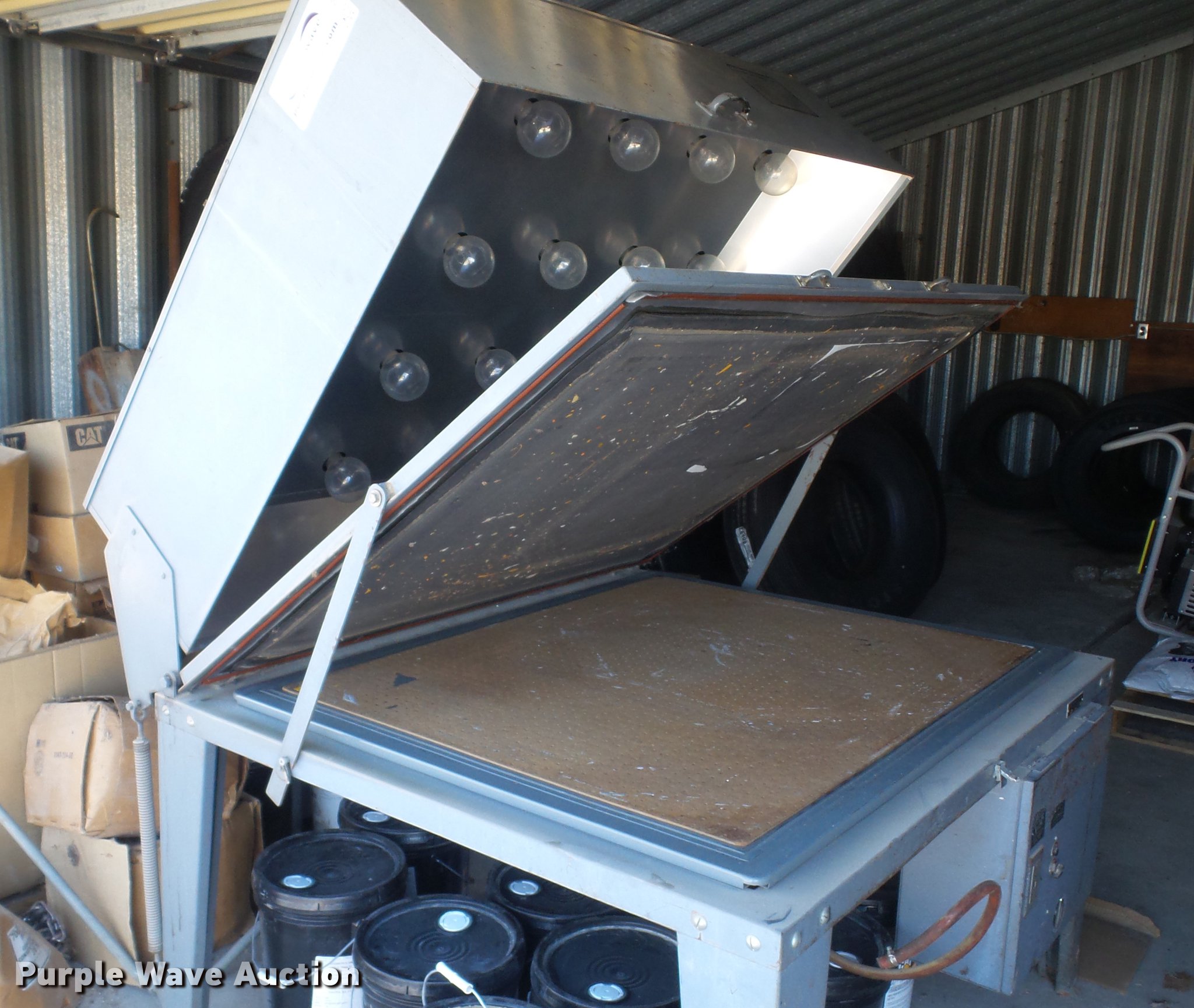 Scotchlite VAL-1 heat lamp applicator machine. 54"L x 57.5"W x 4'H, 3'L x 4'W working surface, 7,500 watts, 220v, Dayton Speedaire vacuum pump, Serial 1345. Marion County. 142 N Coble St. Marion, KS 66861