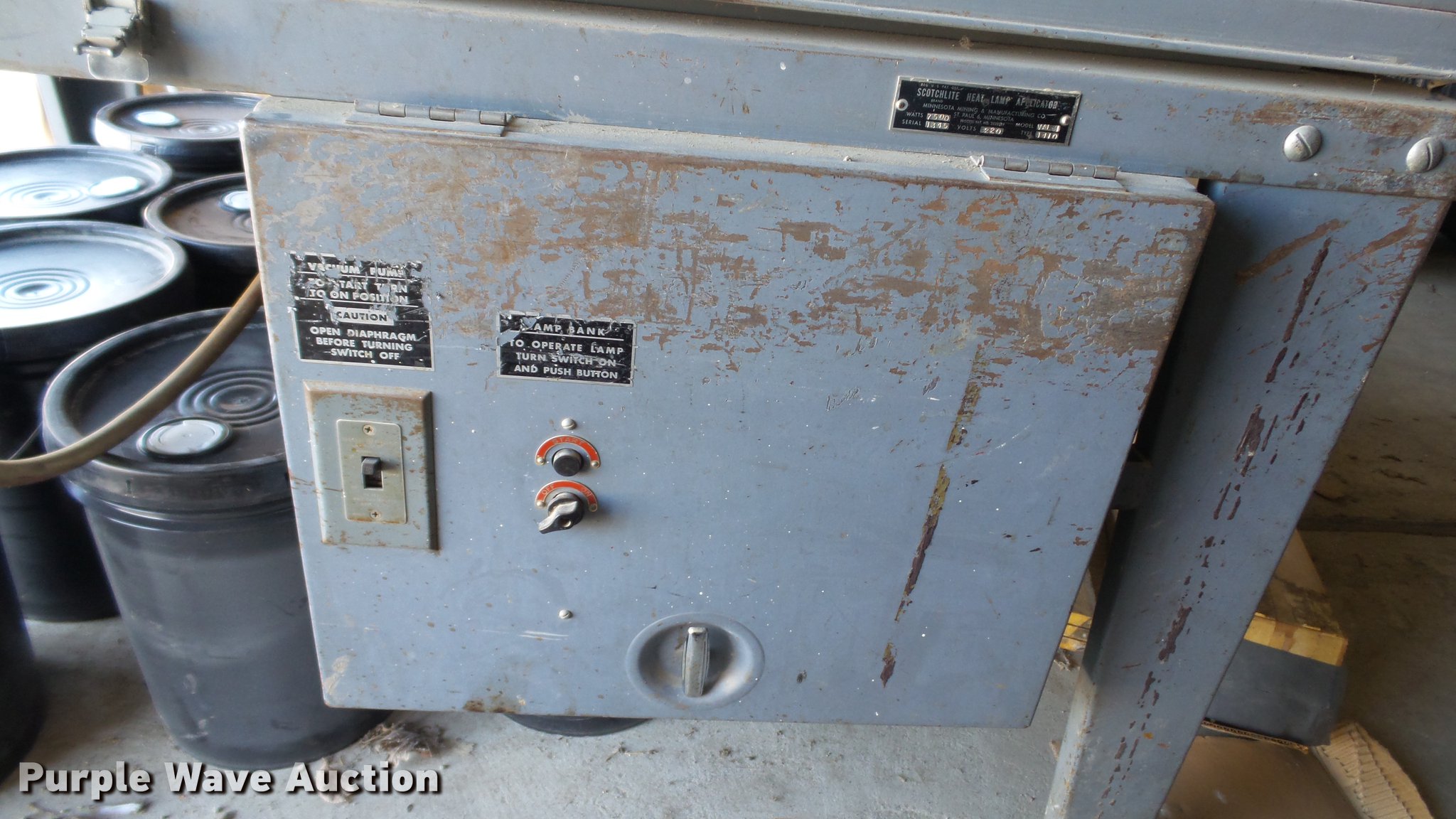 Purple Wave is selling a used Tools in Kansas. This item is a Scotchlite VAL-1 heat lamp applicator machine with the following: 54"L x 57.5"W x 4'H, 3'L x 4'W working surface, 7,500 watts, 220v, Dayton Speedaire vacuum pump, Serial 1345