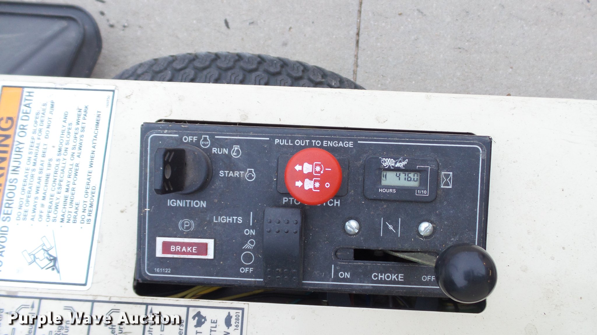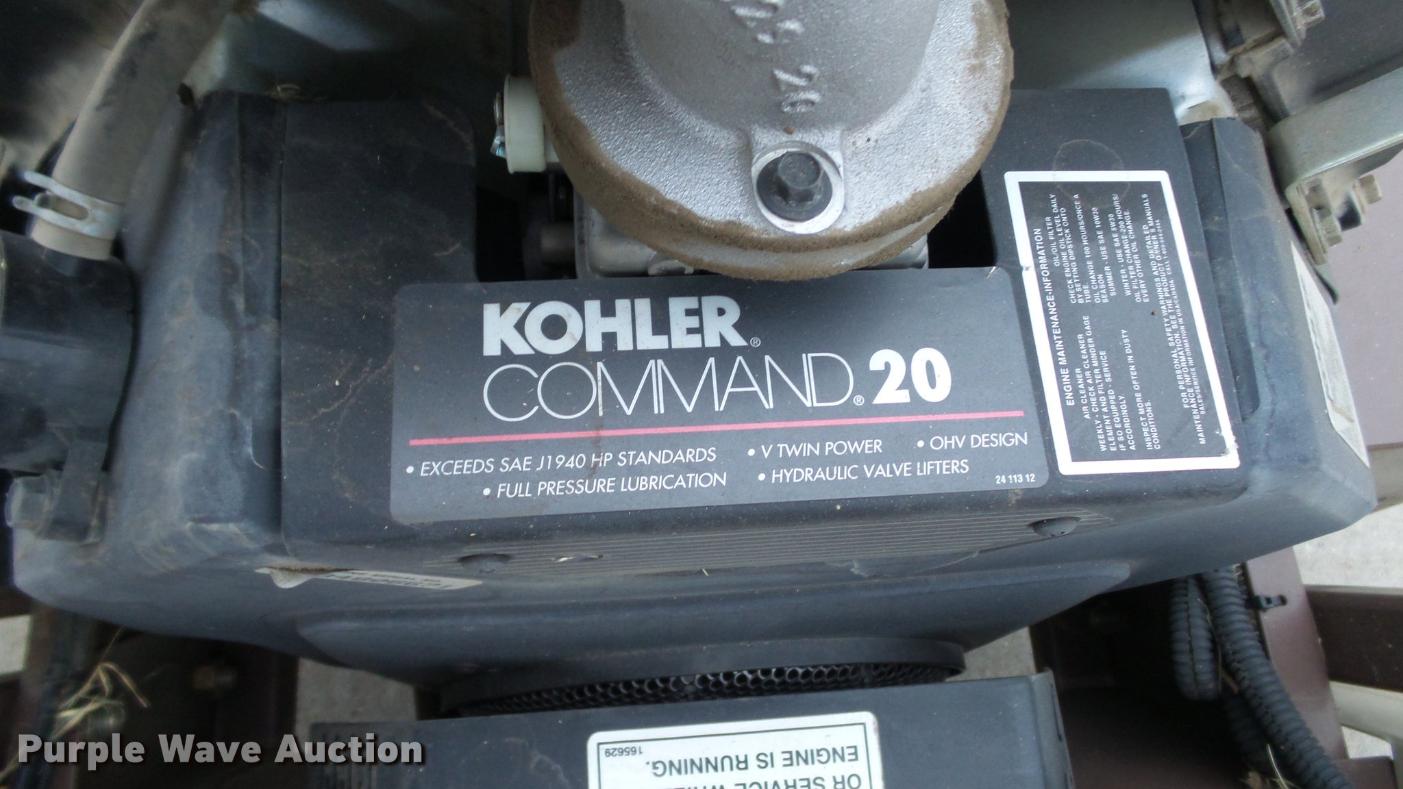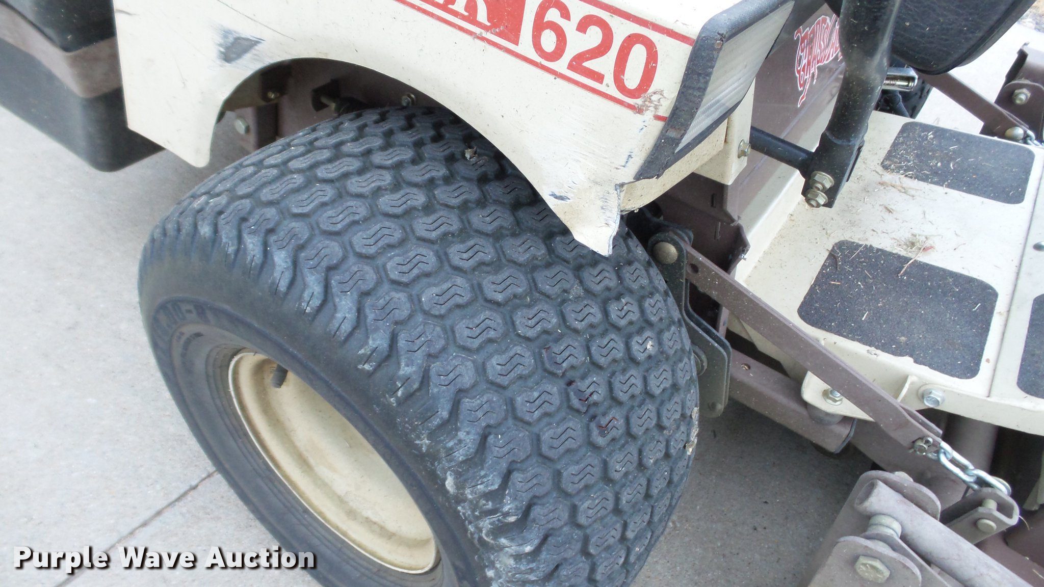 Purple Wave is selling a used Lawn Mower in Kansas. This item is a Grasshopper 620T lawn mower with the following: 476 hours on meter, 48" cut, Kohler CH640-3011 two cylinder gas engine, 20 HP, Serial 3934806671, Hydrostatic transmission, Powerfold deck, ROPS bar, Electric start, Front work lights, Fold up deck, 20x10.00-8 front tires, 13x6.5-6 rear tires, Serial 6014973