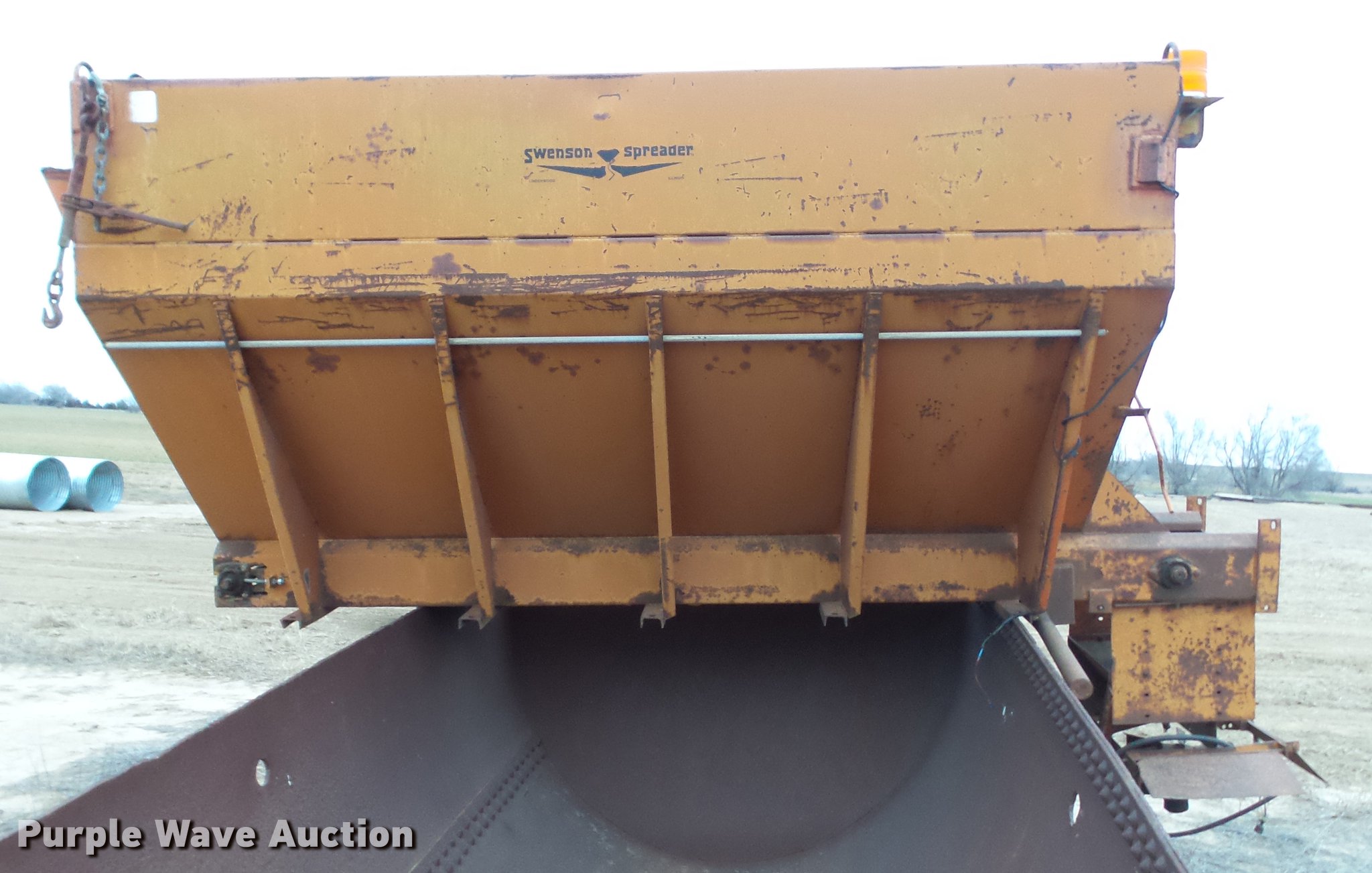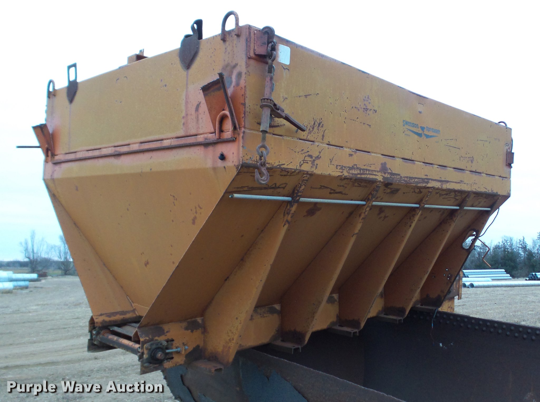 Purple Wave is selling a used Truck Part and Attach. in Kansas. This item is a Swenson V-box spreader with the following: 10'L x 7'W, Steel construction, Beacon light, 17" spreader wheel