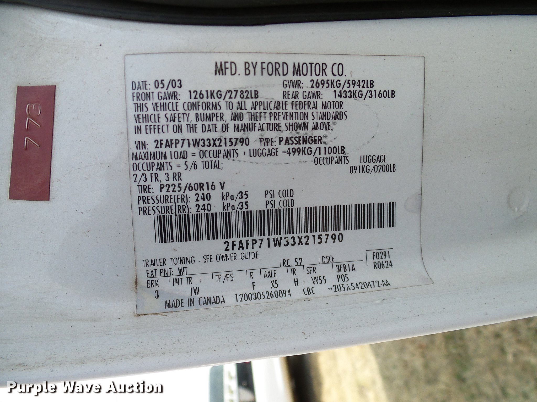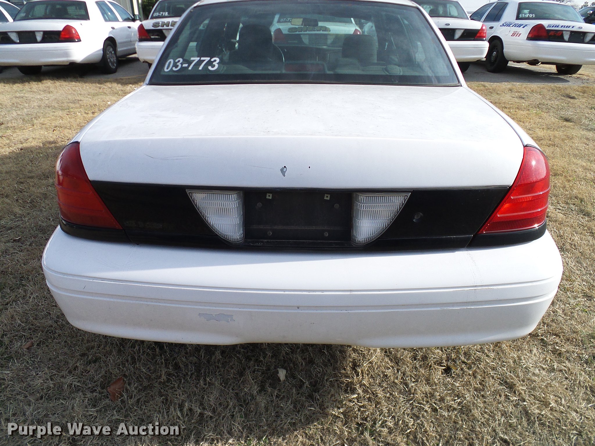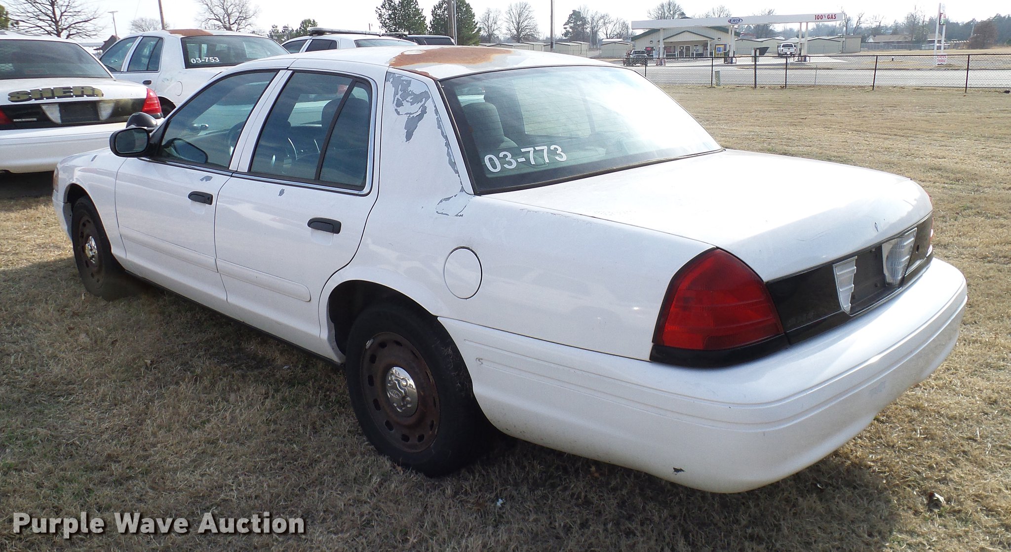 Purple Wave is selling a used Passenger Vehicle in Oklahoma. This item is a 2003 Ford Crown Victoria Police Interceptor with the following: 186,484 miles on odometer, 4.6L V8 SOHC 16V gas engine, Automatic transmission, AC and heat, Tilt, Cruise, AM/FM, Power windows, locks, and mirrors, Vinyl/cloth interior, 225/60R16 tires, Belt idler needs to be replaced, Emergency lighting, sirens, decals and associated equipment will be removed prior to auction., Unit# 03-773