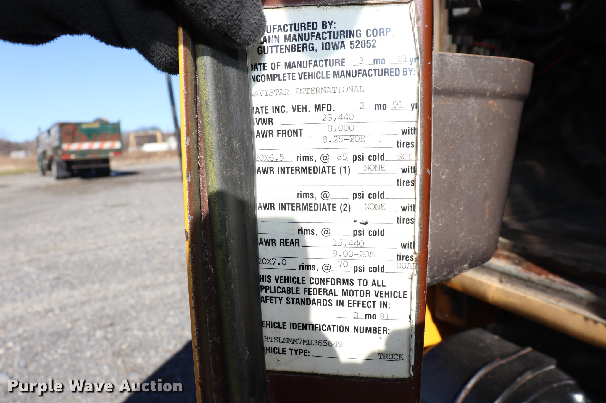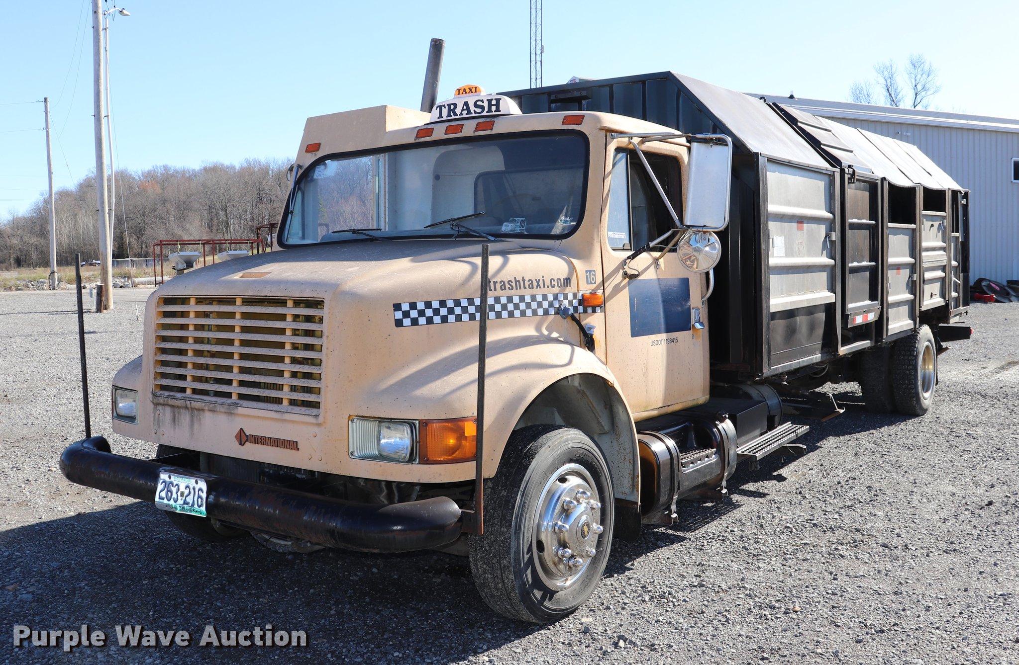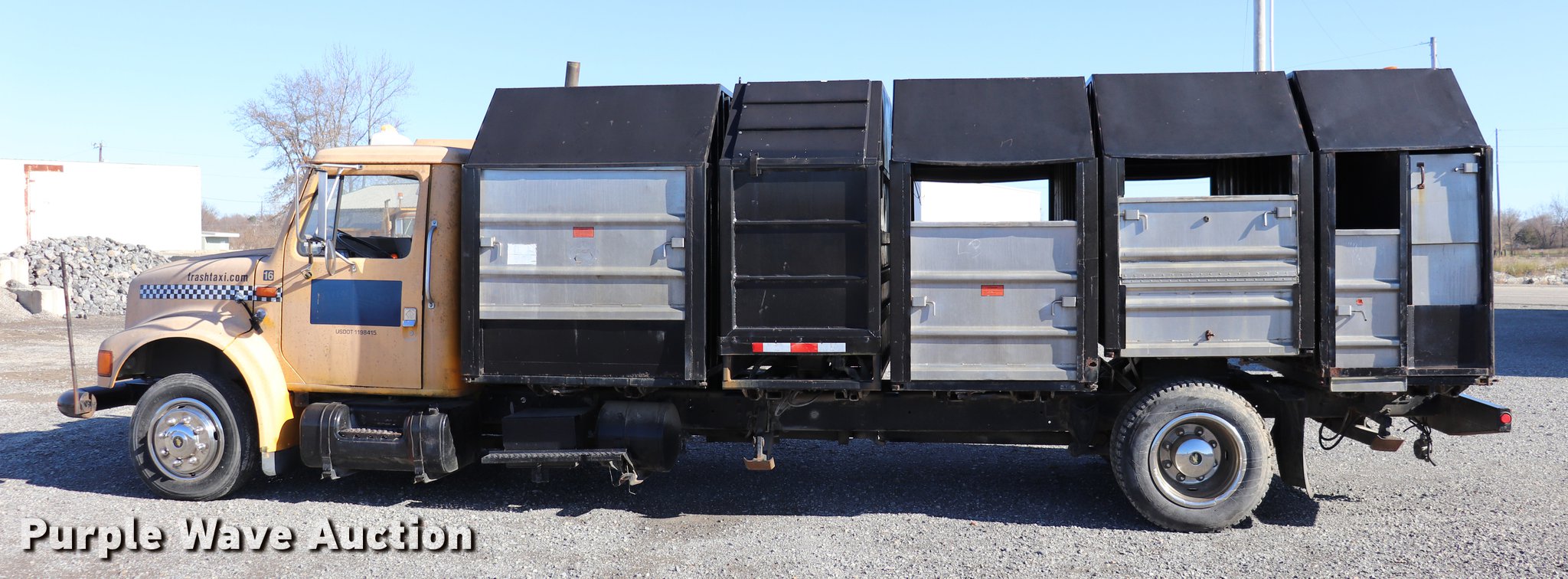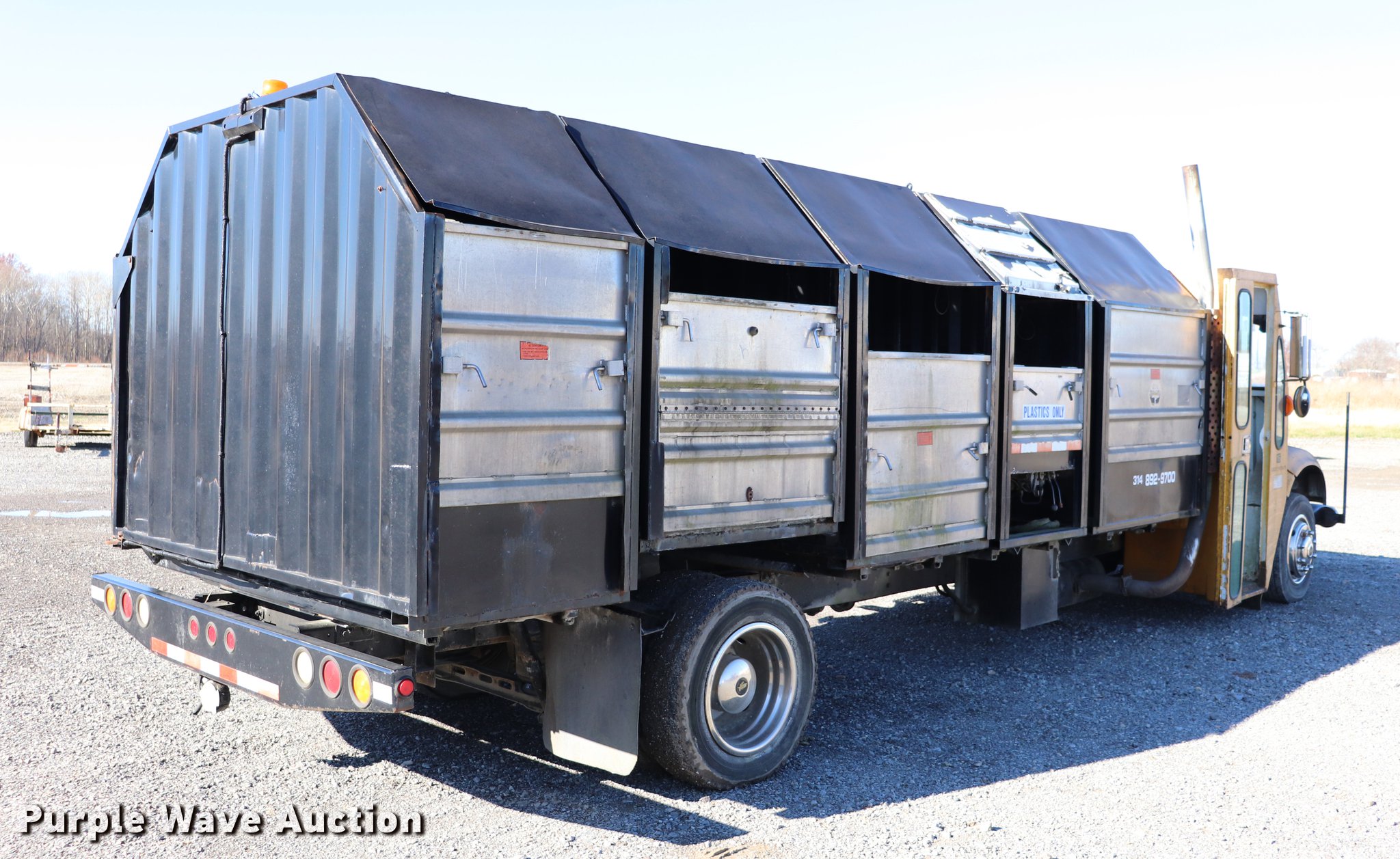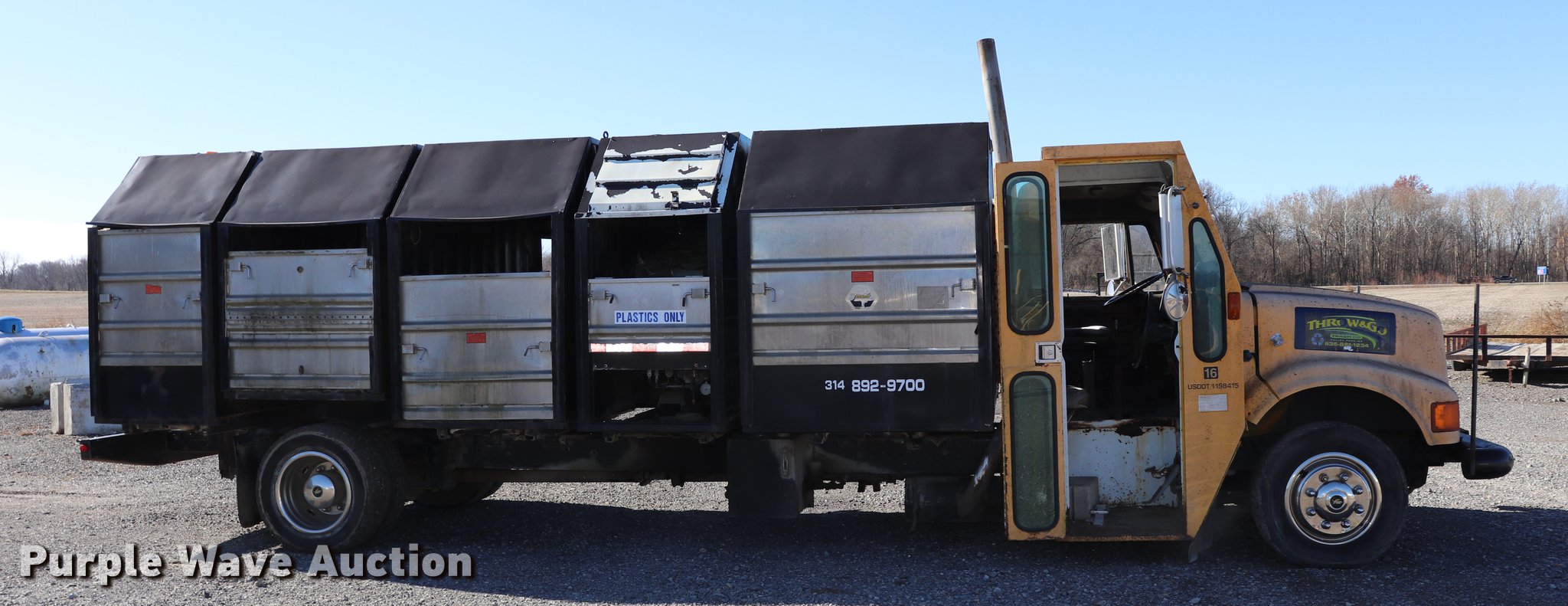 Purple Wave is selling a used Refuse Truck in Missouri. This item is a 1991 International 4700LP recycling truck with the following: 65,520 miles on odometer, International DT360 5.9L L6 turbo diesel engine, Automatic transmission, Single axle, AC and heat, Heated mirrors, Dual operators stations, Single rear exhaust stack, Recycling bed, (5) compartments, Hydraulic controls, Unknown operating condition, Spring suspension, Hydraulic brakes, 232" wheelbase, 245/70R19.5 tires, GVWR 23,440 lbs, AC and heat inoperable, Door handle broken, Unknown operating condition, Unit# 16