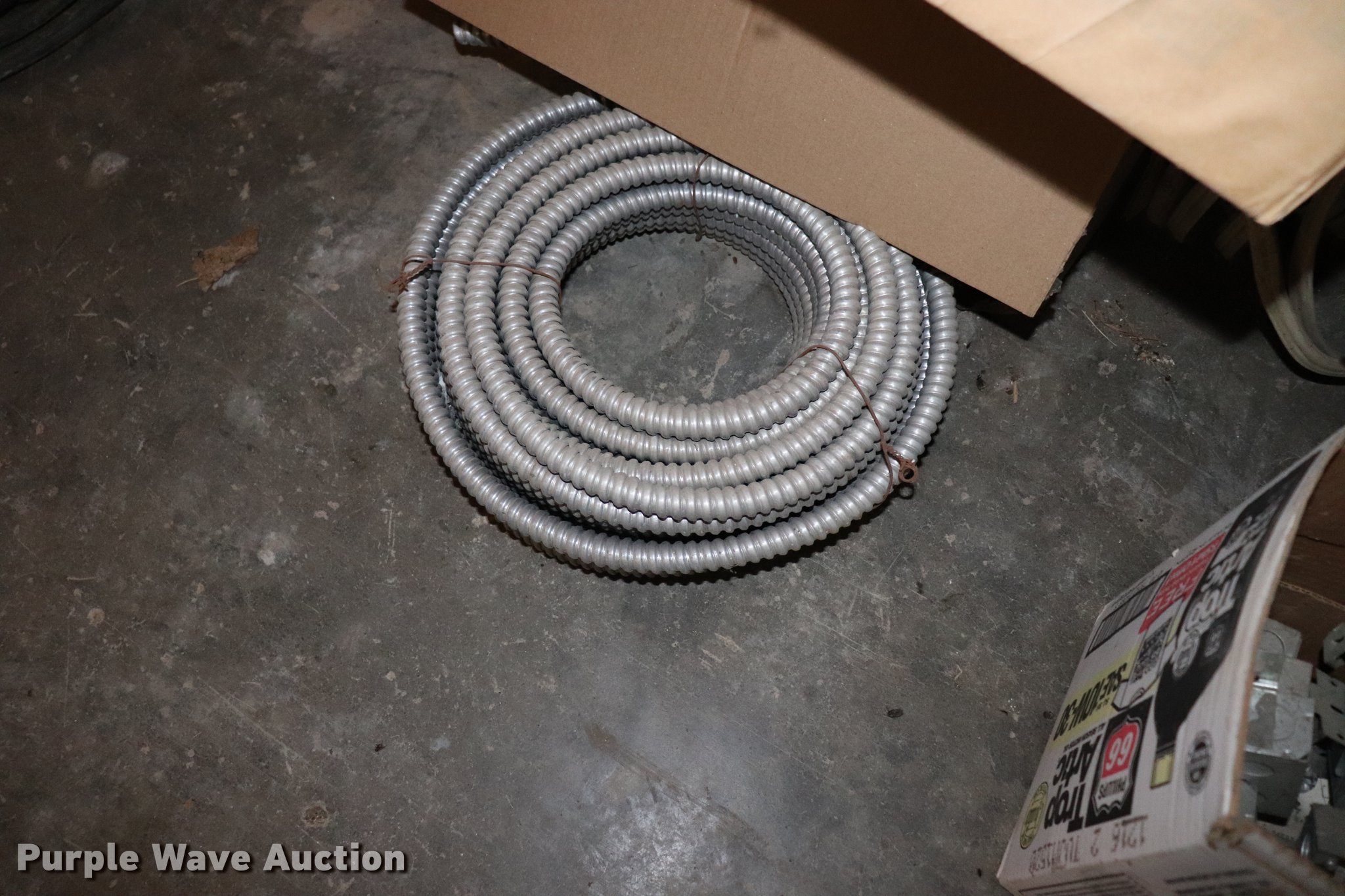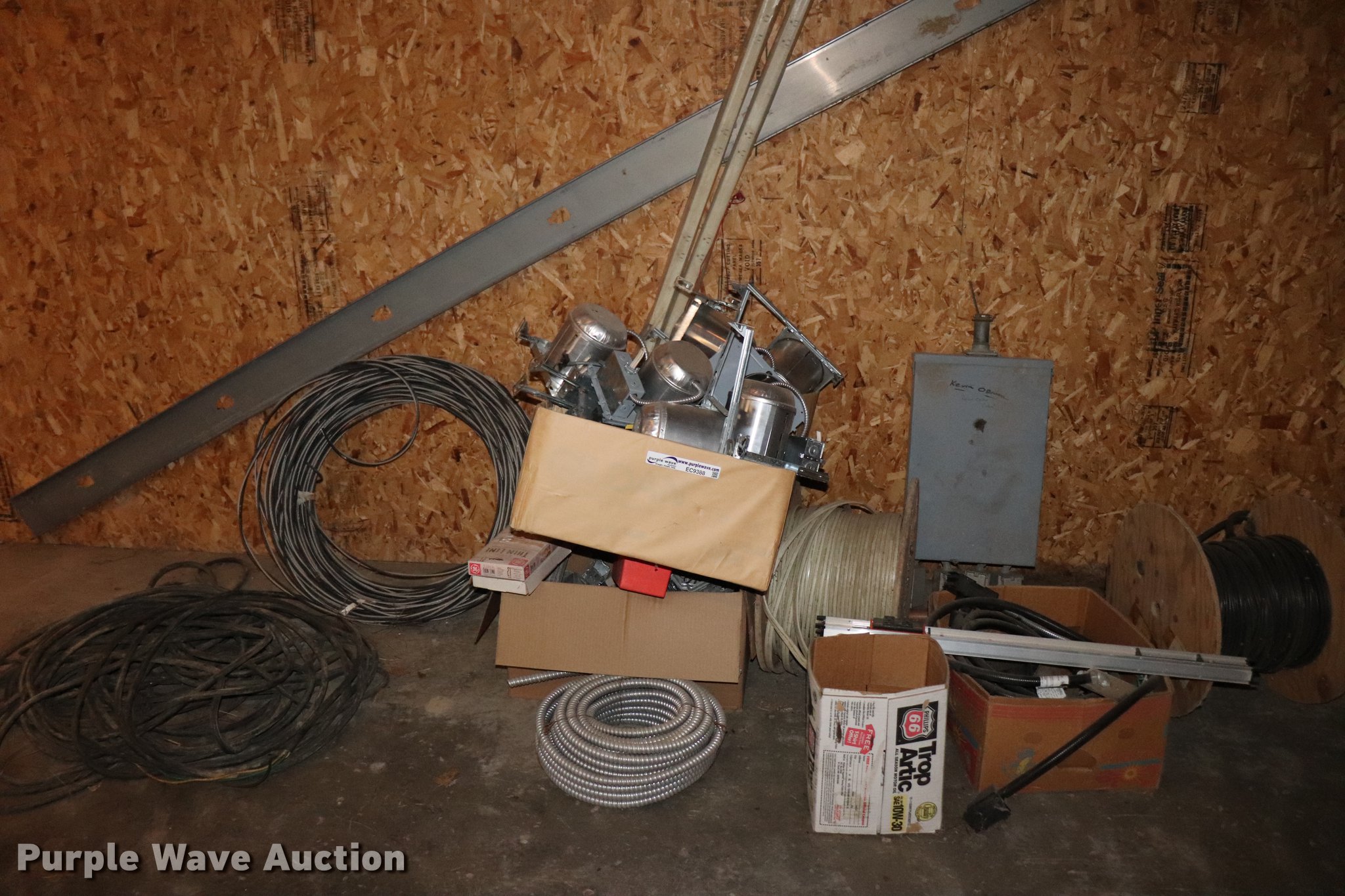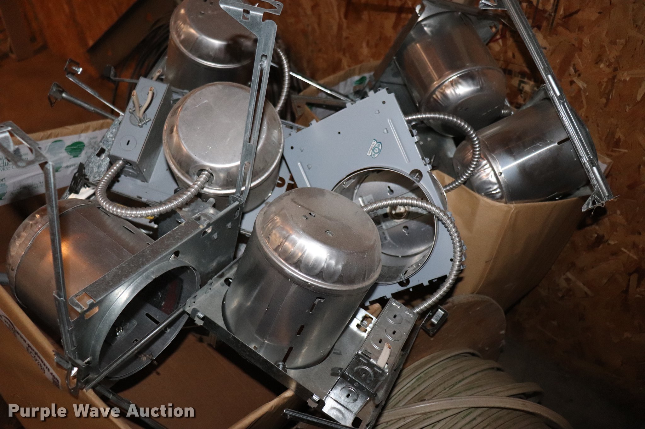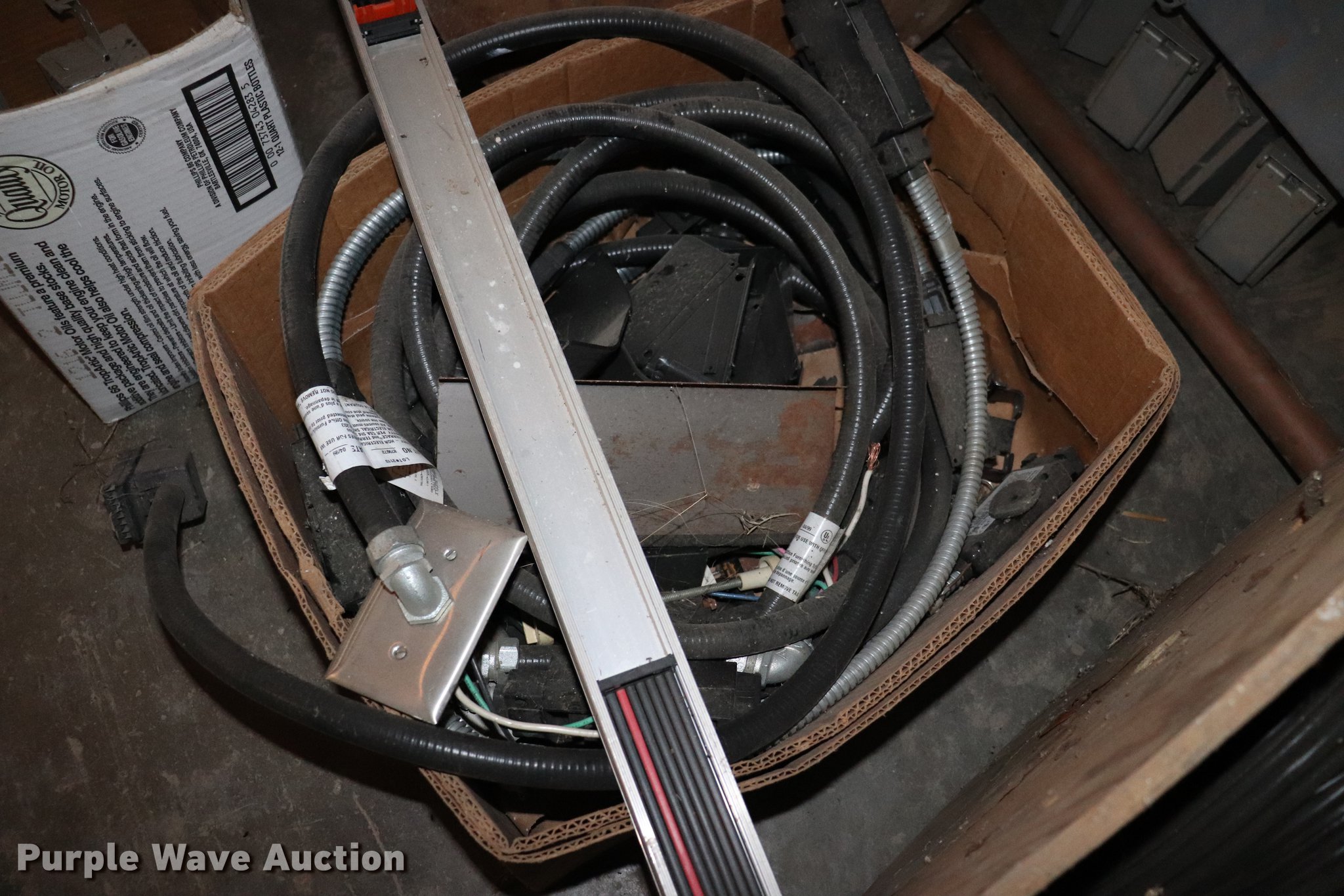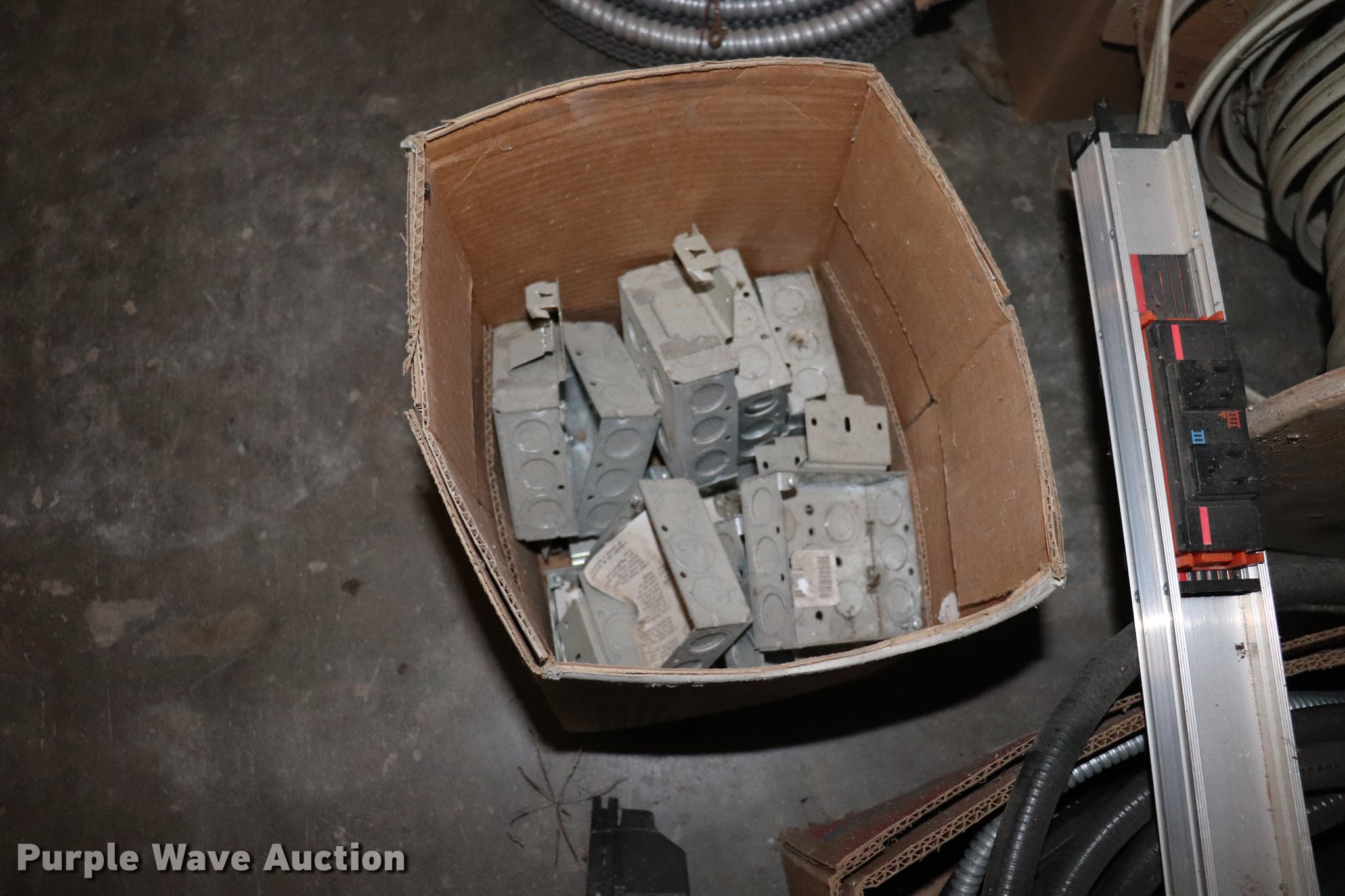 Purple Wave is selling a used Tools in Kansas. This item is a Electrical components with the following: Junction boxes, Metal conduit, Can lights, Service panels and more