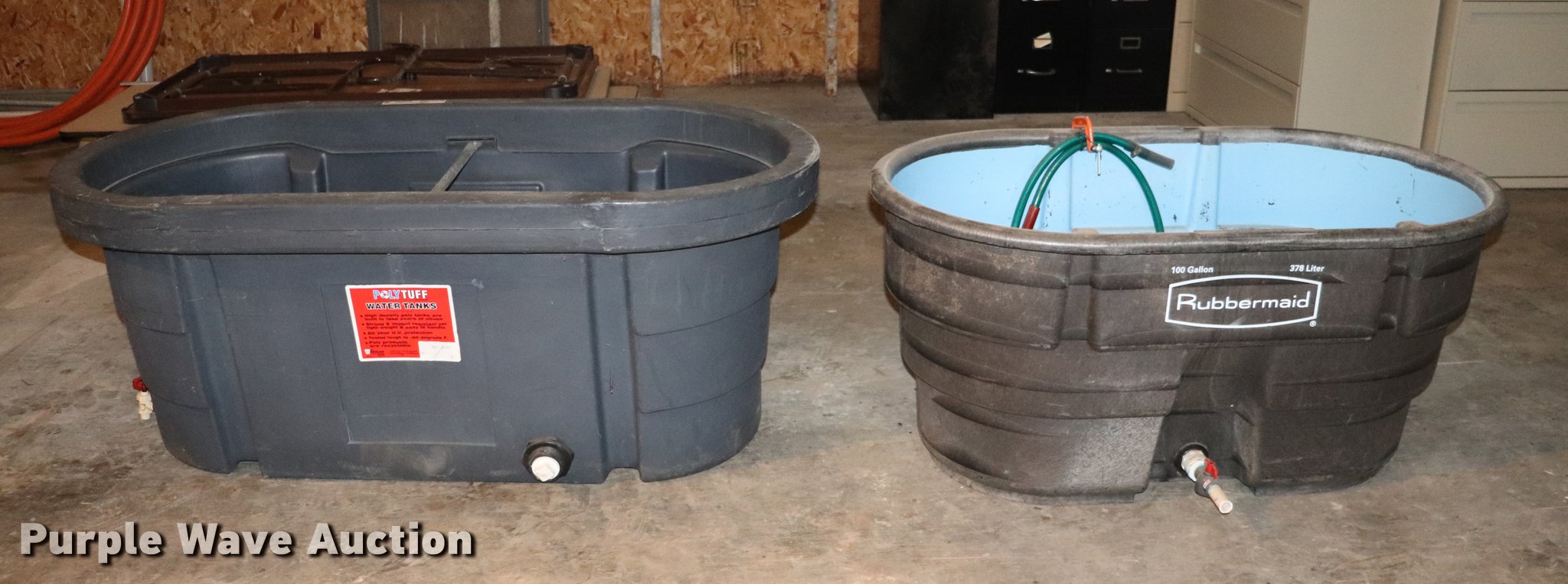 Purple Wave is selling a used Tanks in Kansas. This item is a (2) poly water tanks with the following: One 100 gallon capacity, Rubbermaid and Poly Tuff brands