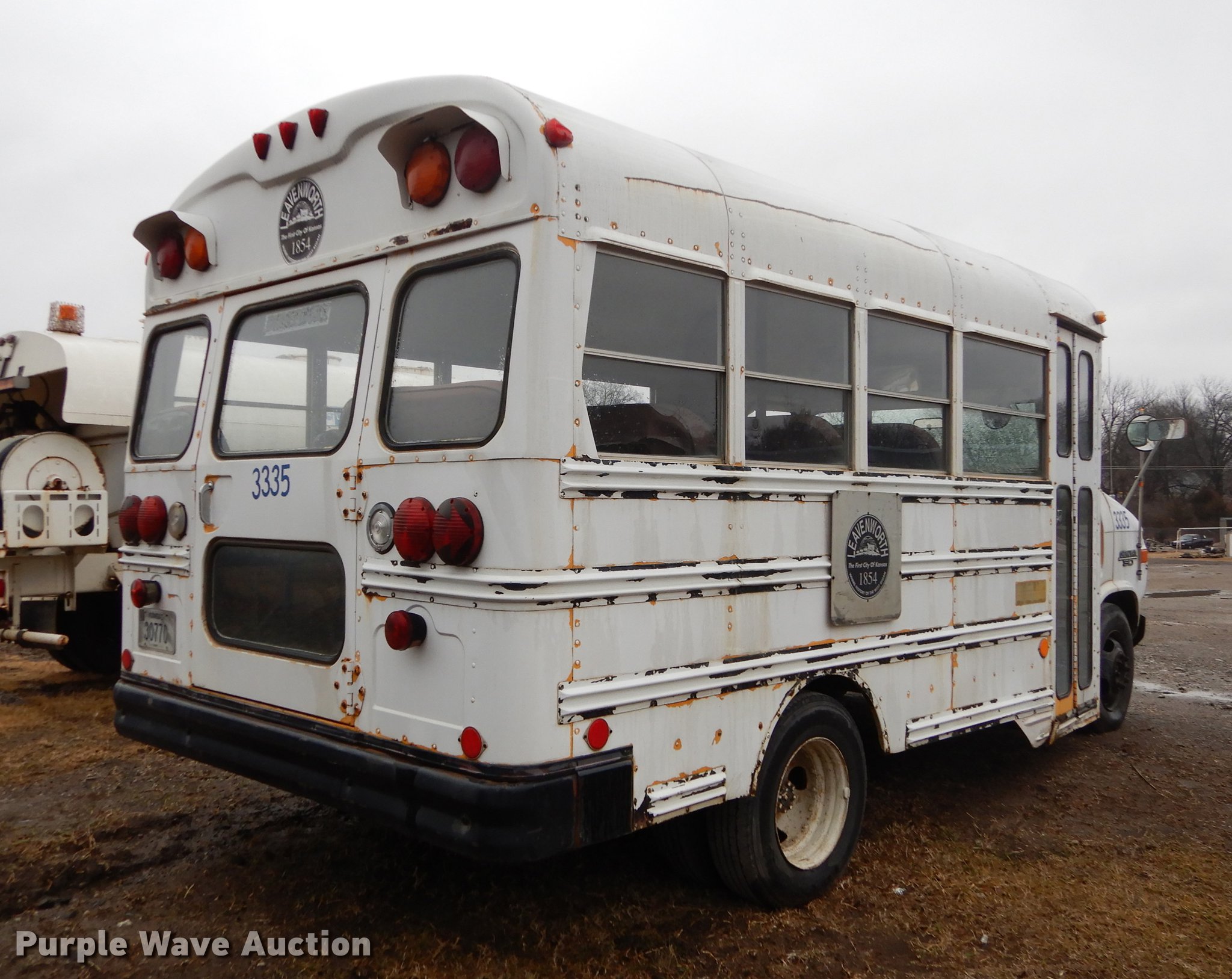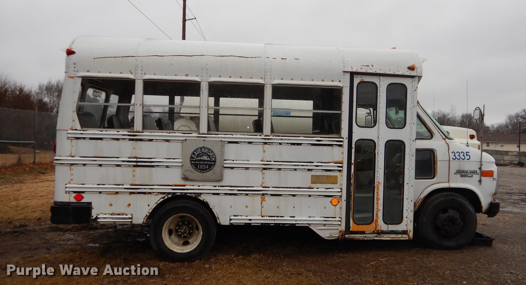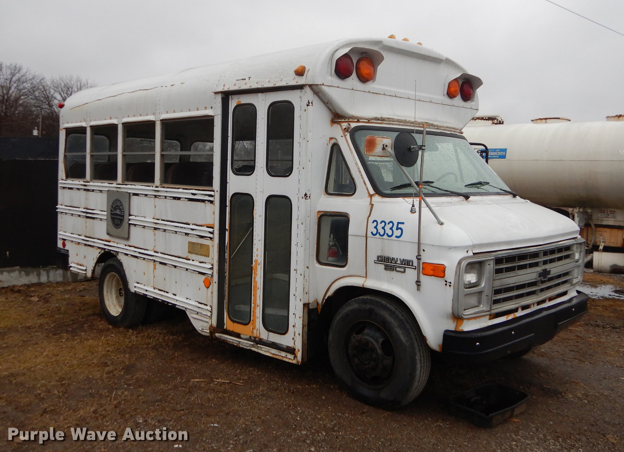 Purple Wave is selling a used Bus in Kansas. This item is a 1987 Chevrolet G30 school bus with the following: 85,707 miles on odometer, 5.7L V8 OHV 16V gas engine, Automatic transmission, Single axle, Heat, AM/FM, 21 passenger capacity, Rear emergency exits, Spring suspension, Hydraulic brakes, 126" wheelbase, Firestone 8.75R16.5 tires, Transmission fluid leaks, Transmission issues, needs replaced, Unit# 3335