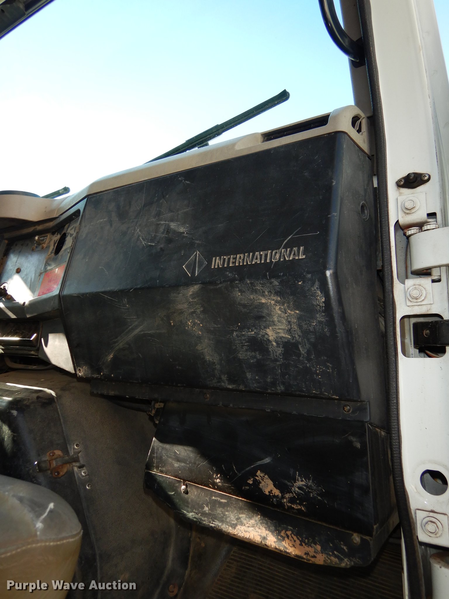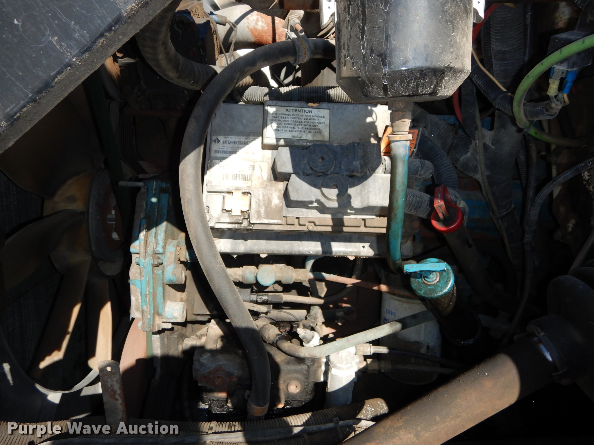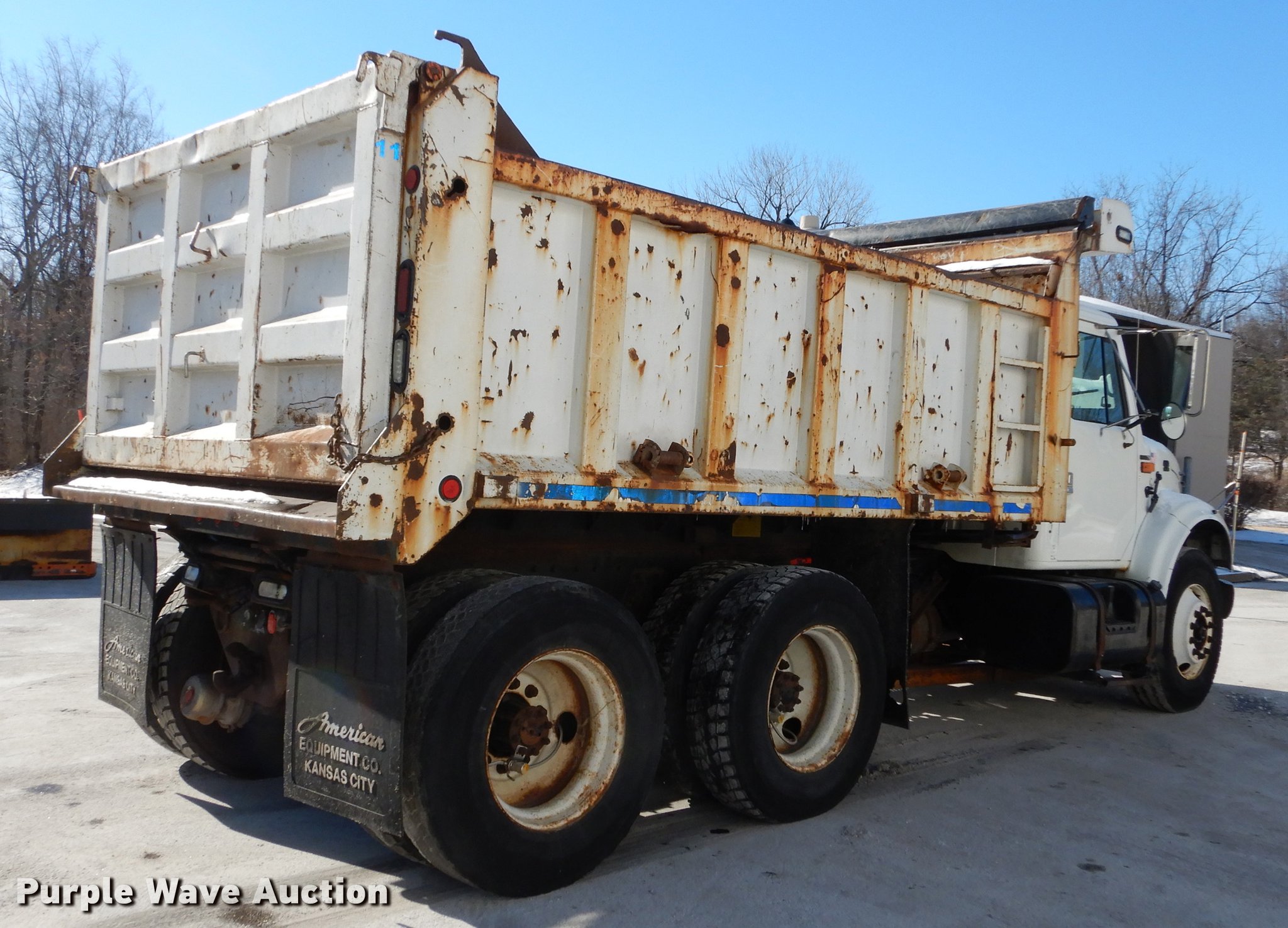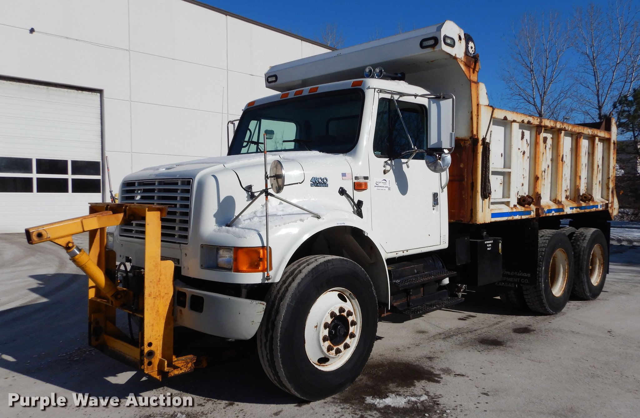 Purple Wave is selling a used Construction Dump Truck in Kansas. This item is a 2001 International 4900 dump truck with the following: 88,910 miles on odometer, 9,500 hours on meter, International DT466E 7.6L L6 turbo diesel engine, Automatic transmission, Inter-axle differential lock, Tandem axle, Power divider lock switch, AC and heat, Cruise, AM/FM/CD, Heated mirrors, Air suspension seat, Block heater, Warren FL650-13 steel dump bed, 13'L x 8'W, 40" side height, Single ram hoist, Roll tarp, Air operated end gate, 11/13 cu.yd. capacity, Snow plow brackets, Single fuel tank, Front tow hooks, Double wall frame, Pintle hitch, Rear hydraulic connectors, Trailer wiring, Spring over walking beam suspension, Air brakes, 11R22.5 tires, GVWR 47,220 lbs, FAWR 13,220 lbs, RAWR 34,000 lbs, Intermittent engine hesitation, Non-operational AC, Exterior frame wall cracked, Instrument cluster operates intermittently, Battery weak