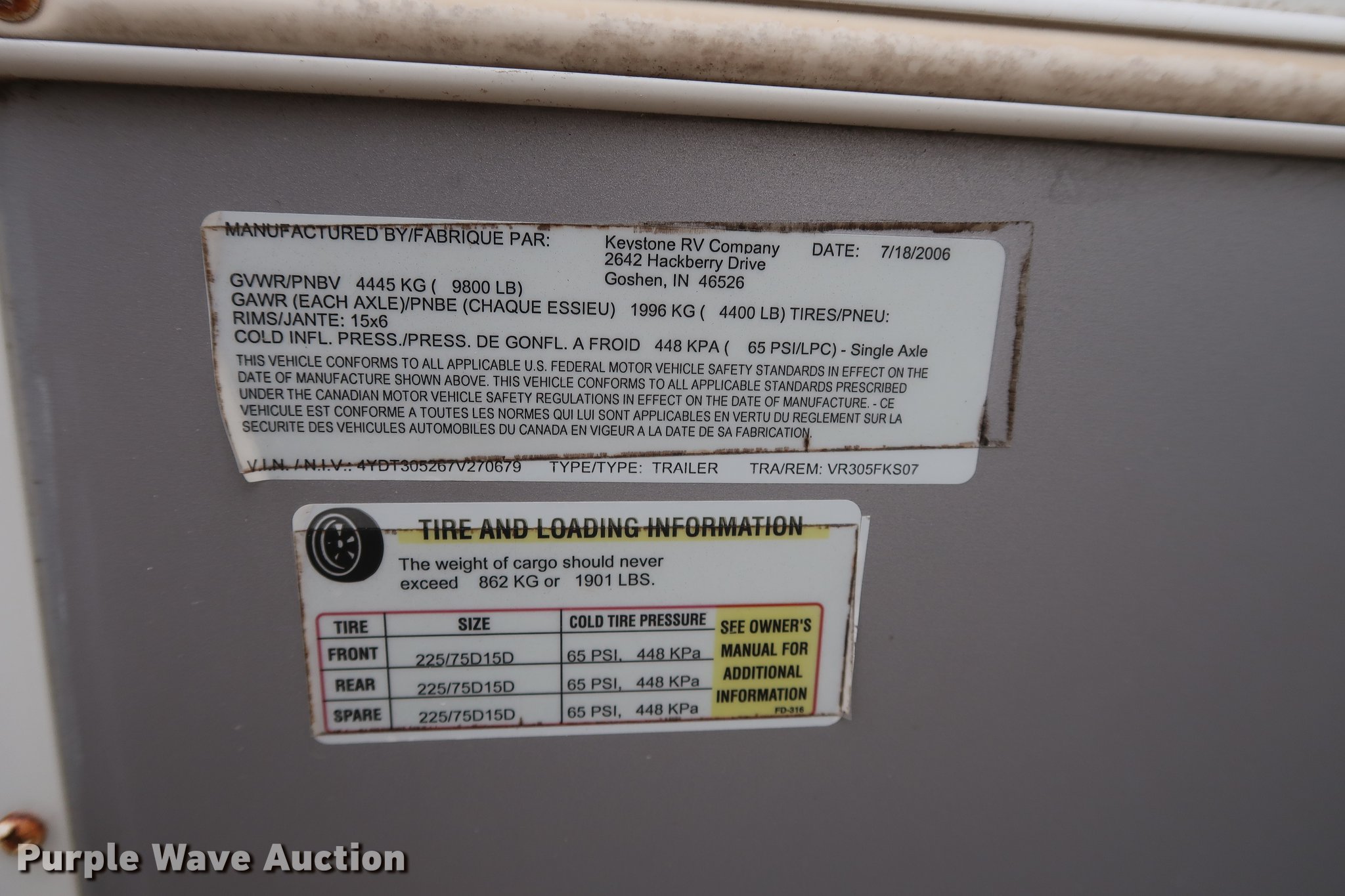 Purple Wave is selling a used RV in Missouri. This item is a 2007 Keystone VR1 camper with the following: 32'L, Kitchen, Sink, Refrigerator/freezer, Microwave, Stovetop, Bathroom, Bedroom, Single leg landing gear, 2 5/16" ball hitch, Spring suspension, Electric brakes, 225/75R15 tires, Glass missing by door will be replaced prior to auction