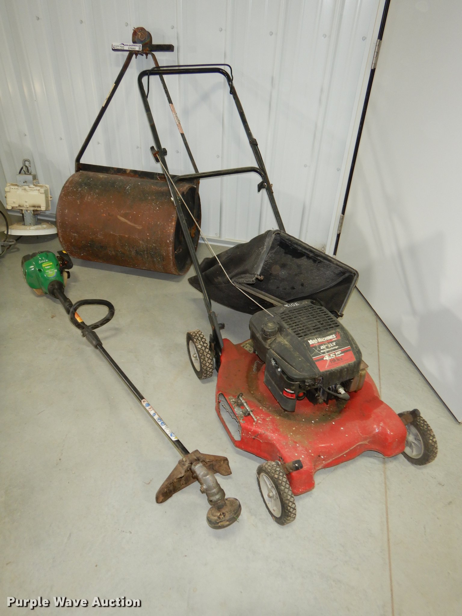Purple Wave is selling a used Lawn and Garden in Kansas. This item is a Lawn and garden equipment with the following: Lawn roller, 2' x 18", Weedeater SST25CE string trimmer, Yard Machine push mower, 22"W cut, Bagger, Non-operational units