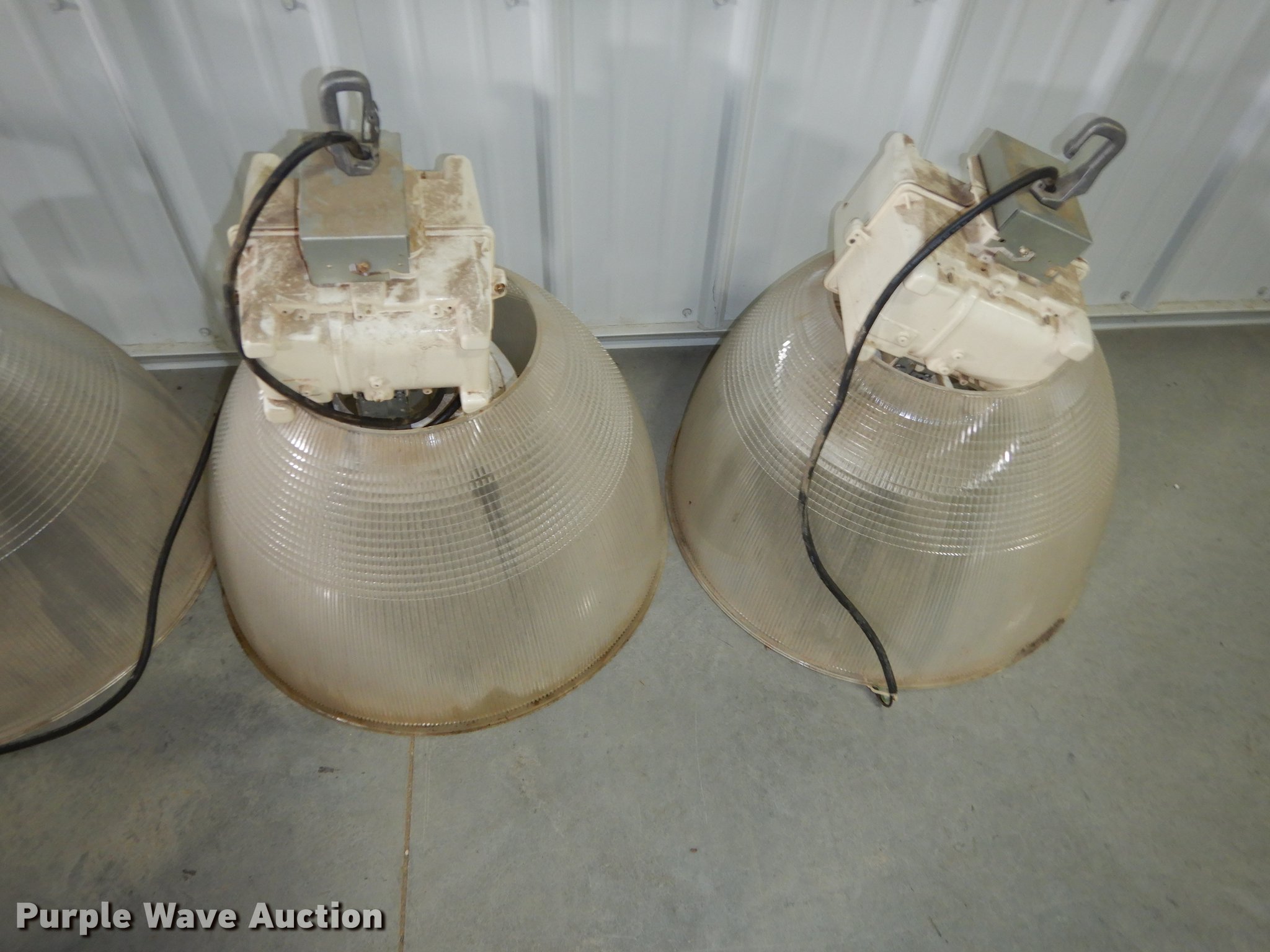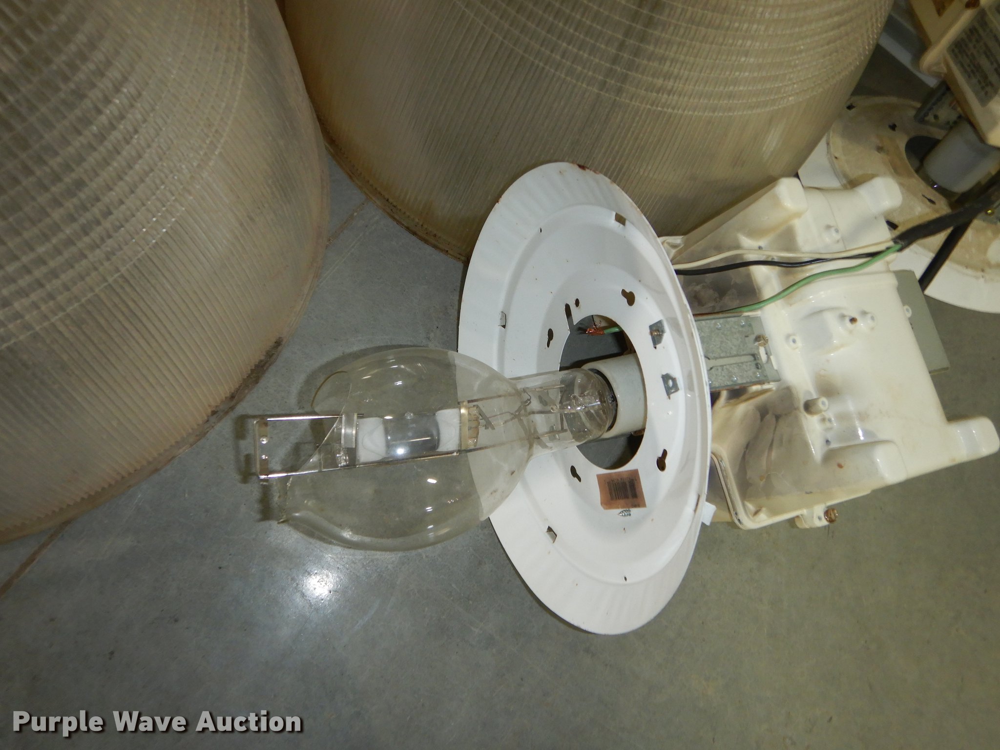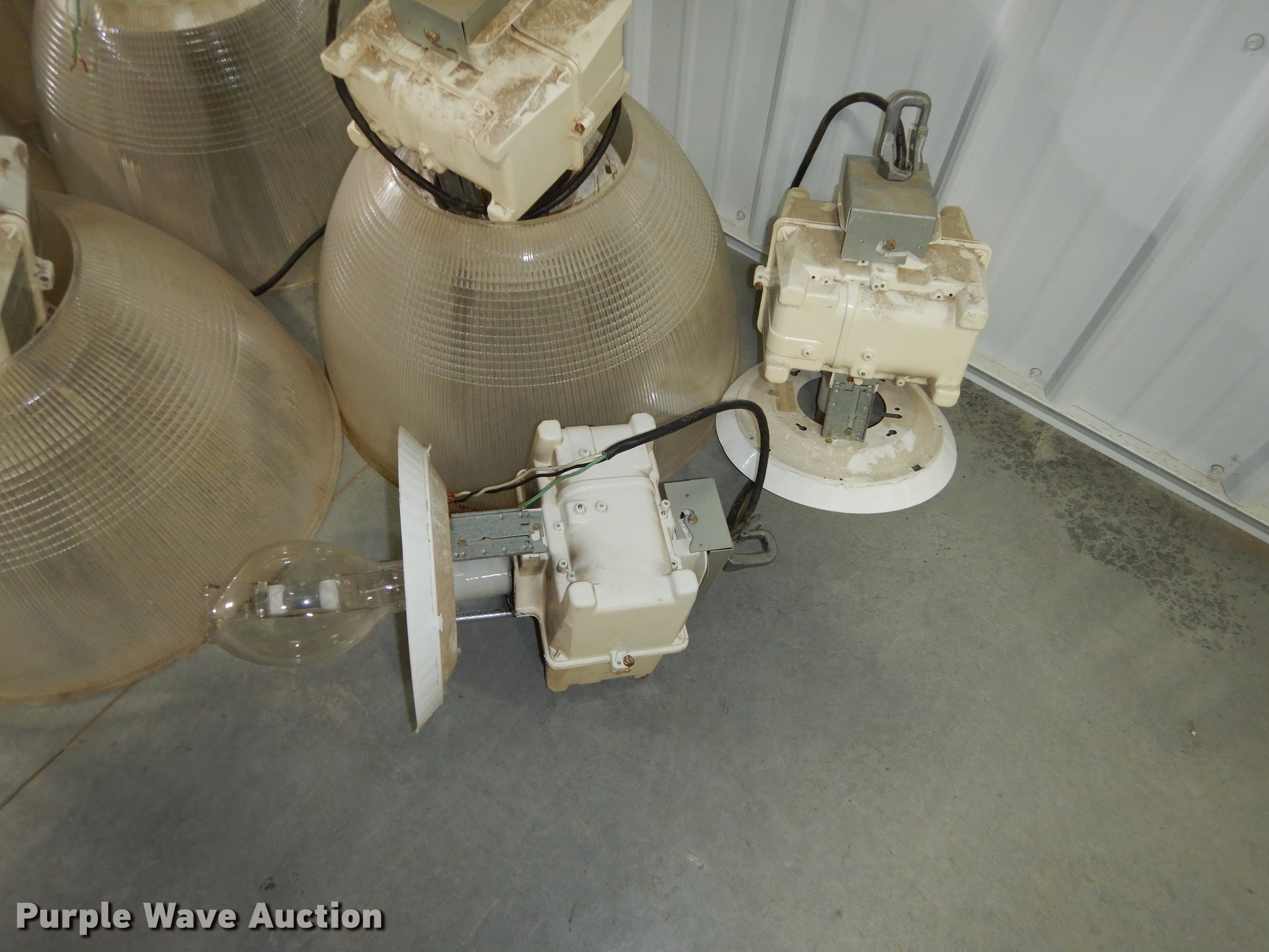 Purple Wave is selling a used Building Materials in Kansas. This item is a (9) Halide ceiling lights with the following: 400 watt, (2) without domes