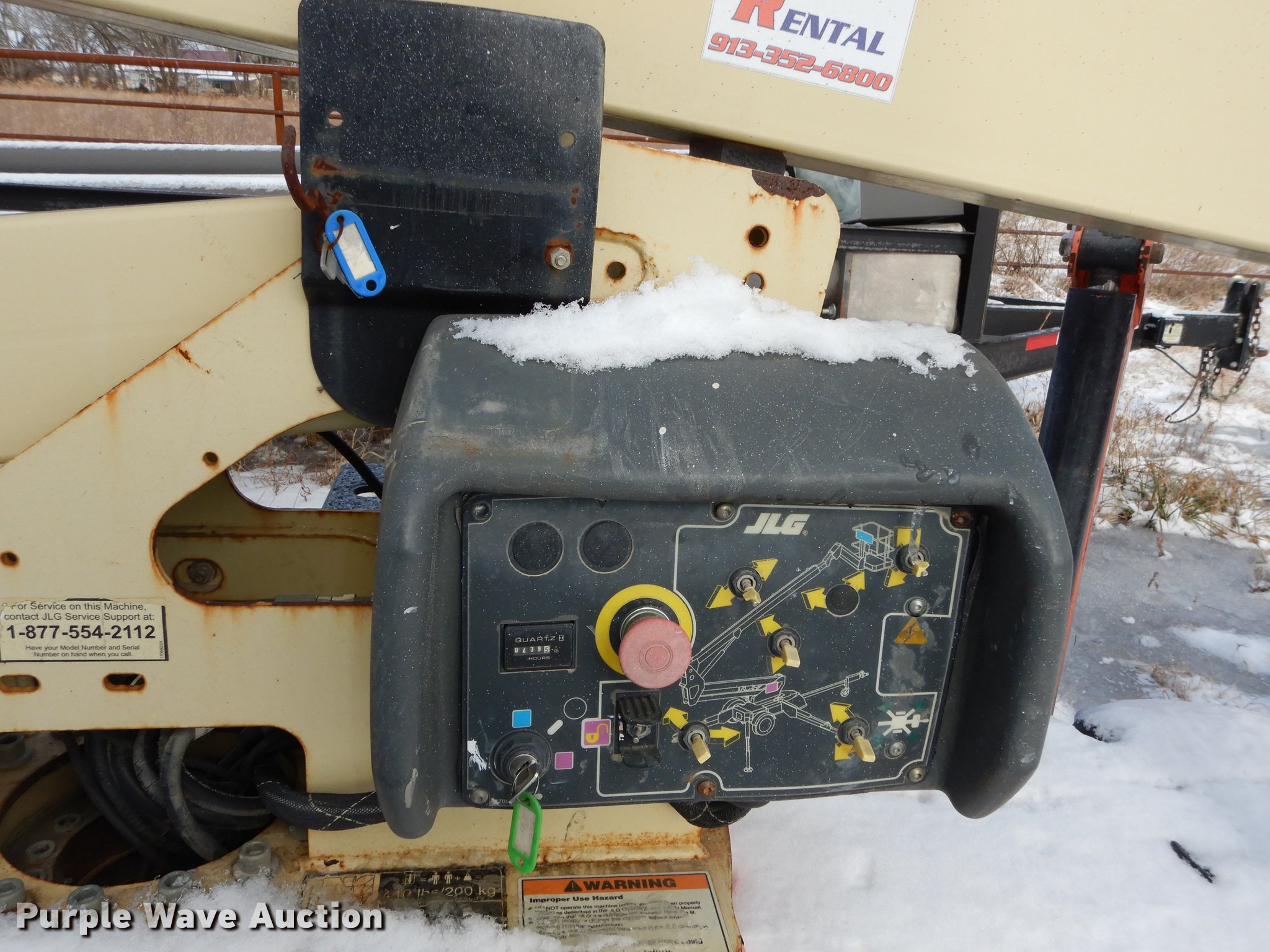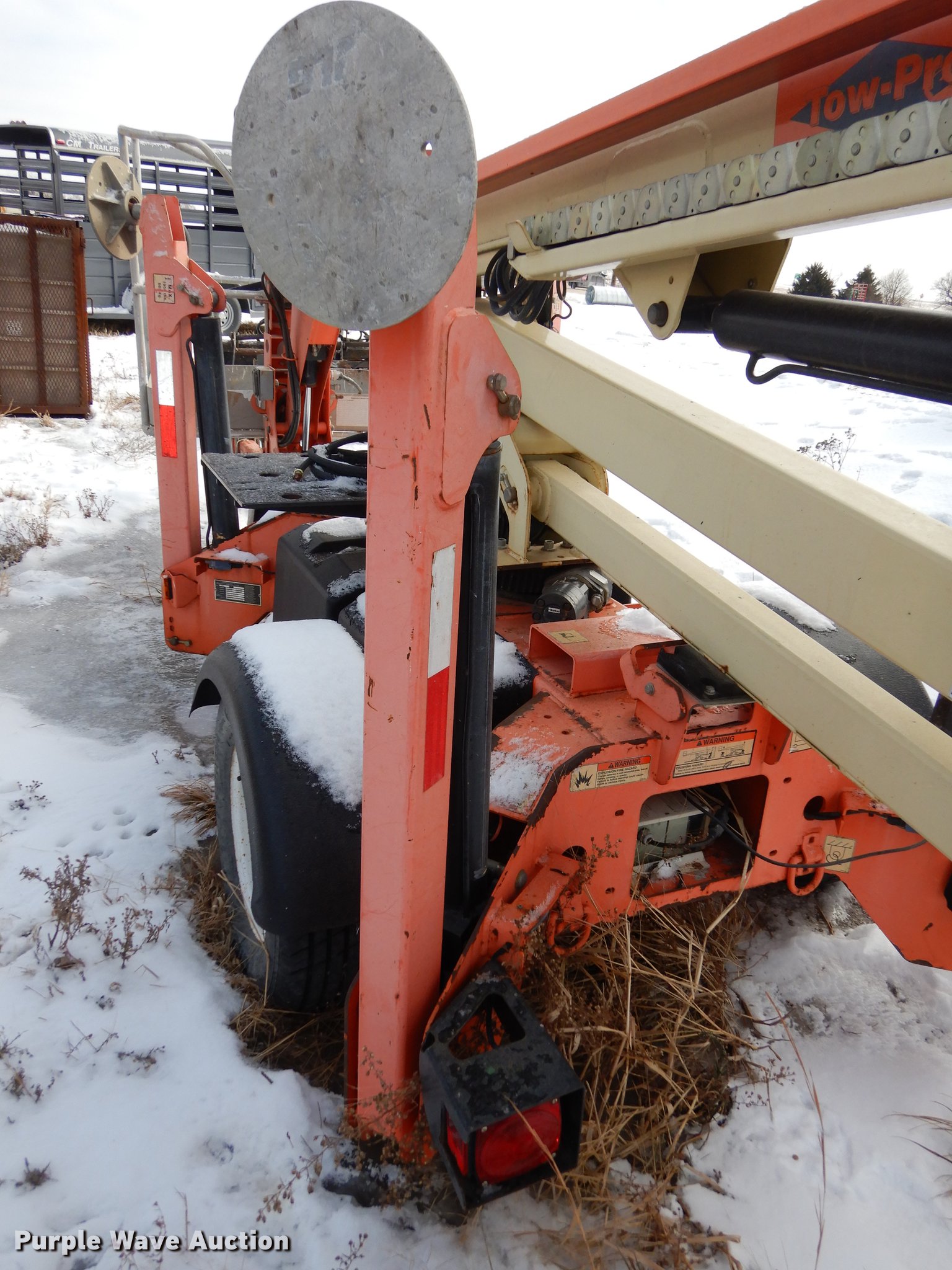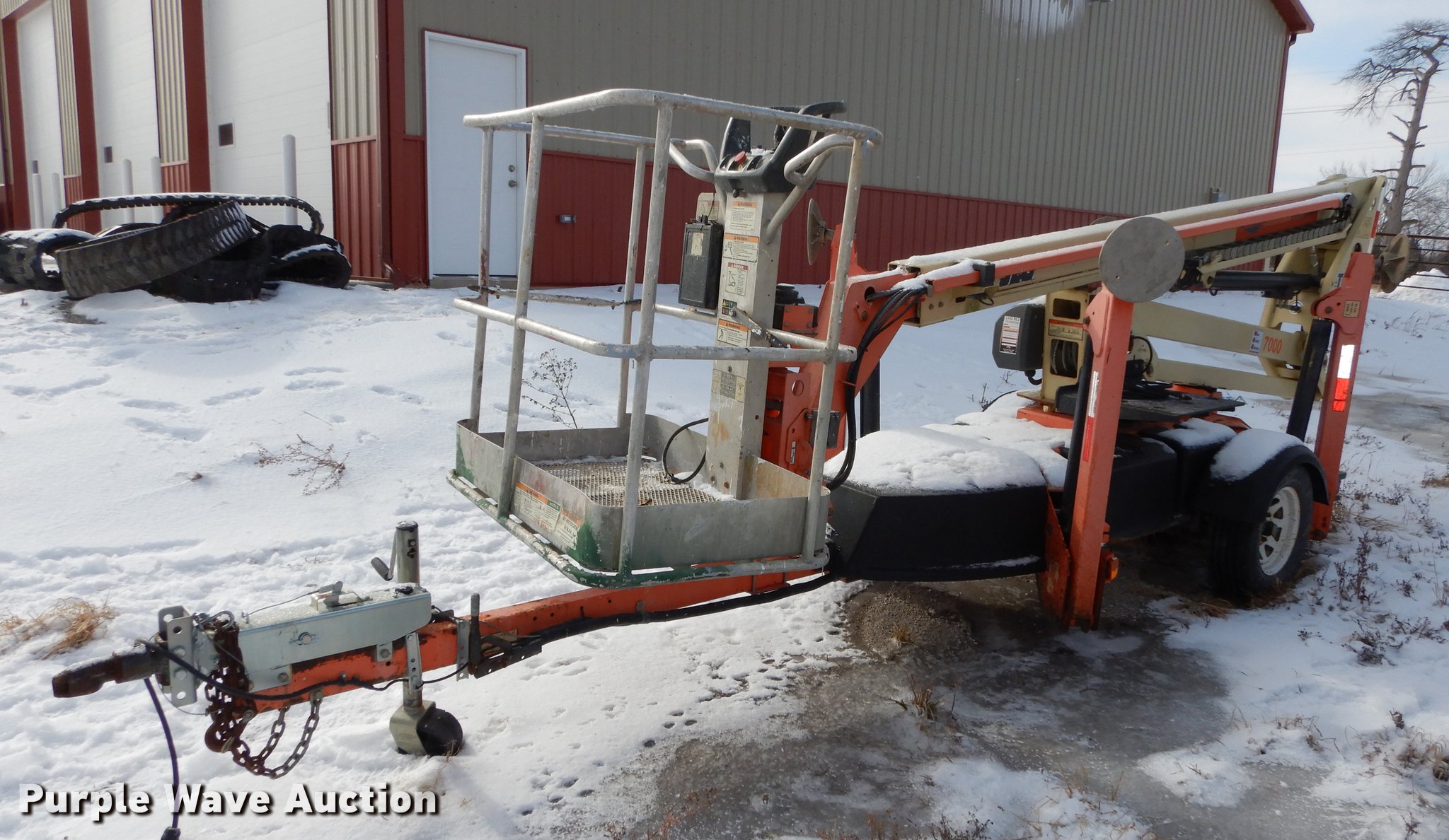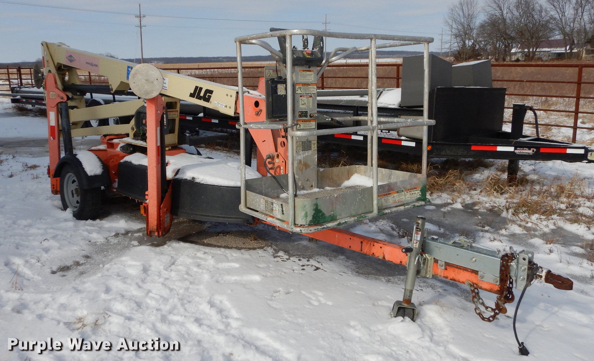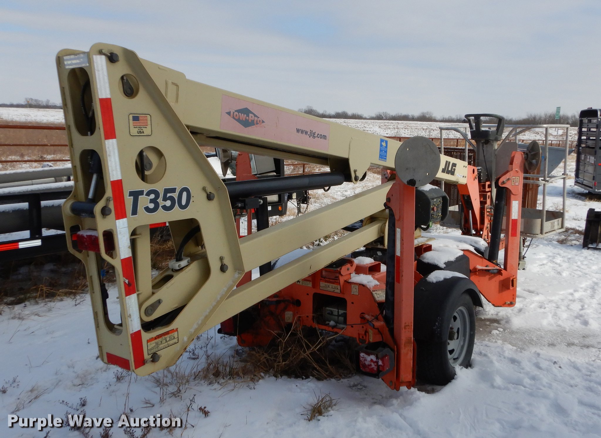 Purple Wave is selling a used Boom Lift in Kansas. This item is a JLG T350 boom lift with the following: 439 hours on meter, Model 7000 lift, 35' max reach length, 4' x 28" mast basket, 500 lbs capacity, Front and rear stabilizers, Lights, Safety chains, Break-away cable, 2" ball hitch, 205/75D14 tires, GVWR 3,825 lbs, Unknown operating condition