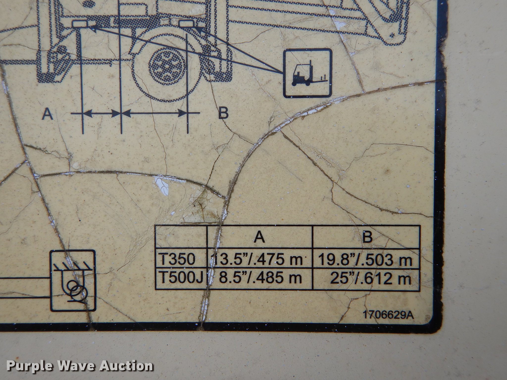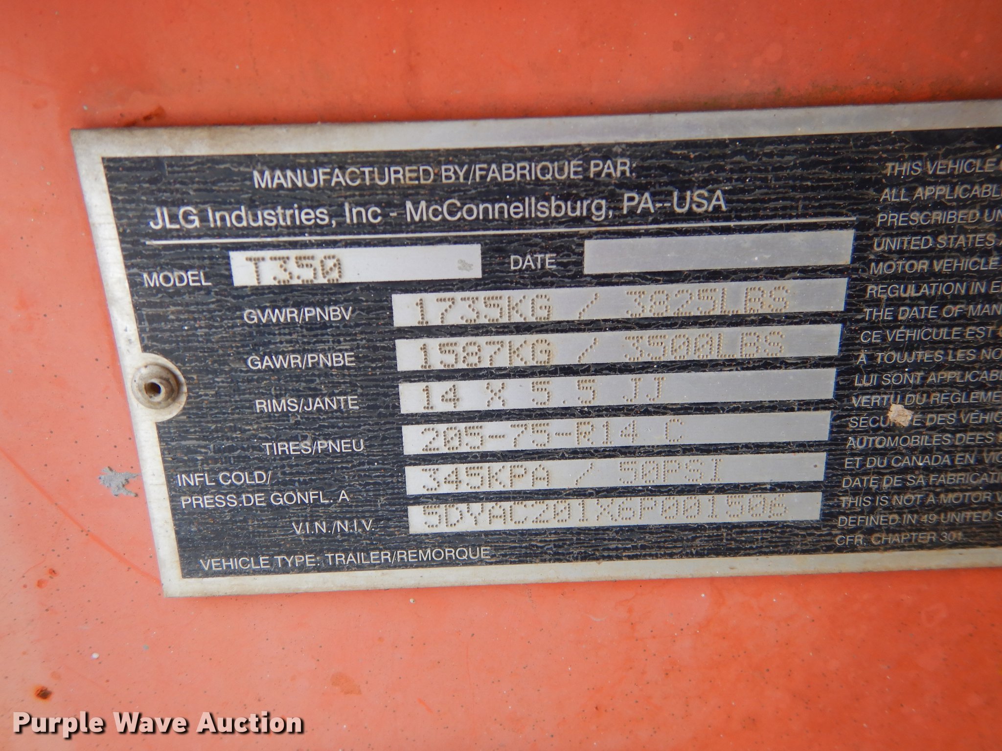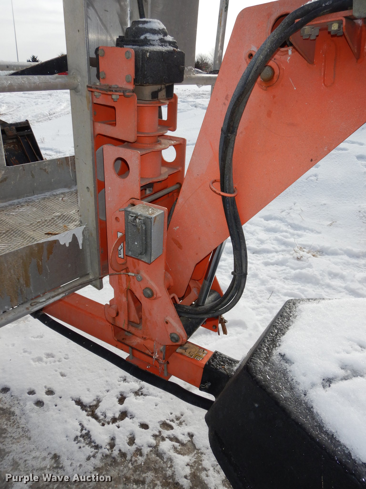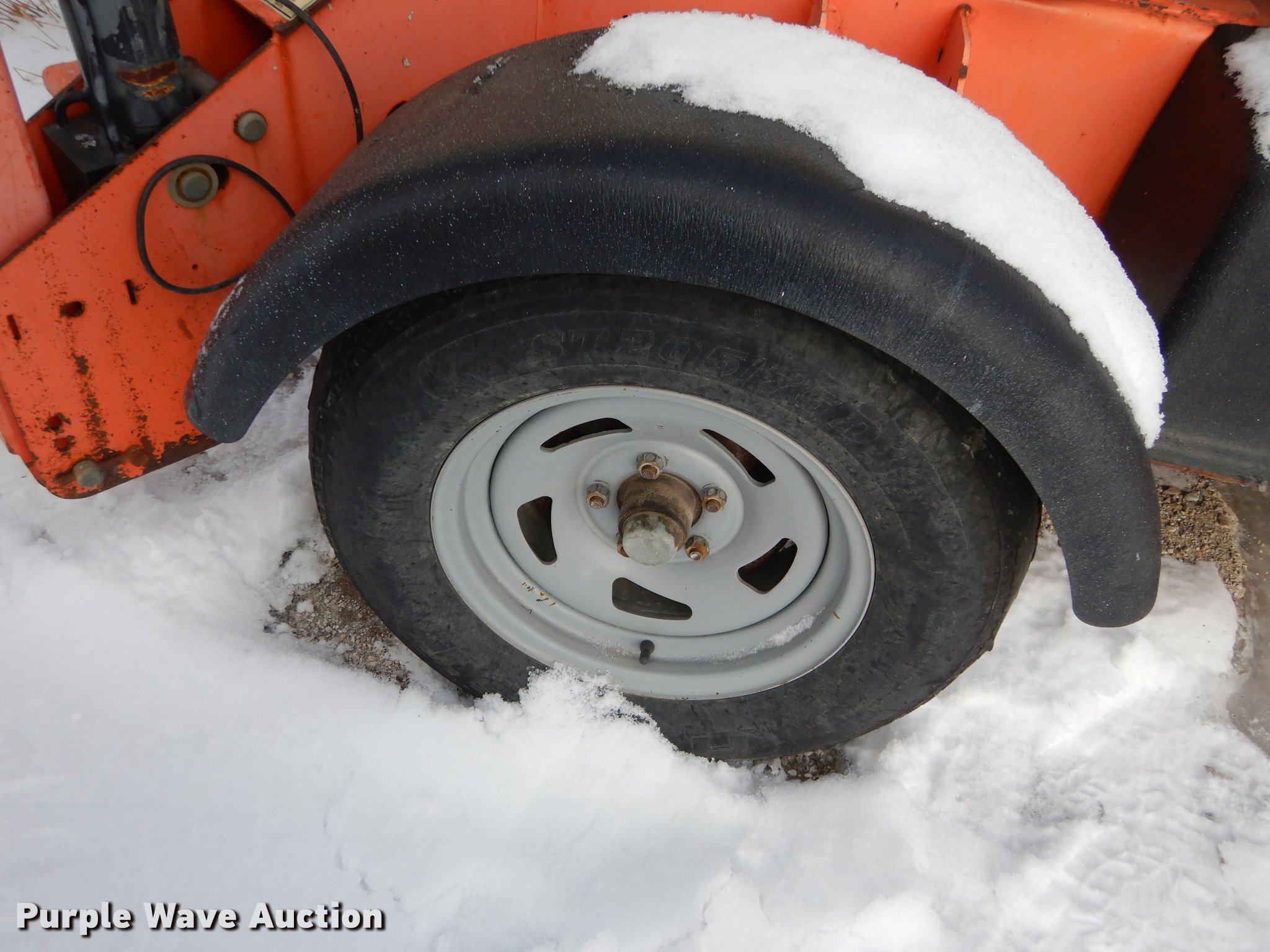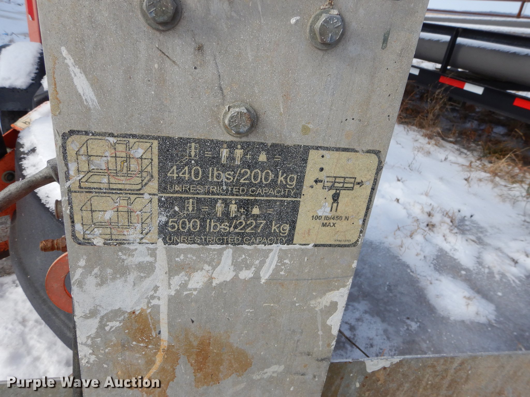 Purple Wave is selling a used Boom Lift in Kansas. This item is a JLG T350 boom lift with the following: 439 hours on meter, Model 7000 lift, 35' max reach length, 4' x 28" mast basket, 500 lbs capacity, Front and rear stabilizers, Lights, Safety chains, Break-away cable, 2" ball hitch, 205/75D14 tires, GVWR 3,825 lbs, Unknown operating condition