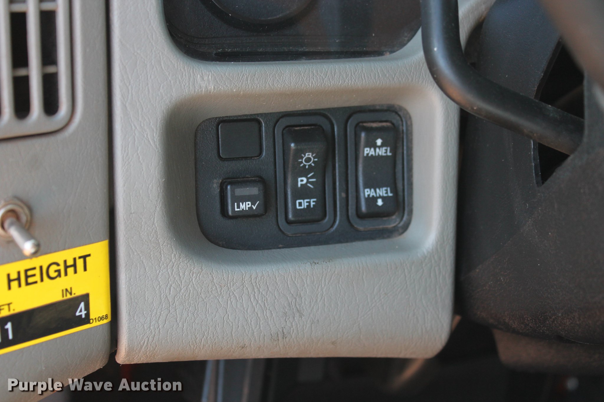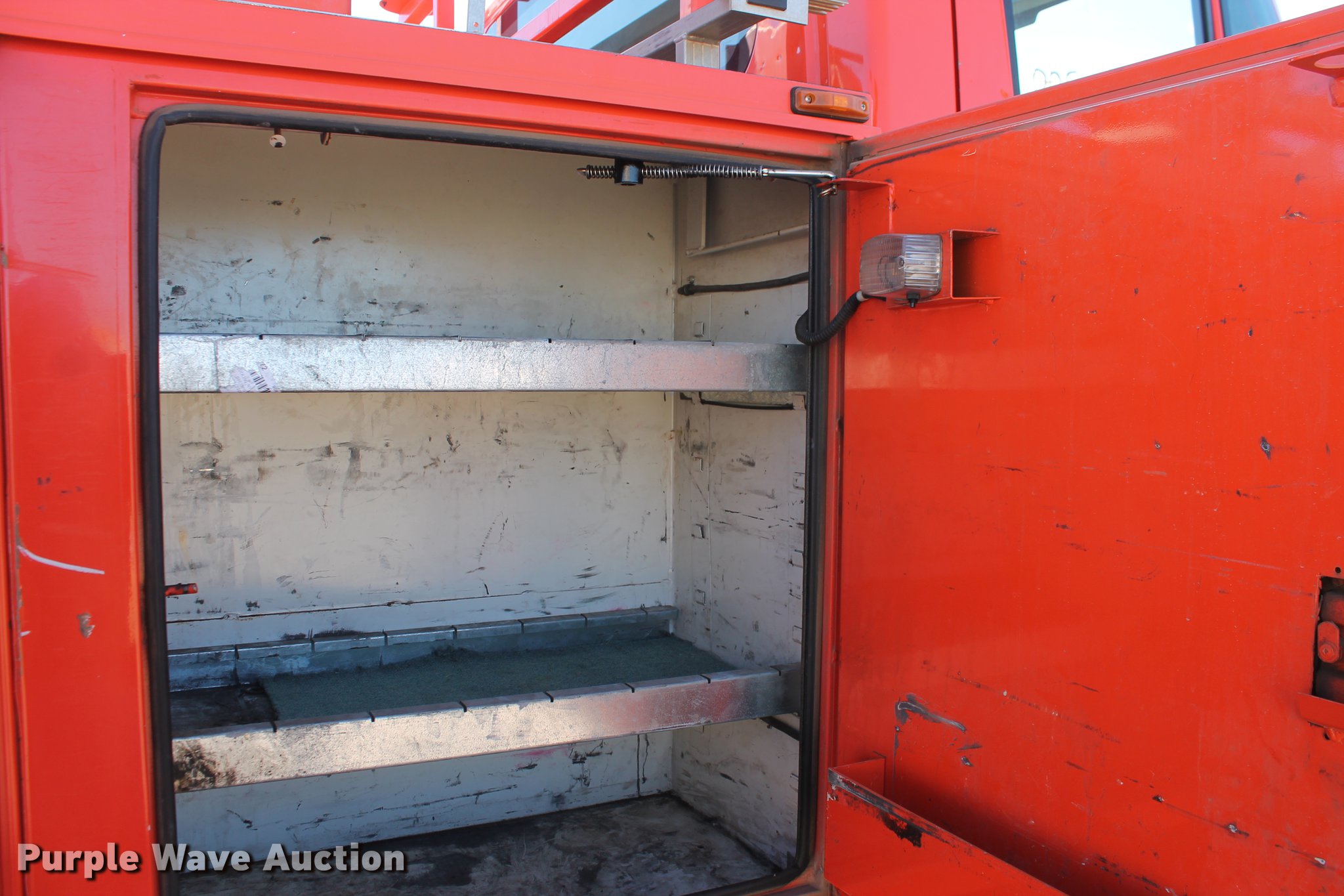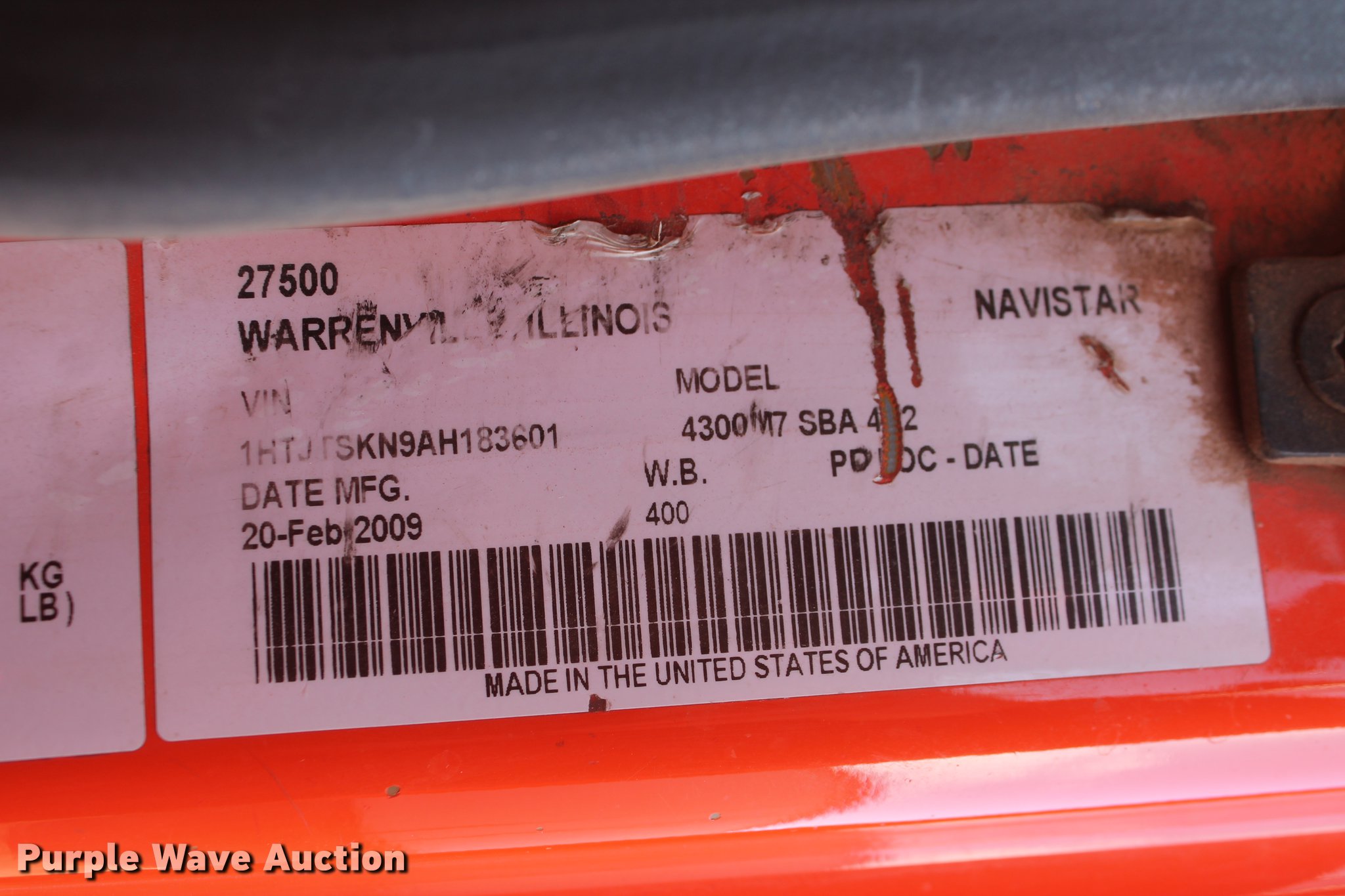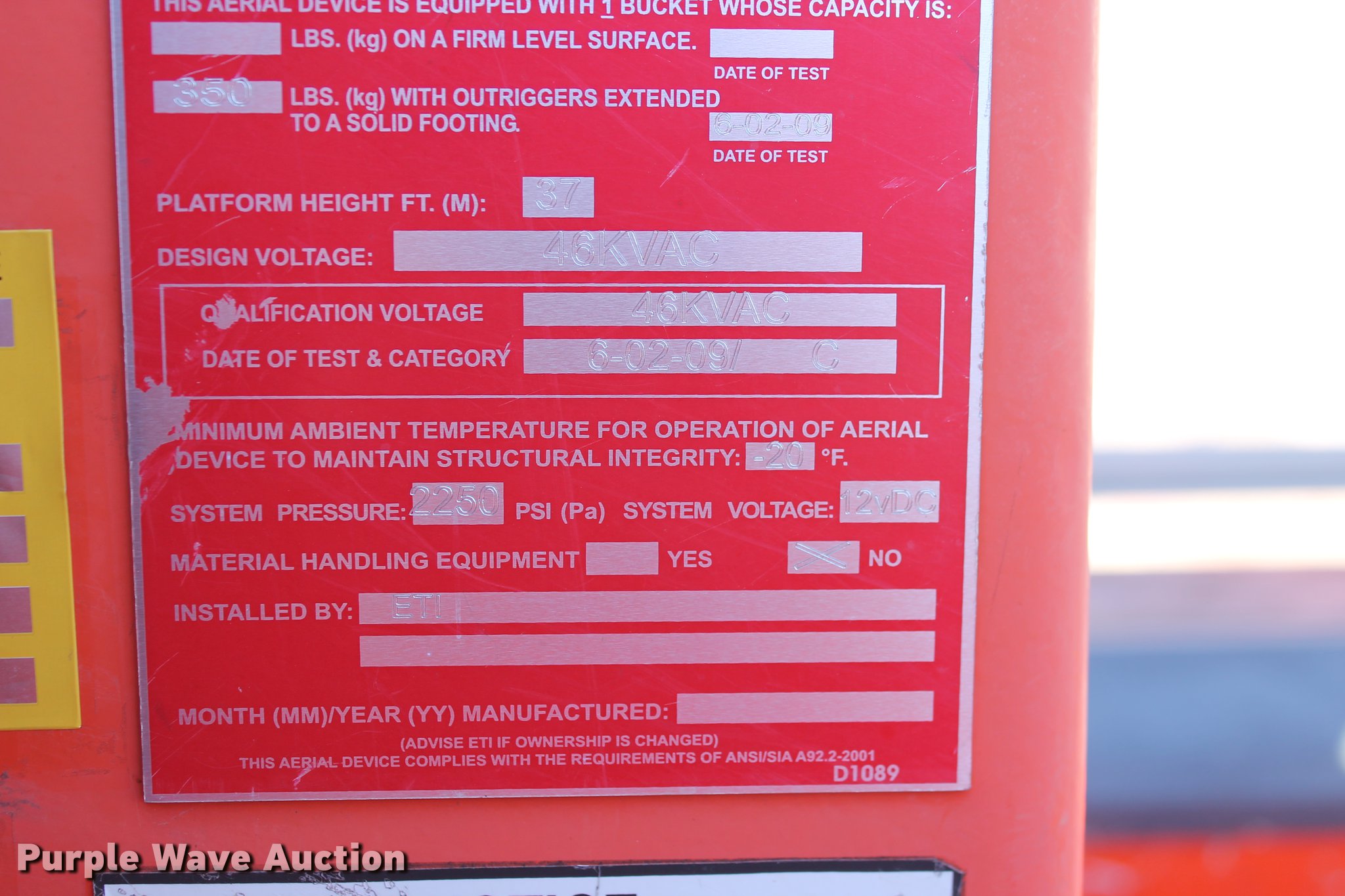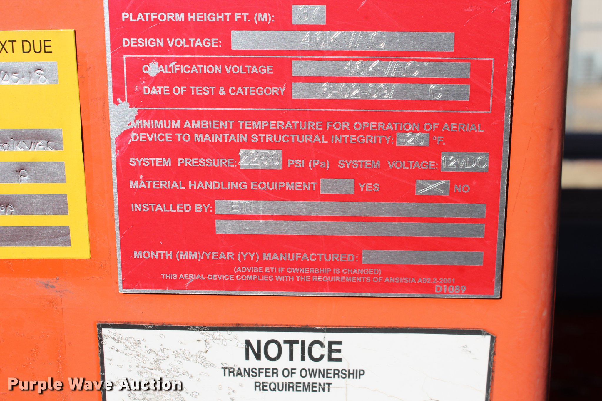 Purple Wave is selling a used Bucket Truck in Oklahoma. This item is a 2010 International DuraStar 4300 bucket truck with the following: 173,144 miles on odometer, International Maxx Force 7 6.4L V8 diesel engine, Automatic transmission, Single axle, AC and heat, Cruise, AM/FM, Air suspension seat, PTO, Beacon light, Backup alarm, Block heater, Front tow hooks, ETI SB138DD96H30N service bed, 14'L, 11'L box, Shelving, Slide-out drawers, Utility rack, Compartment lights, Work lights, D-ring tie downs, Serial 12207, 2010 ETI ETC371H boom, 350 lbs maximum lift capacity, 37' maximum lift height, 42' maximum working height, Man basket, Ground and platform controls, Quik-Lock ladder restraint system, 11'L x 20"W, Hydraulic cable reel, 30"W x 36" diameter, Two speed, Auxiliary tool hydraulics, Bucket tilt, Boom rotation, Articulating, insulated, telescopic boom, (2) outriggers, Serial 6409C77070, Certification valid through October 2018, Single fuel tank, 156" wheelbase, Spring suspension, Air brakes, Goodyear 10R22.5 tires, GVWR 27,500 lbs