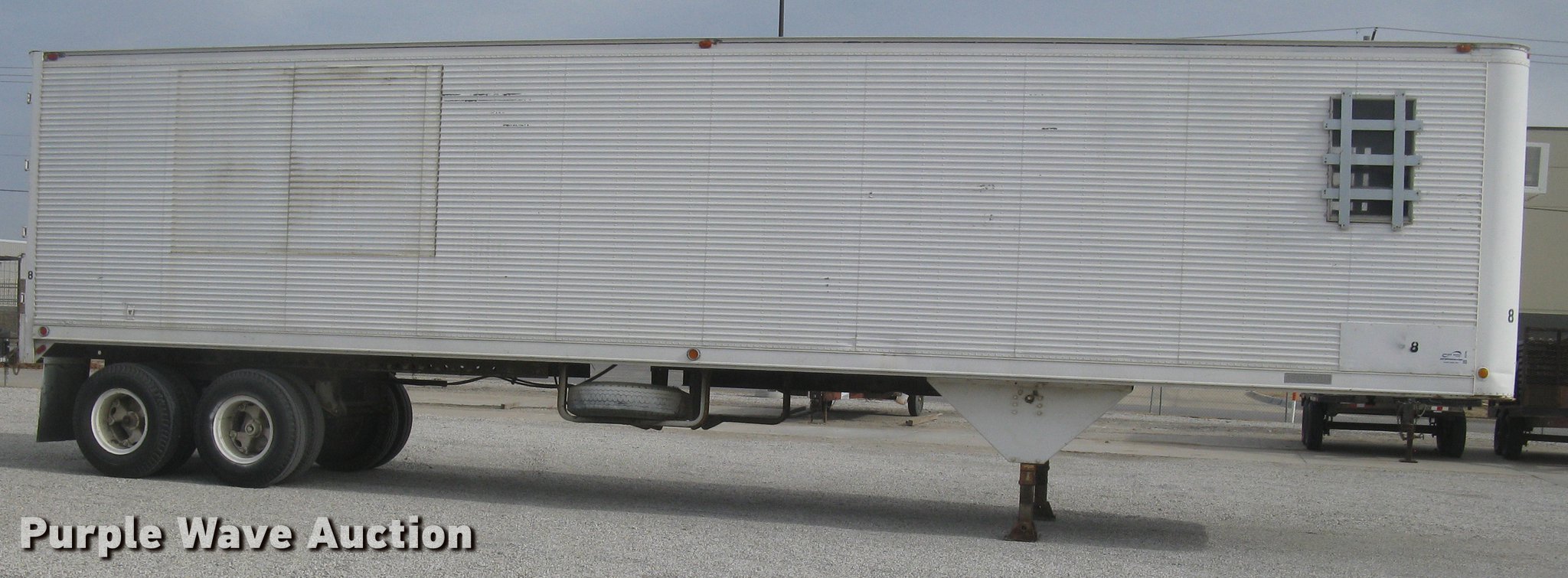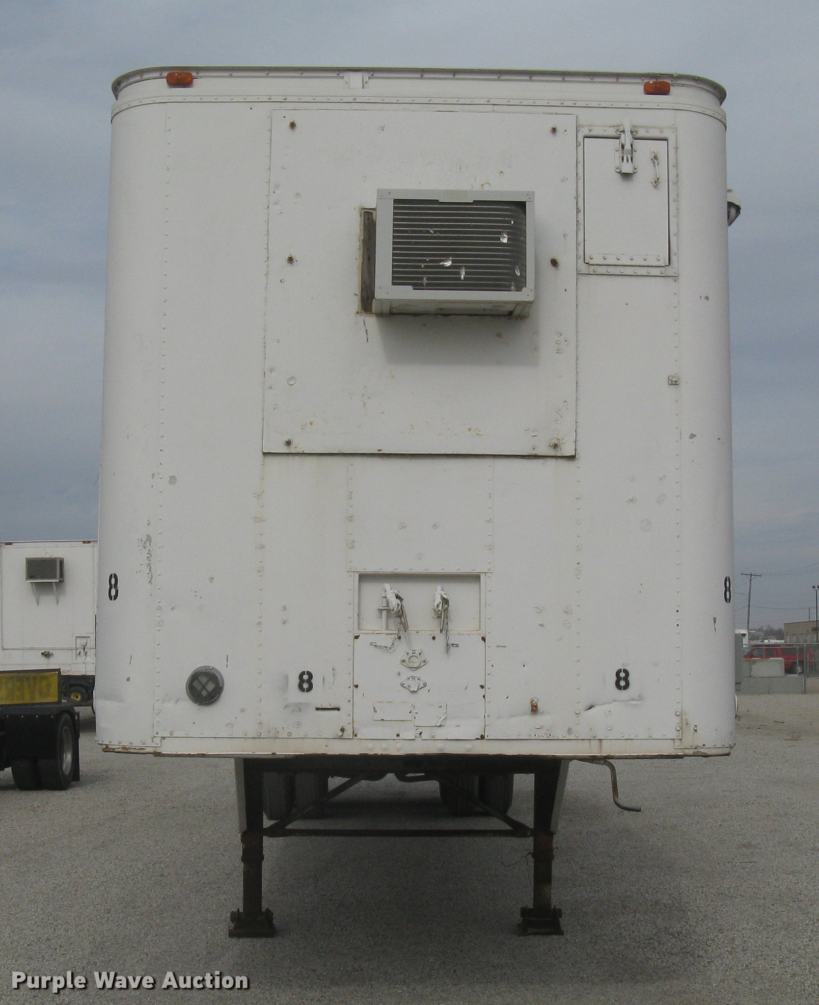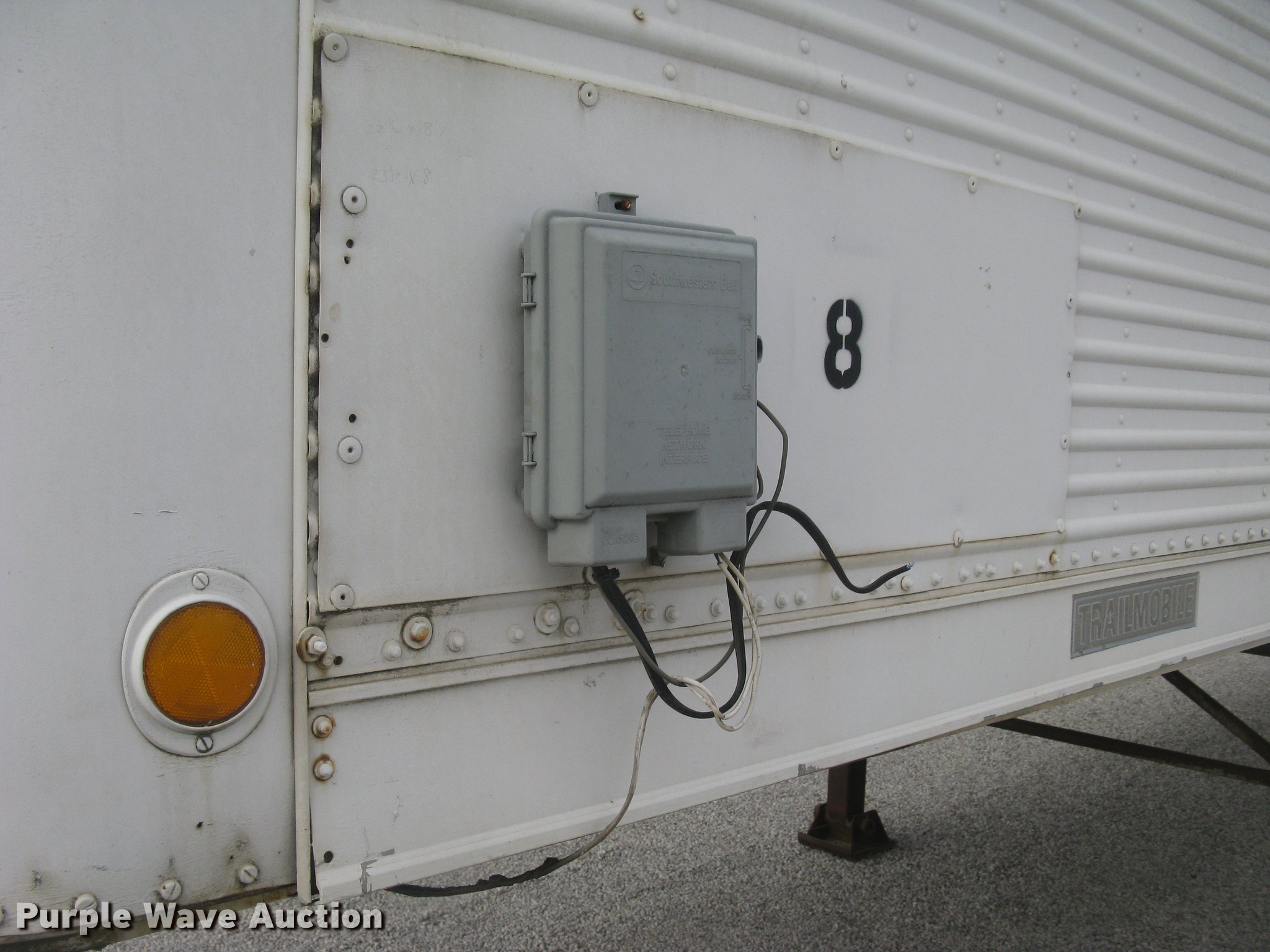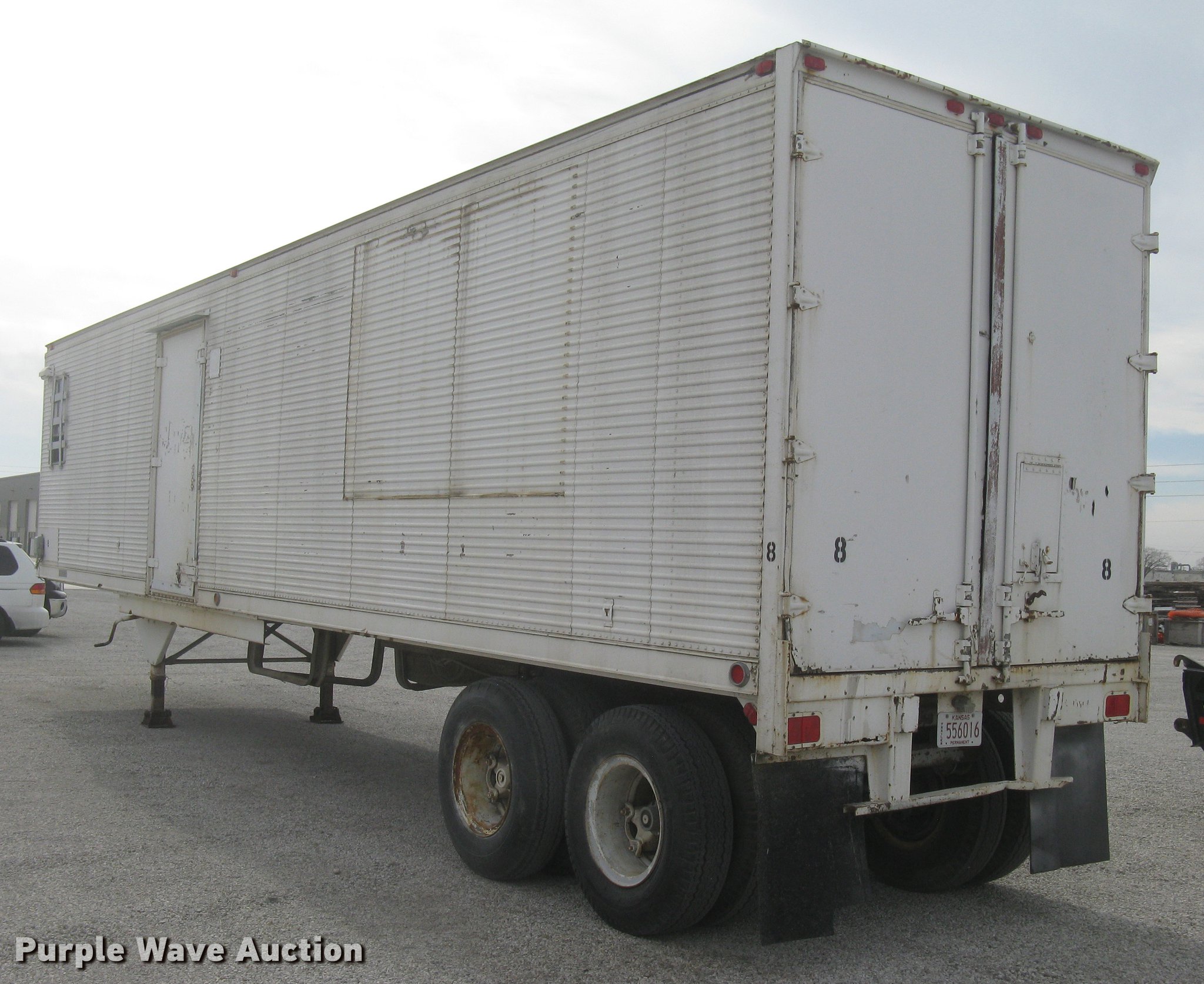 Purple Wave is selling a used Dry Van Trailer in Kansas. This item is a 1972 Trailmobile dry van jobsite trailer with the following: 41'L x 8'W, Interior office partition, 11'L, Work table, Blueprint table, Window AC unit, Lights, Baseboard heat, Side door, Swinging rear doors, Spare tire cradle, Fifth wheel plate, Dual leg landing gear, Spring suspension, Air brakes, Sliding tandem axle, Oil bath hubs, 10.00-20 tires, Unit# 8