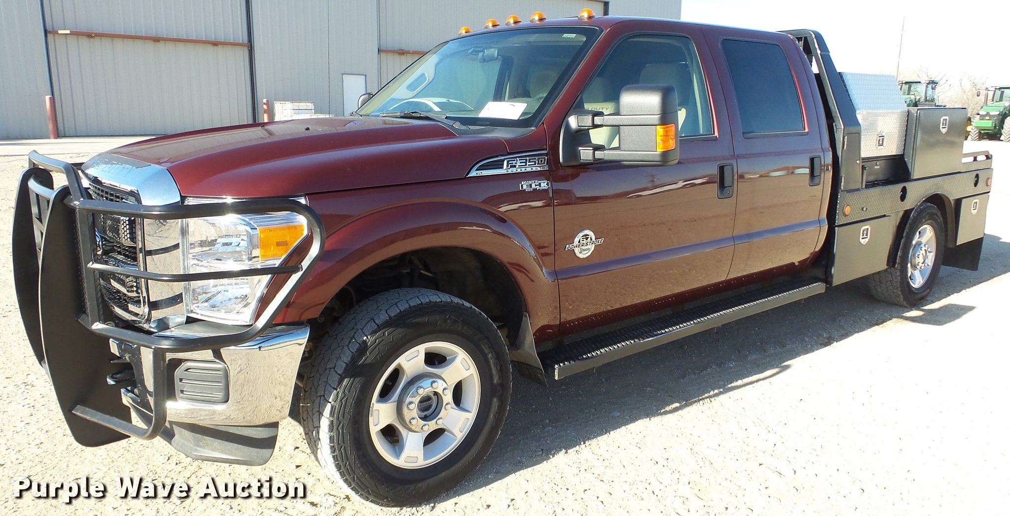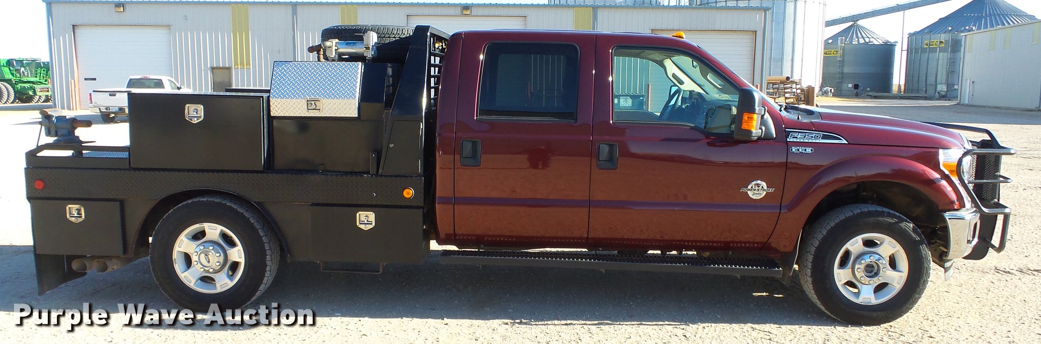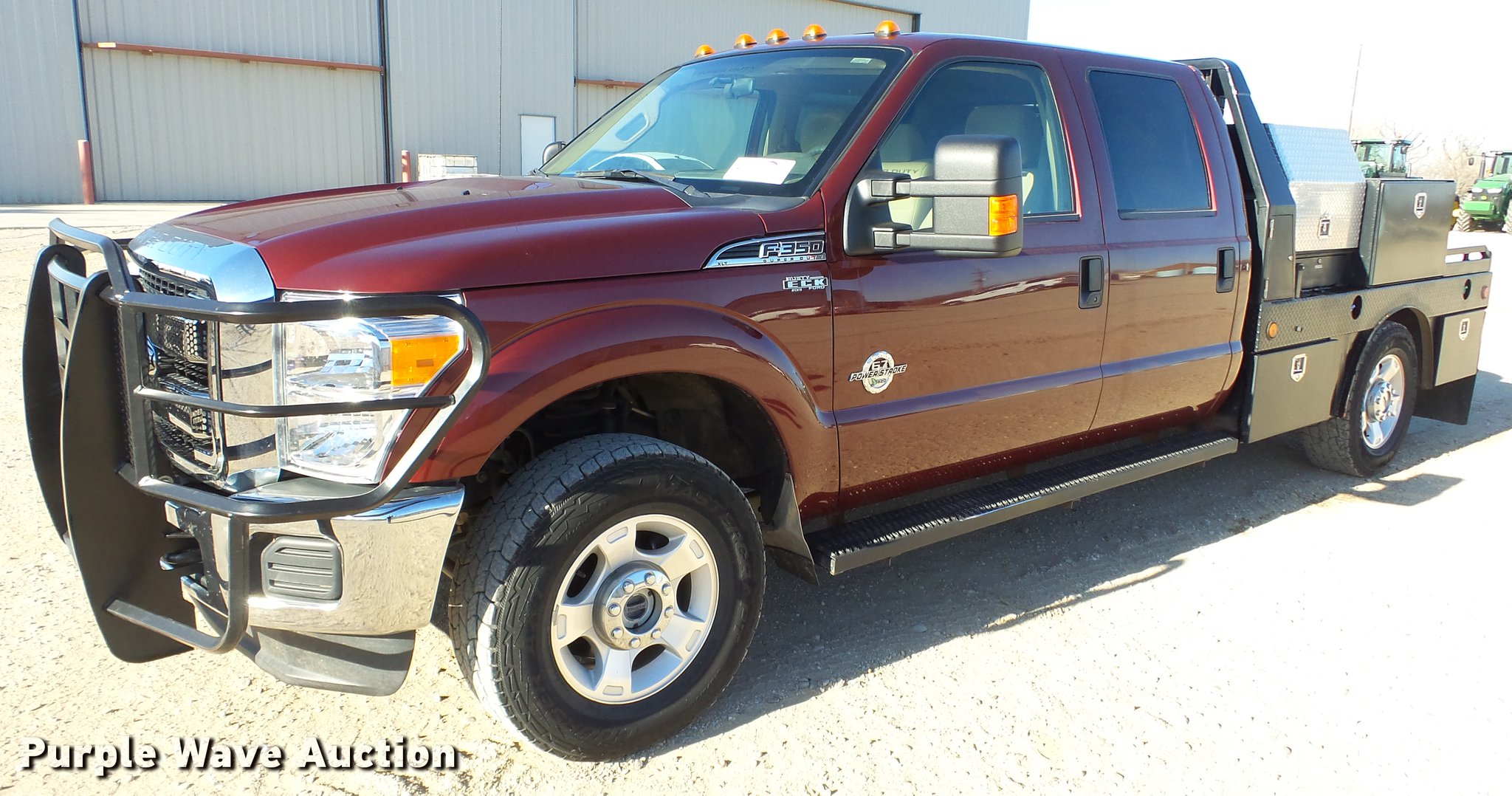 Purple Wave is selling a used 3/4 or 1 Ton Pickup or Van in Kansas. This item is a 2013 Ford F350 Super Duty Crew Cab flatbed pickup truck with the following: 50,902 miles on odometer, 6.7L V8 OHV 16V turbo diesel engine, Automatic transmission, Four wheel drive, AC and heat, Tilt, Cruise, AM/FM/CD, Power windows, locks, and mirrors, Cloth interior, 9'L x 79"W flatbed, Toolboxes, Auxiliary fuel tank, Fuel pump, Hose, Nozzle, Thunder Struck grill guard, Running boards, Front tow hooks, Gooseneck hitch, Receiver hitch, Trailer wiring, 275/70R18 tires