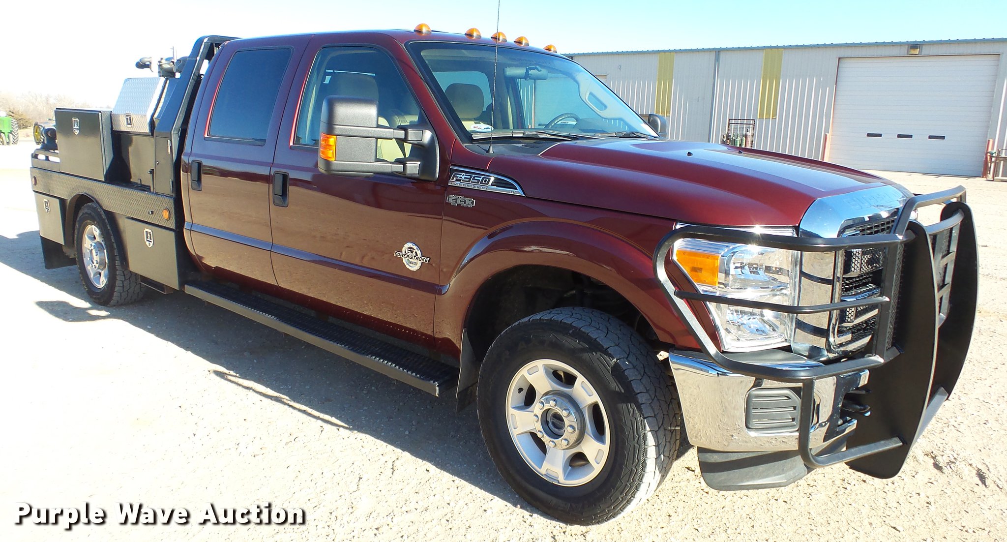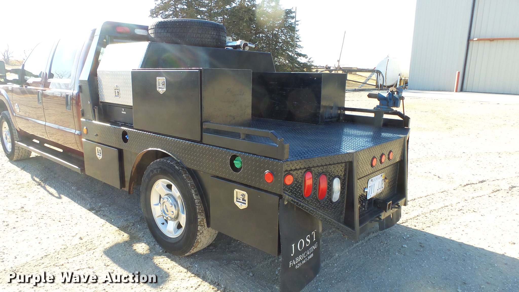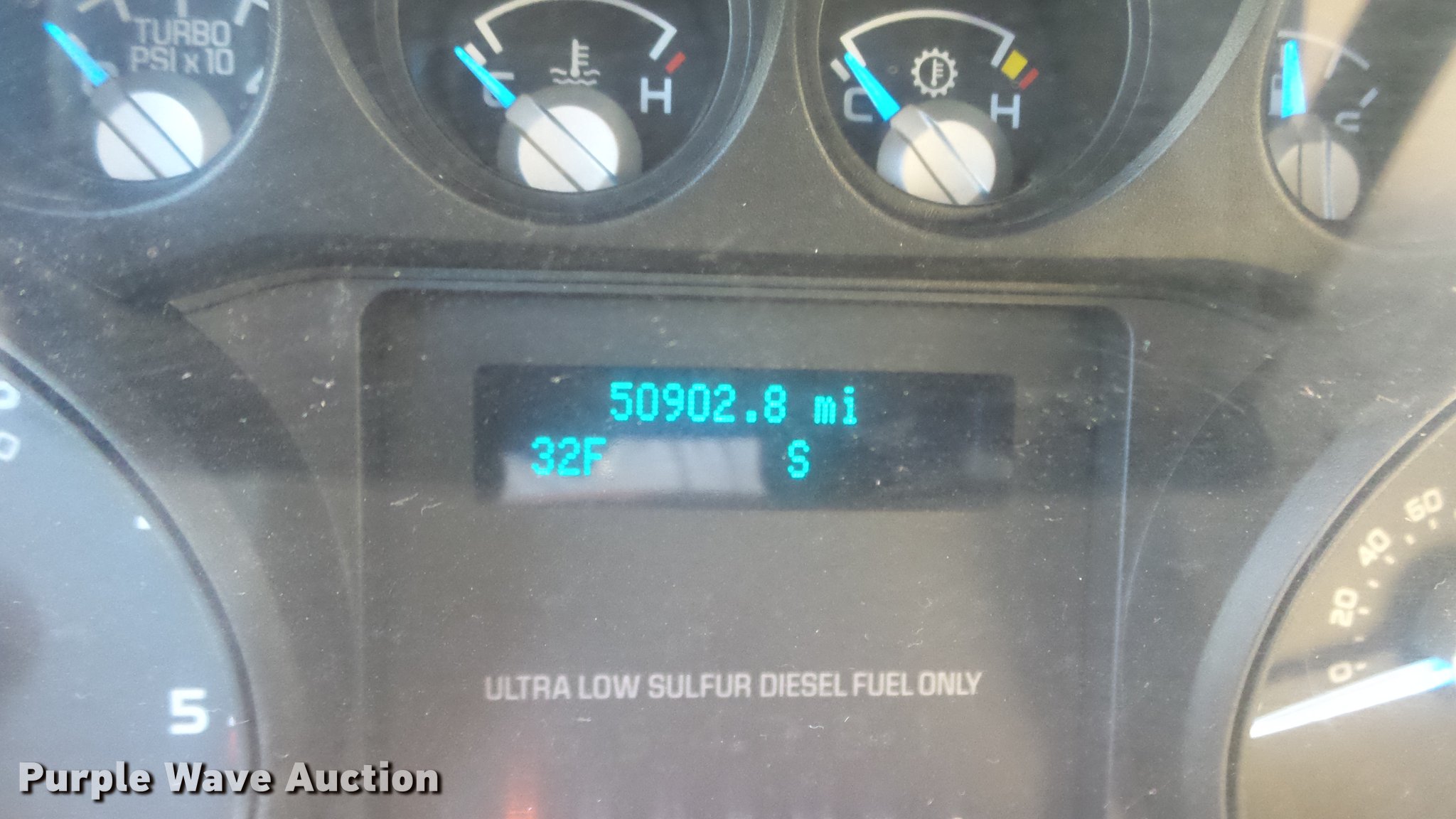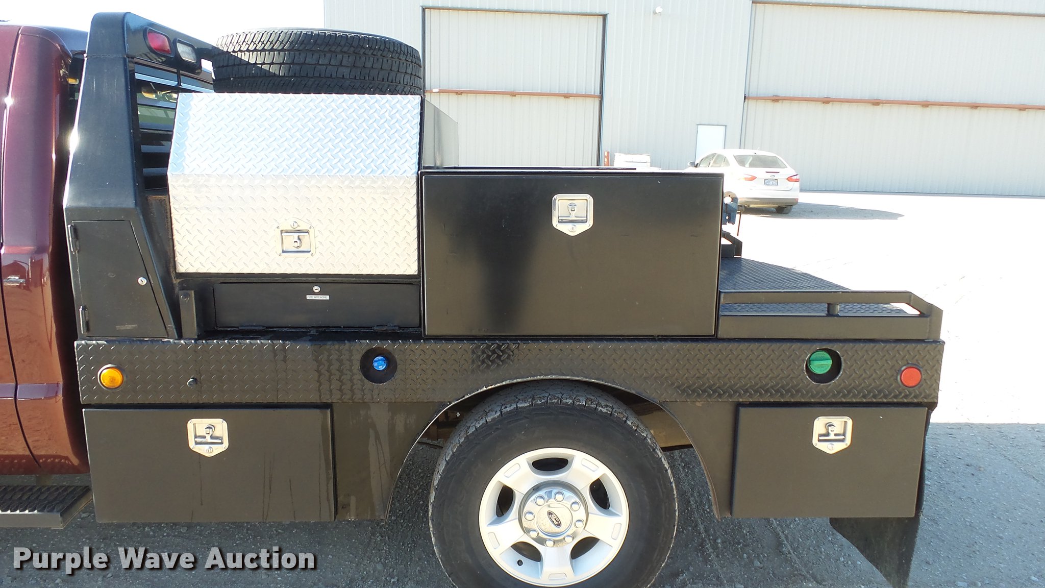 Purple Wave is selling a used 3/4 or 1 Ton Pickup or Van in Kansas. This item is a 2013 Ford F350 Super Duty Crew Cab flatbed pickup truck with the following: 50,902 miles on odometer, 6.7L V8 OHV 16V turbo diesel engine, Automatic transmission, Four wheel drive, AC and heat, Tilt, Cruise, AM/FM/CD, Power windows, locks, and mirrors, Cloth interior, 9'L x 79"W flatbed, Toolboxes, Auxiliary fuel tank, Fuel pump, Hose, Nozzle, Thunder Struck grill guard, Running boards, Front tow hooks, Gooseneck hitch, Receiver hitch, Trailer wiring, 275/70R18 tires