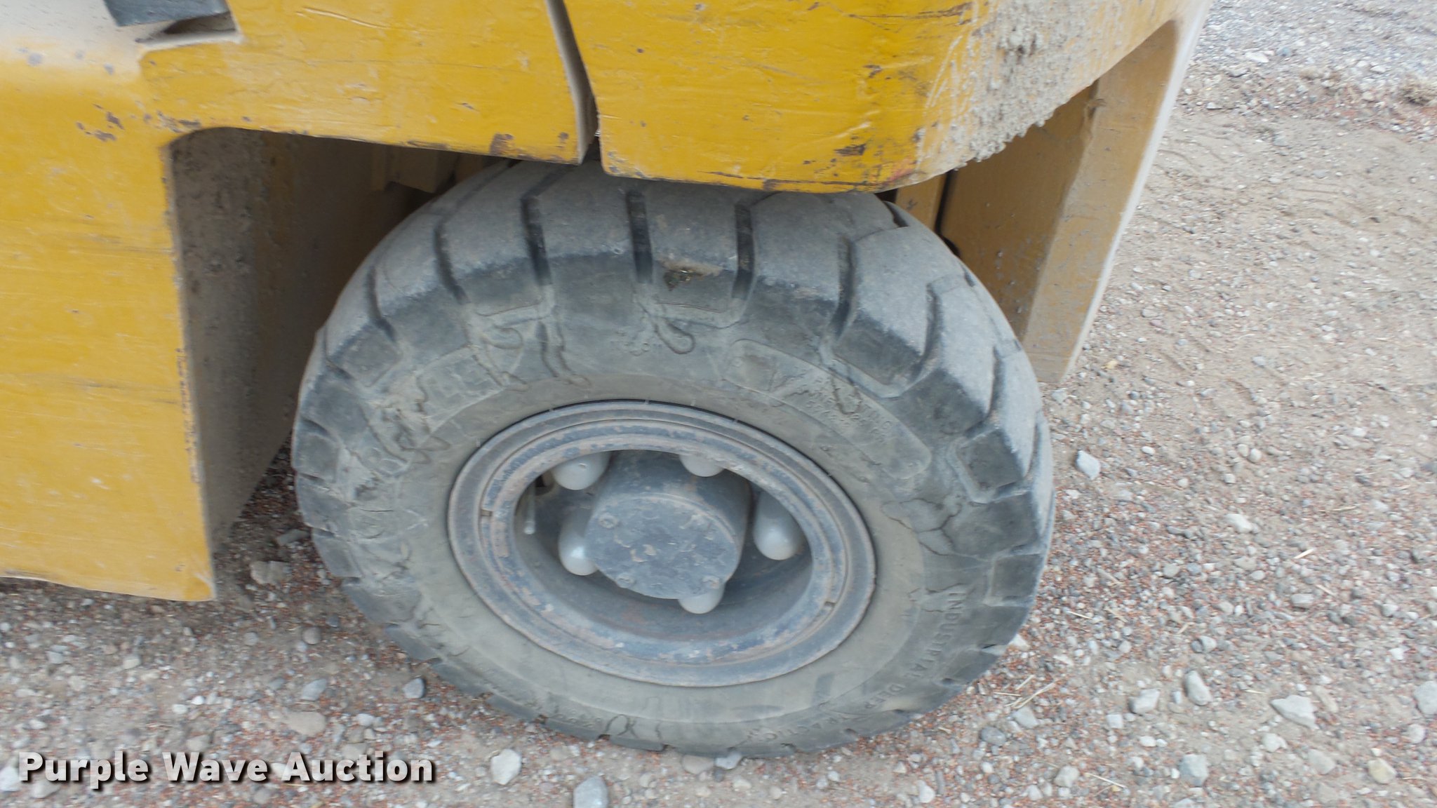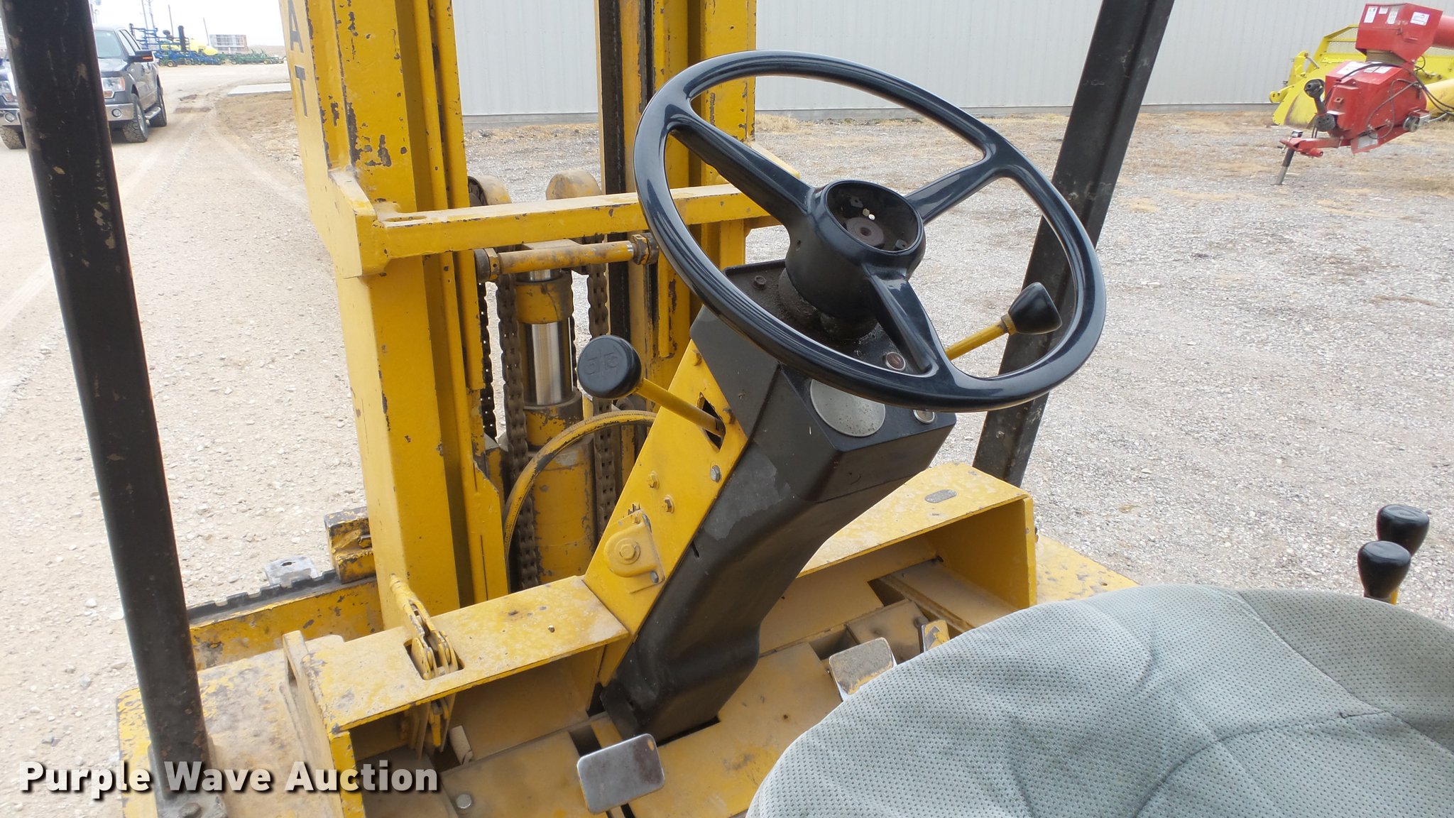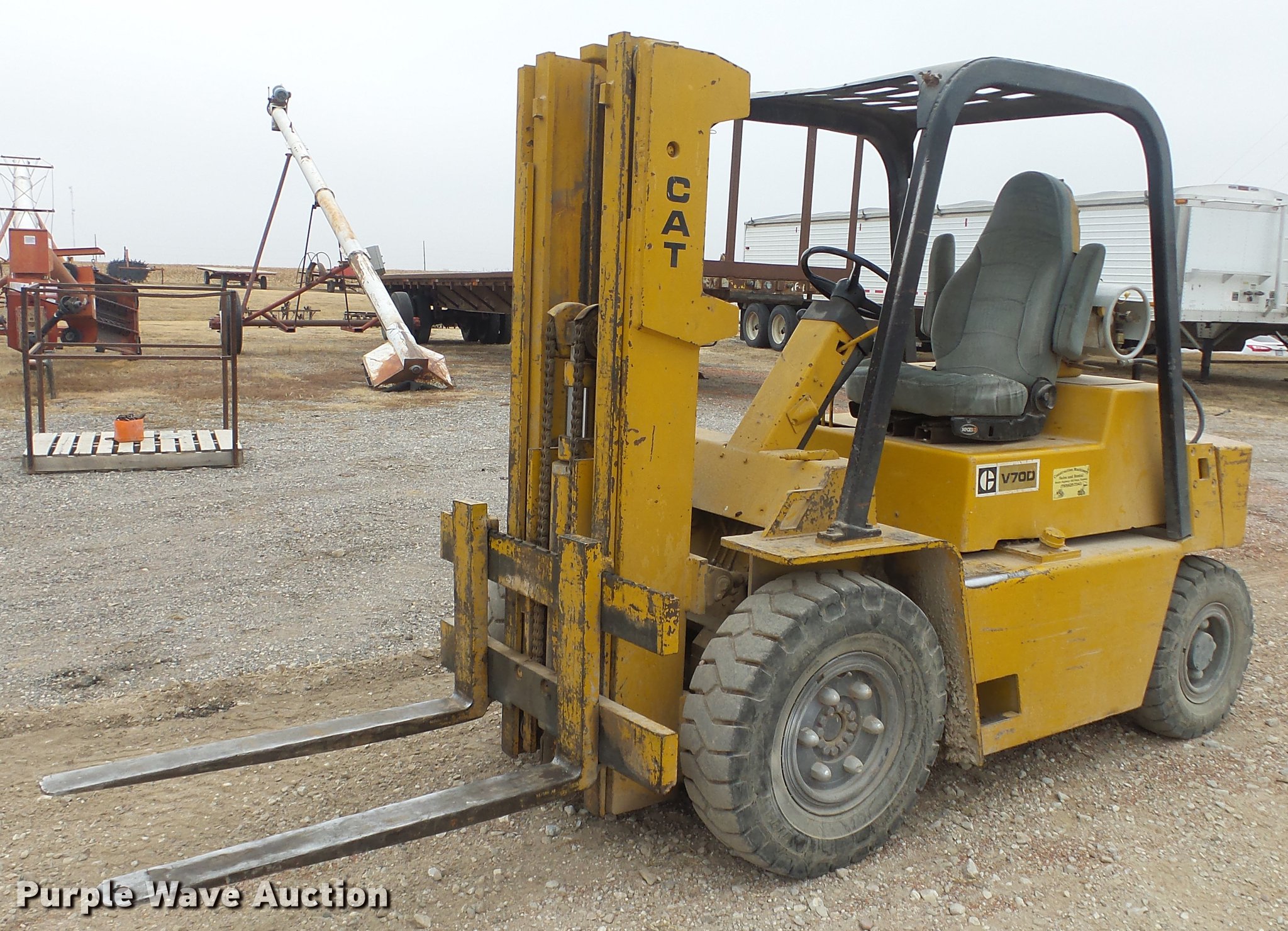 Purple Wave is selling a used Strt. Mast Rough Terr. Forklift in Kansas. This item is a Caterpillar V70D forklift with the following: 1,378 hours on meter, Hours meter has been replaced, Grindstaff 4236 four cylinder propane engine, Shuttle shift transmission, 1F-1R gears, OROPS, 7,000 lbs capacity, 14.5' max lift height, Three stage mast, 45" fork length, (2) propane bottles included, 8.25-15 NHS front tires, 7.00-12 NHS rear tires