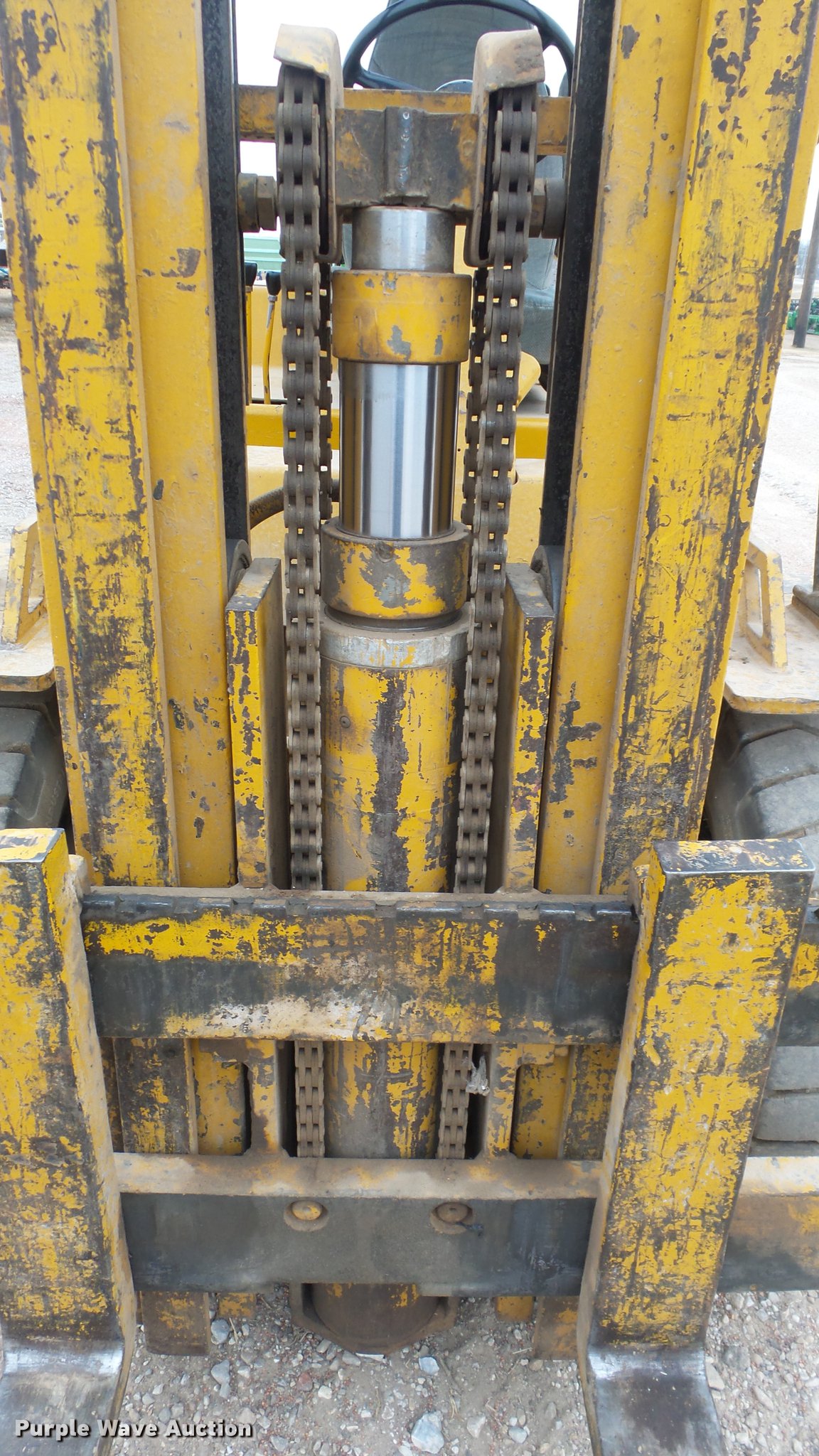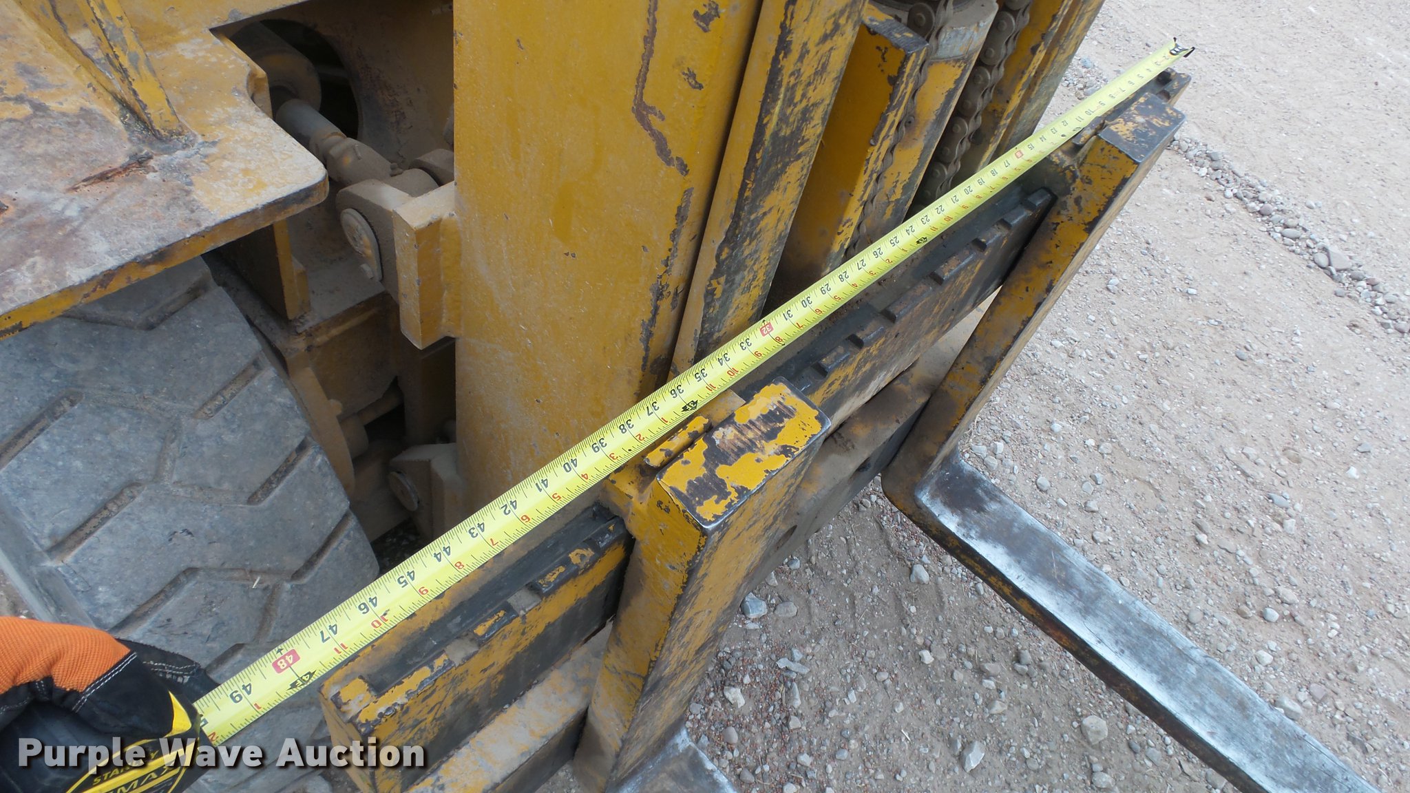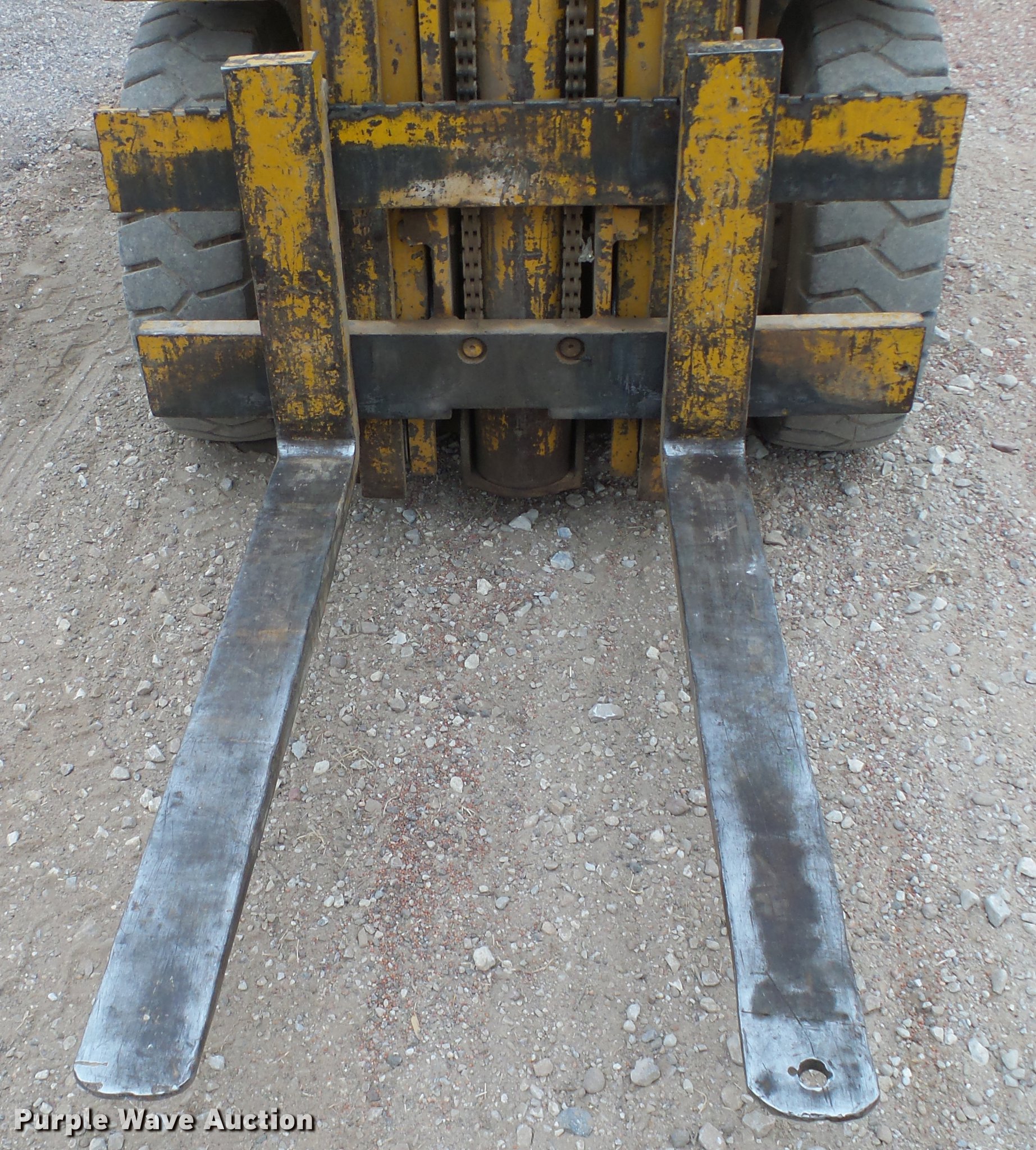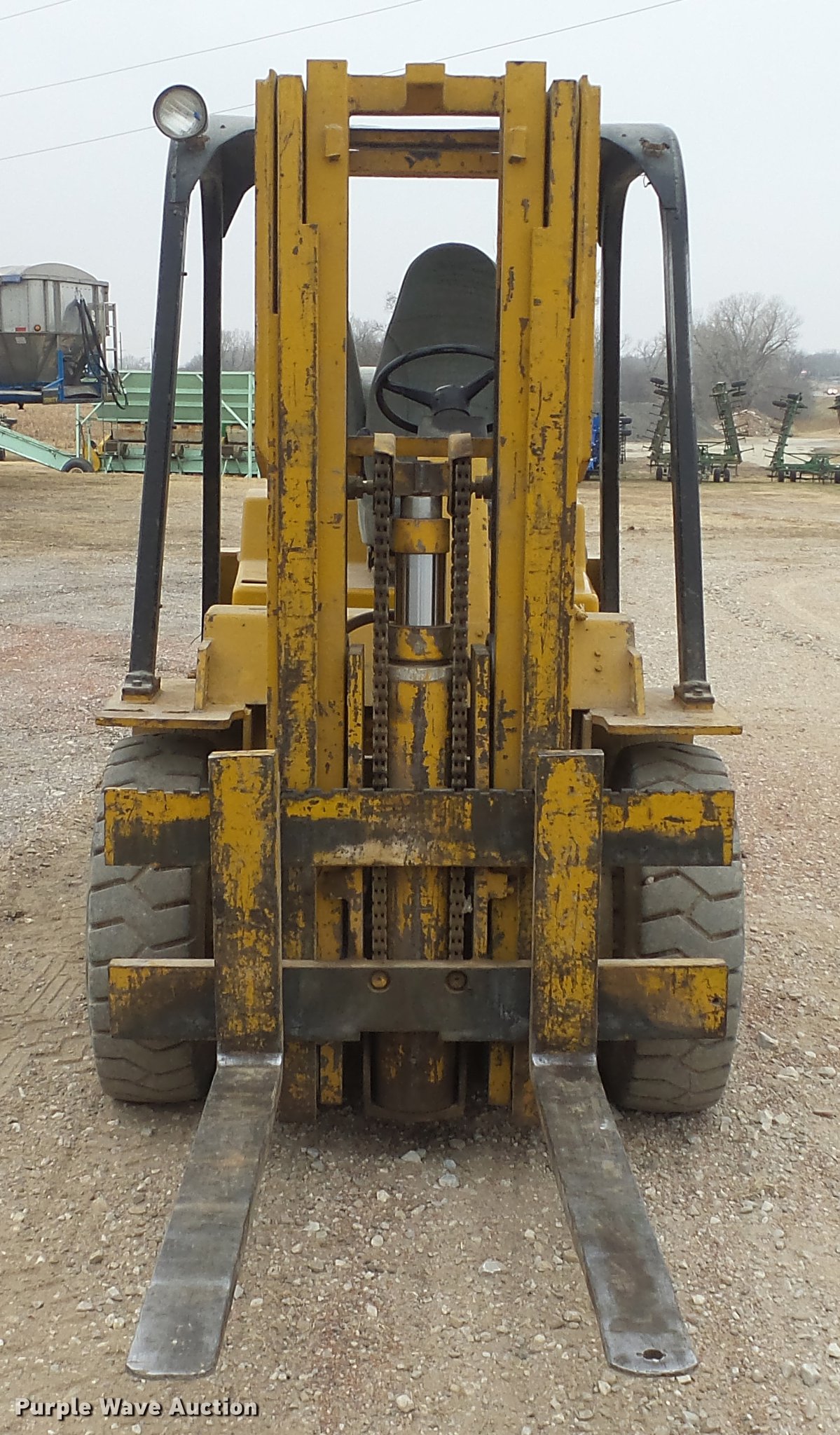 Purple Wave is selling a used Strt. Mast Rough Terr. Forklift in Kansas. This item is a Caterpillar V70D forklift with the following: 1,378 hours on meter, Hours meter has been replaced, Grindstaff 4236 four cylinder propane engine, Shuttle shift transmission, 1F-1R gears, OROPS, 7,000 lbs capacity, 14.5' max lift height, Three stage mast, 45" fork length, (2) propane bottles included, 8.25-15 NHS front tires, 7.00-12 NHS rear tires
