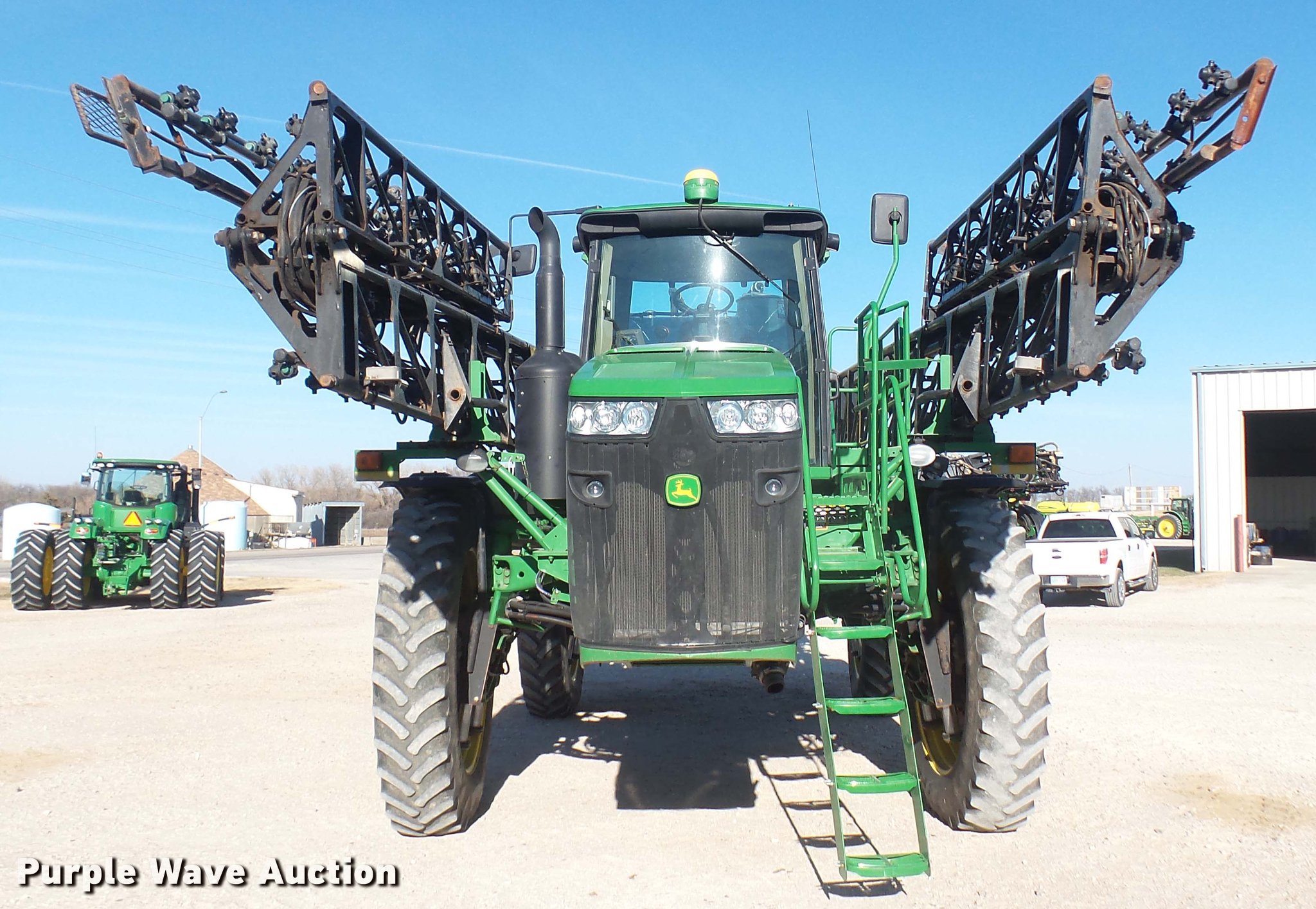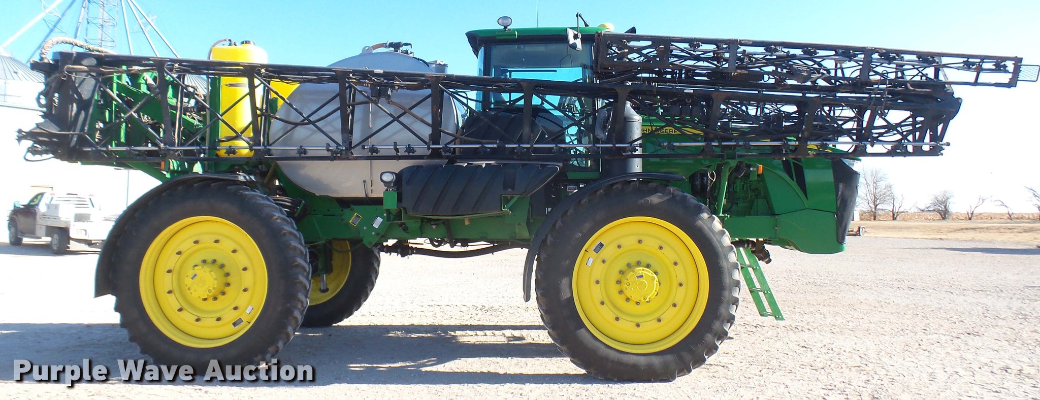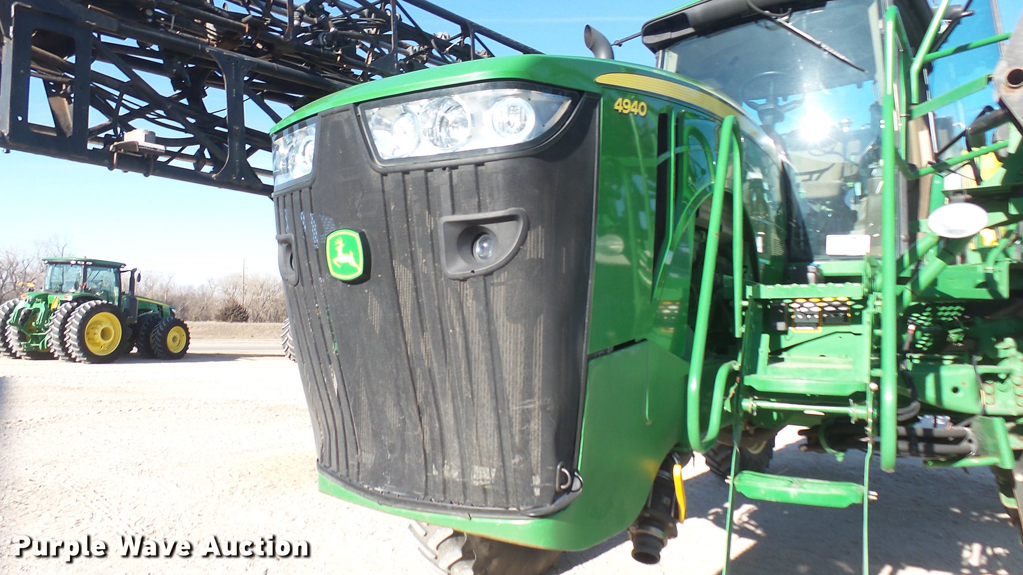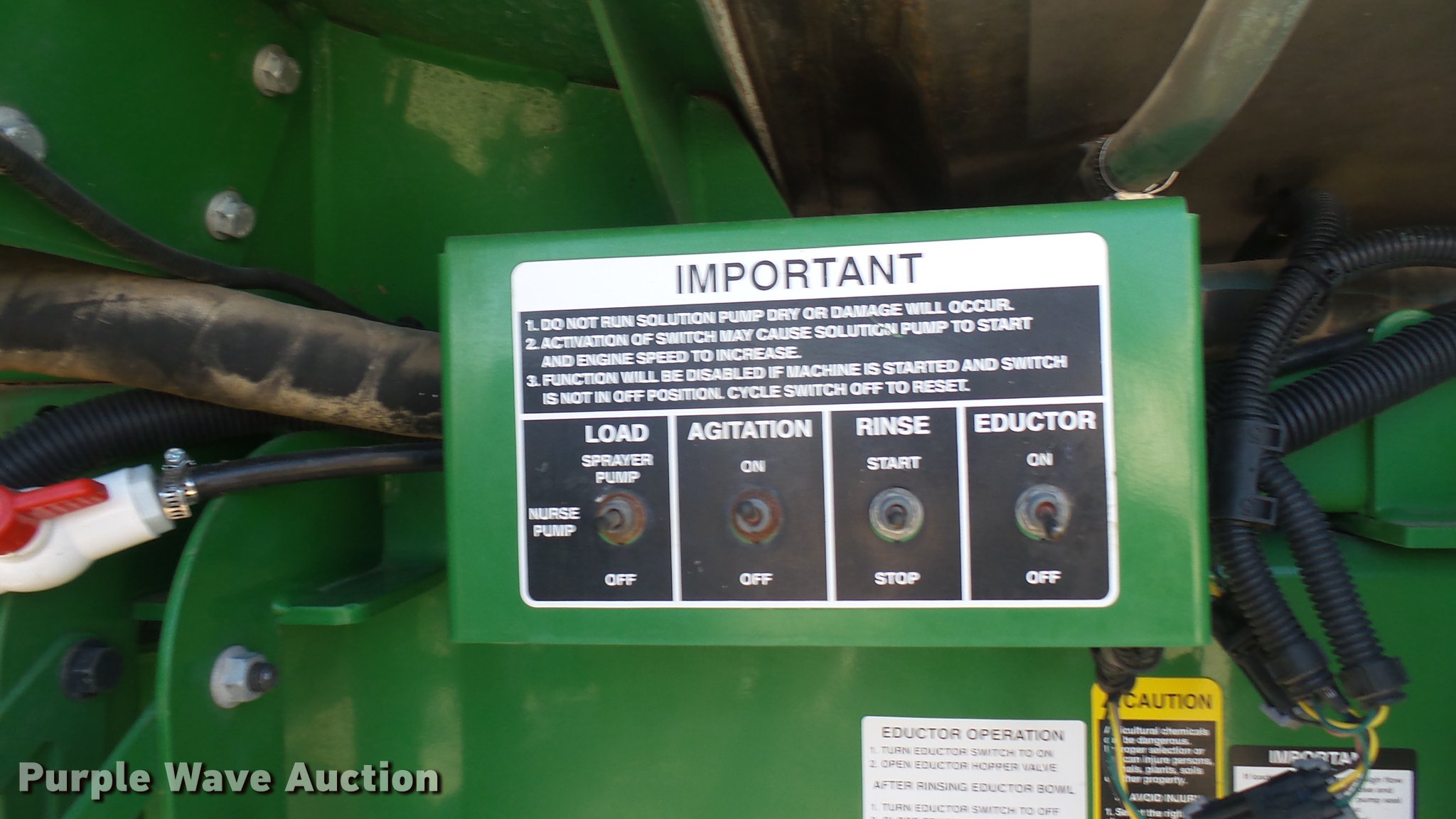 Purple Wave is selling a used Applicator Self Propelled in Kansas. This item is a 2013 John Deere 4940 self-propelled applicator with the following: 2,583 engine hours on meter, 856 spray hours on meter, 131,548 acres on meter, John Deere 6090HN004 six cylinder turbo diesel engine, Serial RG6090R037854, Hydrostatic transmission, Four wheel drive, 1,200 gallon stainless steel solution tank, Stainless steel chemical eductor tank, 120'W boom, Three boom sections, Hydraulic boom fold, Hydraulic height control, 15" nozzle spacing, John Deere five-way nozzle bodies, Fence row right side nozzle, Fence row left side plumbed, AC and heat, AM/FM/CD, Tilt, Air suspension seat, Worklights, Shades, John Deere 2630 GPS monitor, John Deere Star Fire 3000 GPS receiver, Fenders, Hydraulic axle width adjust, Firestone 380/105R50 row crop tires, Serial 1N04940XVC0023609